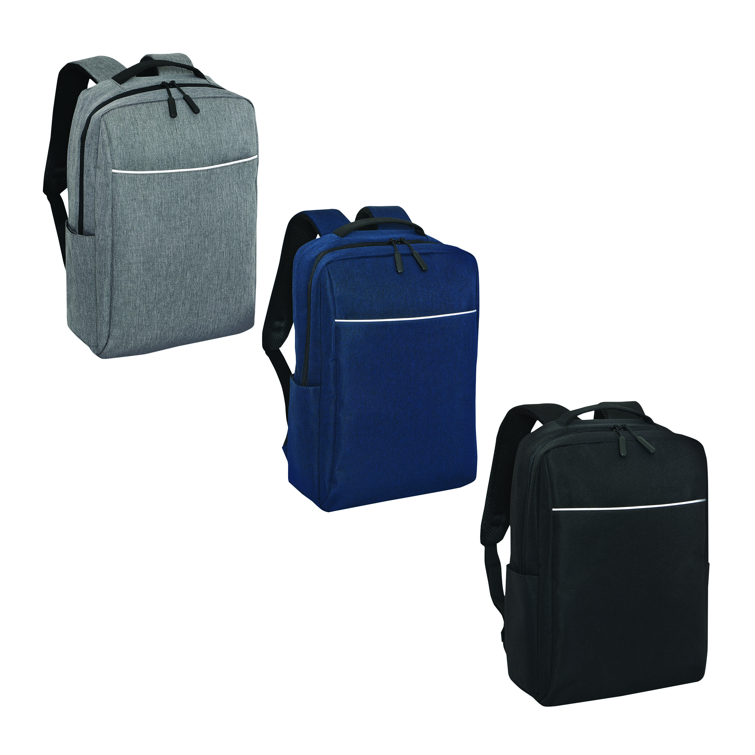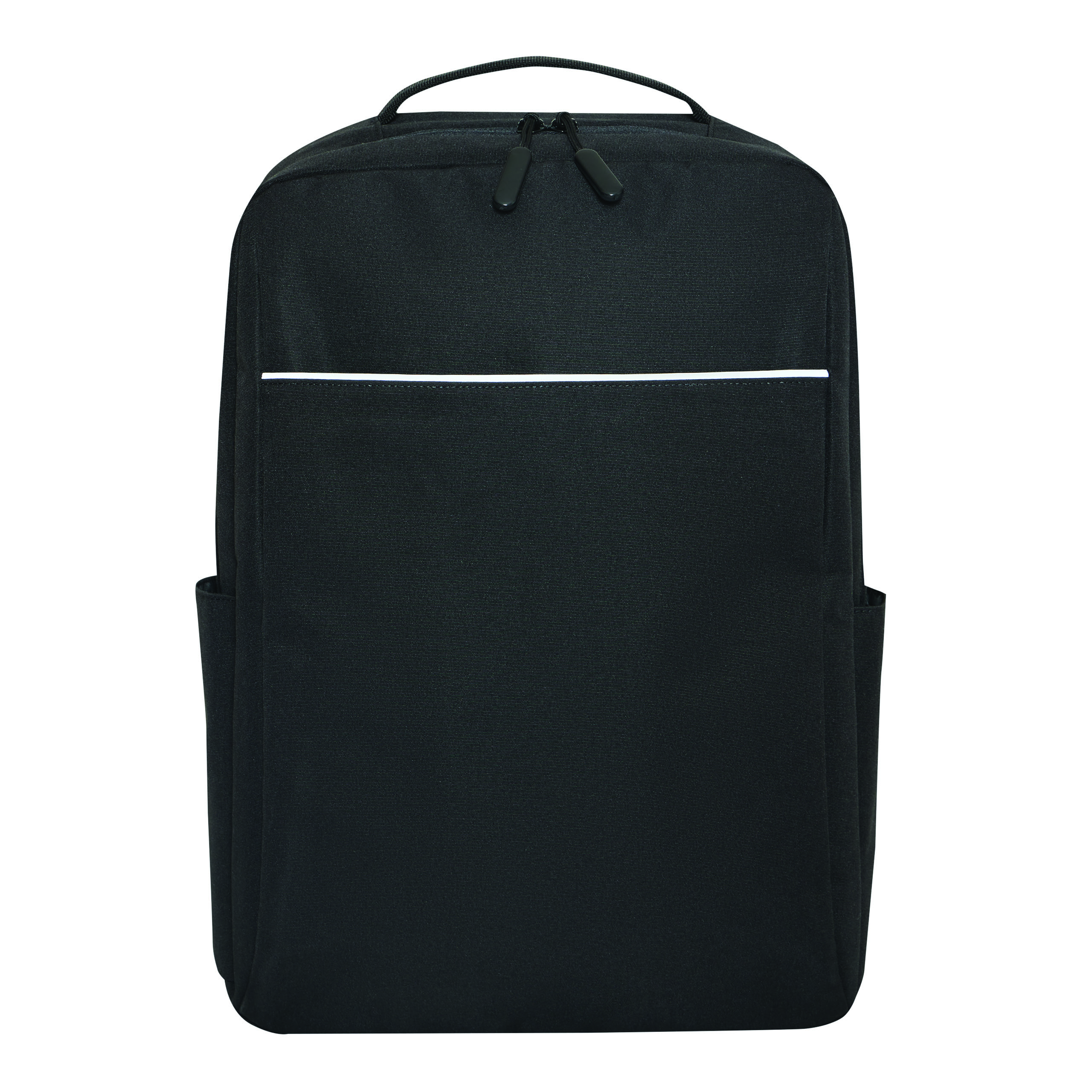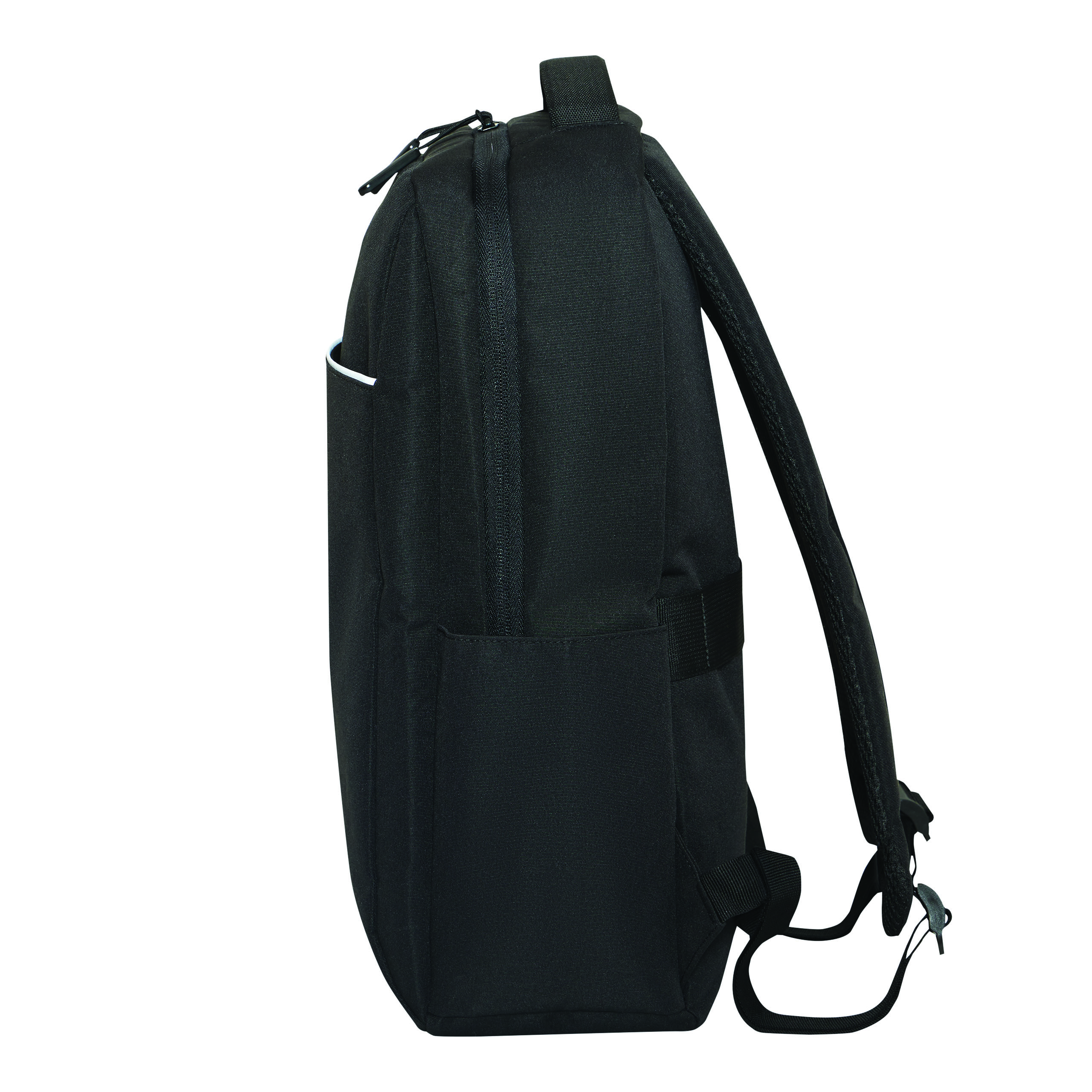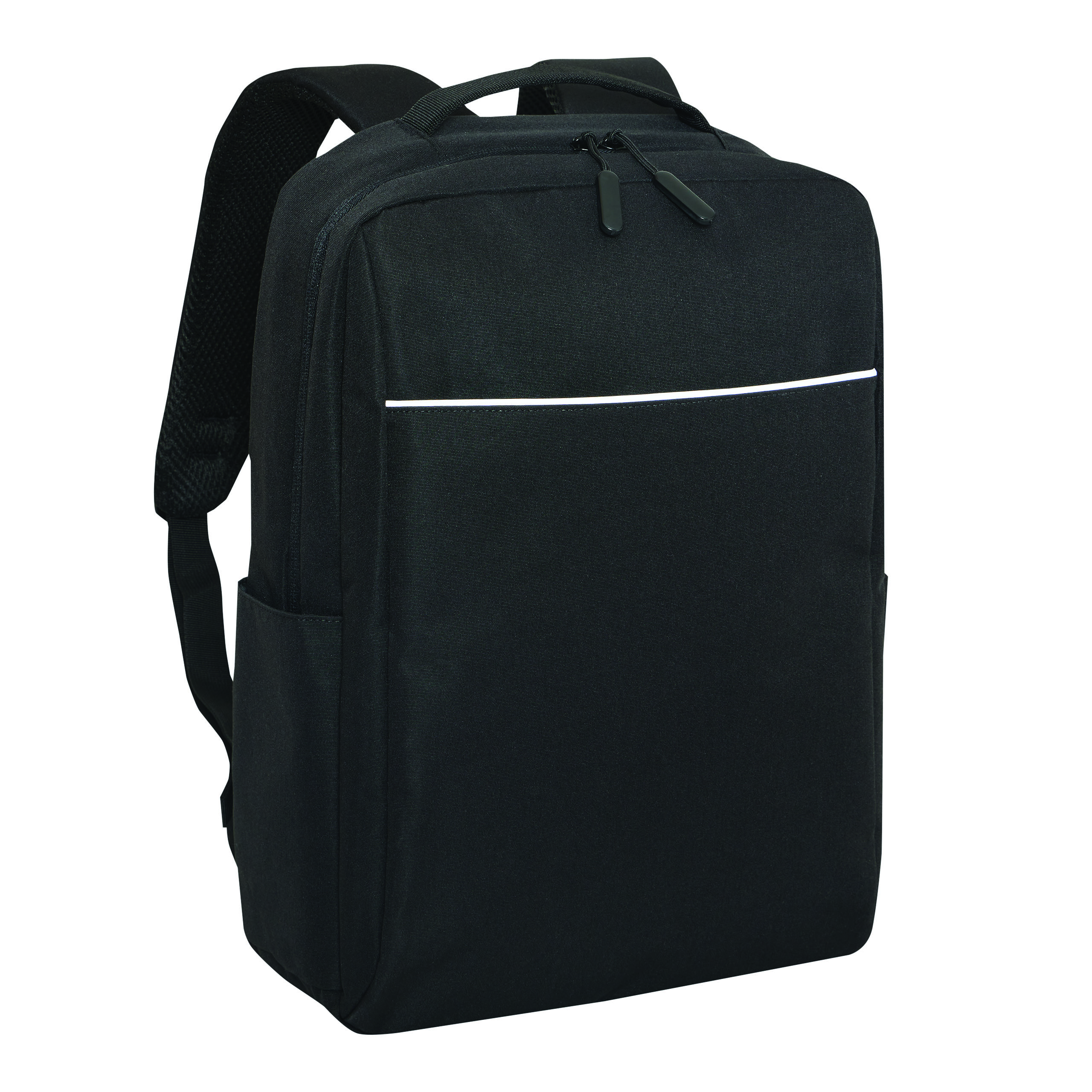 Plecak GHENT. Wykonany jest z poliestru pochodzącego z recyklingu (rPET). Ma 1 przednią kieszeń na zamek z odblaskową wstawką, komorę główną na zamek z wyściełaną kieszenią na laptopa lub tablet, organizer z 4 wsuwanymi kieszeniami, 2 boczne wsuwane kieszenie, wyściełany uchwyt do przenoszenia, wyściełane i regulowane szelki oraz pasek do mocowania na uchwycie walizki.