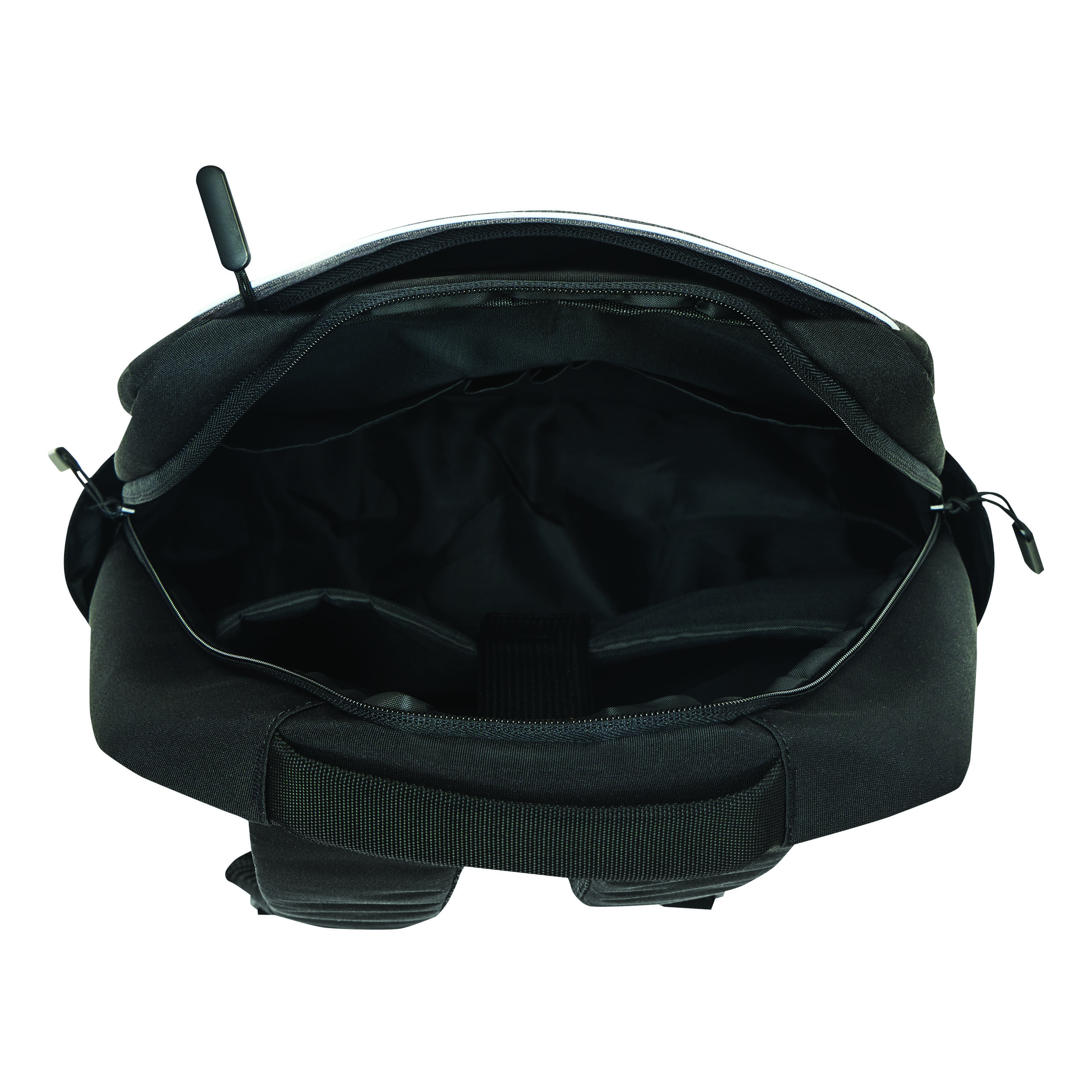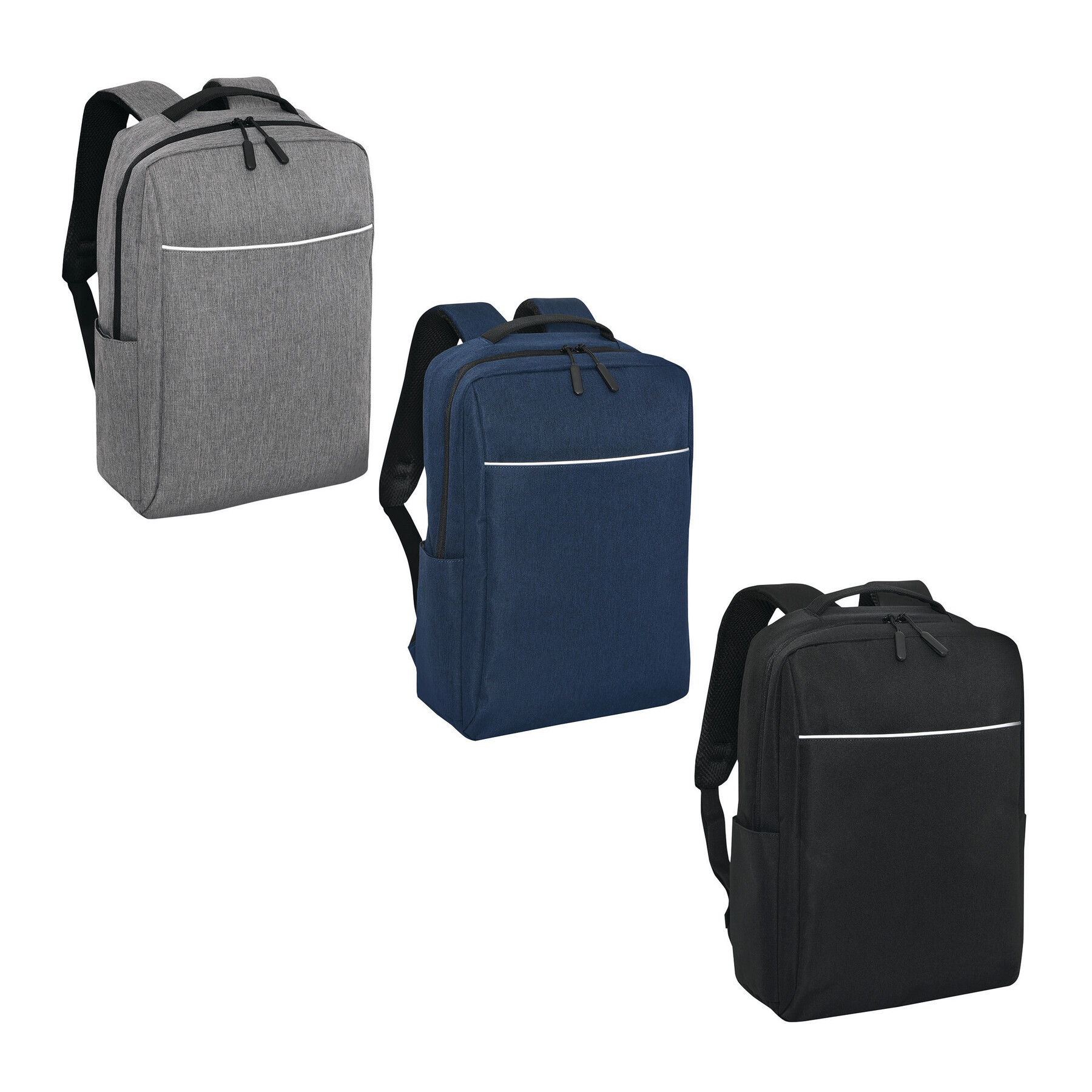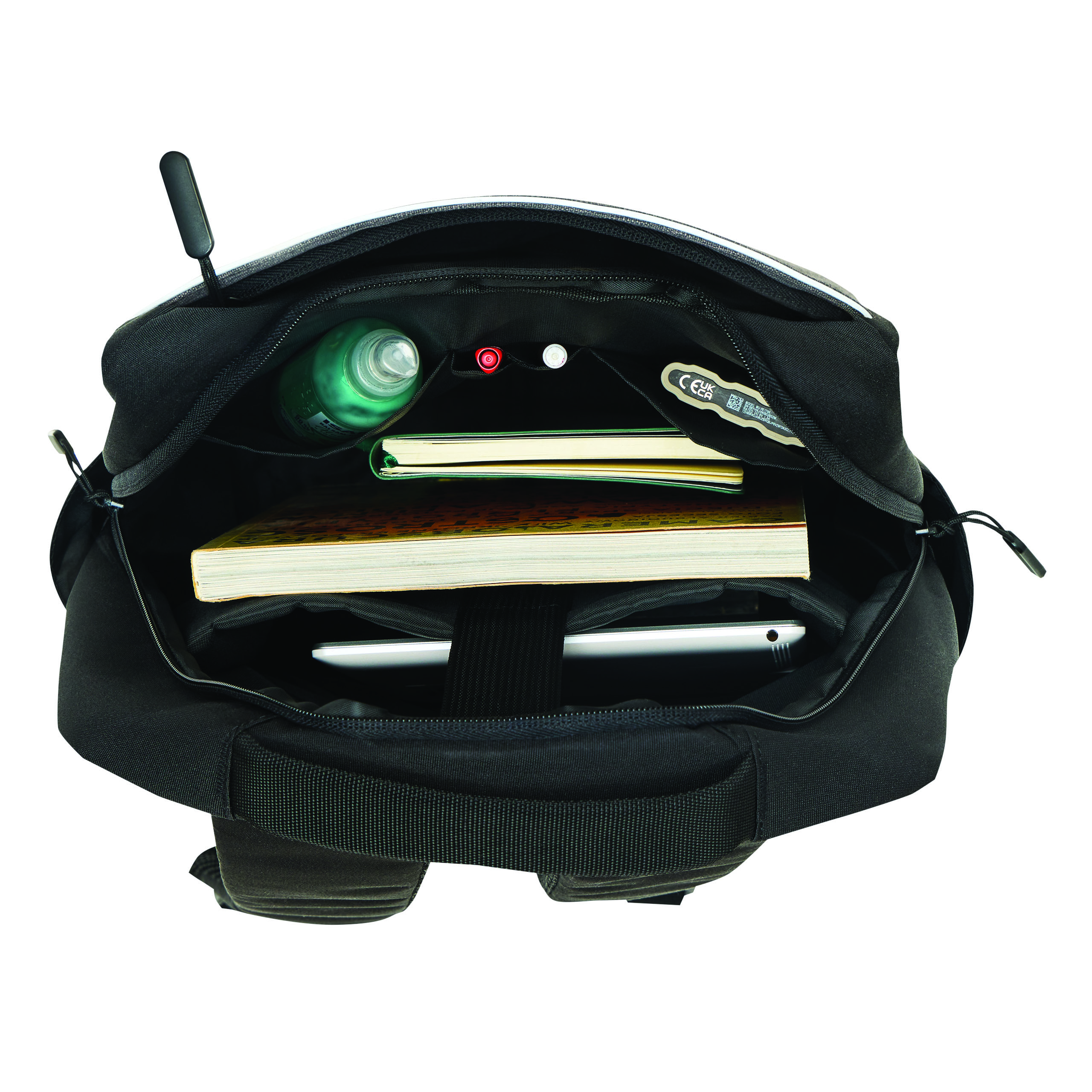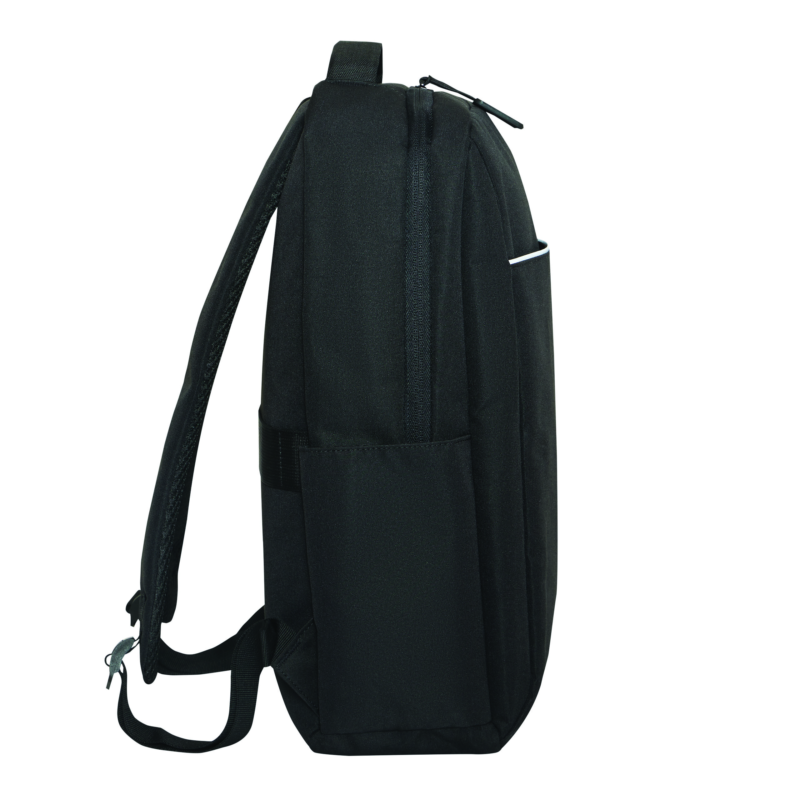 Plecak GHENT. Wykonany jest z poliestru pochodzącego z recyklingu (rPET). Ma 1 przednią kieszeń na zamek z odblaskową wstawką, komorę główną na zamek z wyściełaną kieszenią na laptopa lub tablet, organizer z 4 wsuwanymi kieszeniami, 2 boczne wsuwane kieszenie, wyściełany uchwyt do przenoszenia, wyściełane i regulowane szelki oraz pasek do mocowania na uchwycie walizki.