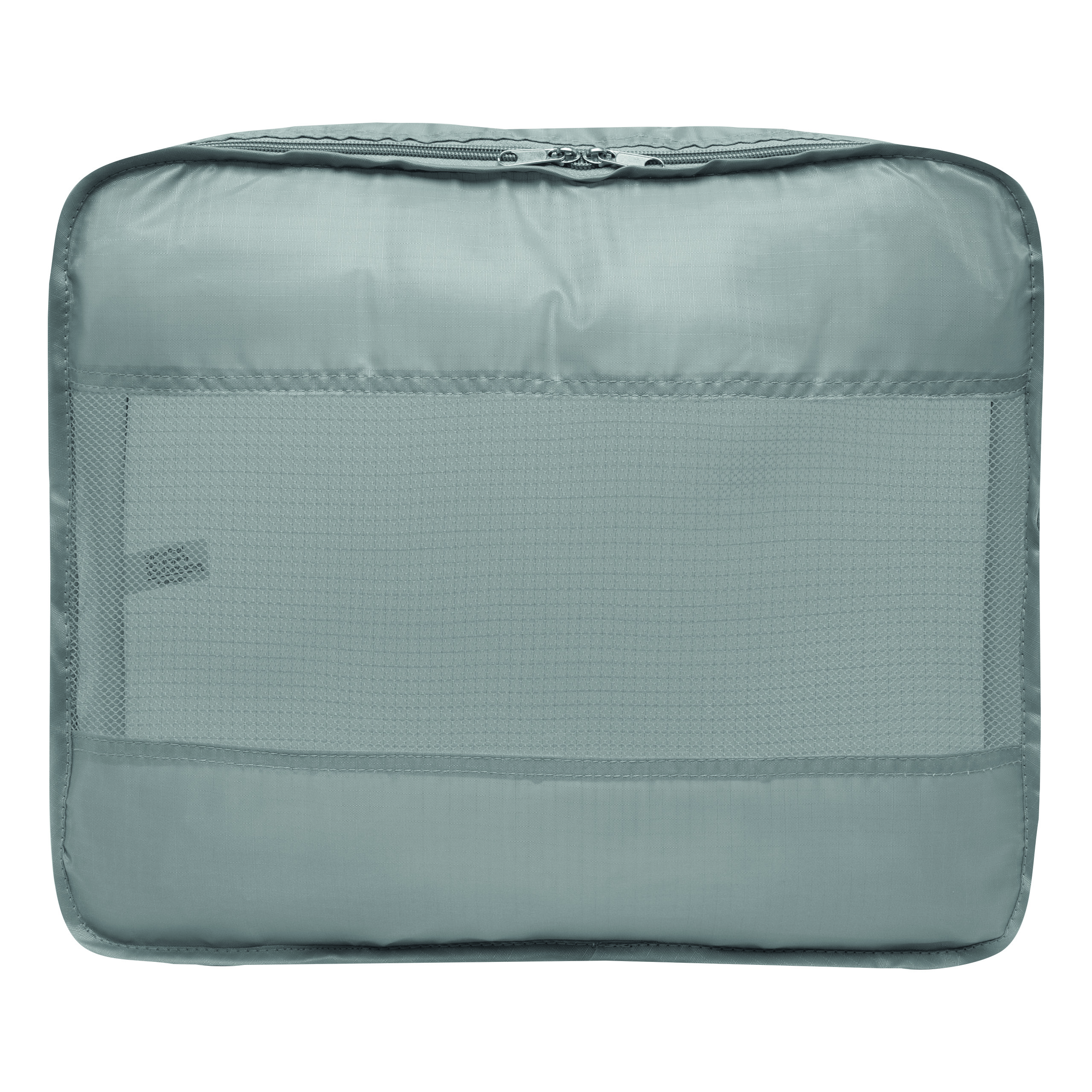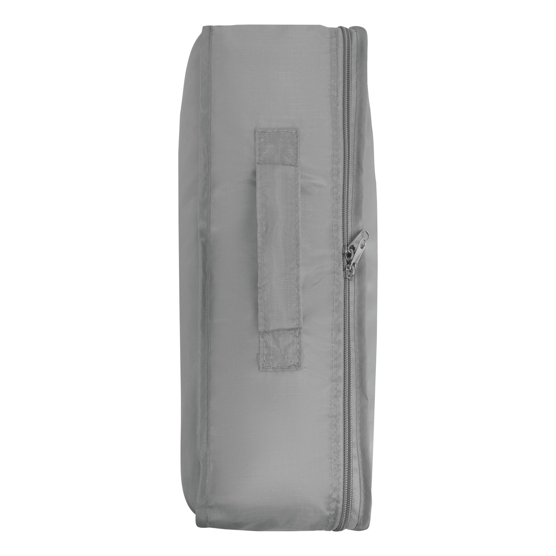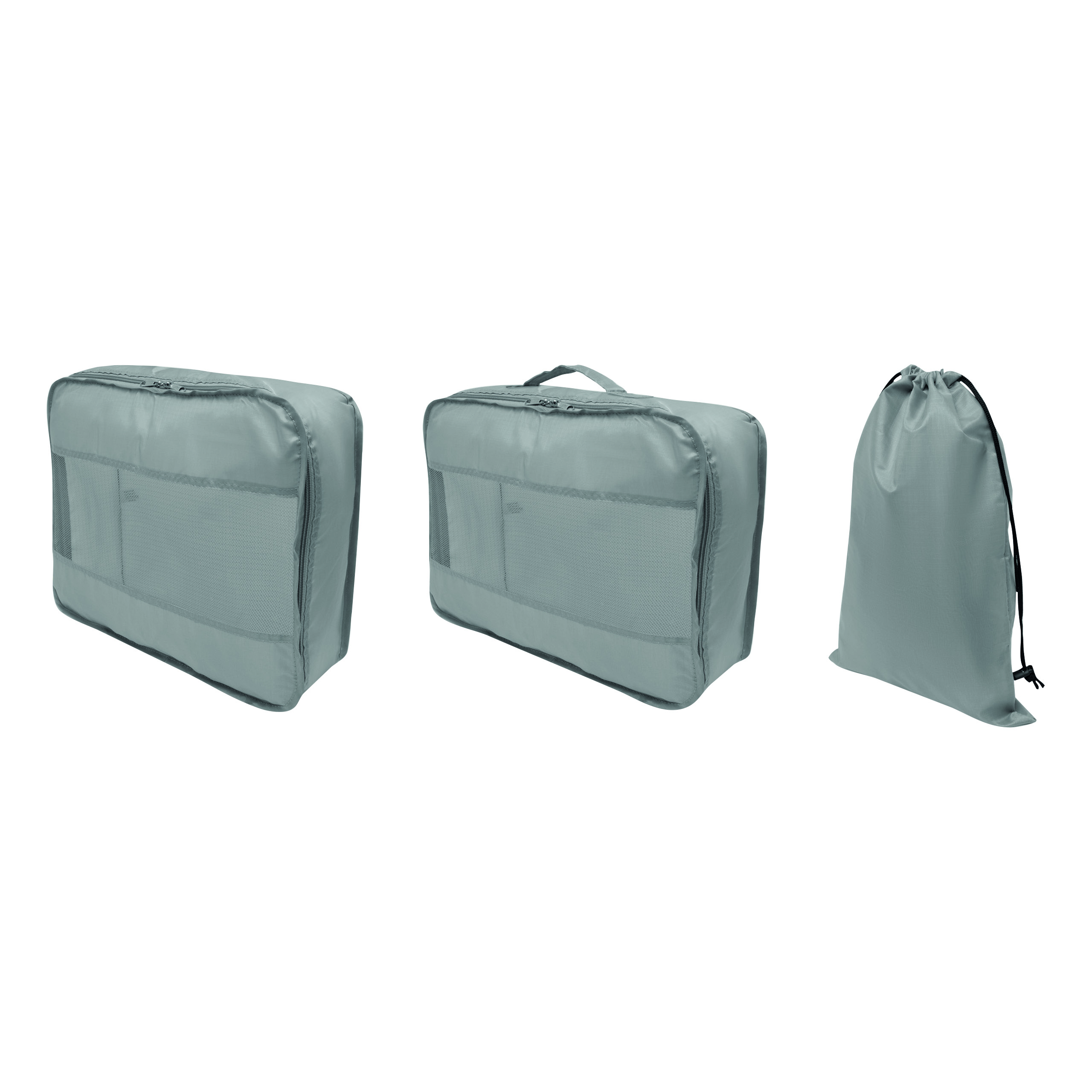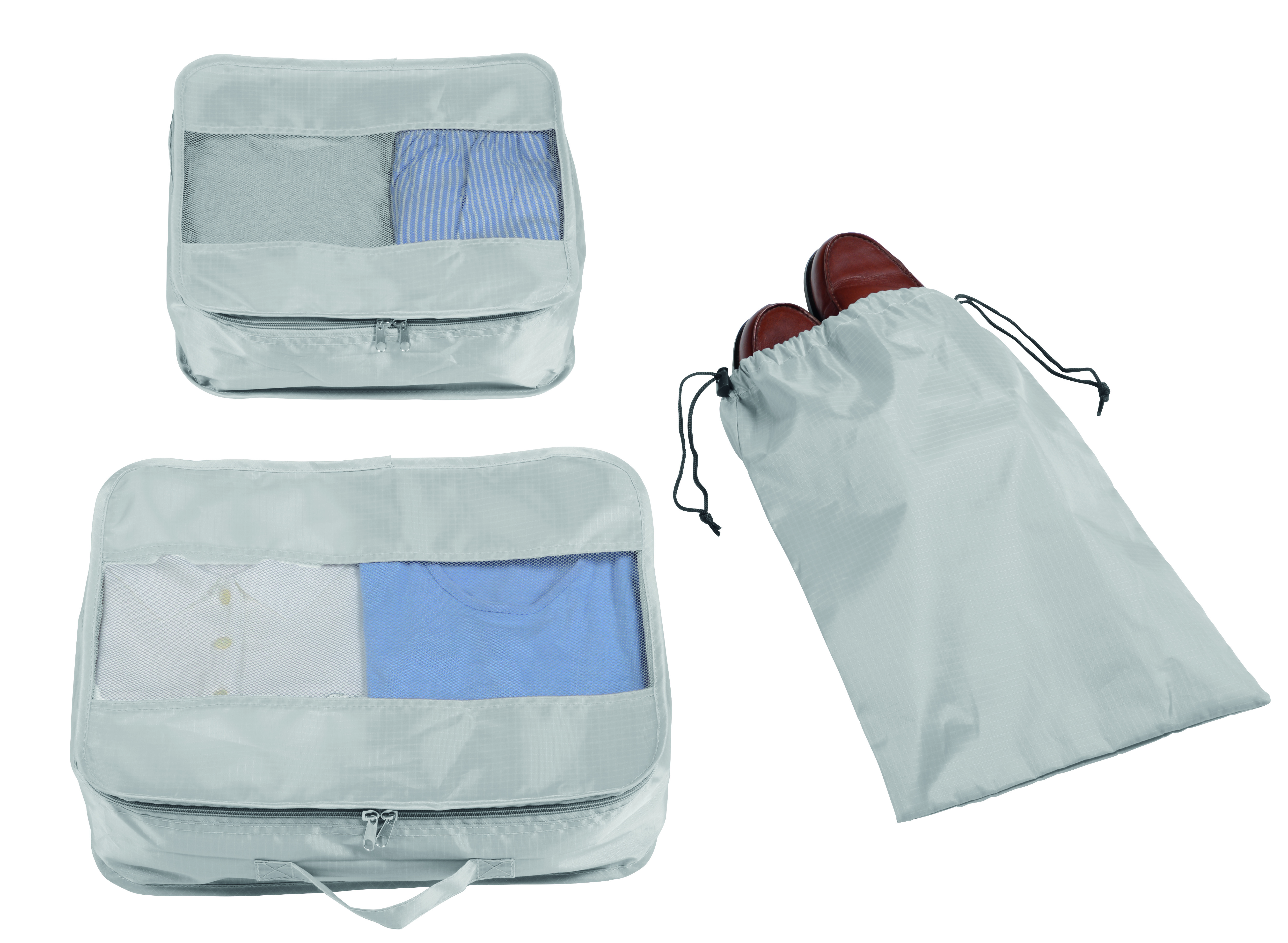 Zestaw podróżny TRAVEL ATTENDANT składający się z 3 elementów. Dwa pojemniki na ubrania w różnych rozmiarach, z siateczkowymi okienkami do wentylacji i prezentacji zawartości, z podwójnym zamkiem, z rączką do przenoszenia przy większym pojemniku. Worek na buty ze ściągaczem dla zachowania czystości w walizce.