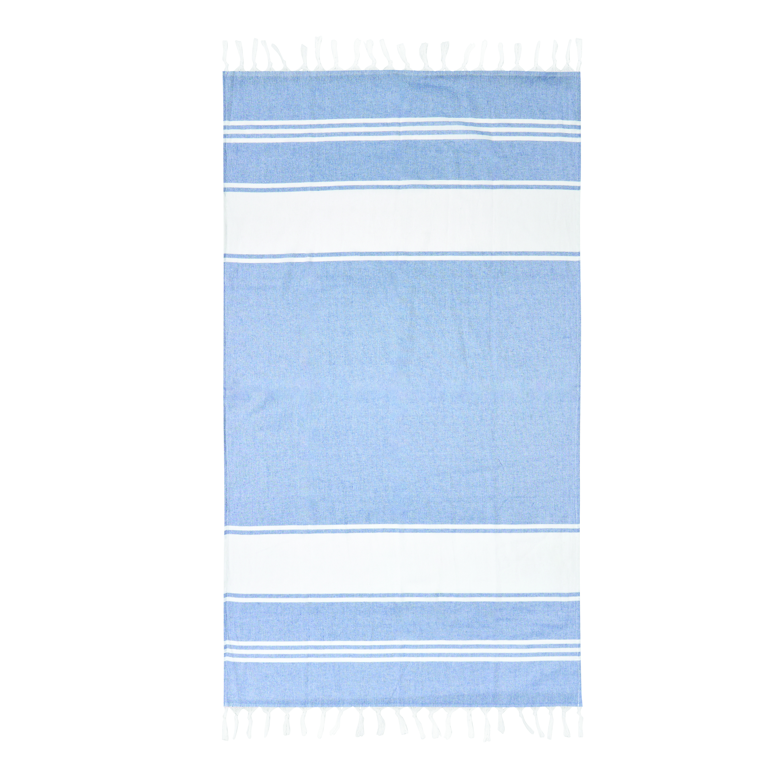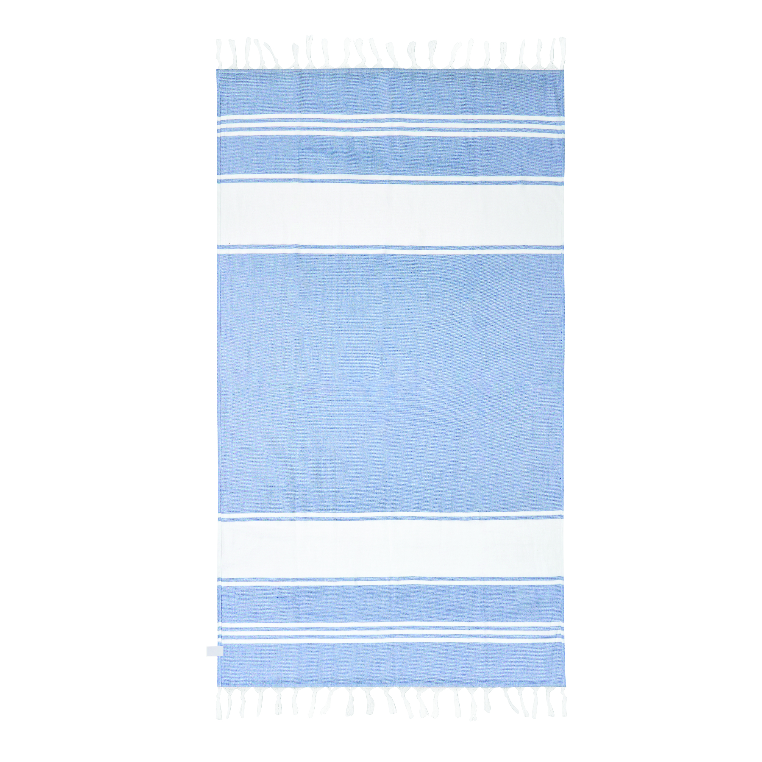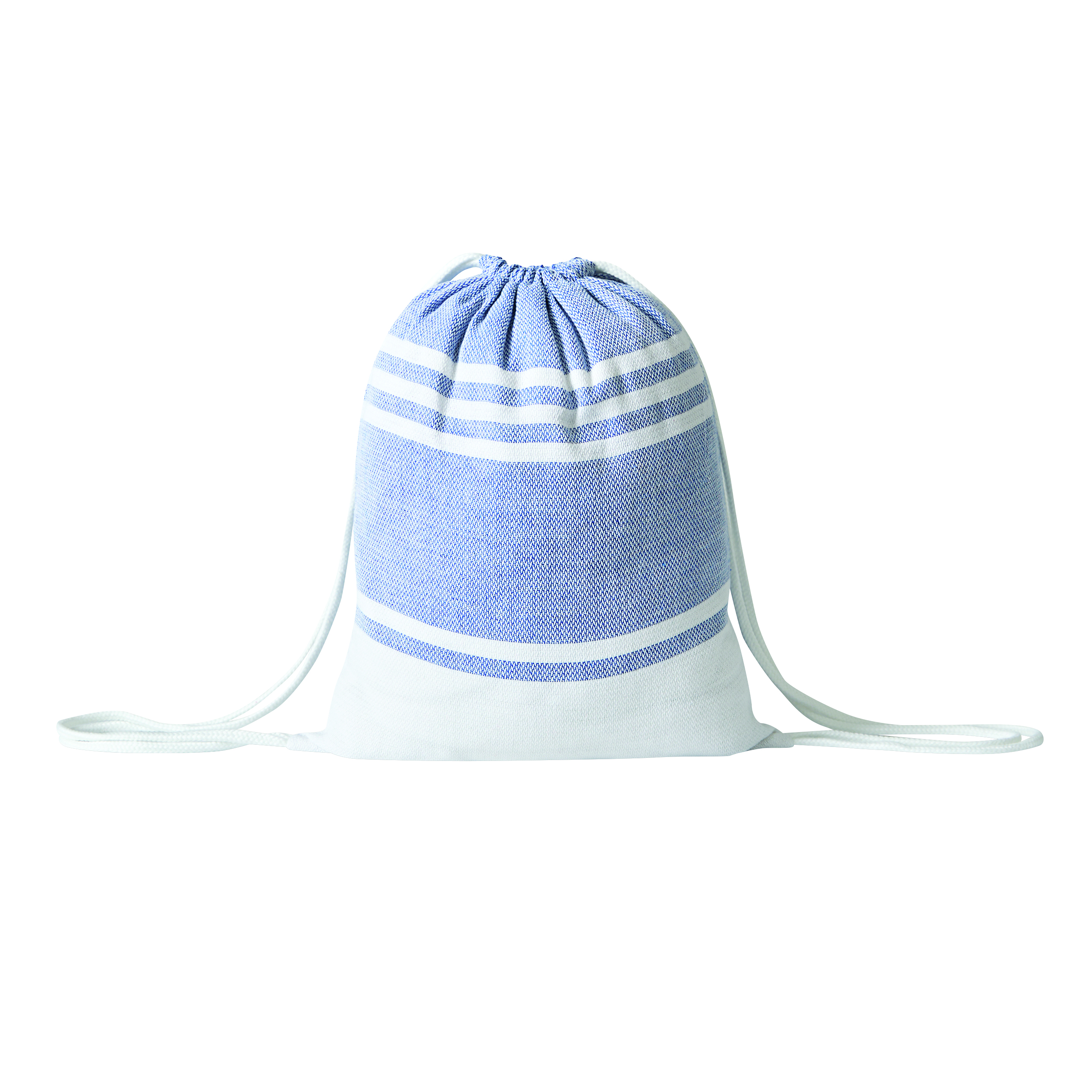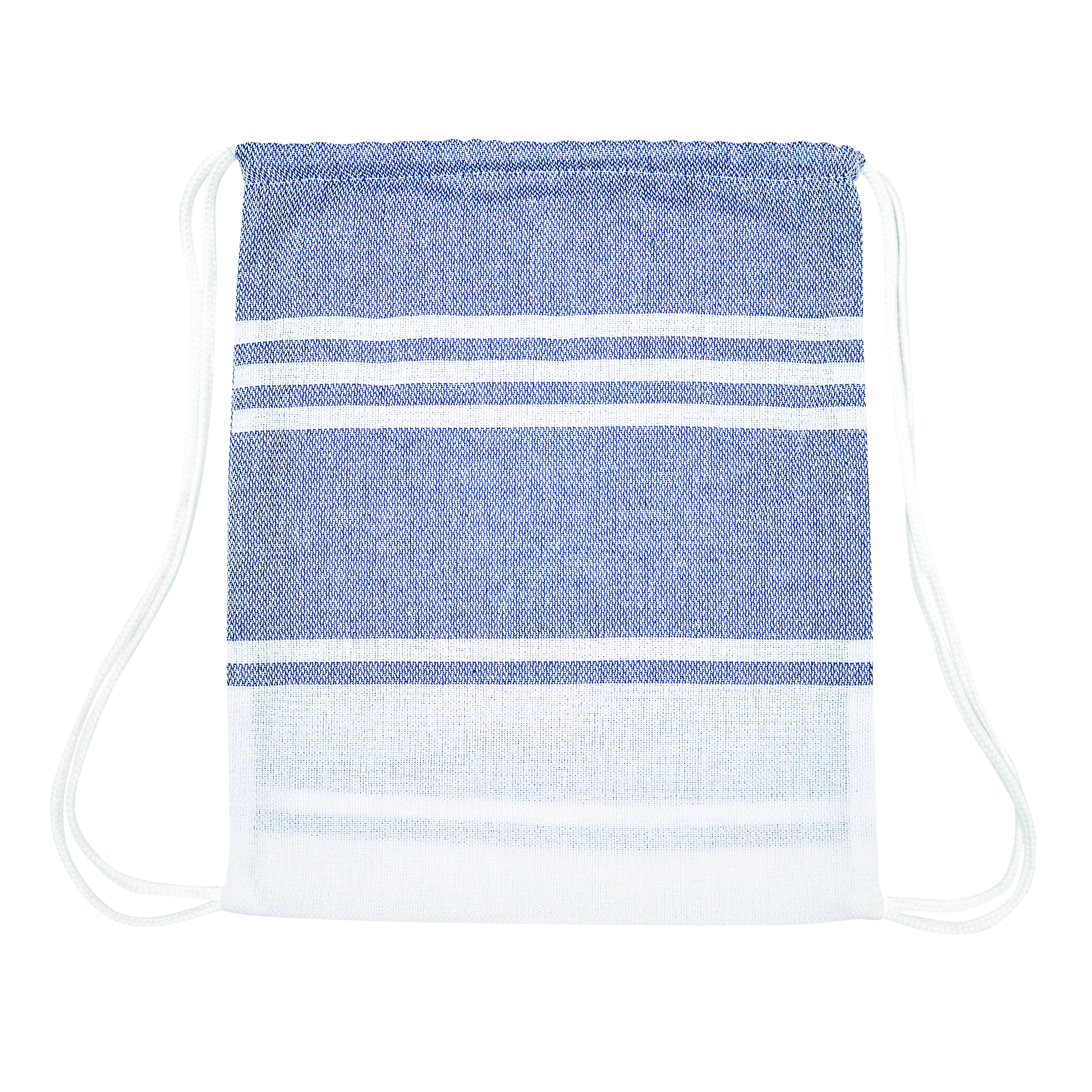 Duży ręcznik plażowy lub do sauny SUN & STEAM. To duży ręcznik z białymi paskami i frędzlami. Zapakowany jest w dopasowaną kolorystycznie torbę ze ściągaczem.