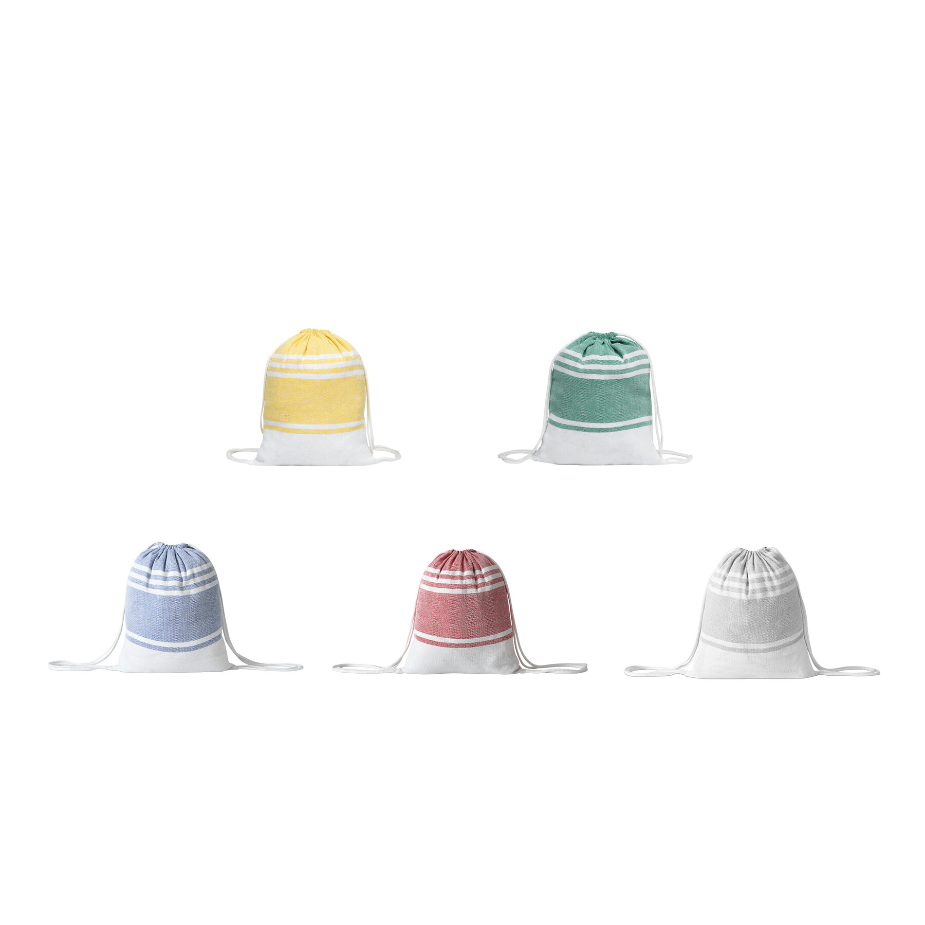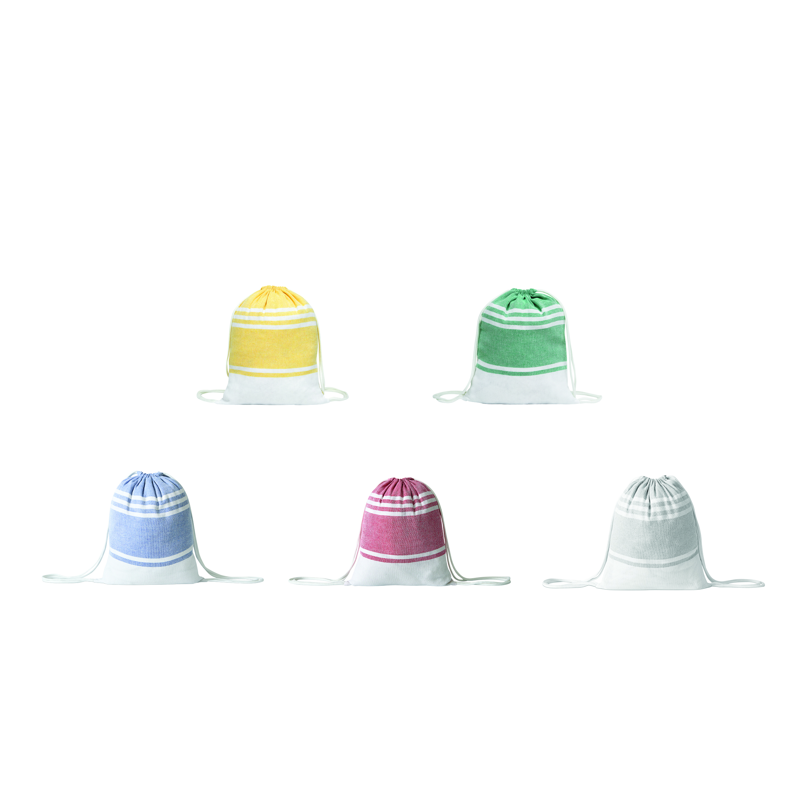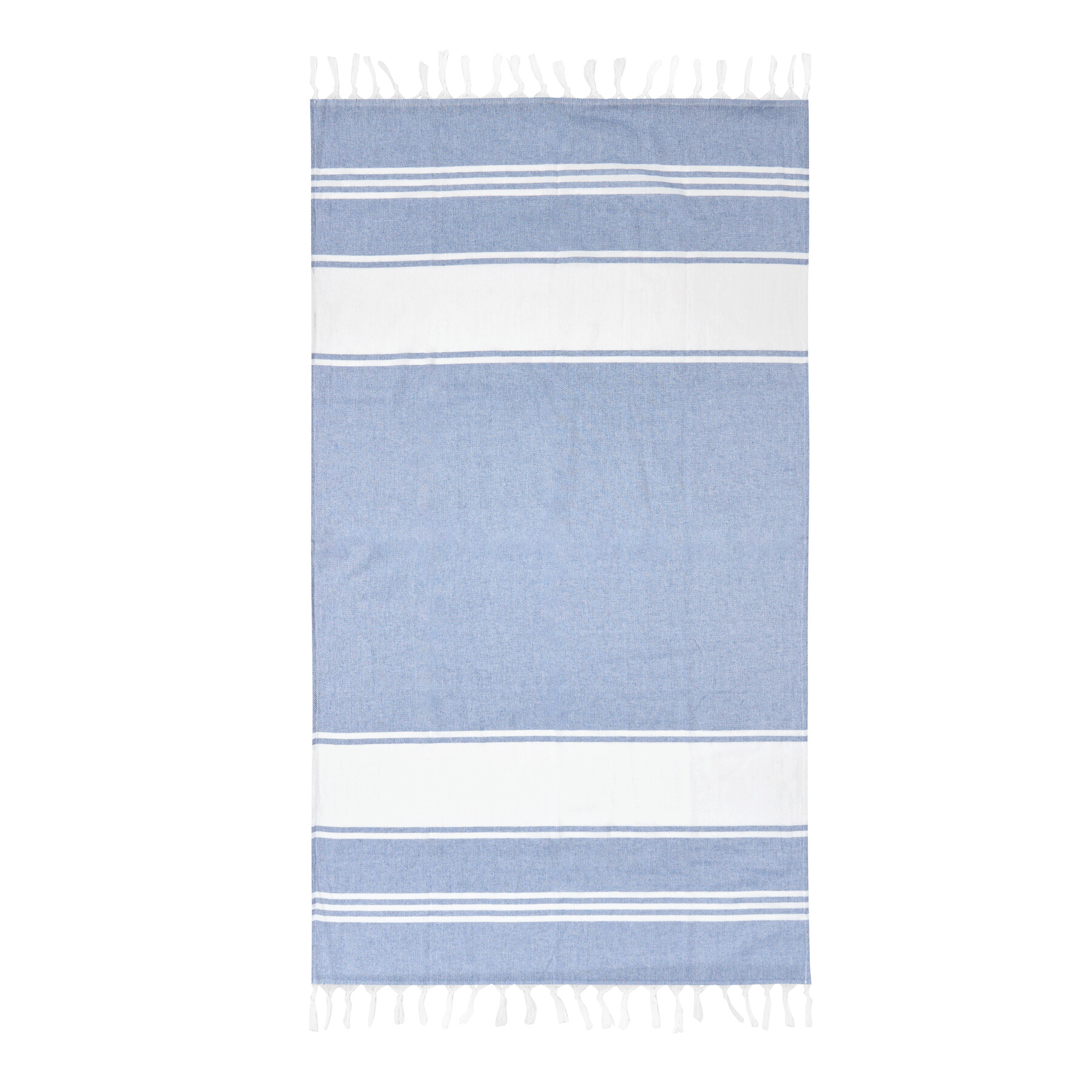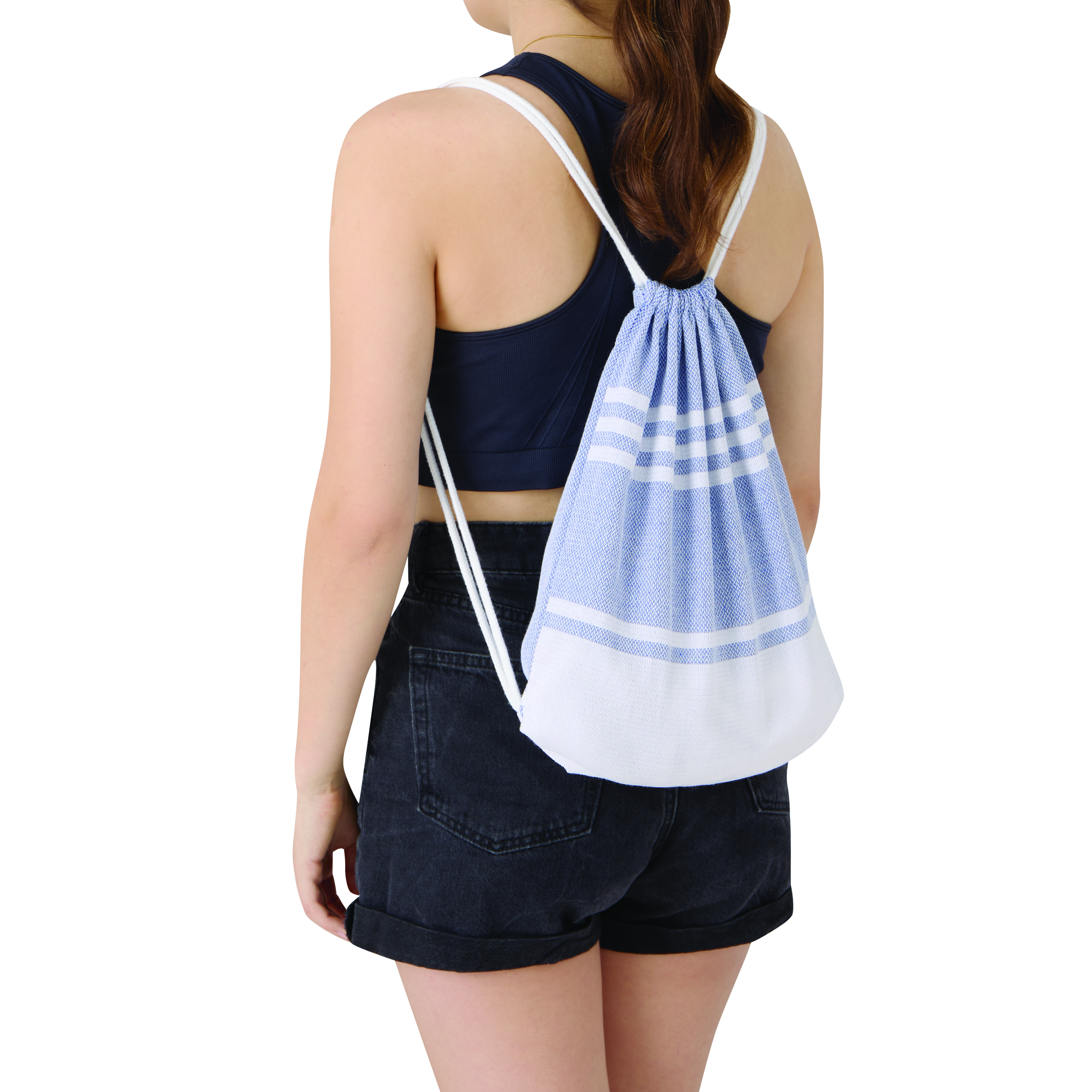Duży ręcznik plażowy lub do sauny SUN & STEAM. To duży ręcznik z białymi paskami i frędzlami. Zapakowany jest w dopasowaną kolorystycznie torbę ze ściągaczem.