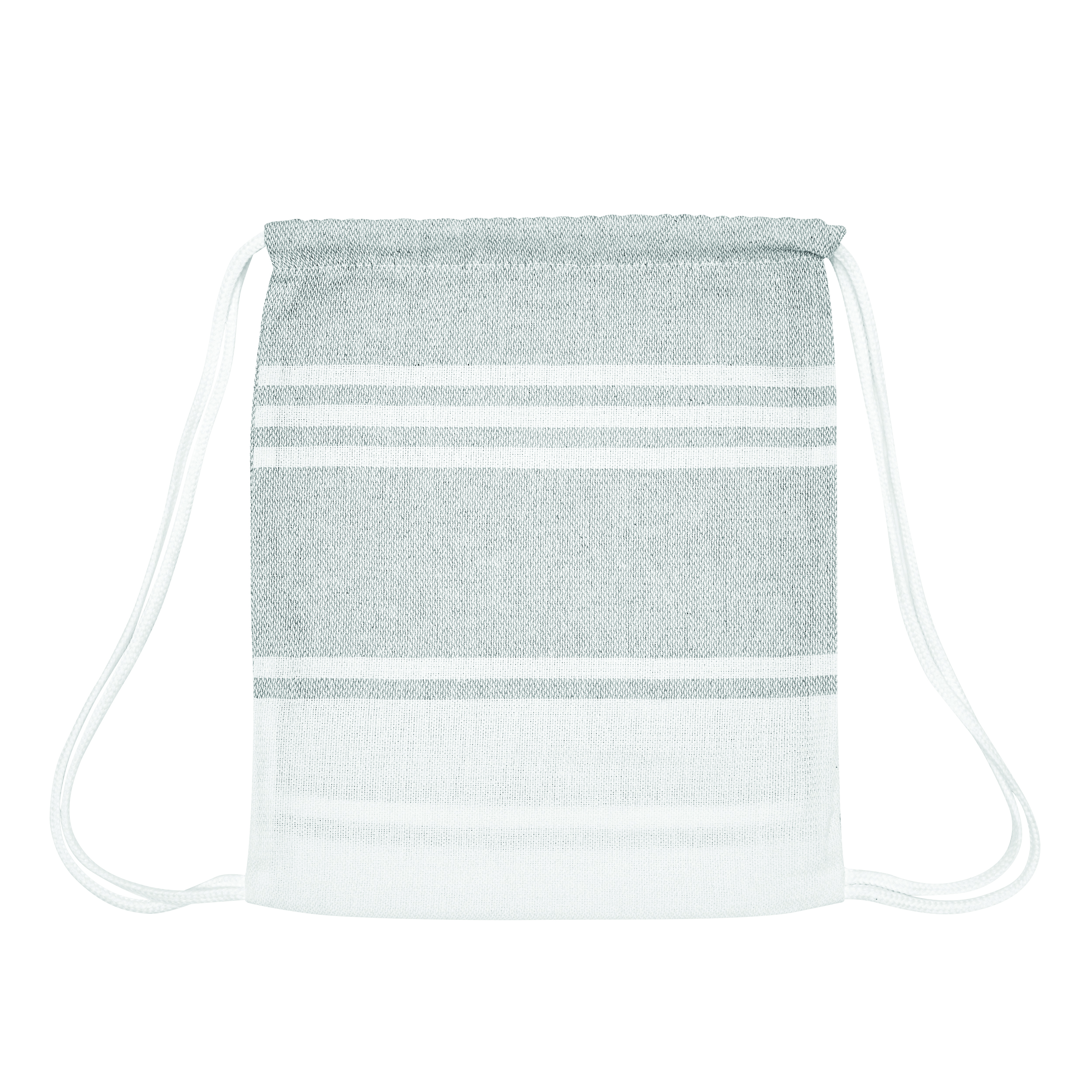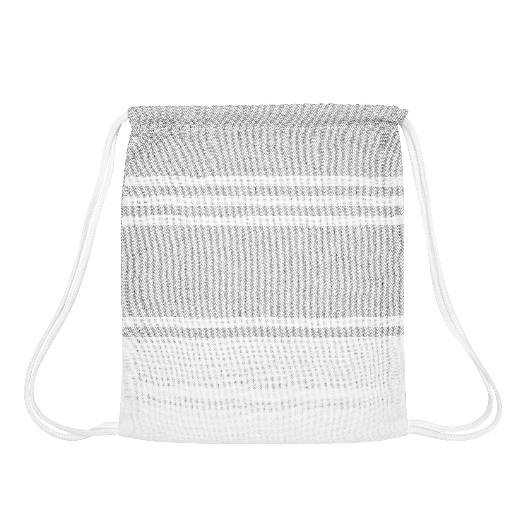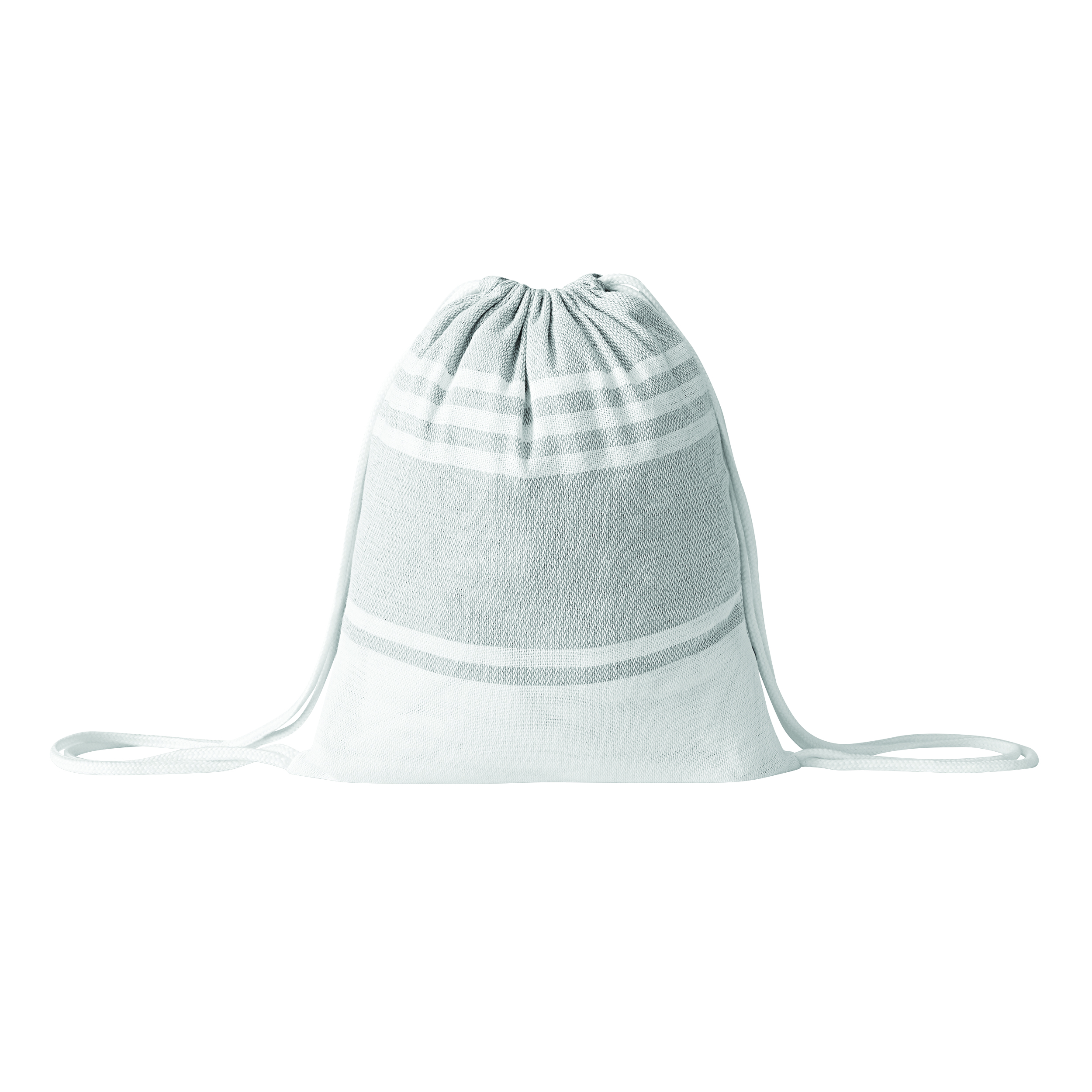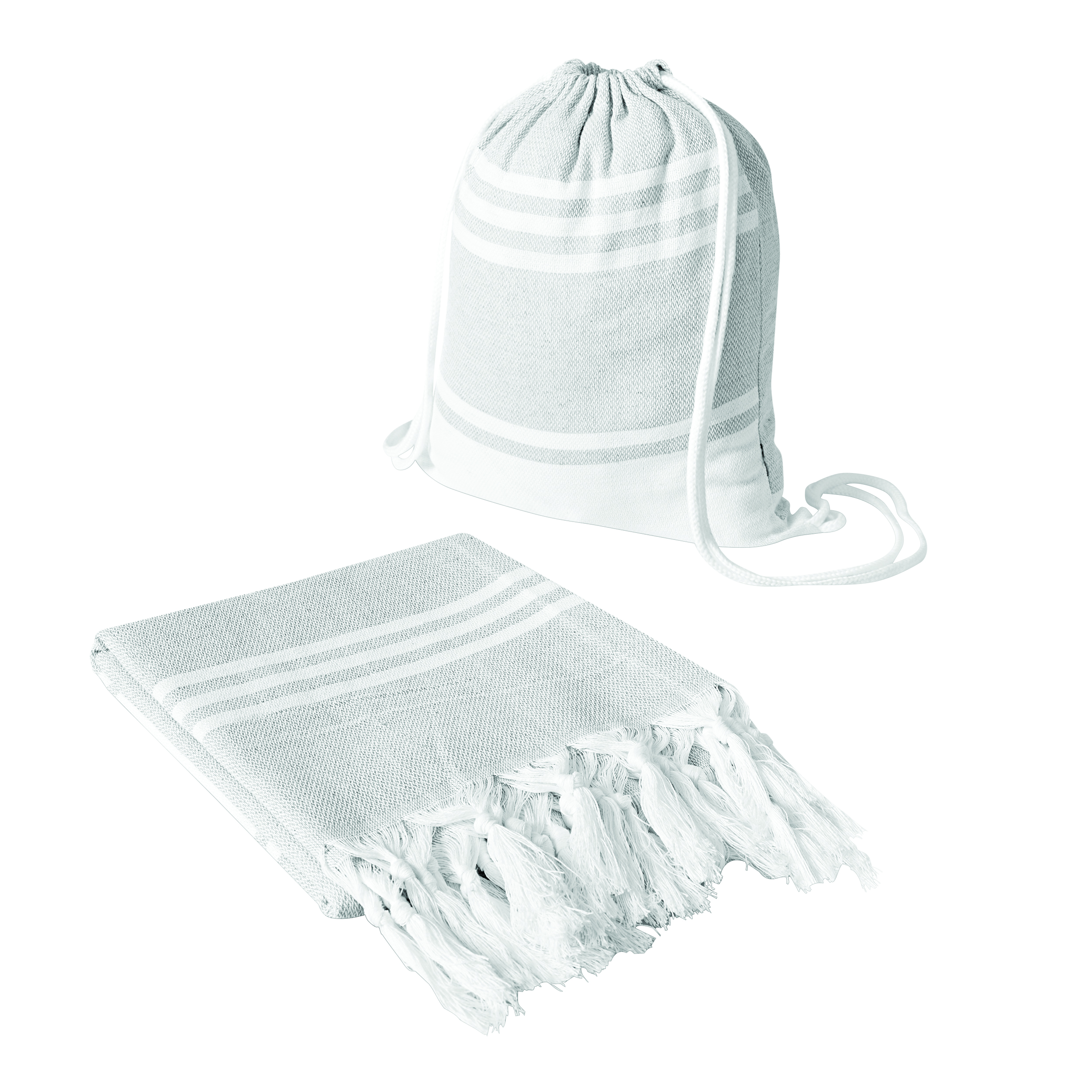 Duży ręcznik plażowy lub do sauny SUN & STEAM. To duży ręcznik z białymi paskami i frędzlami. Zapakowany jest w dopasowaną kolorystycznie torbę ze ściągaczem.