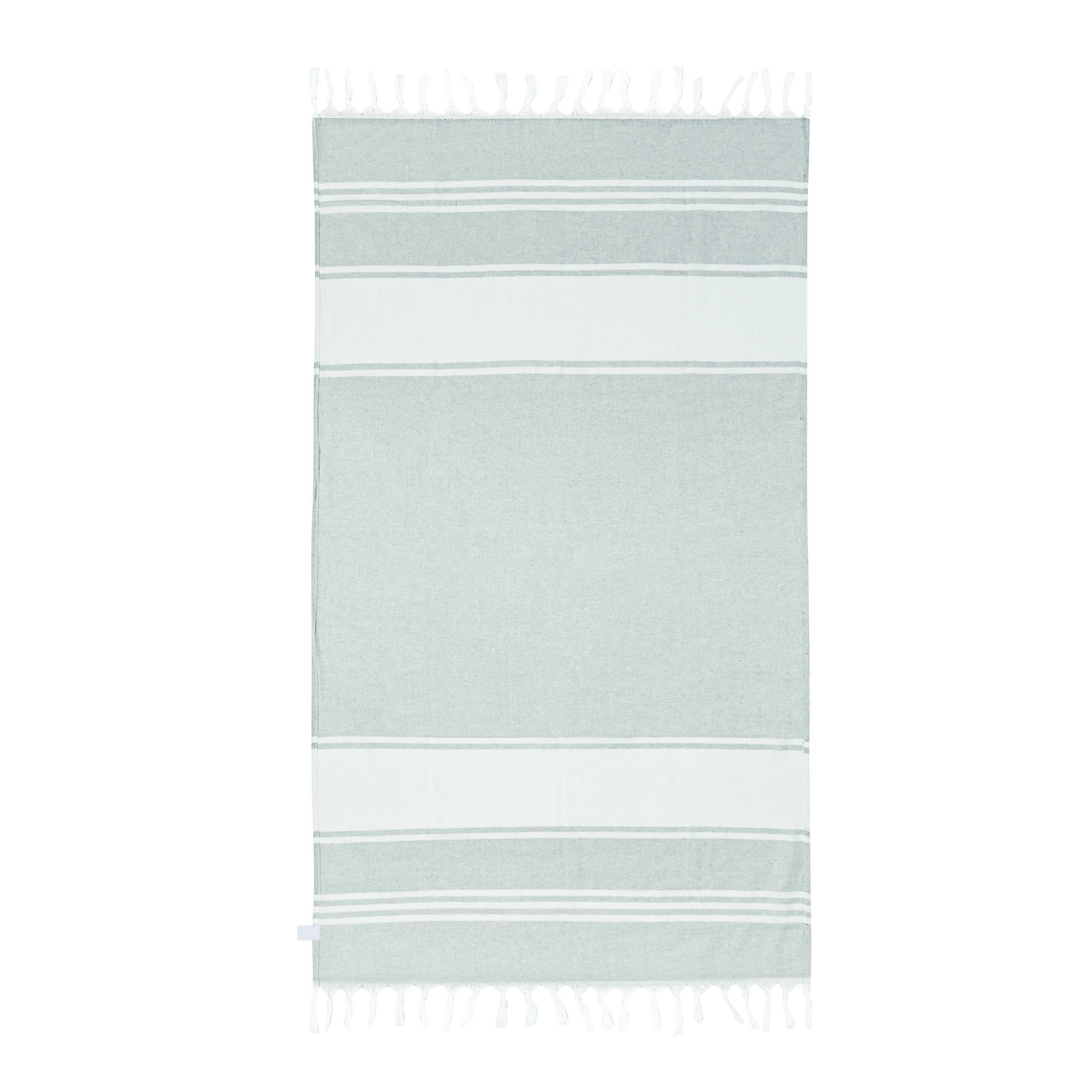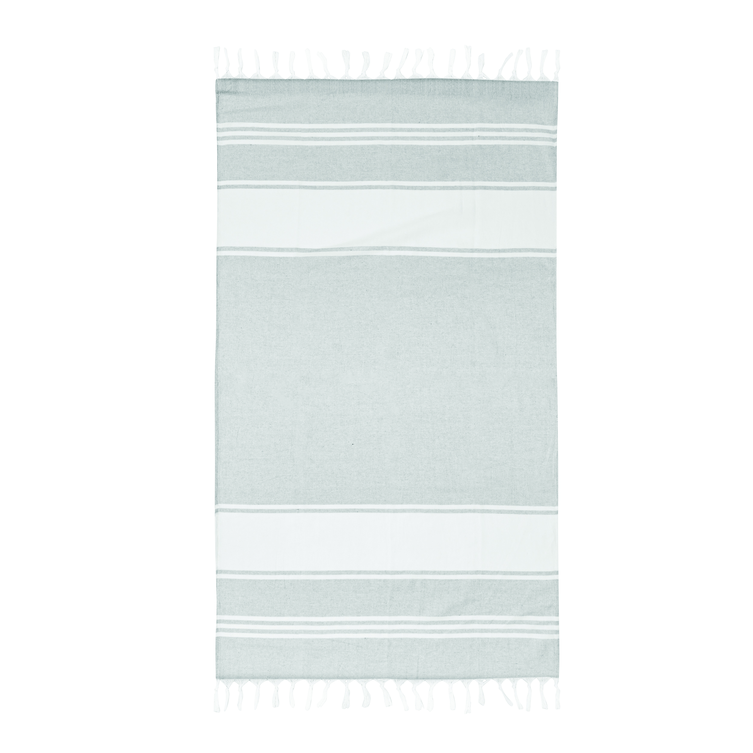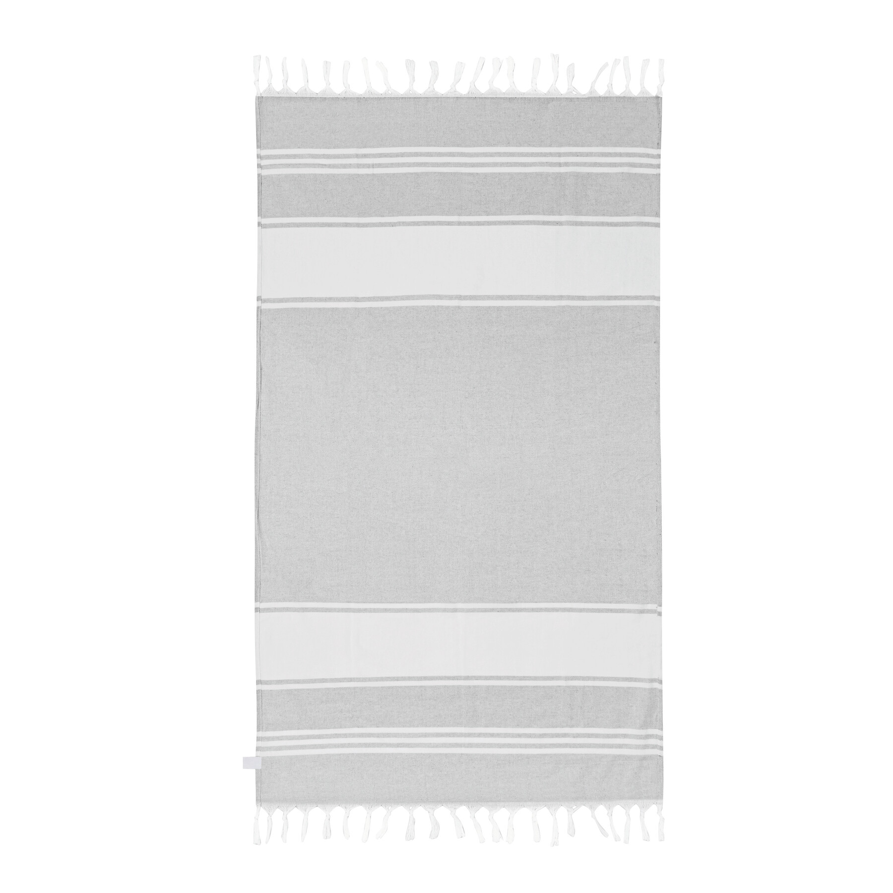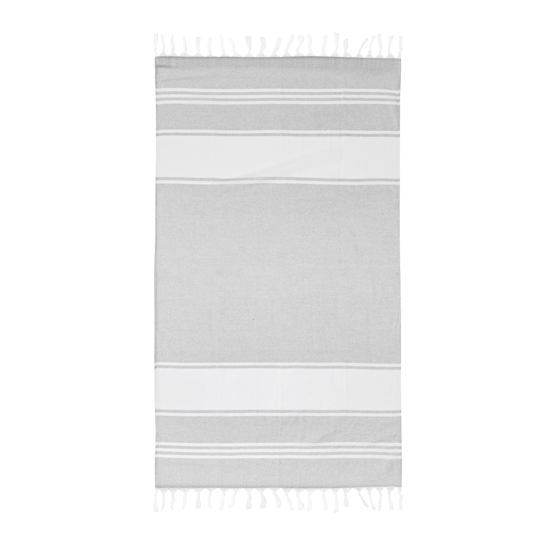 Duży ręcznik plażowy lub do sauny SUN & STEAM. To duży ręcznik z białymi paskami i frędzlami. Zapakowany jest w dopasowaną kolorystycznie torbę ze ściągaczem.