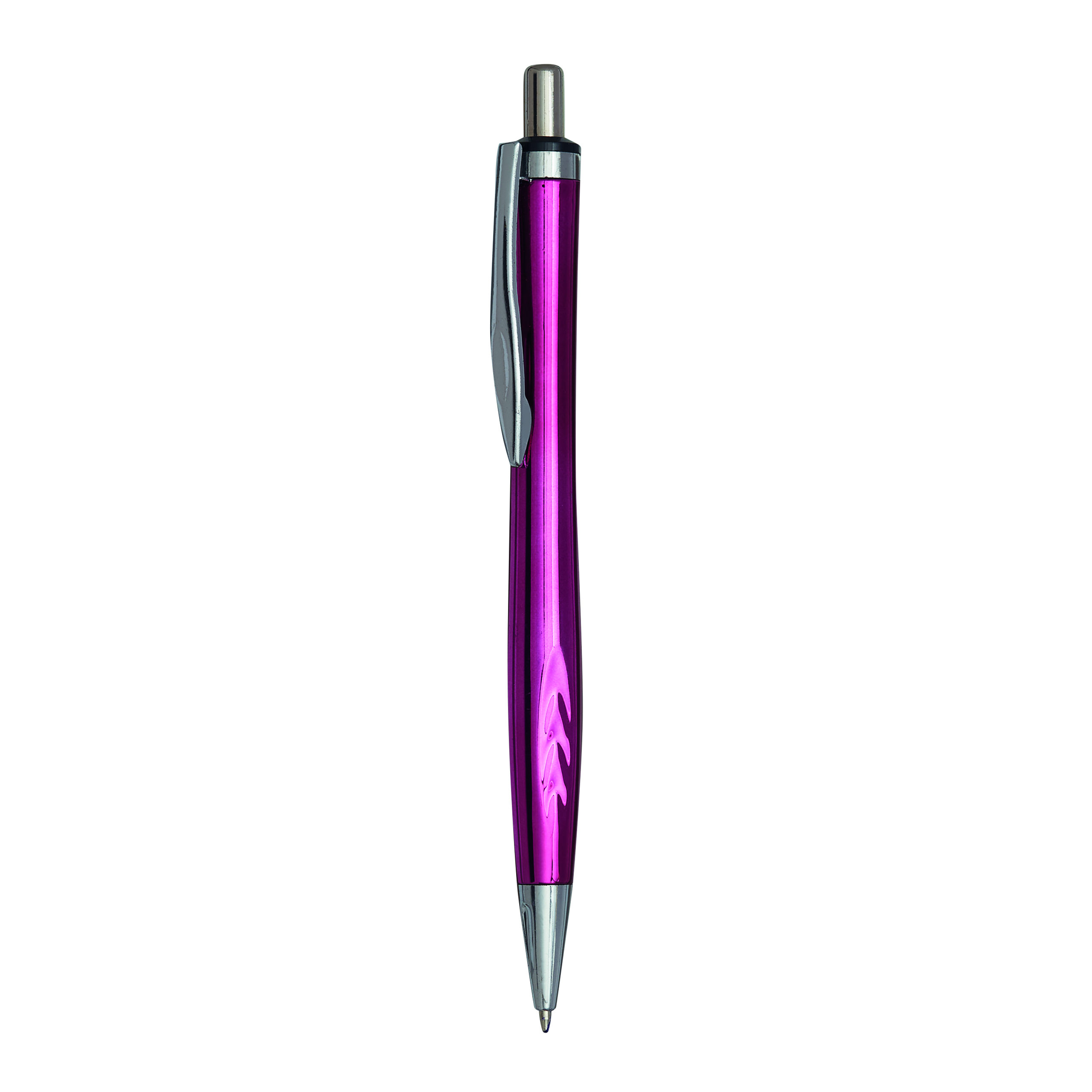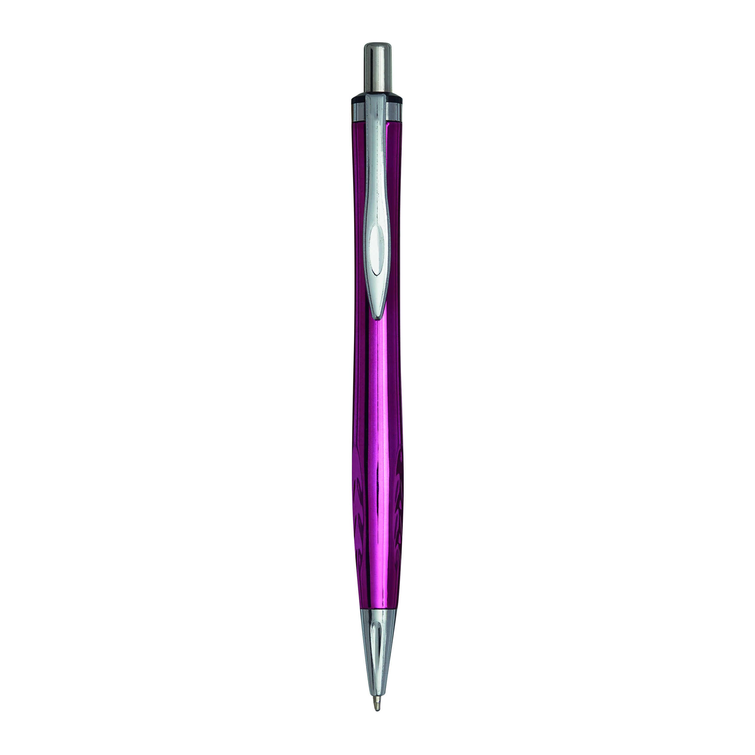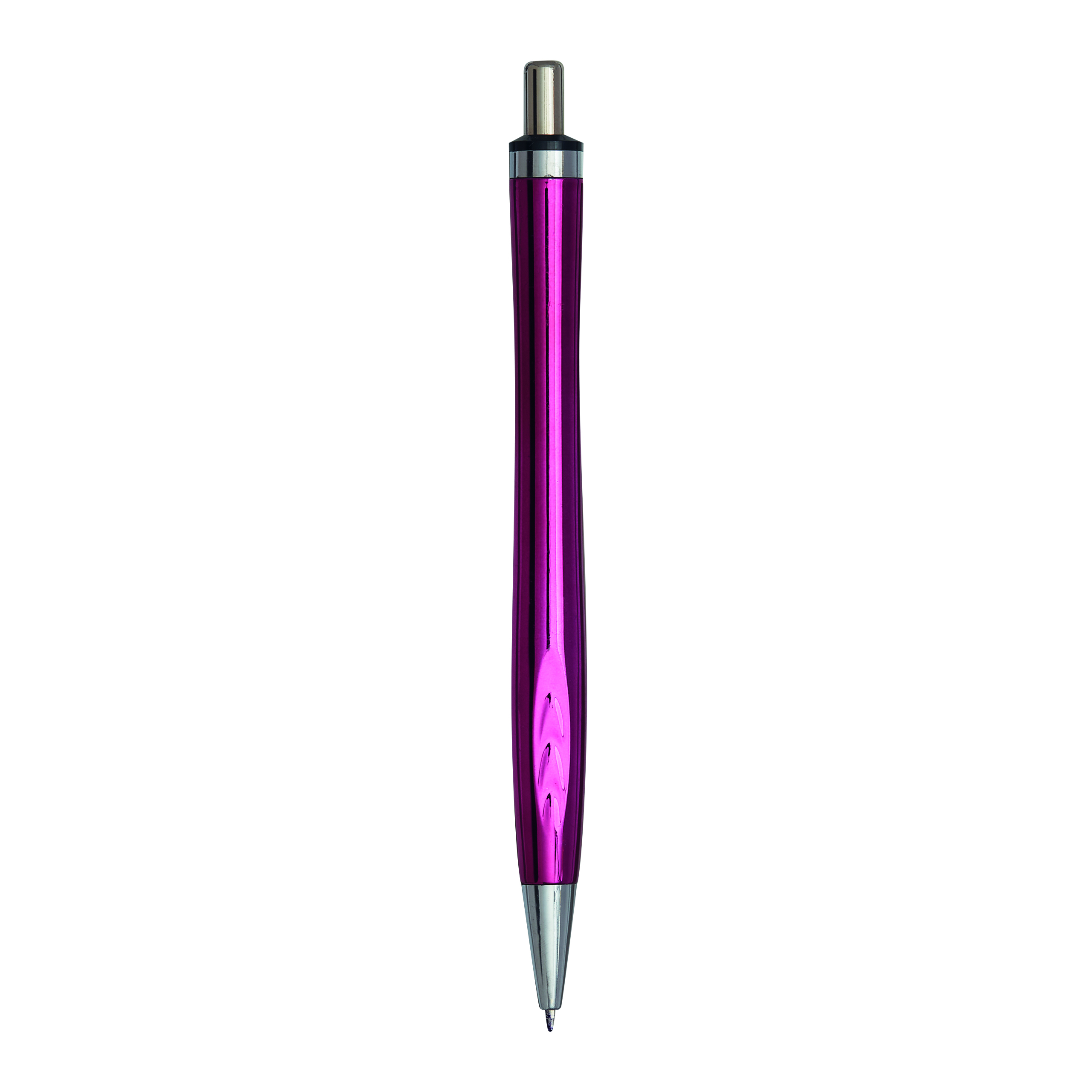 Długopis ASCOT z połyskującym korpusem, metalowym klipem, mechanizmem przyciskowym i niebieskim tuszem.