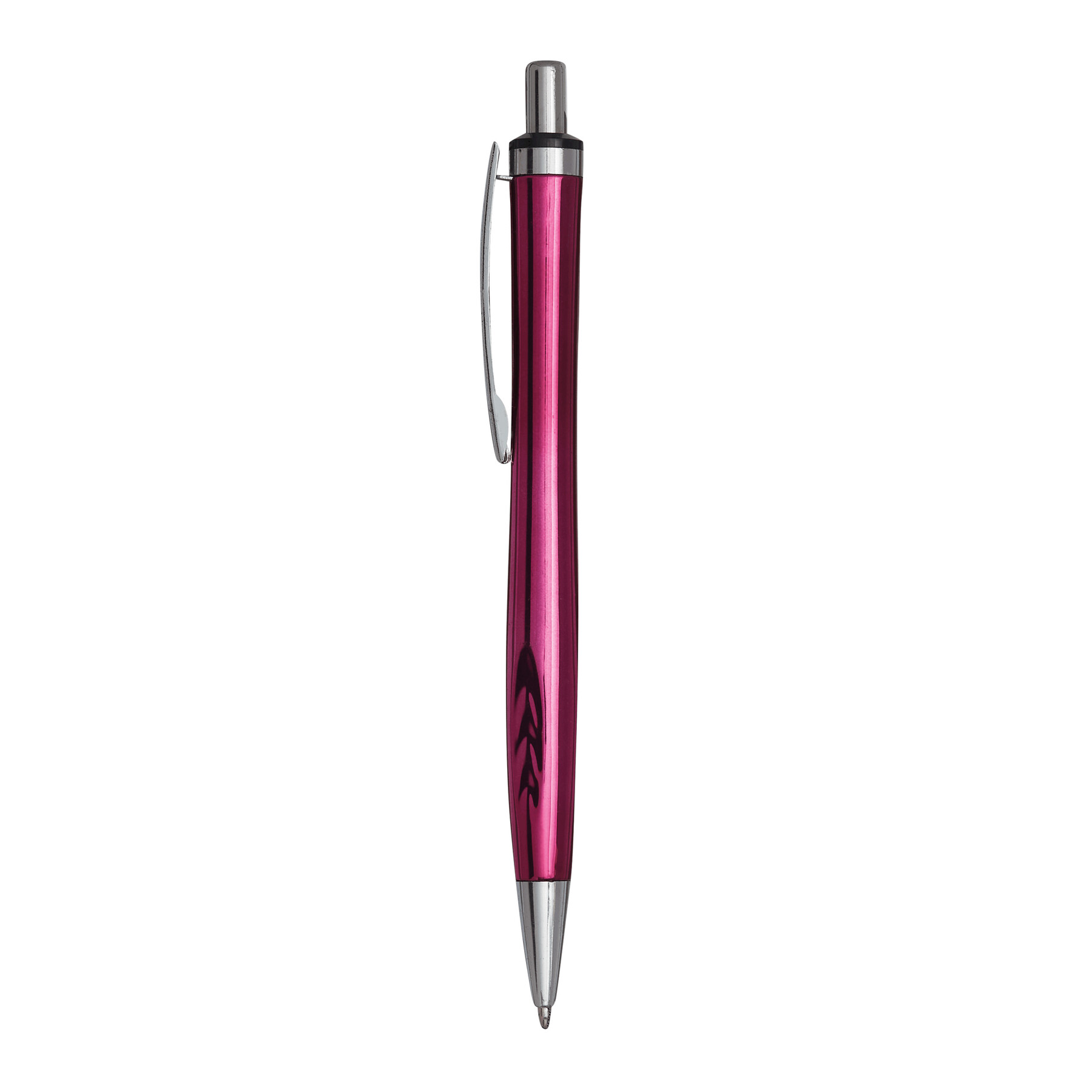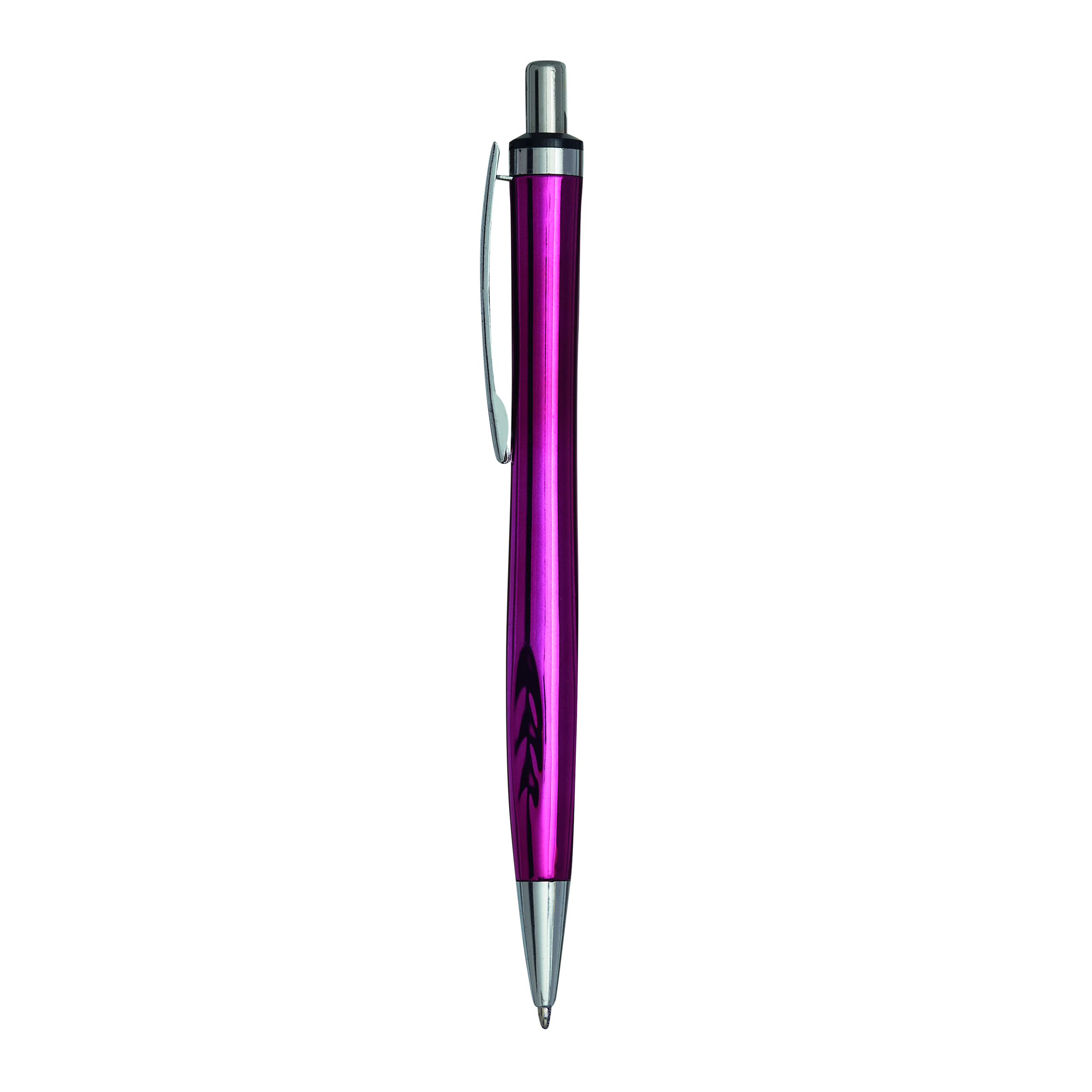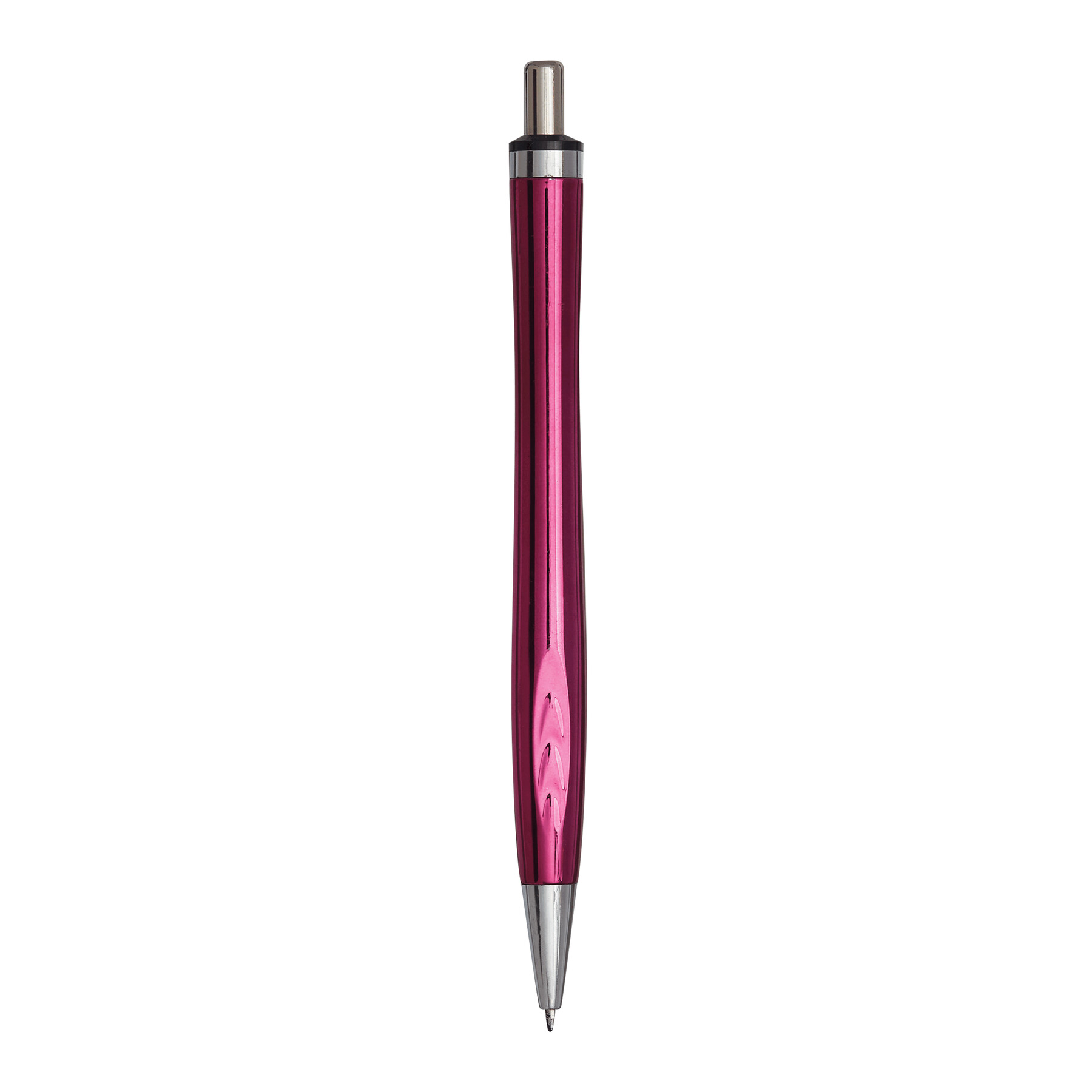 Długopis ASCOT z połyskującym korpusem, metalowym klipem, mechanizmem przyciskowym i niebieskim tuszem.