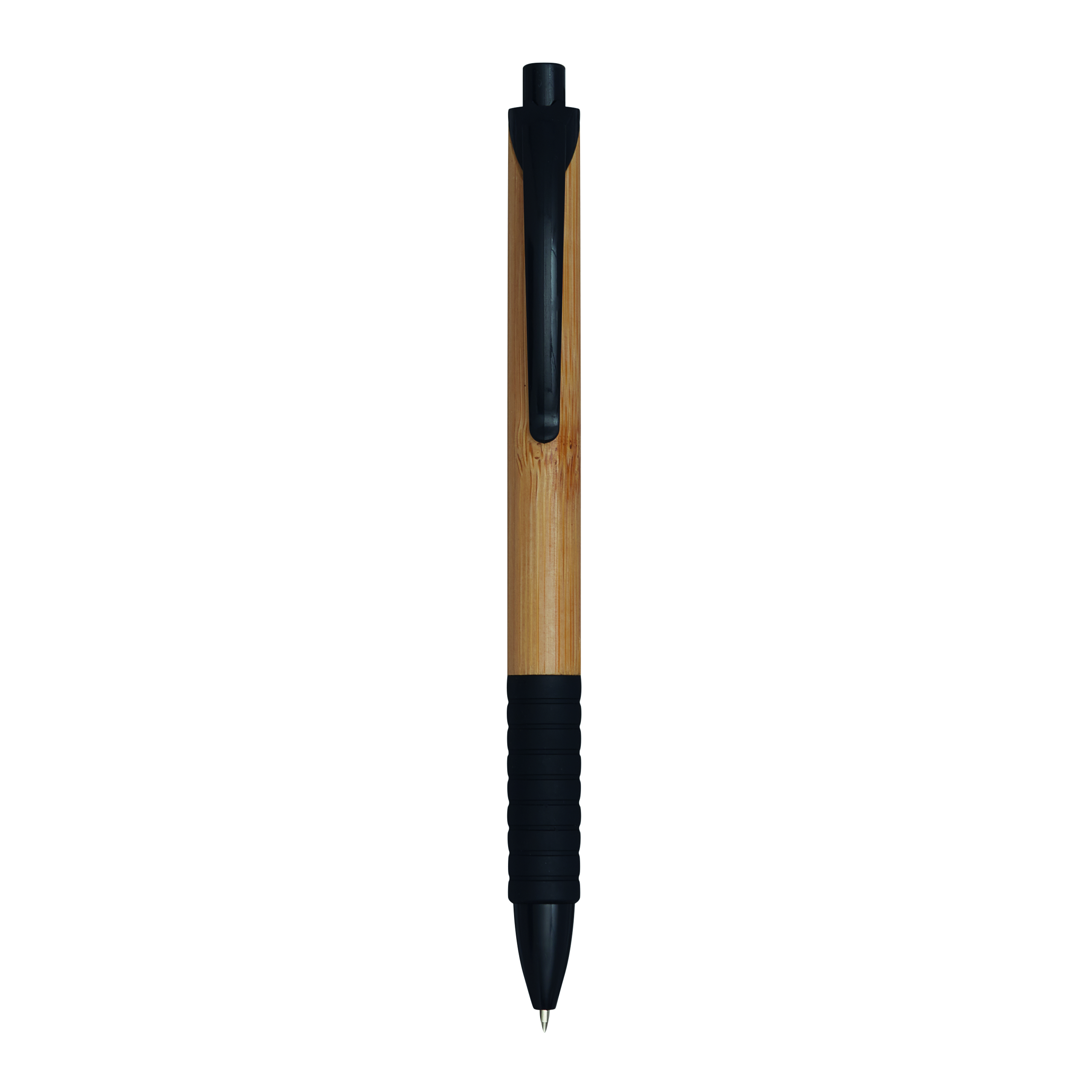 Długopis BAMBOO RUBBER z mechanizmem przyciskowym, elegancki bambusowy korpus, gumowany uchwyt, z niebieskim atramentem.
