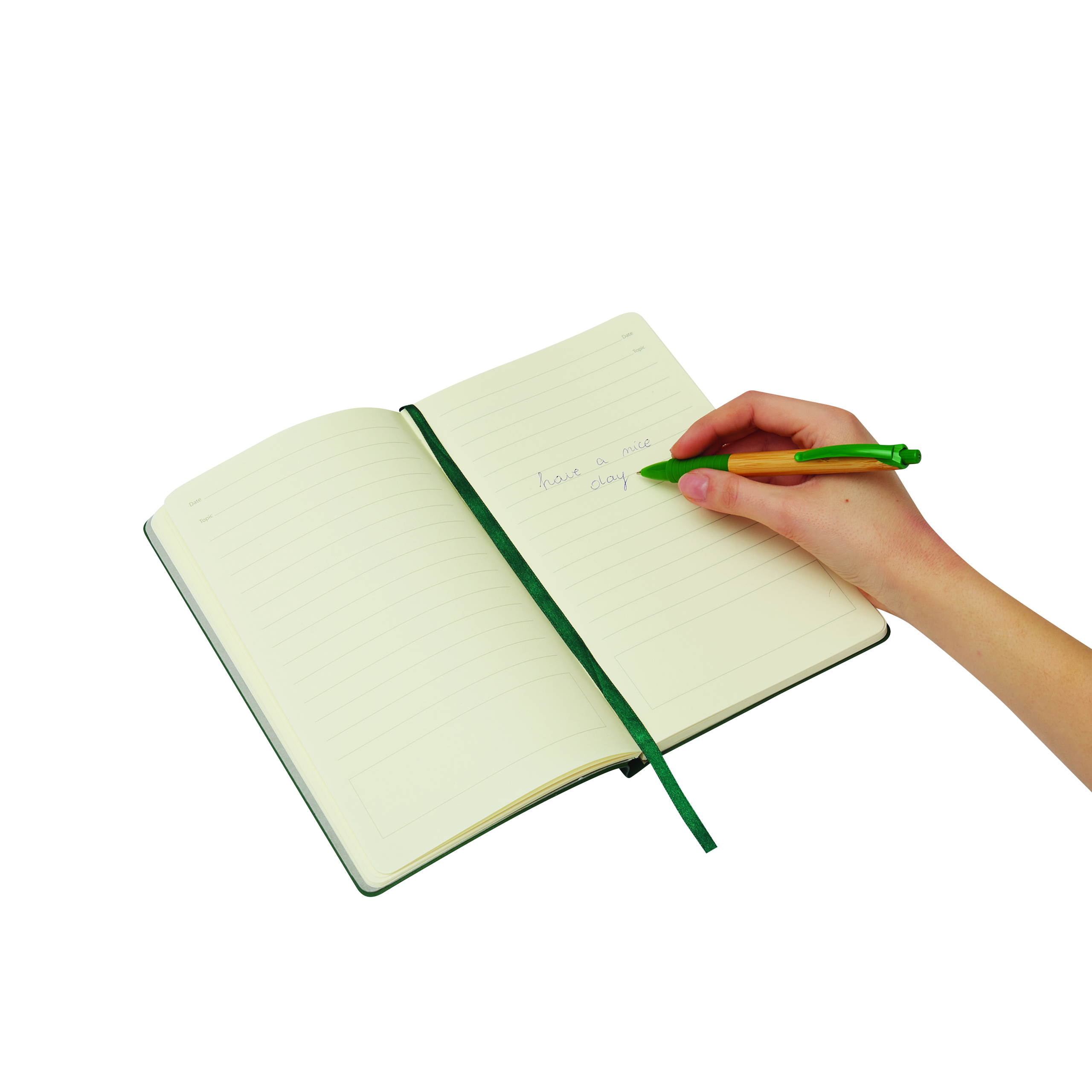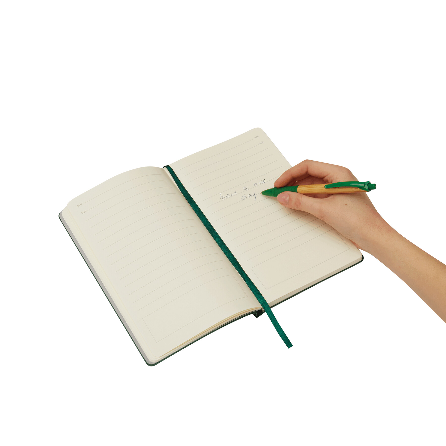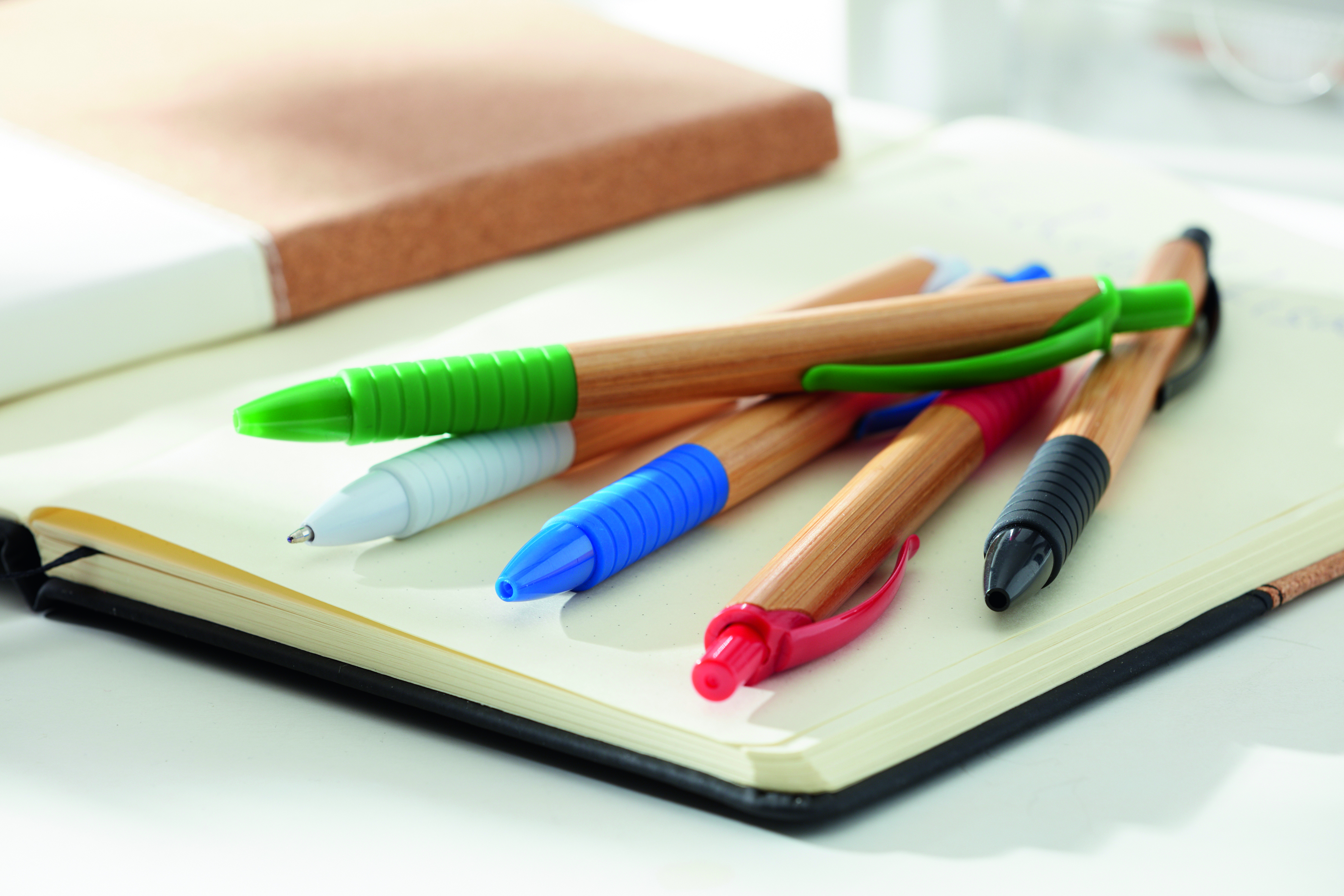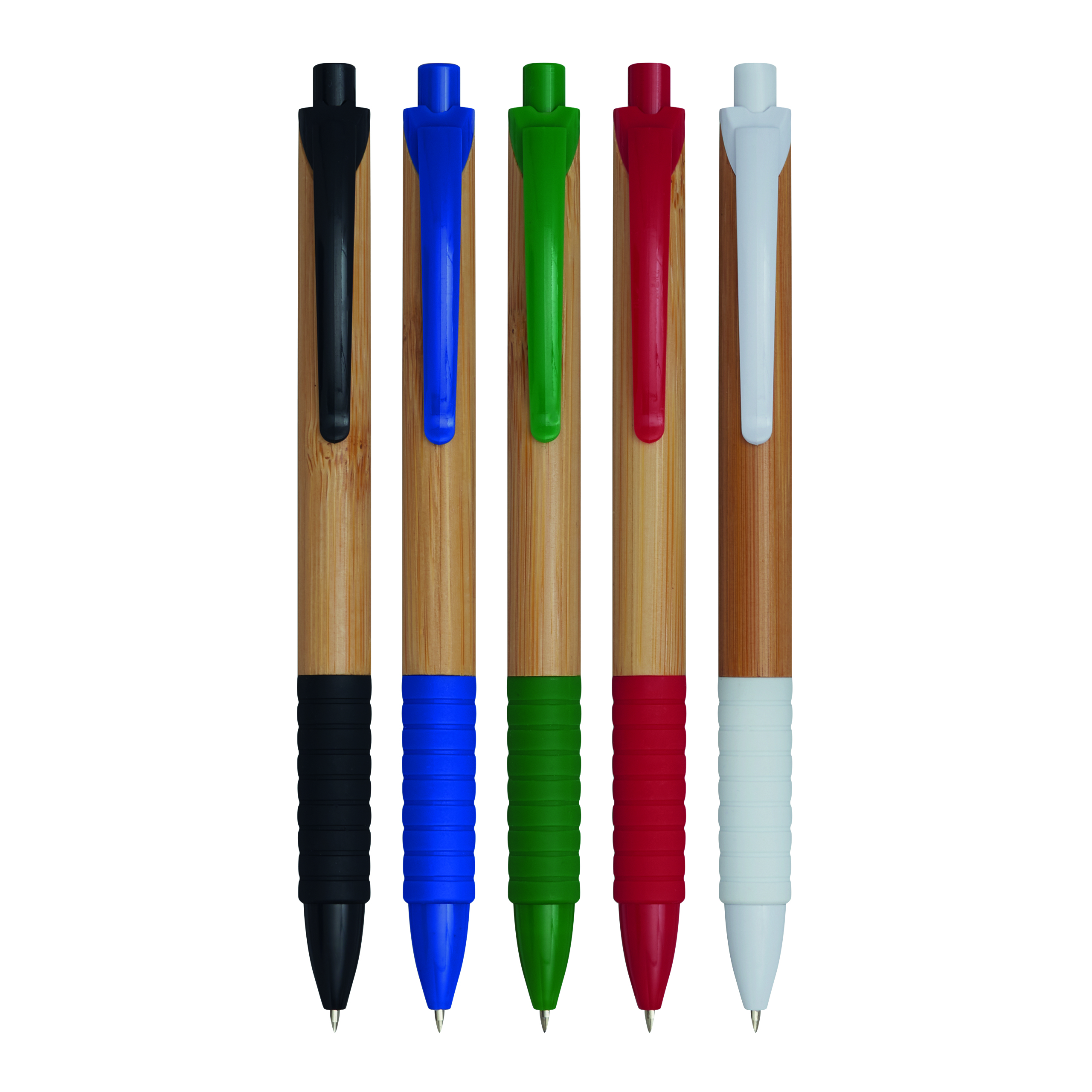 Długopis BAMBOO RUBBER z mechanizmem przyciskowym, elegancki bambusowy korpus, gumowany uchwyt, z niebieskim atramentem.