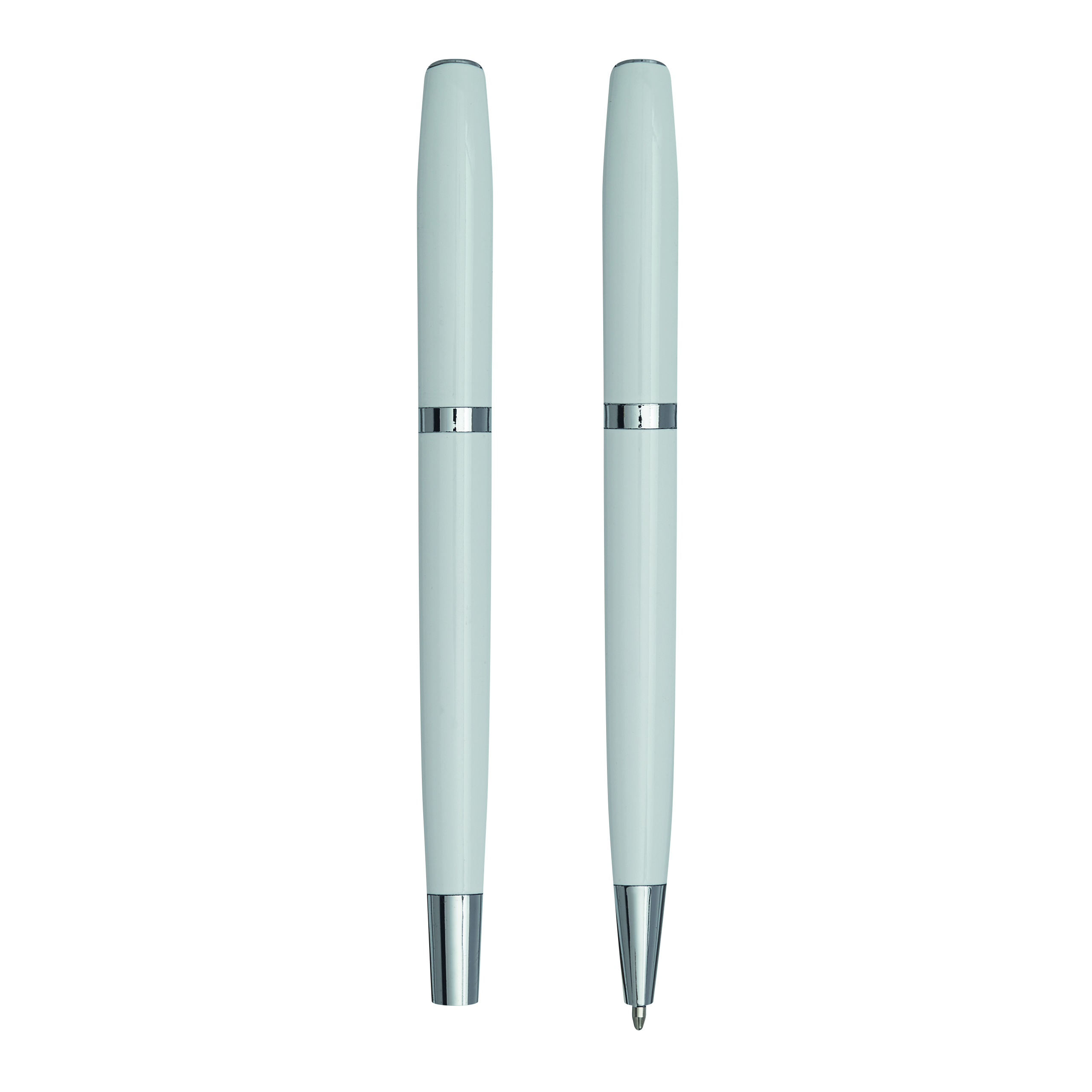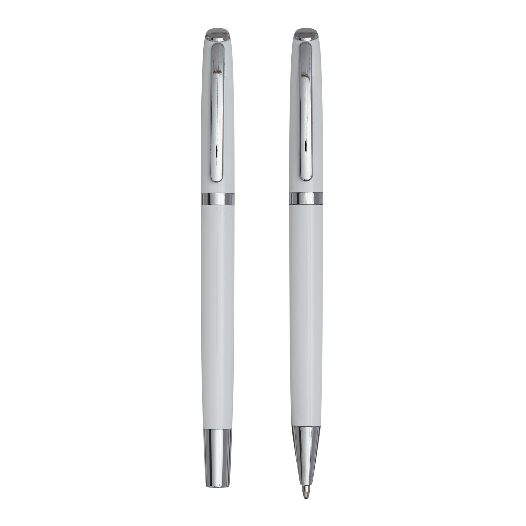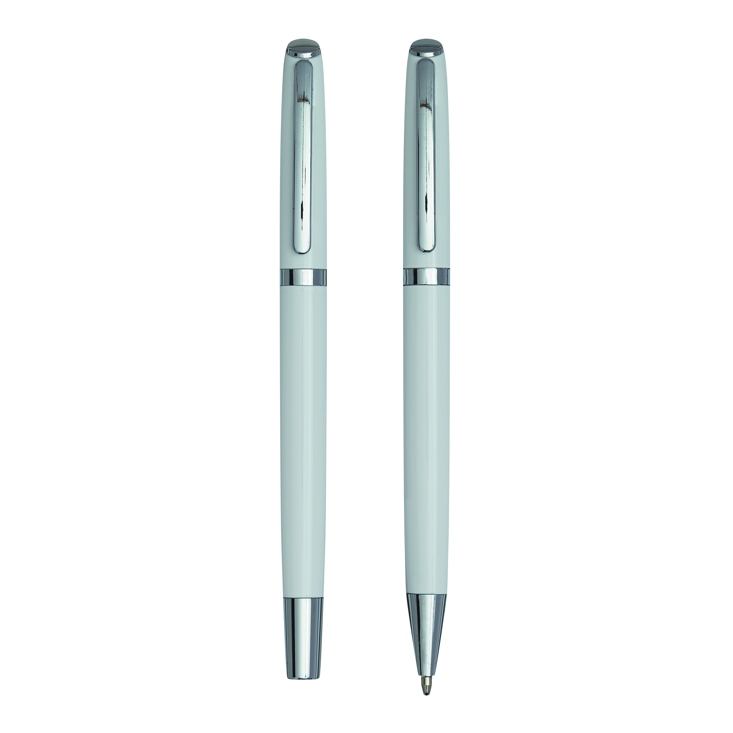 Zestaw do pisania ALPHABET składa się z długopisu z mechanizmem obrotowym i pióra kulkowego, czarny tusz, pakowany w pudełko.