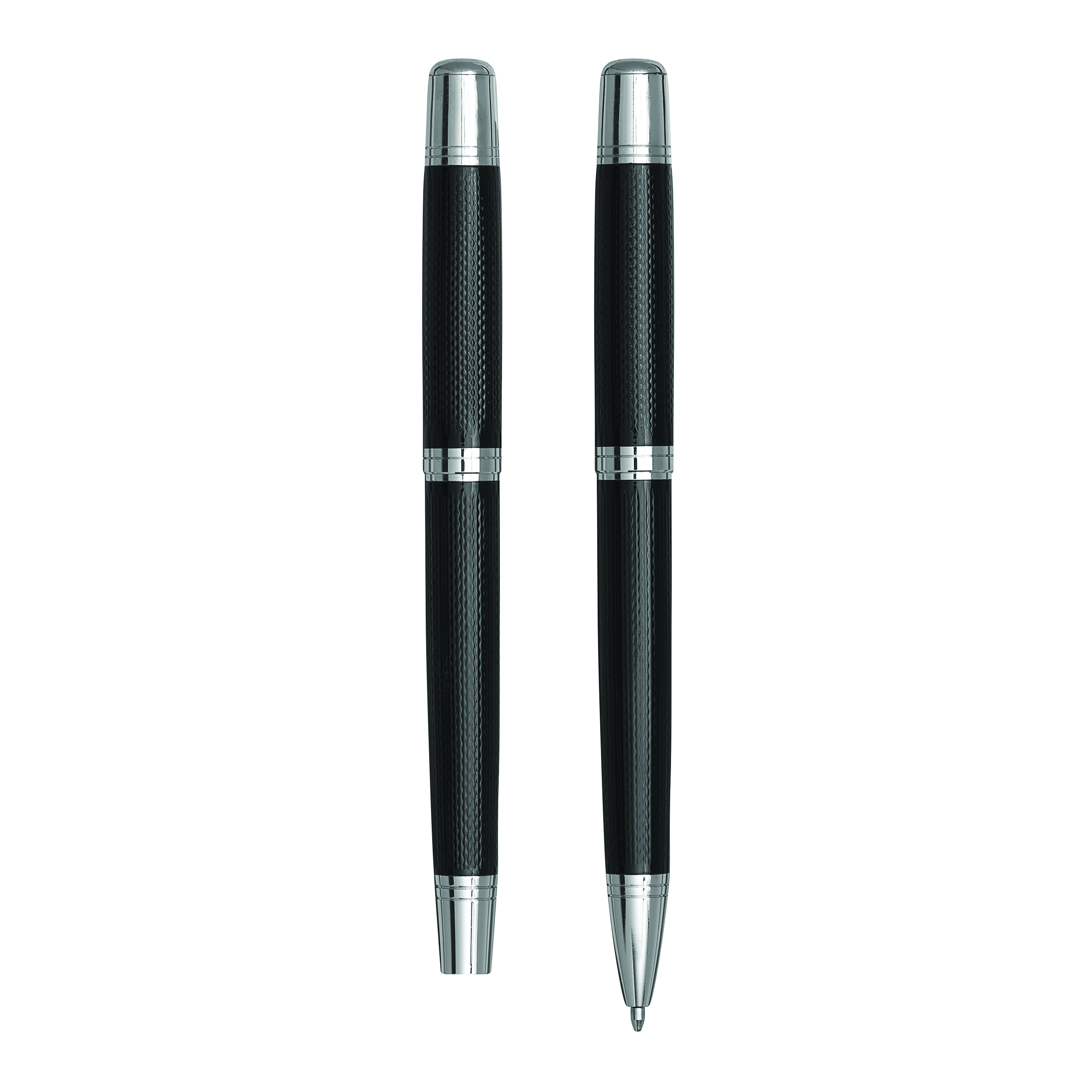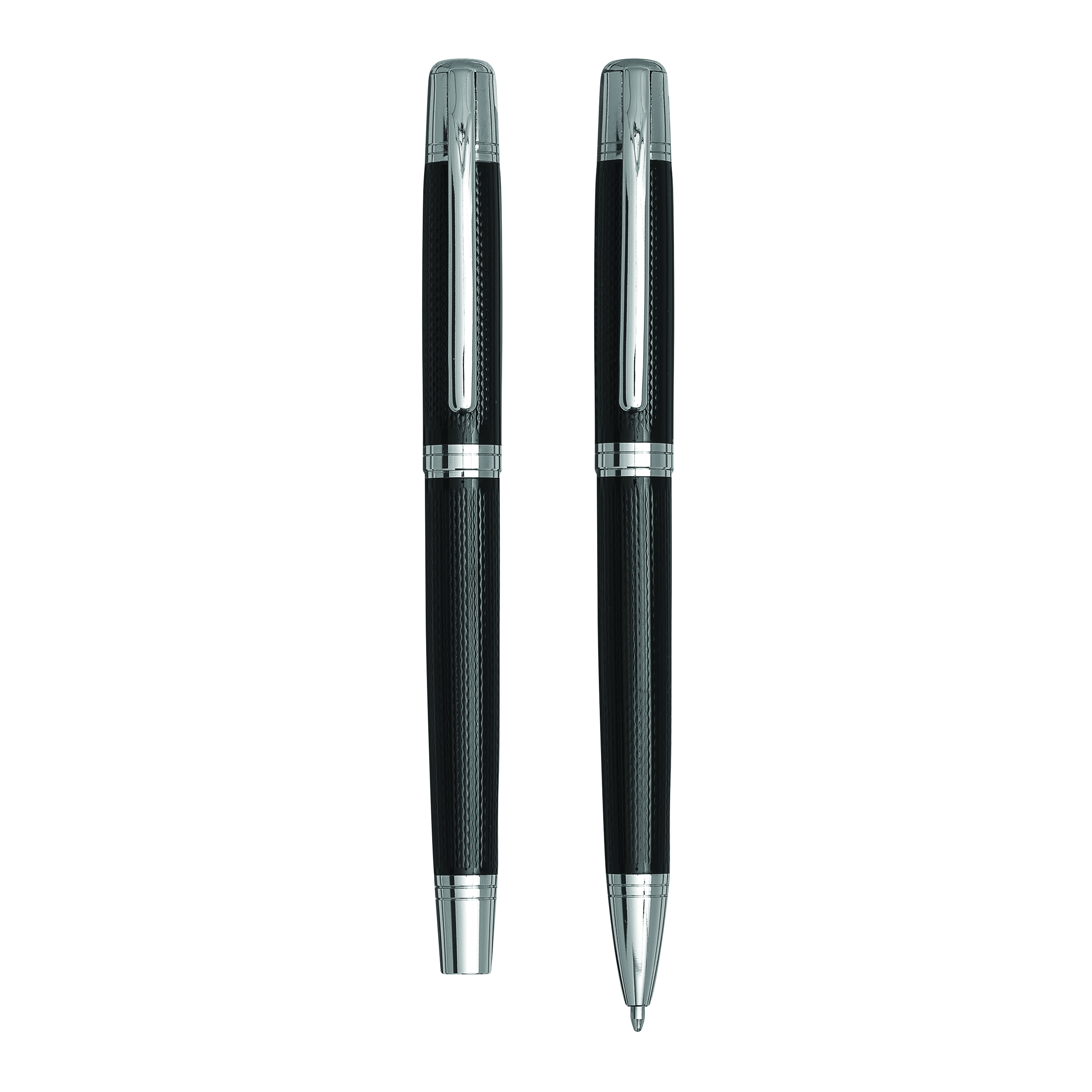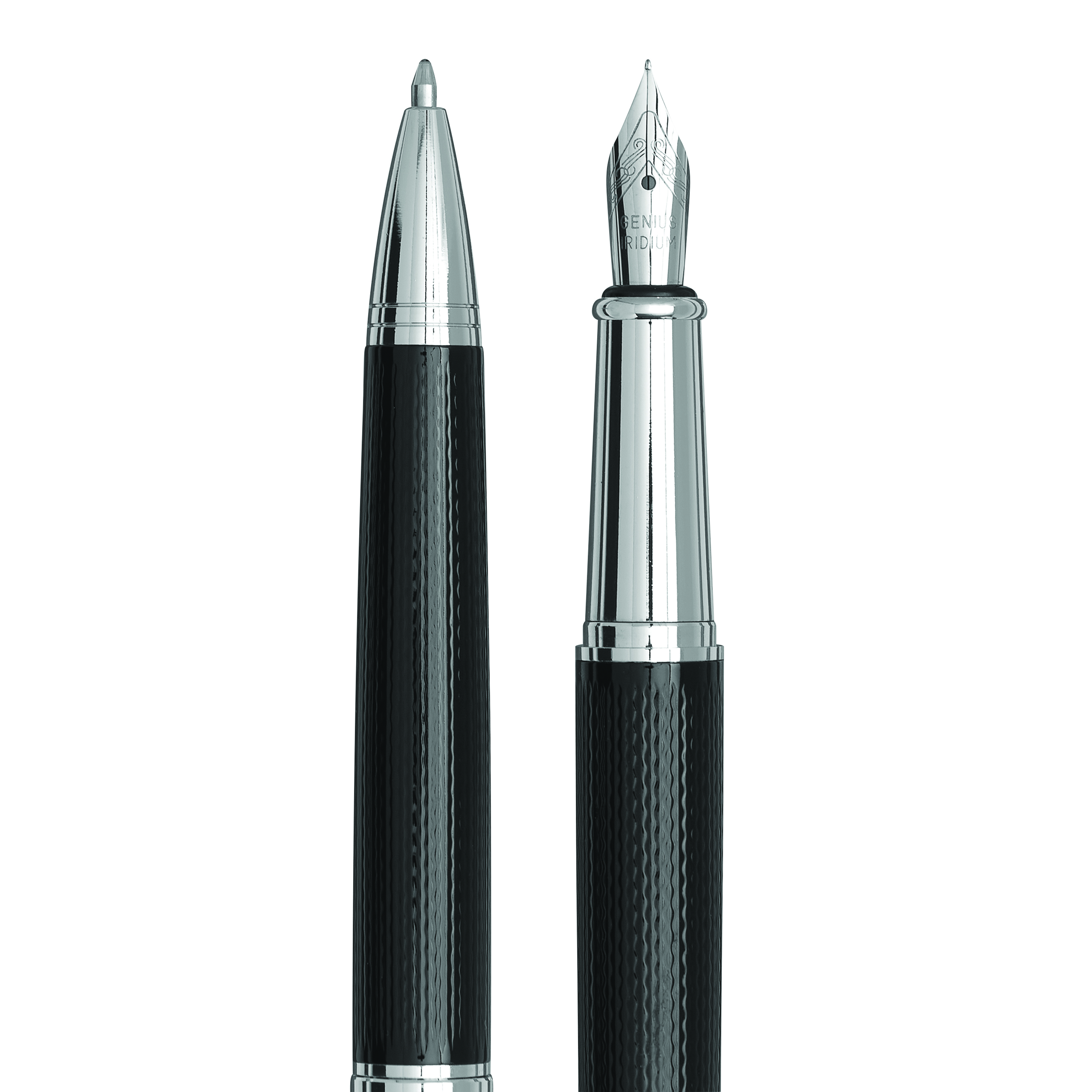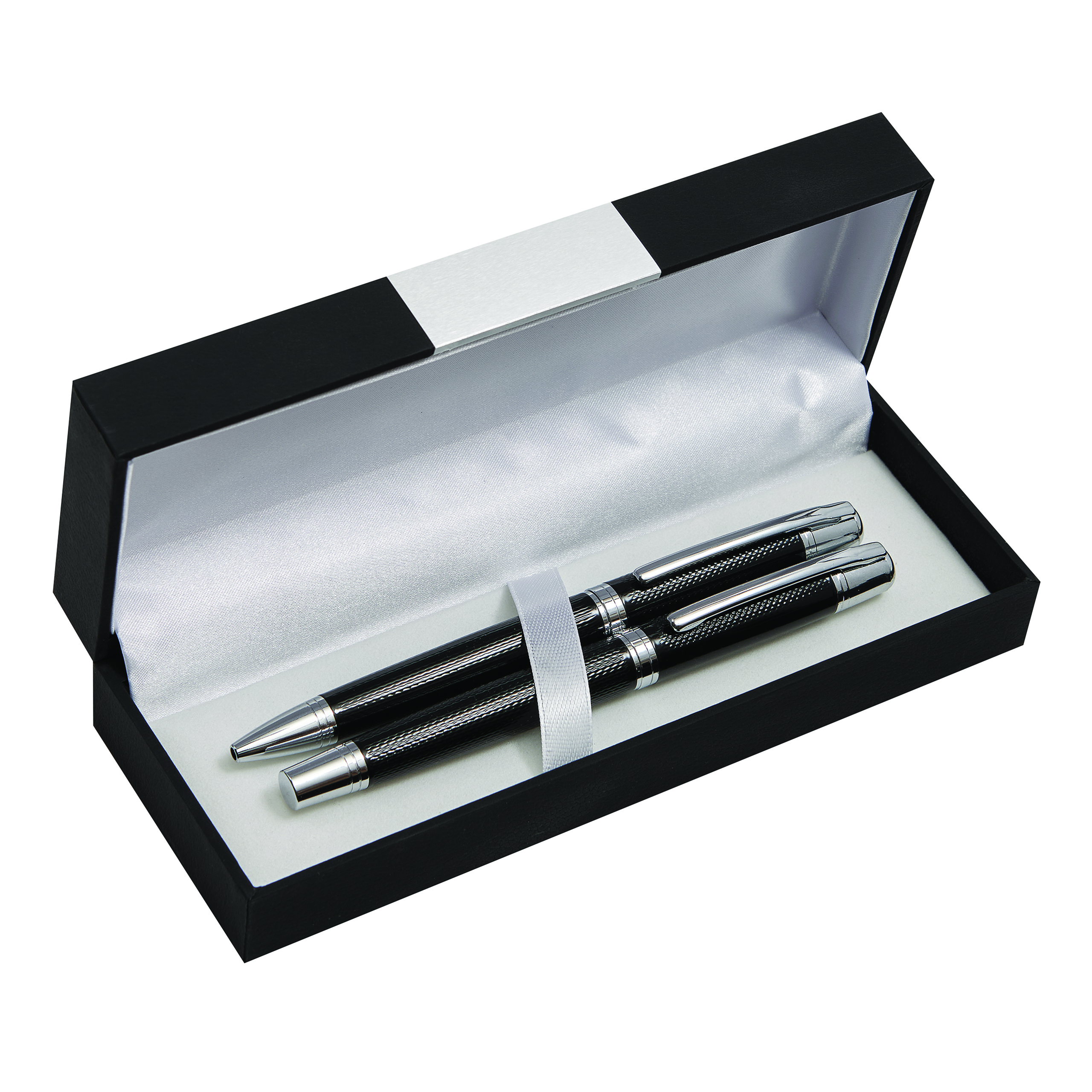 Zestaw MANZONI składający się z długopisu z czarnym wkładem oraz pióra wiecznego w eleganckim pudełku.