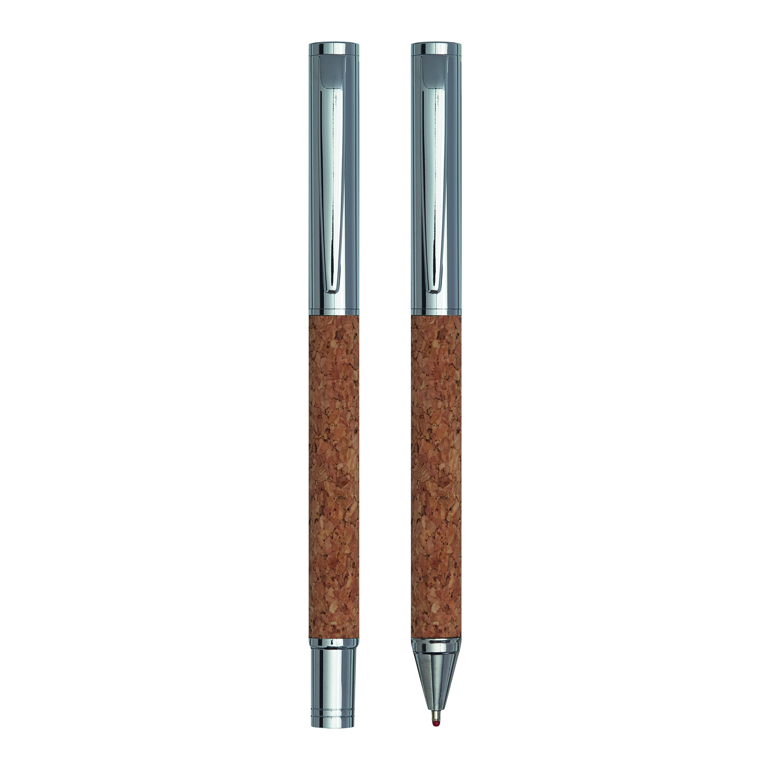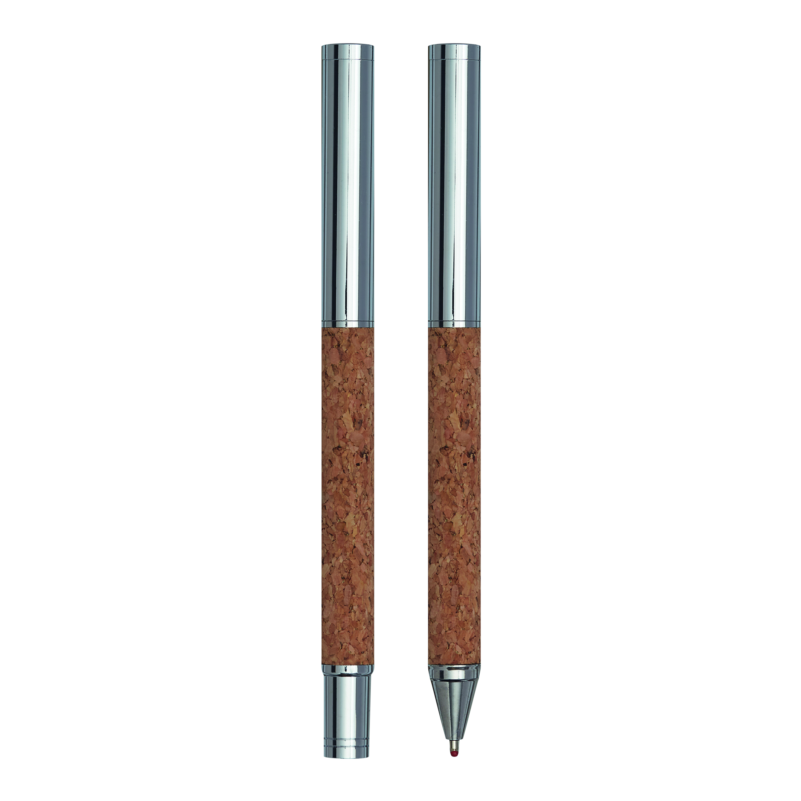 Zestaw piśmienniczy CORK SIGNATURE. Metalowy długopis z mechanizmem obrotowym (niebieski tusz) oraz metalowe pióro kulkowe (czarny tusz, uchwyt z korka) w eleganckim opakowaniu korkowym.