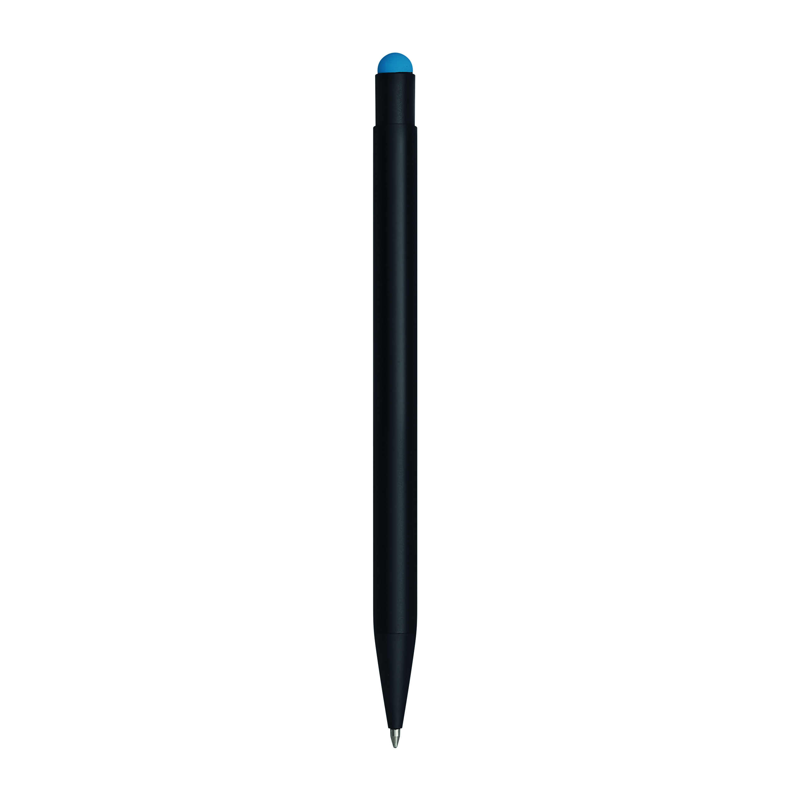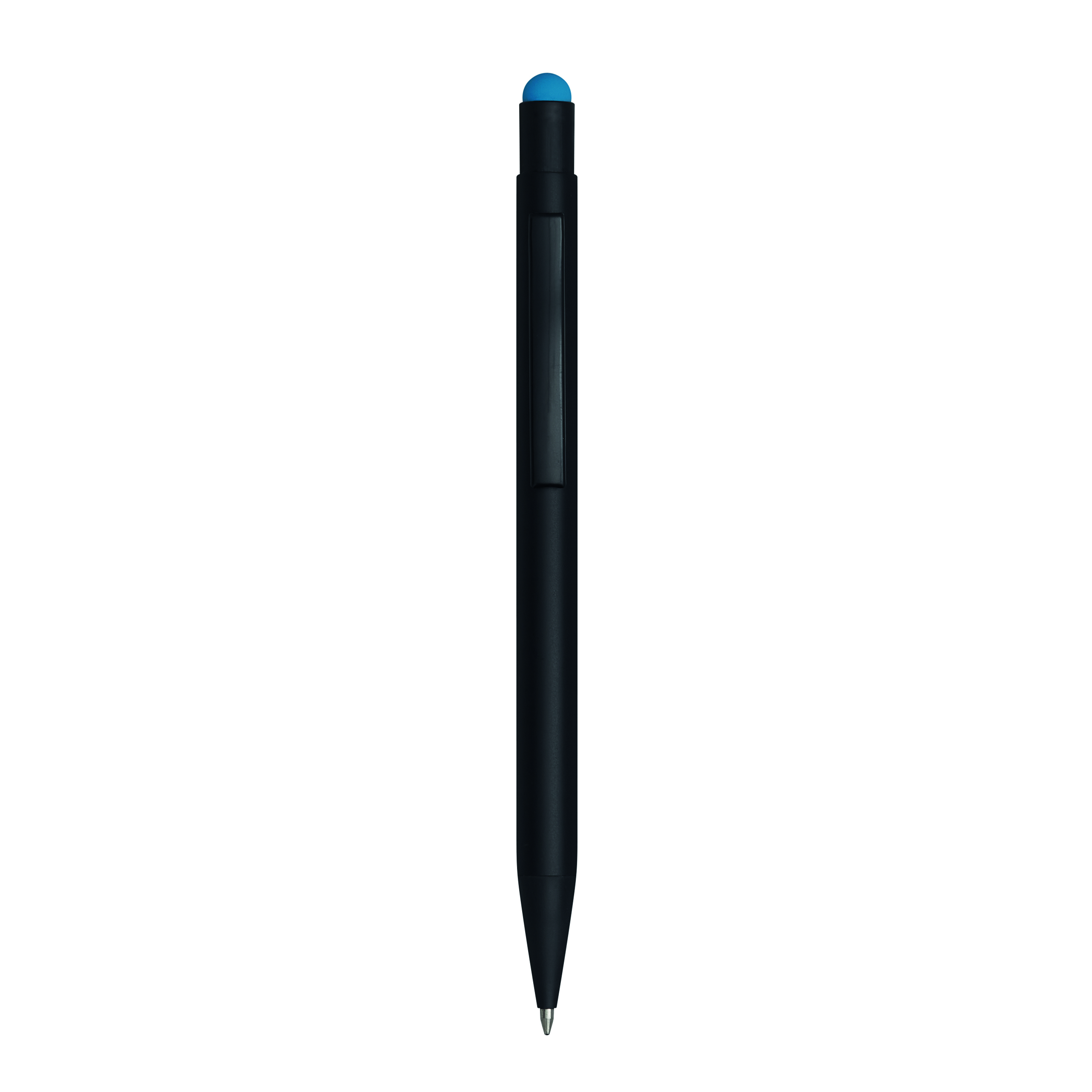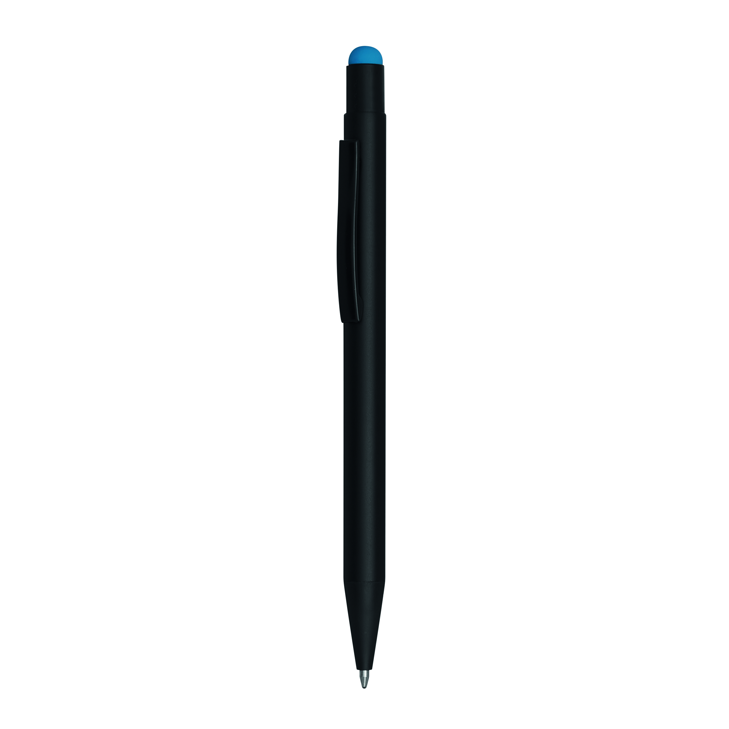 Długopis aluminiowy BLACK BEAUTY z końcówką do ekranów dotykowych, powierzchnia matowa, grawer prezentuje błyszczącą powierzchnię odpowiadającą kolorowi gumowanej końcówki długopisu, niebieski, duży wkład.
