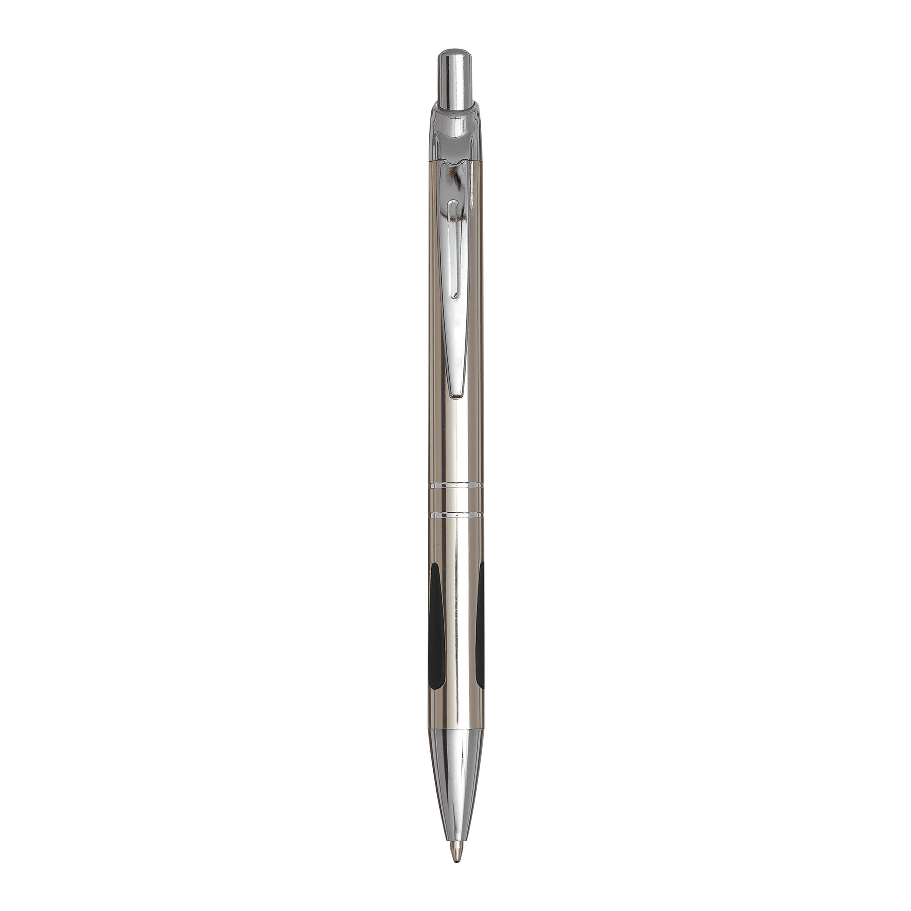 Aluminiowy długopis LUCERNE z lśniącą obsadką i częściowo pokrytym gumą uchwytem, mechanizm przyciskowy i duży wkład z czarnym tuszem.