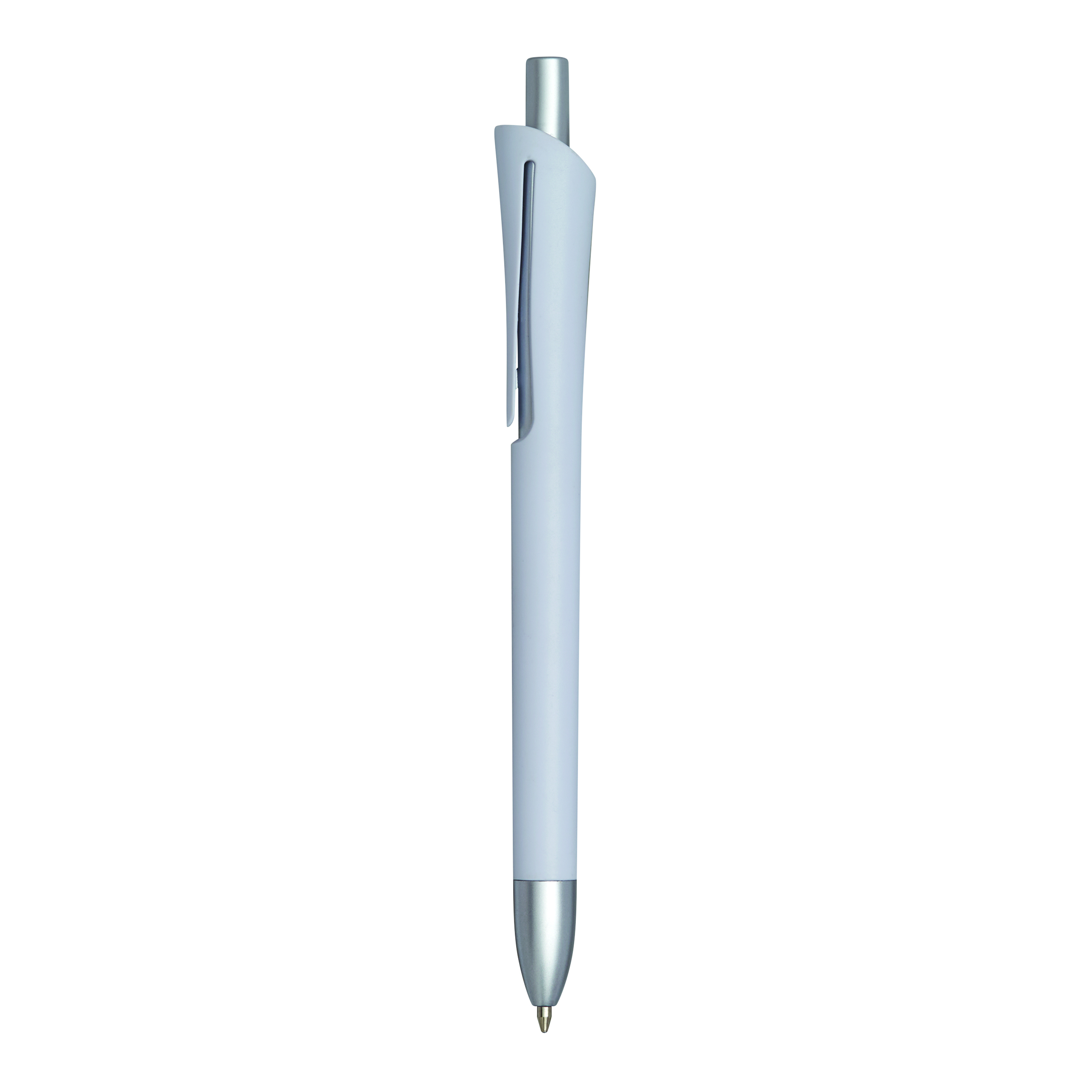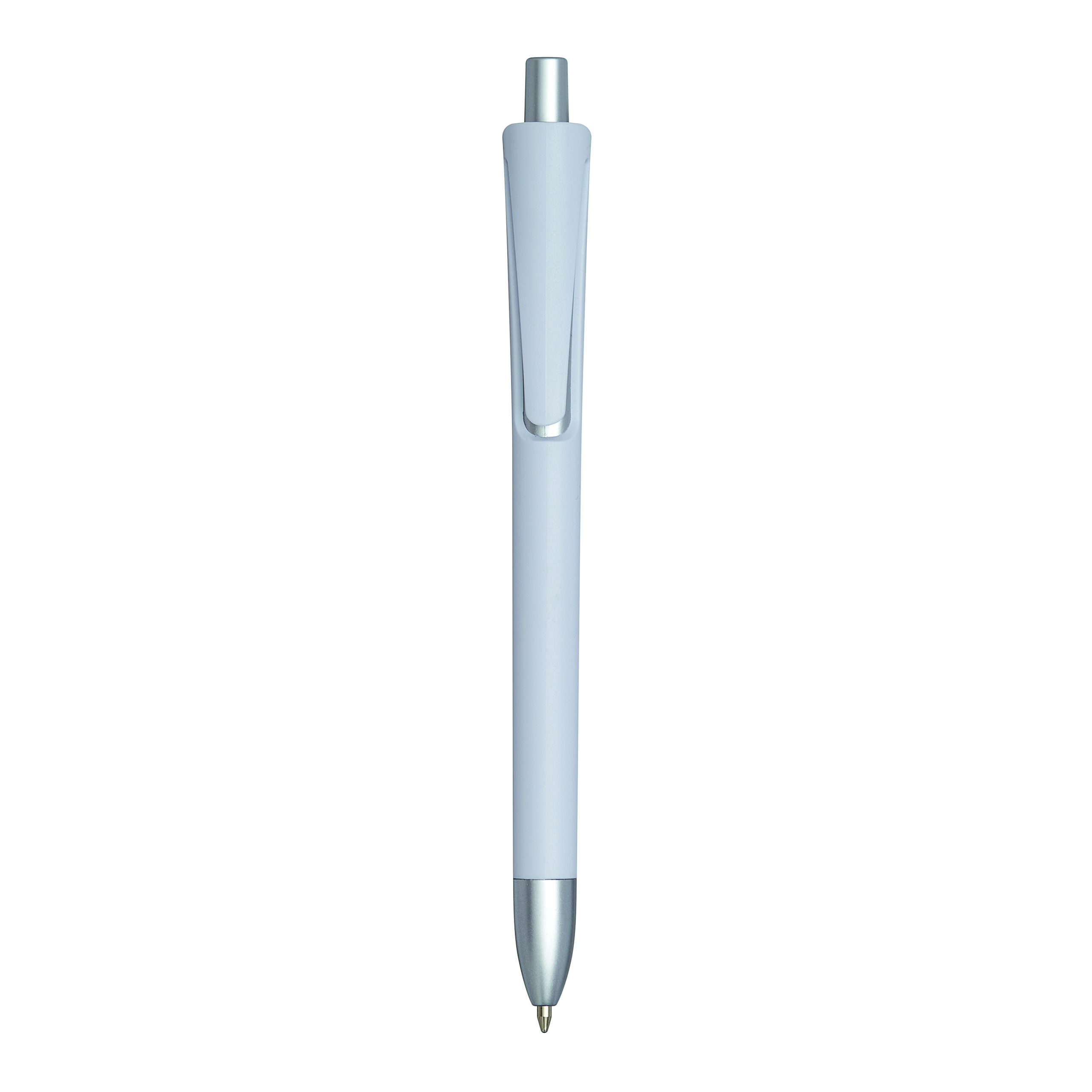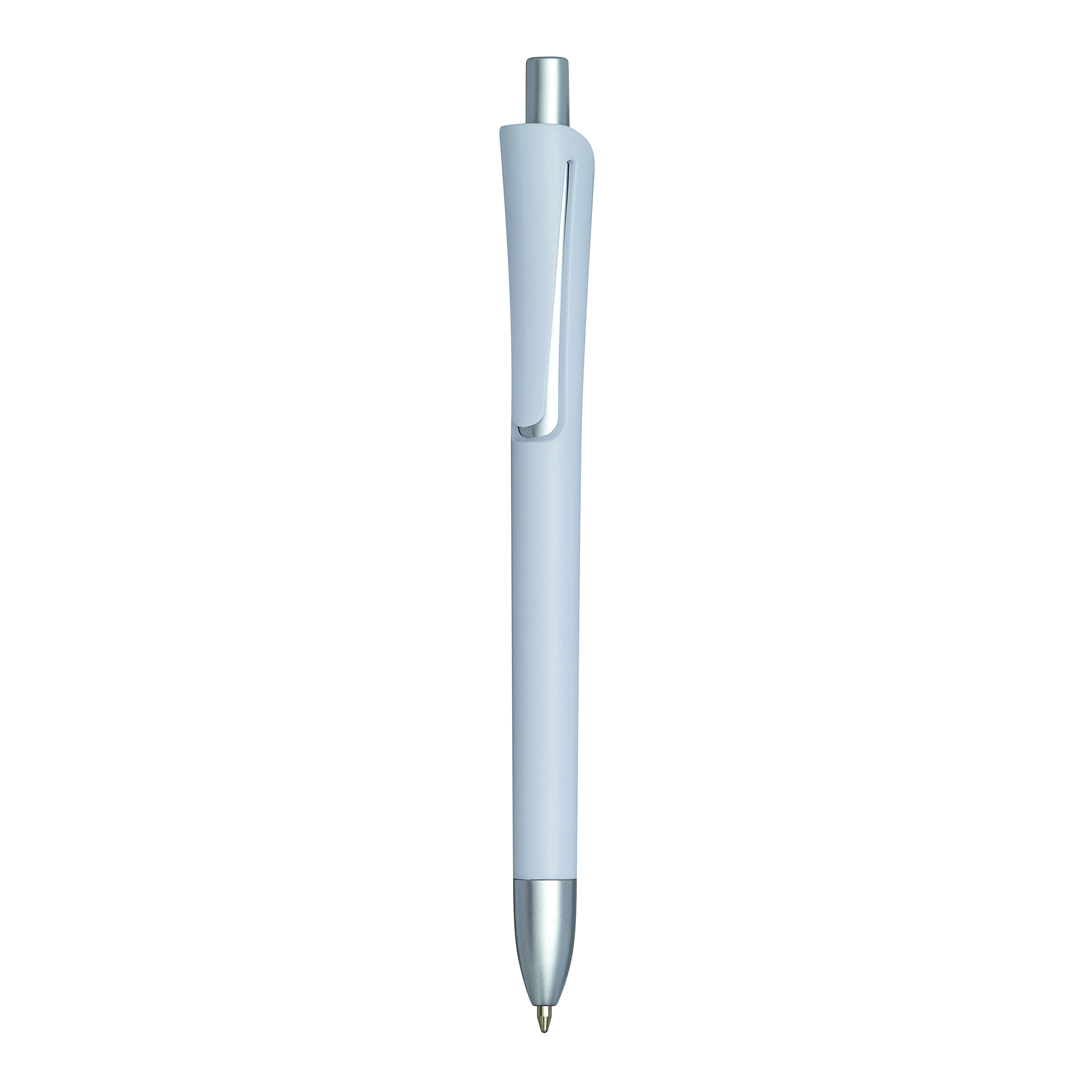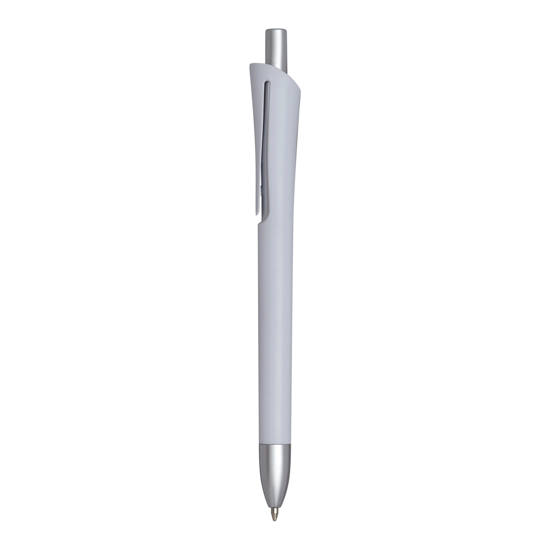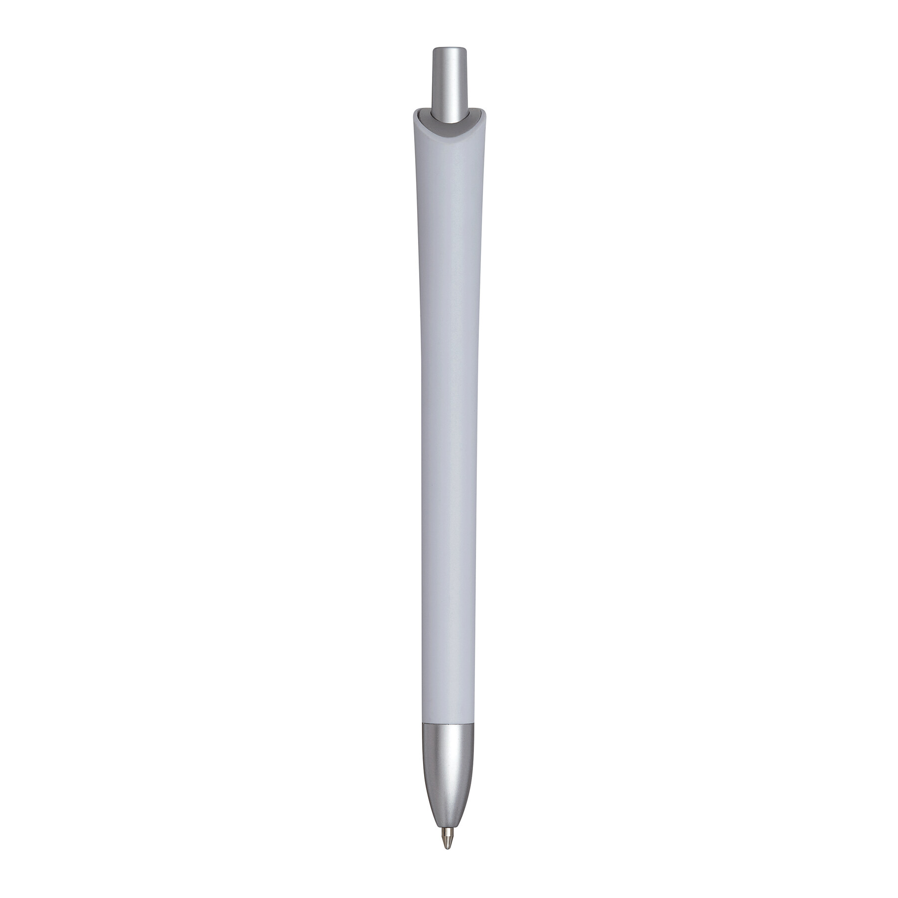Długopis OREGON z mechanizmem przyciskowym, trzonkiem z tworzywa sztucznego, matowo-srebrnym akcentem pod klipem, na przycisku i obsadce, długość pisania około 800 - 1000 m, czarny tusz.