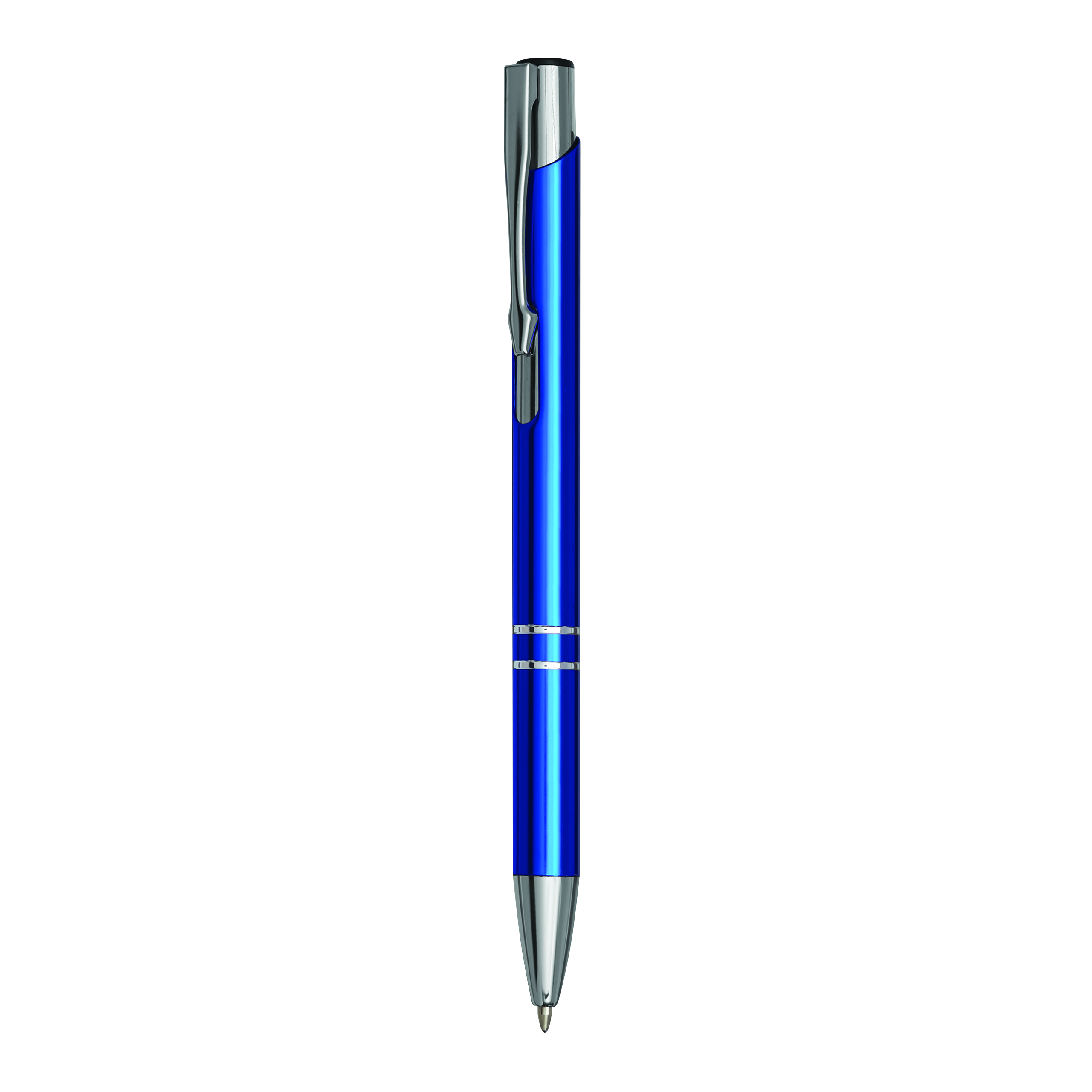 Aluminiowy długopis TUCSON z błyszczącym, metalowym korpusem, mechanizmem dociskowym i dużym, niebieskim wkładem.