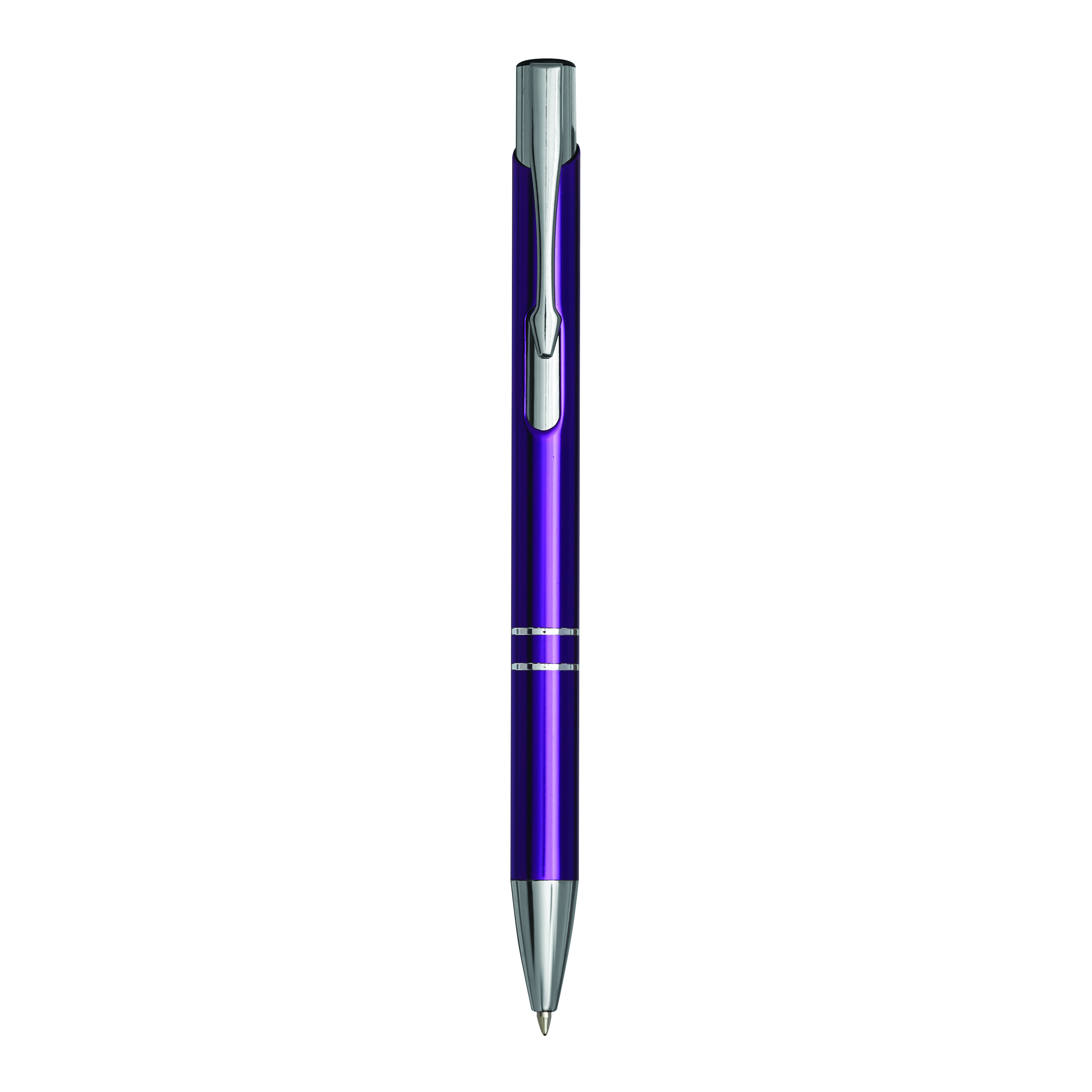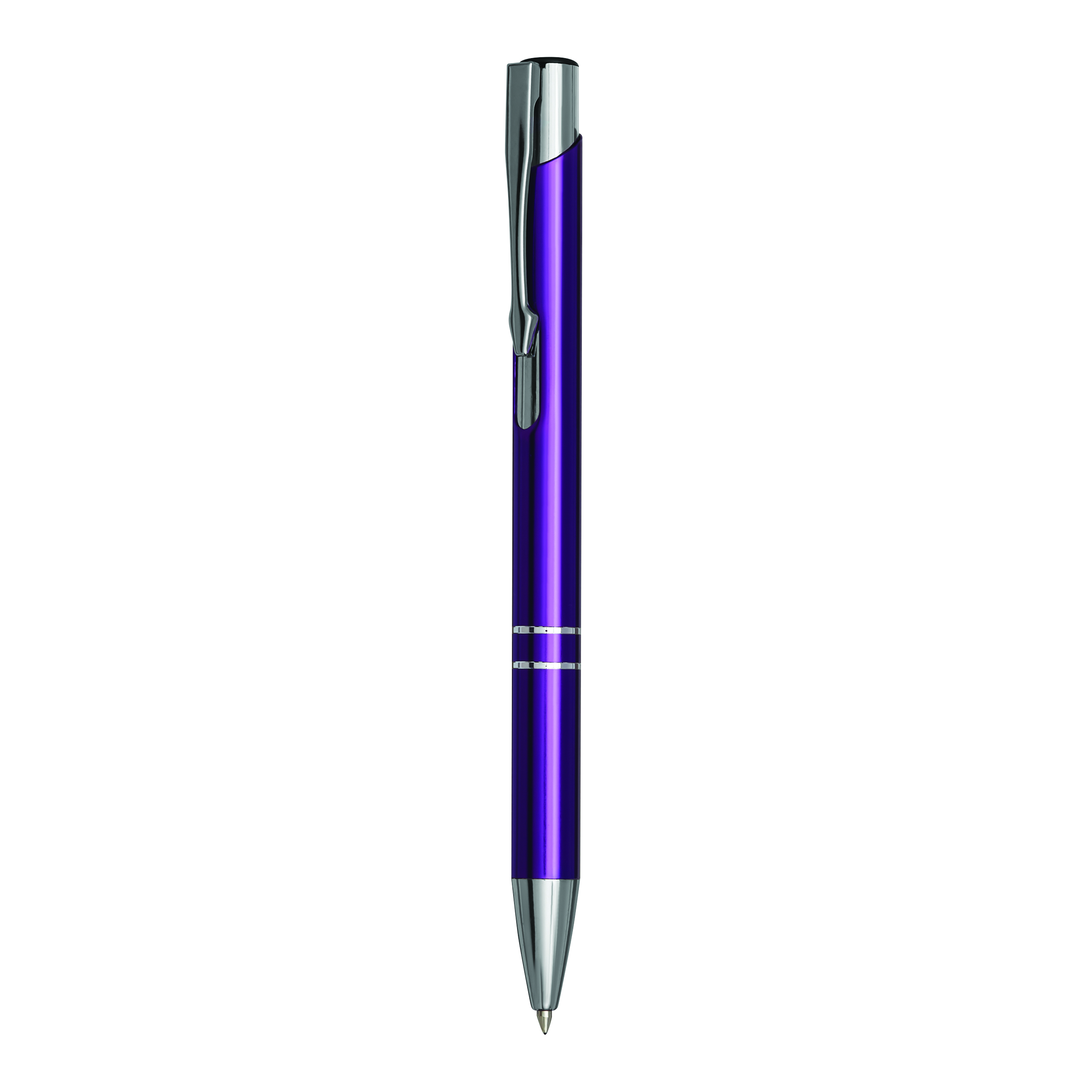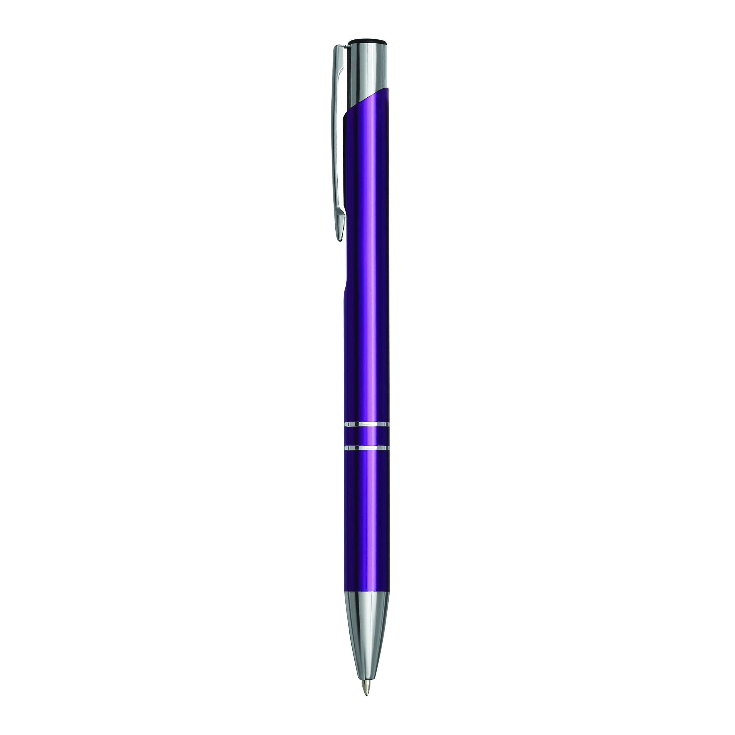 Aluminiowy długopis TUCSON z błyszczącym, metalowym korpusem, mechanizmem dociskowym i dużym, niebieskim wkładem.