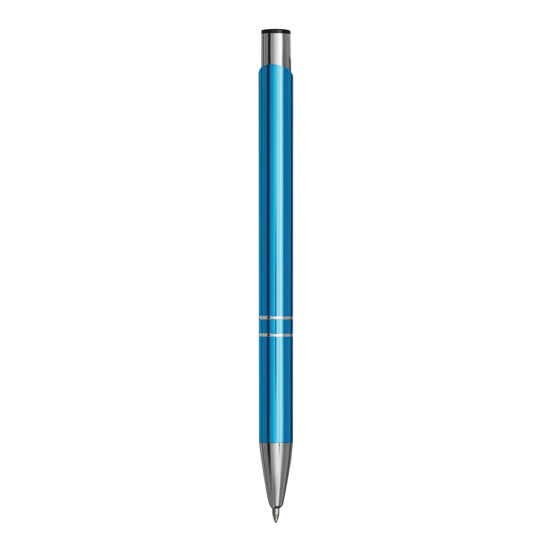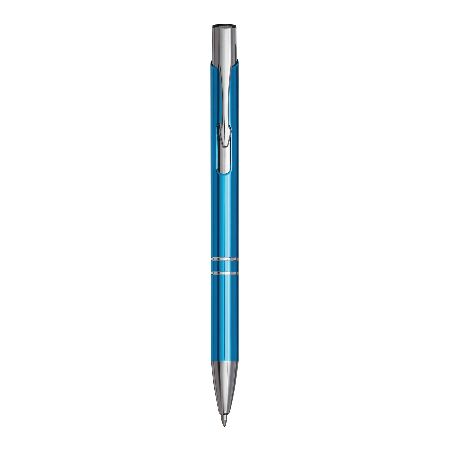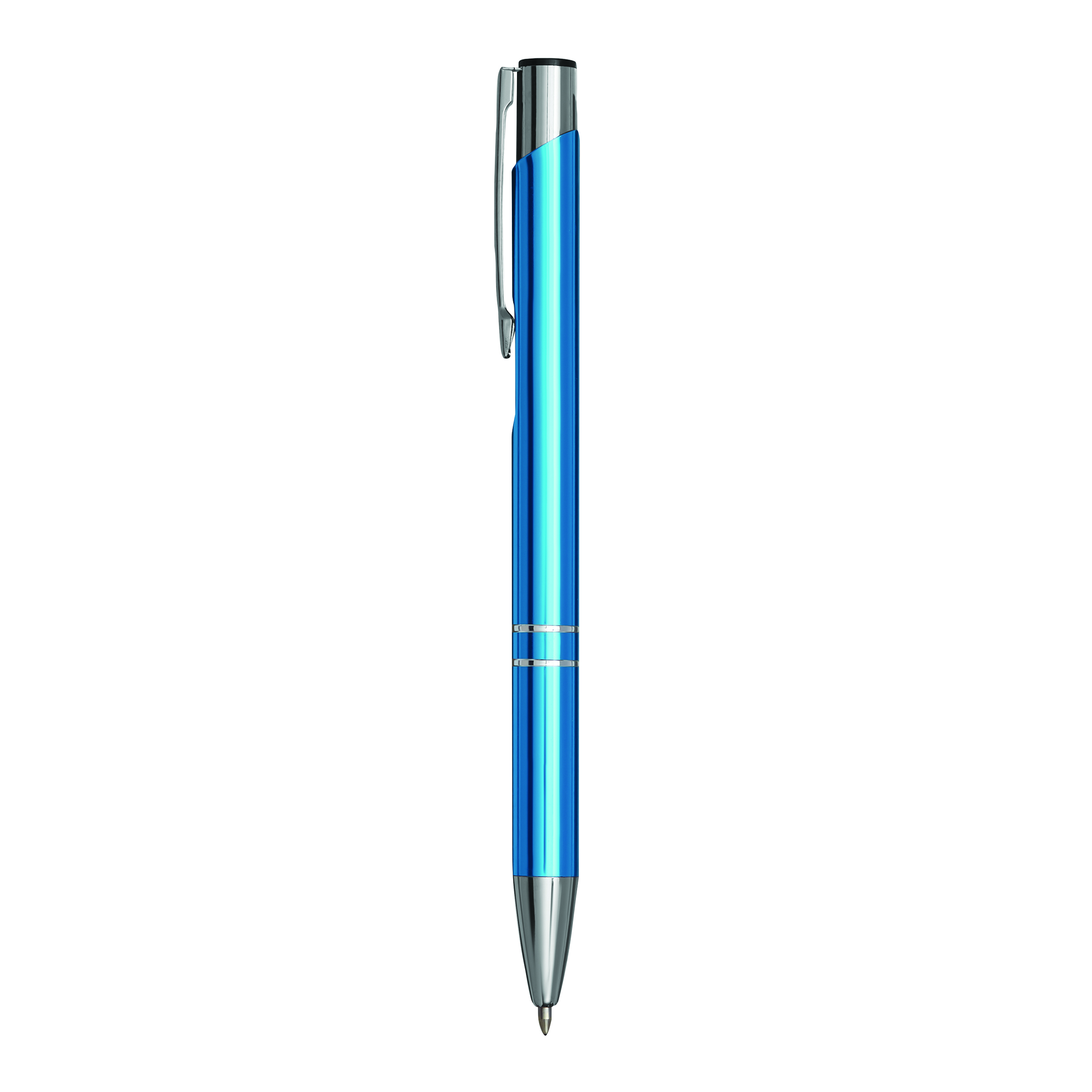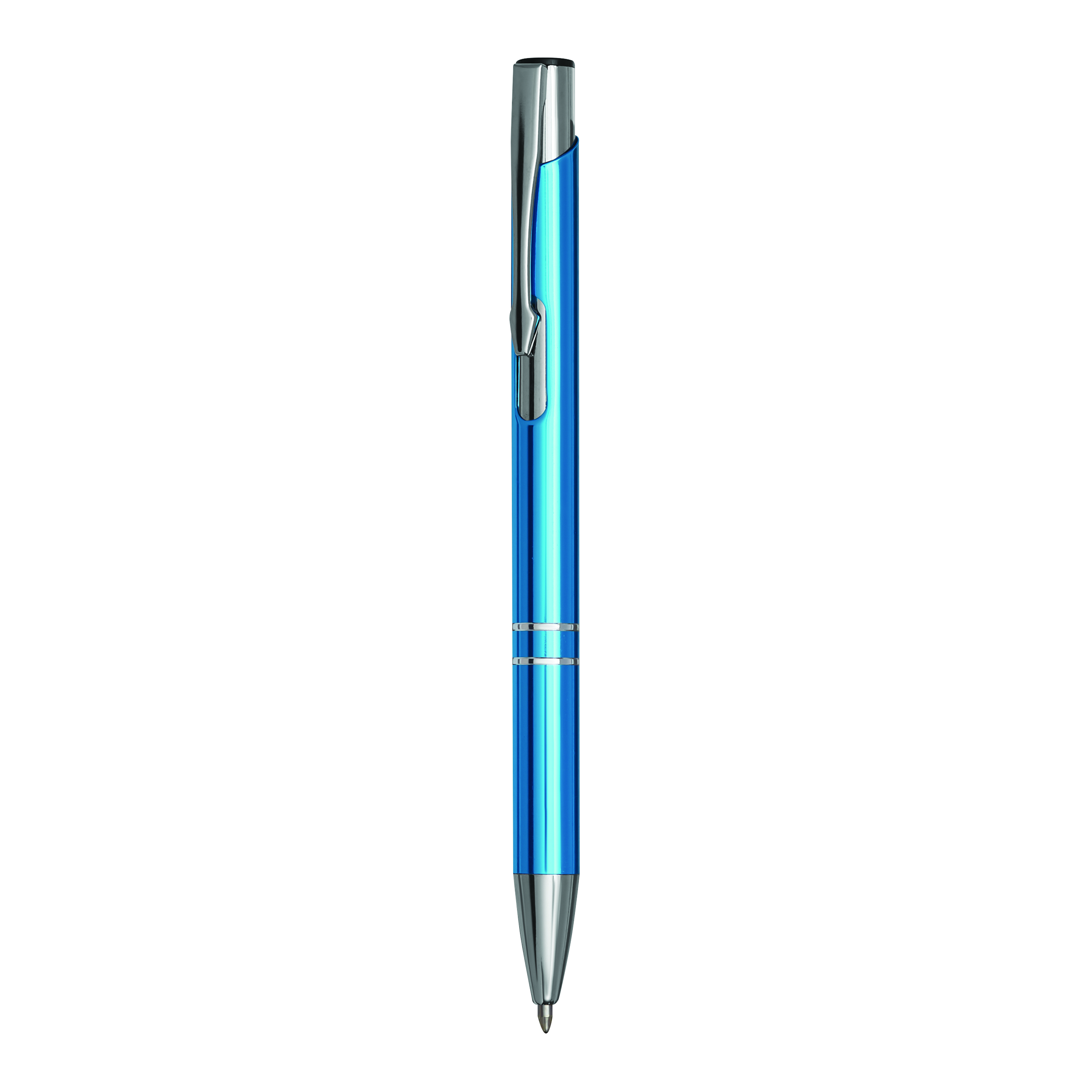 Aluminiowy długopis TUCSON z błyszczącym, metalowym korpusem, mechanizmem dociskowym i dużym, niebieskim wkładem.