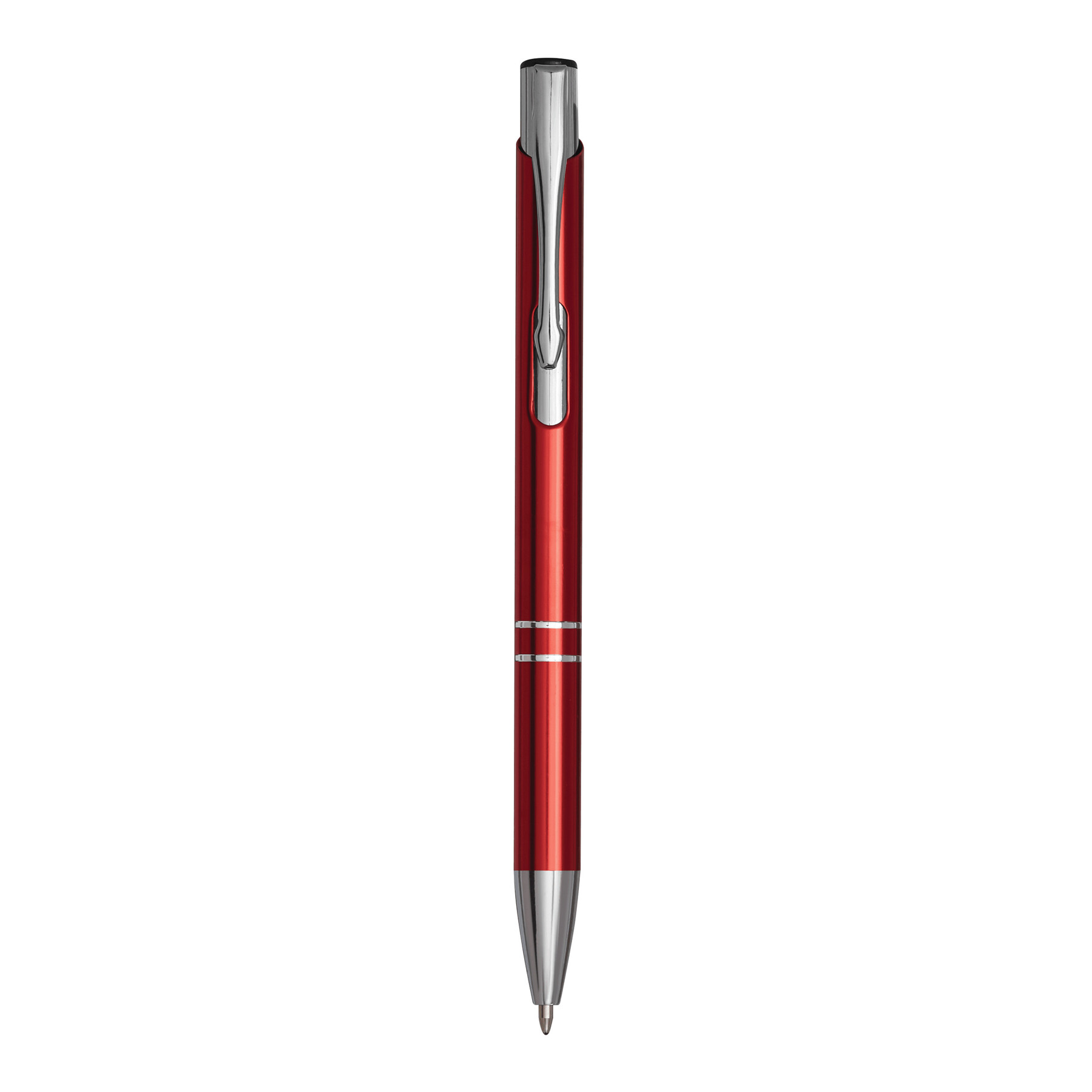 Aluminiowy długopis TUCSON z błyszczącym, metalowym korpusem, mechanizmem dociskowym i dużym, niebieskim wkładem.