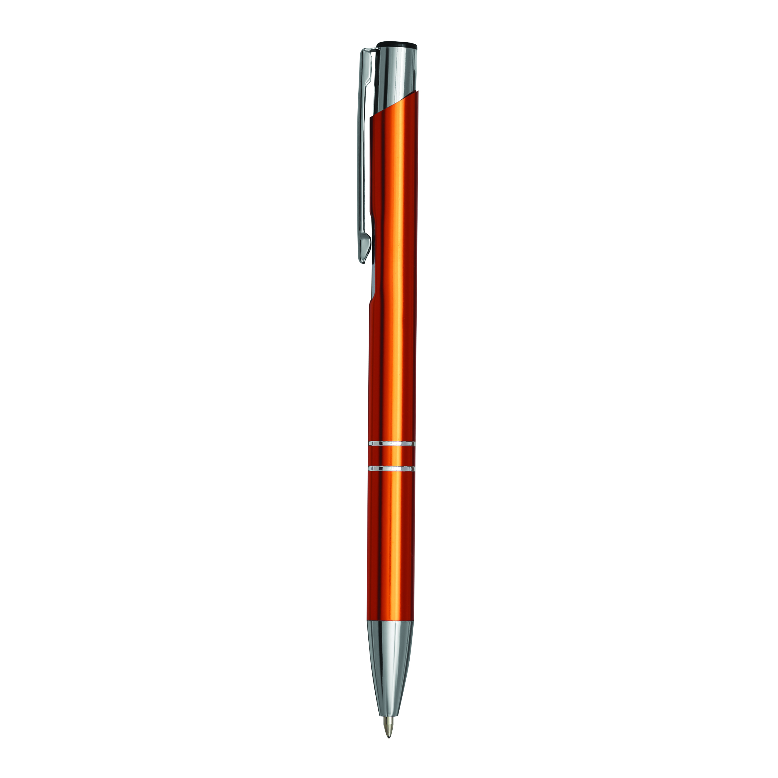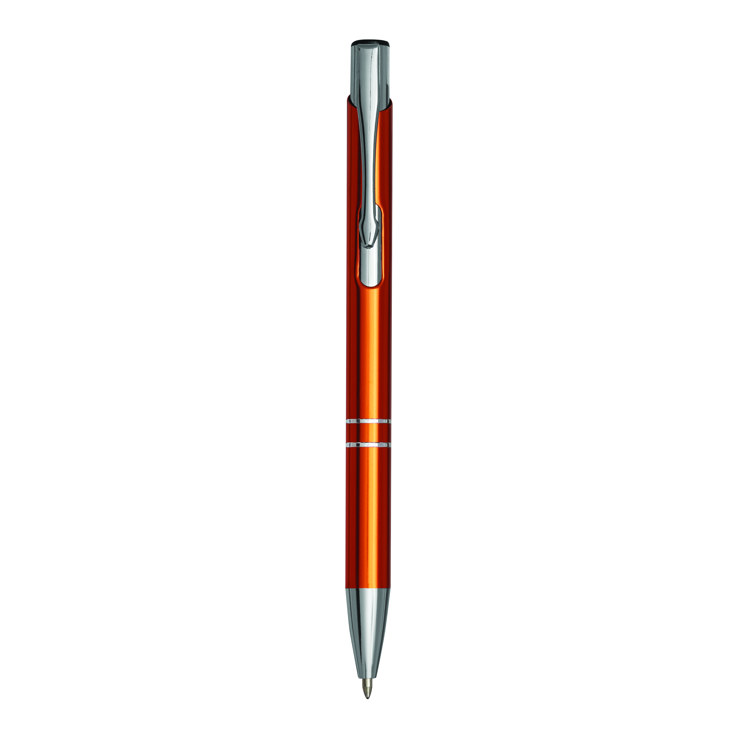 Aluminiowy długopis TUCSON z błyszczącym, metalowym korpusem, mechanizmem dociskowym i dużym, niebieskim wkładem.