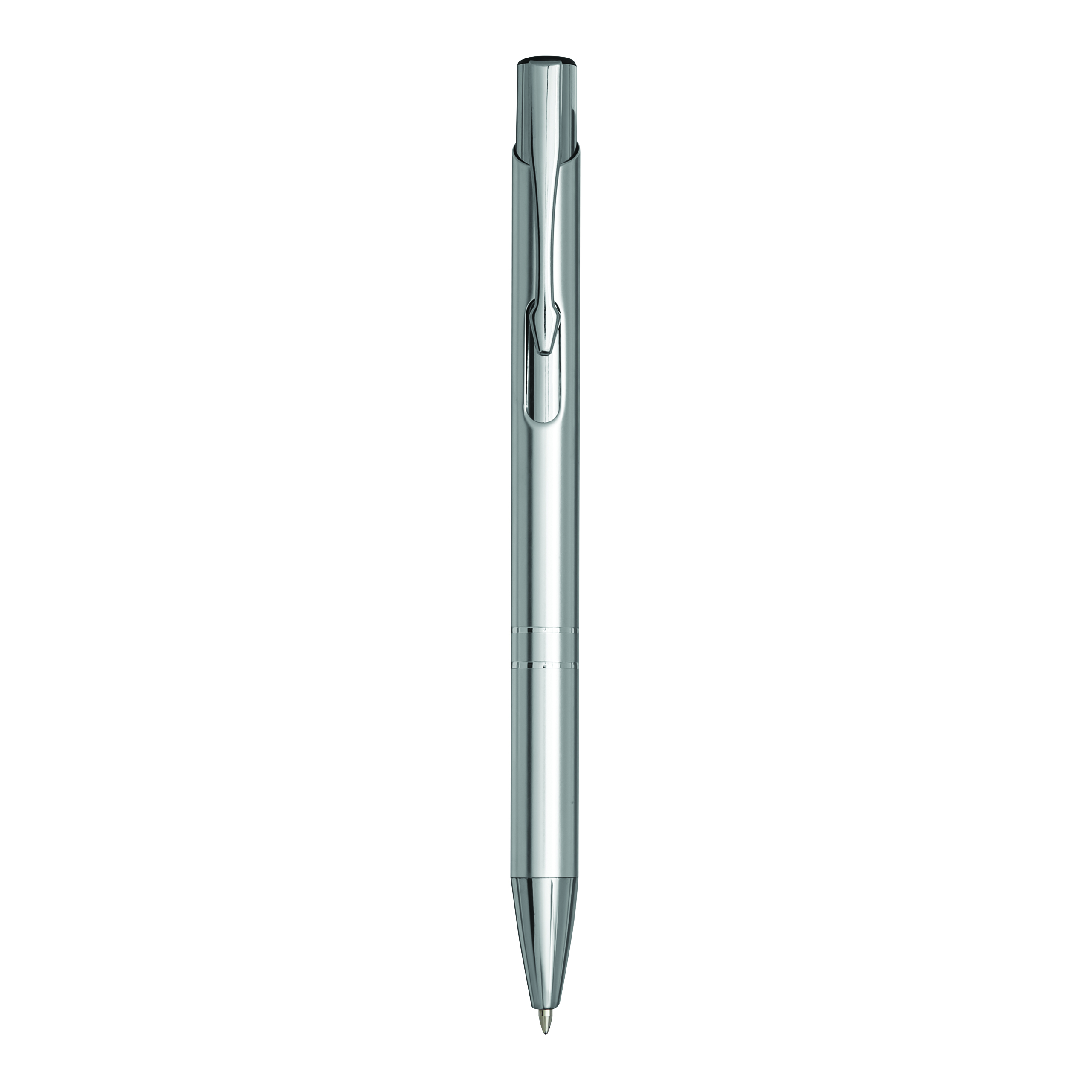 Aluminiowy długopis TUCSON z błyszczącym, metalowym korpusem, mechanizmem dociskowym i dużym, niebieskim wkładem.