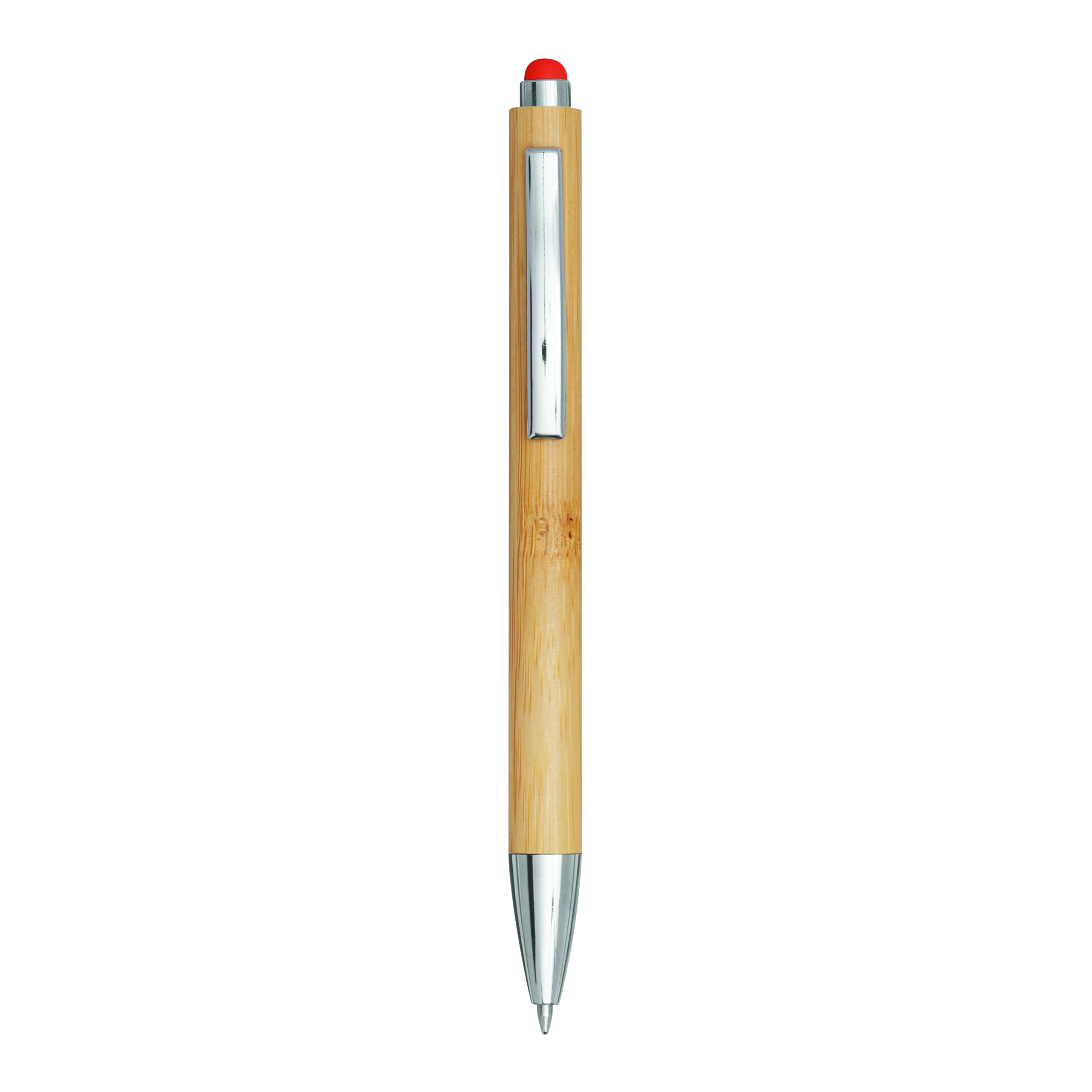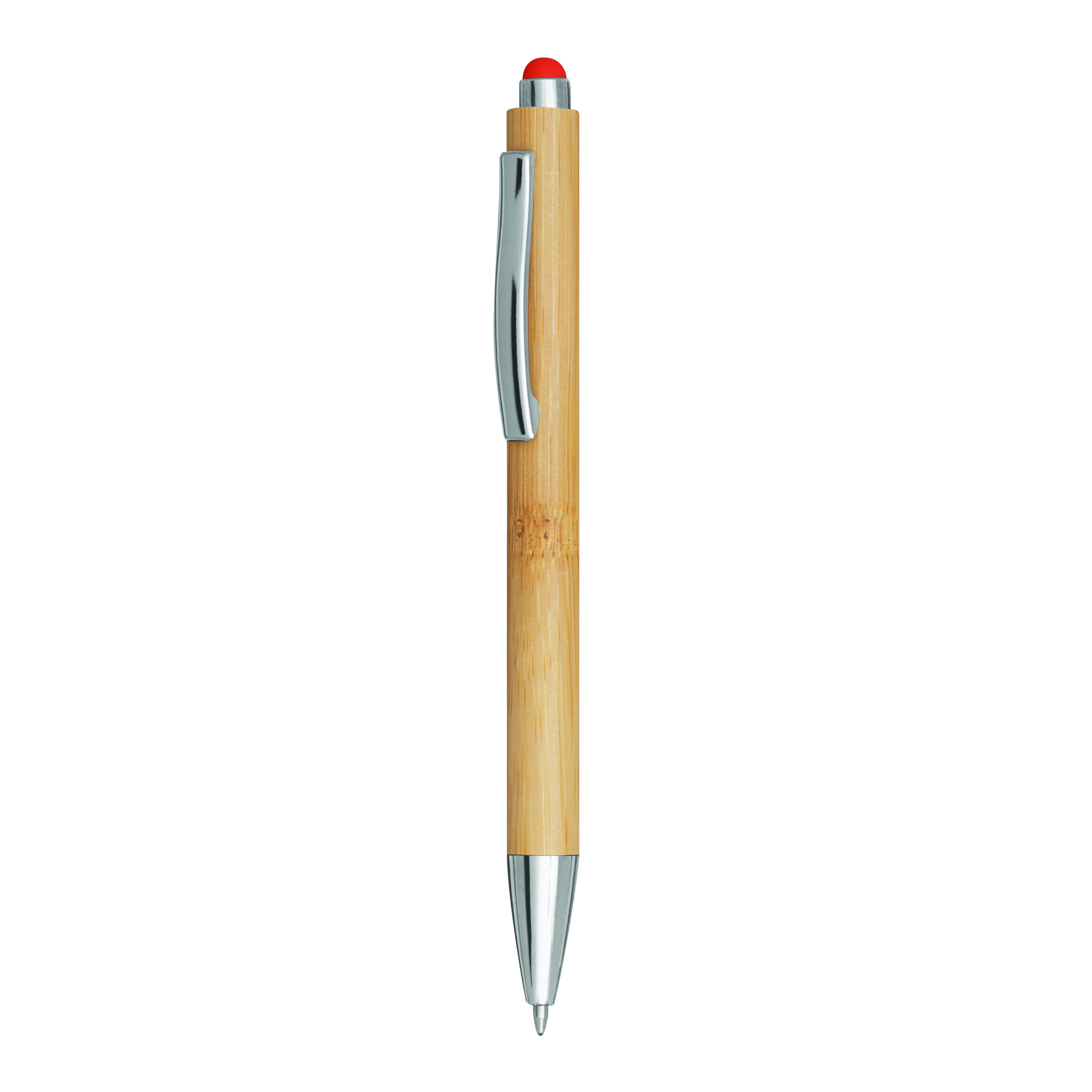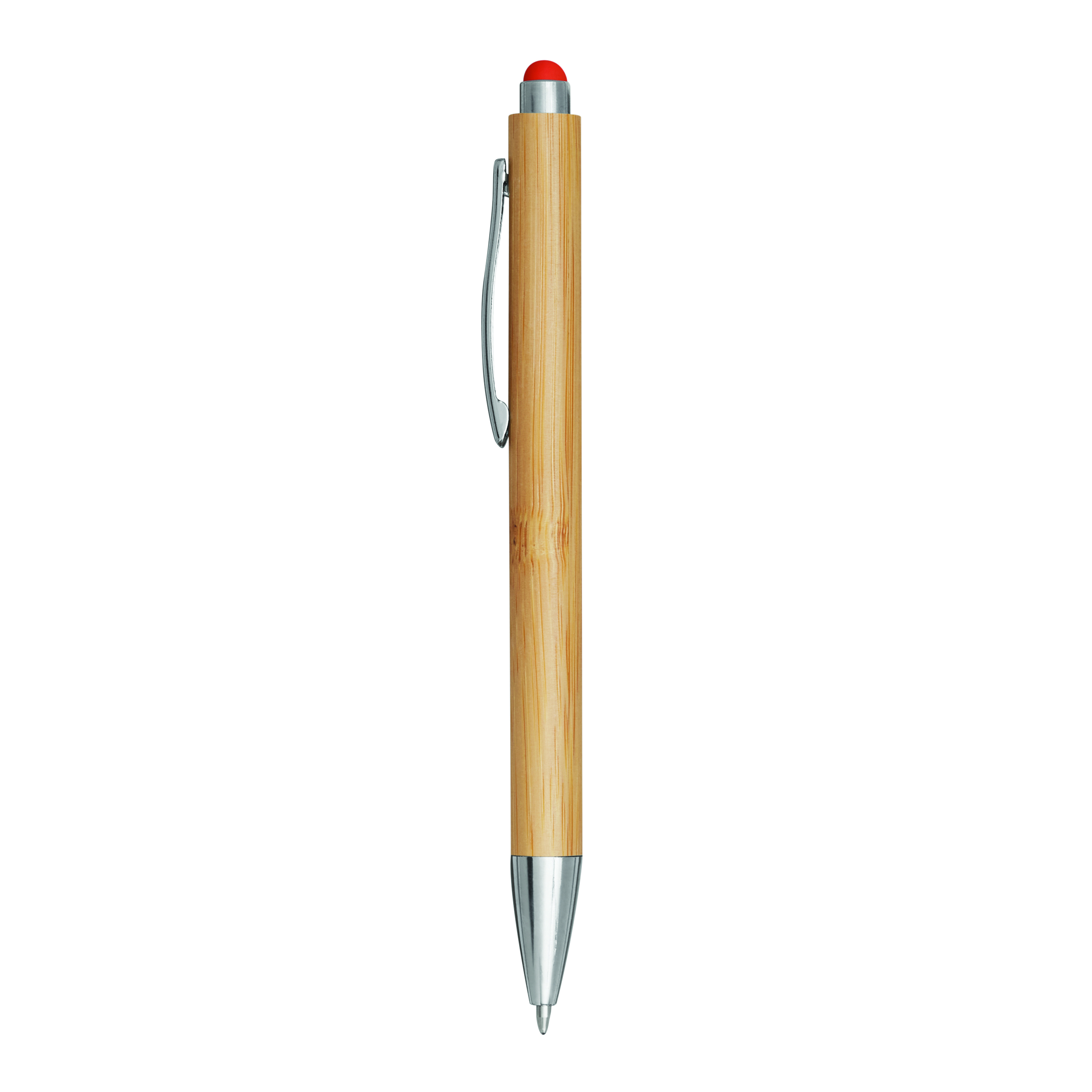 Długopis TOUCHY z korpusem pokrytym bambusem. Wyposażony w mechanizm naciskowy, z kolorową końcówką do obsługi ekranu dotykowego. Niebieski tusz.