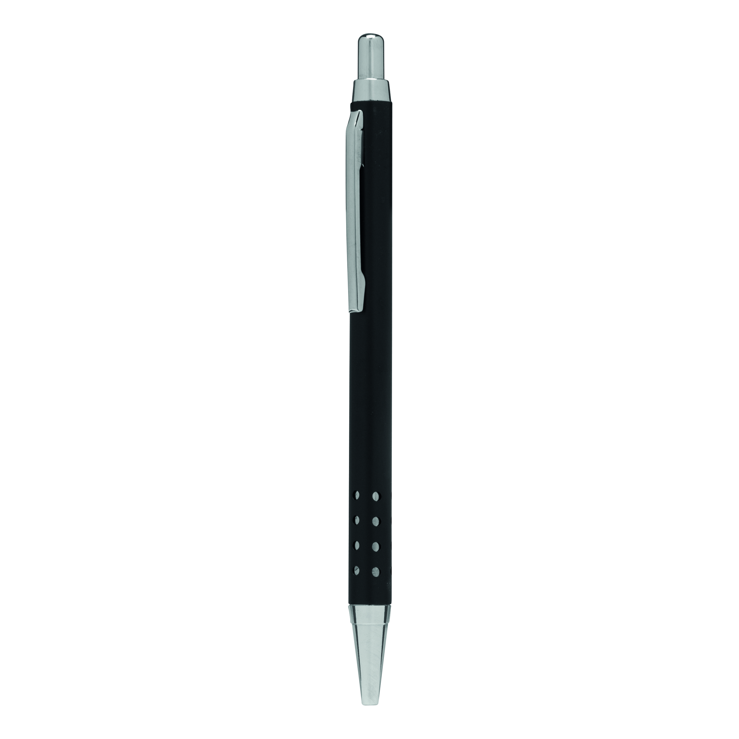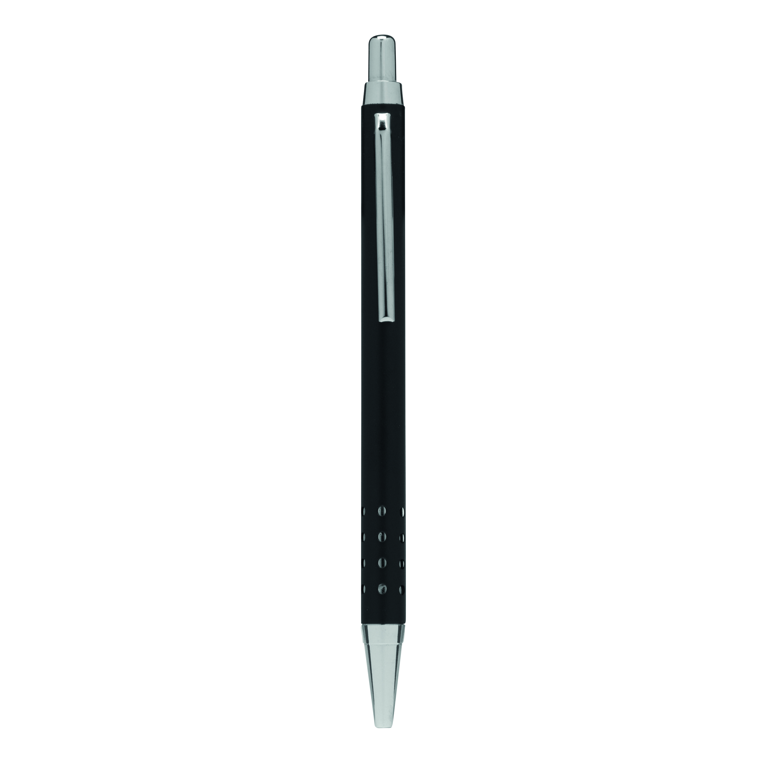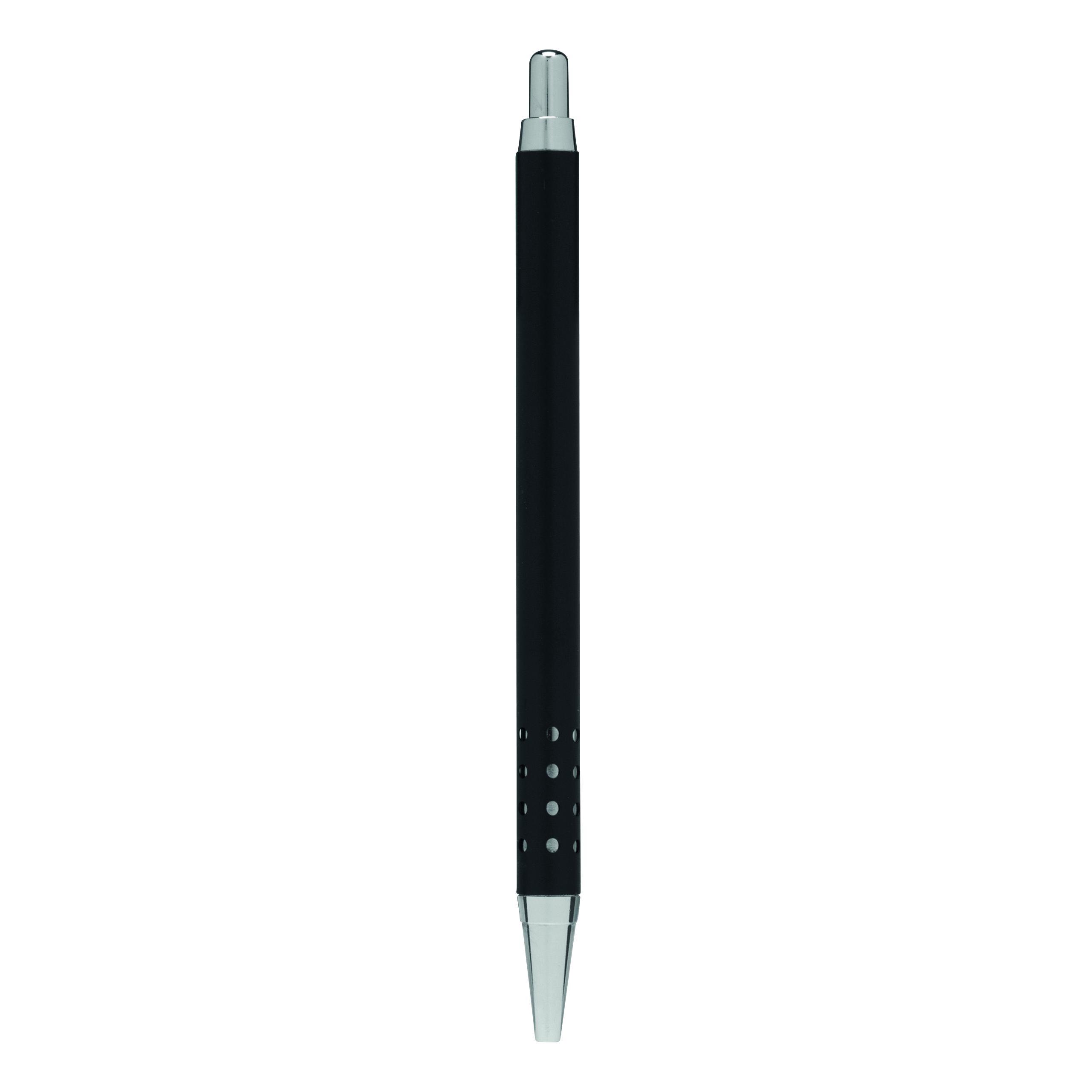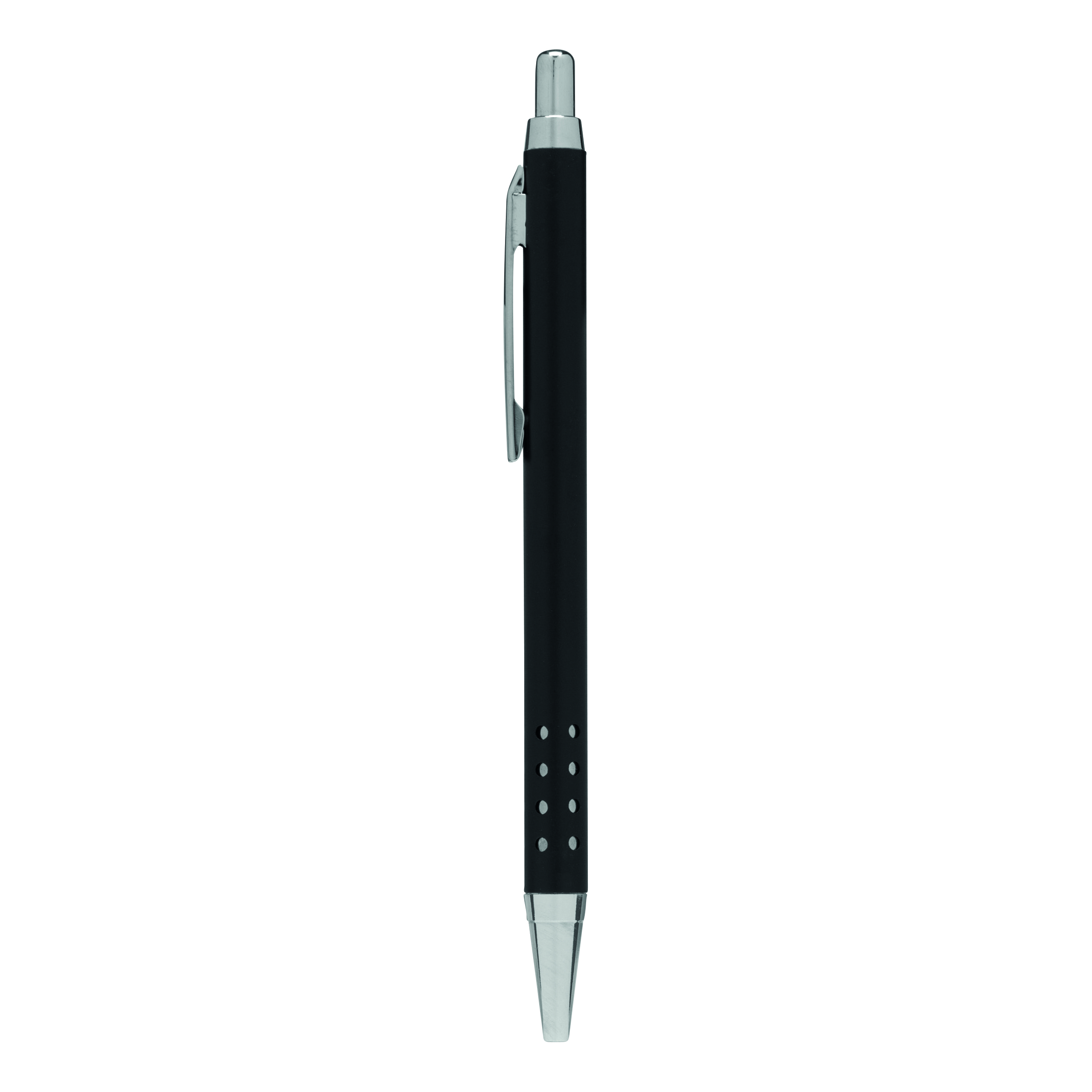 Mosiężny długopis BUDAPEST: korpus z ozdobnymi otworami, mechanizm przyciskowy, duży wkład, niebieski tusz.
