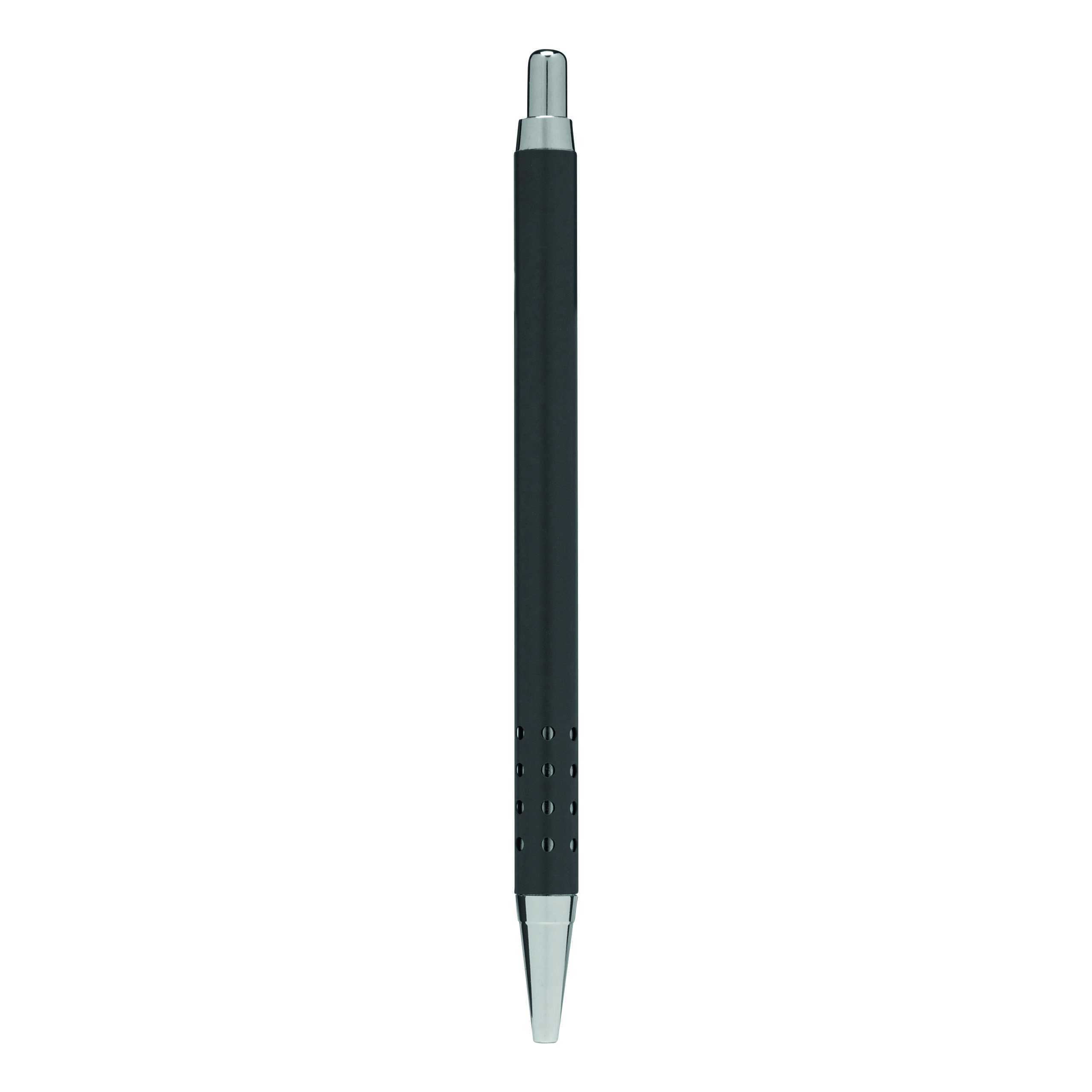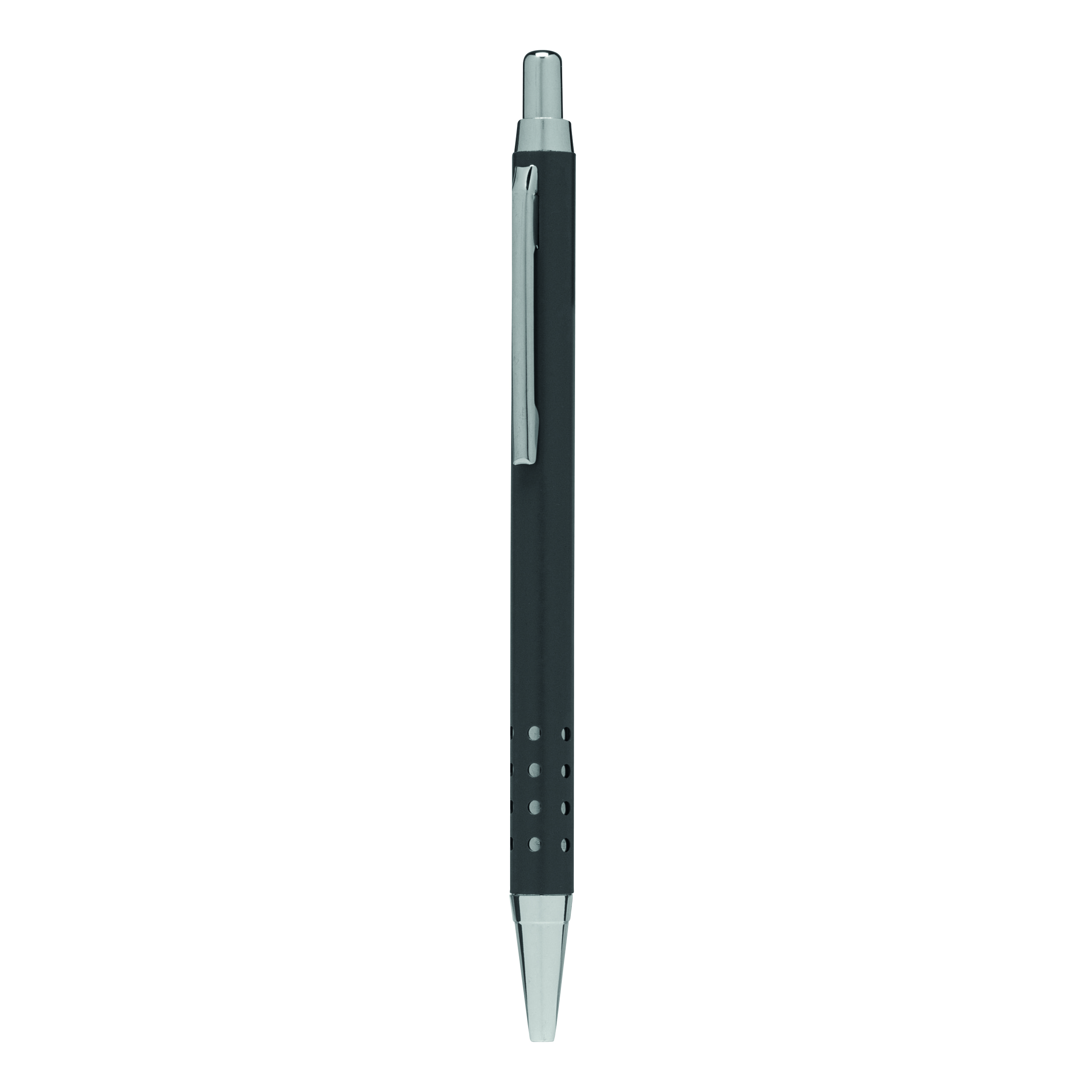 Mosiężny długopis BUDAPEST: korpus z ozdobnymi otworami, mechanizm przyciskowy, duży wkład, niebieski tusz.