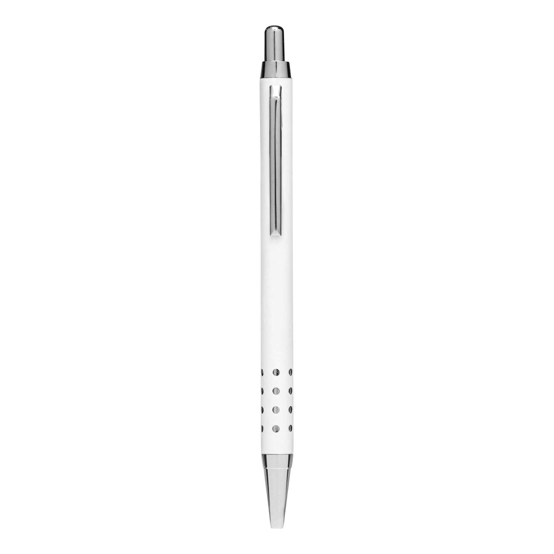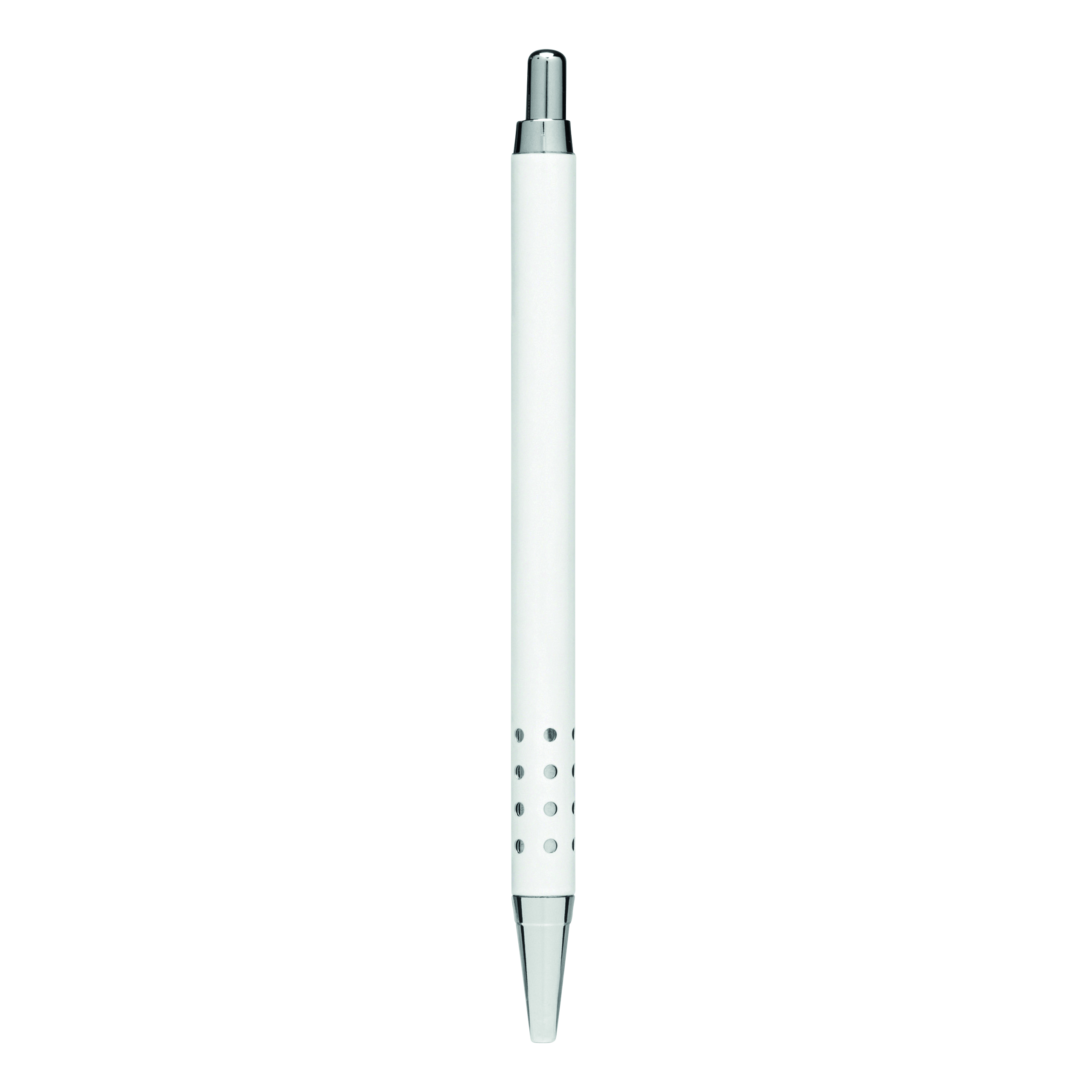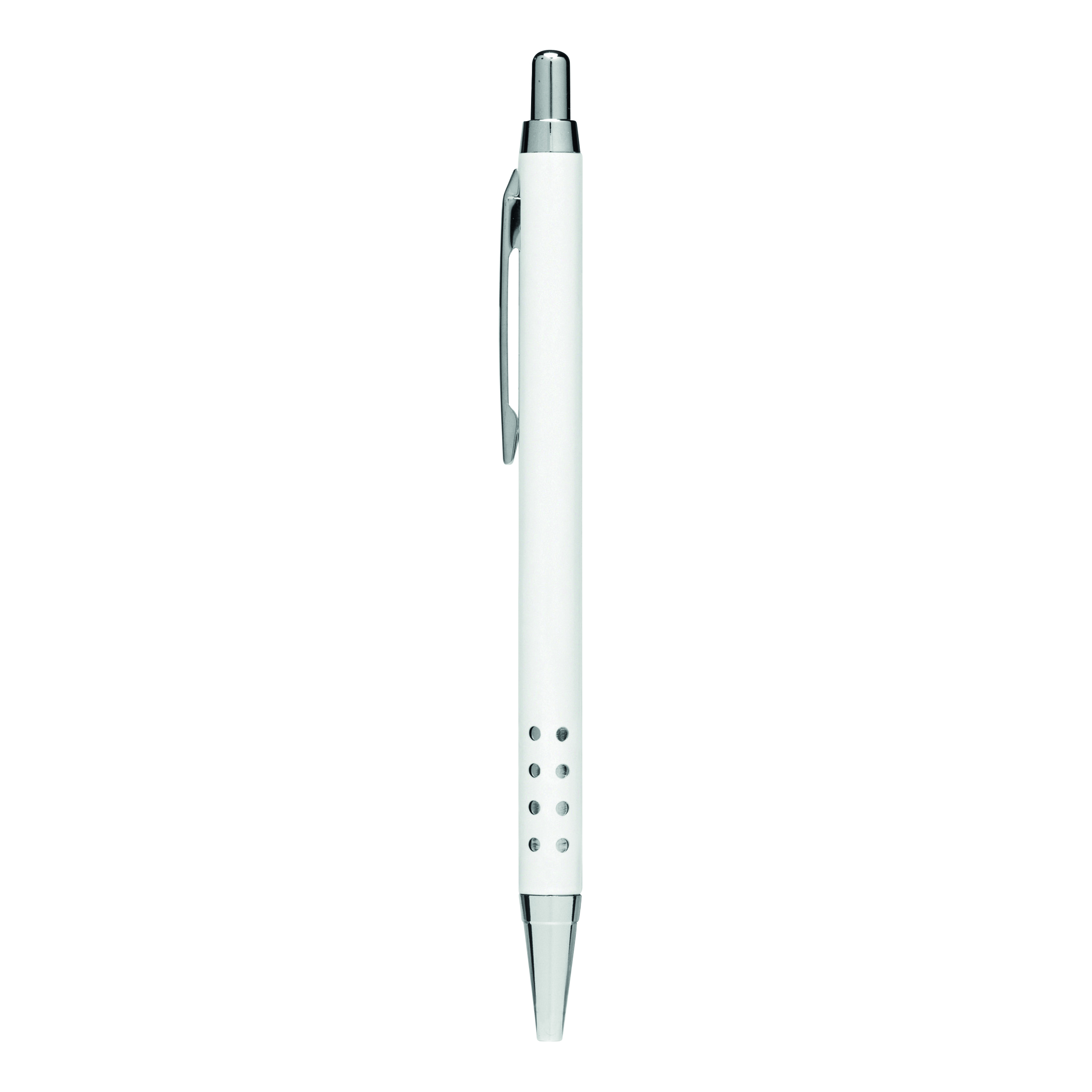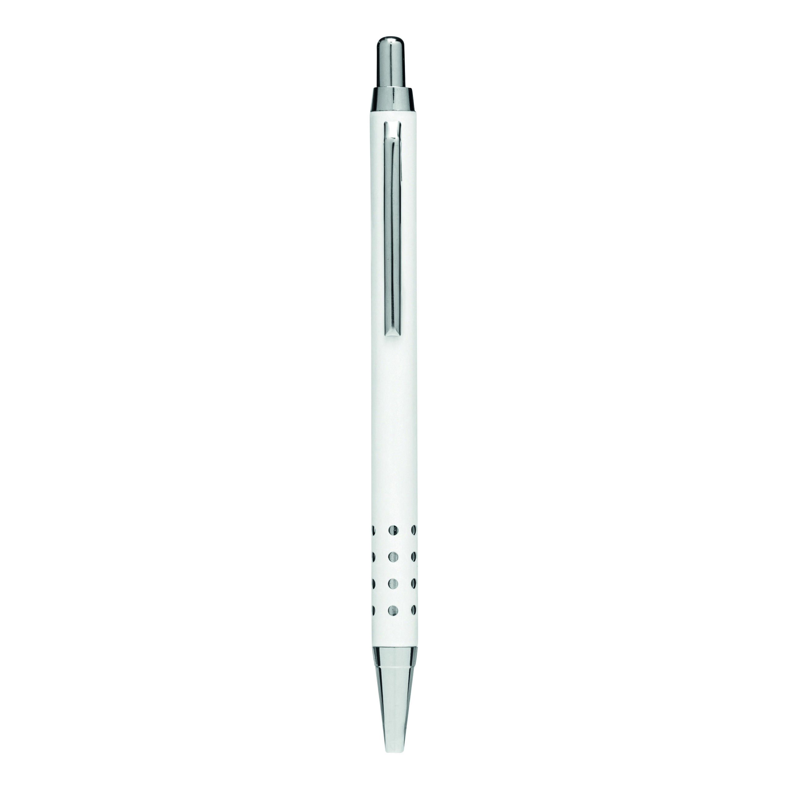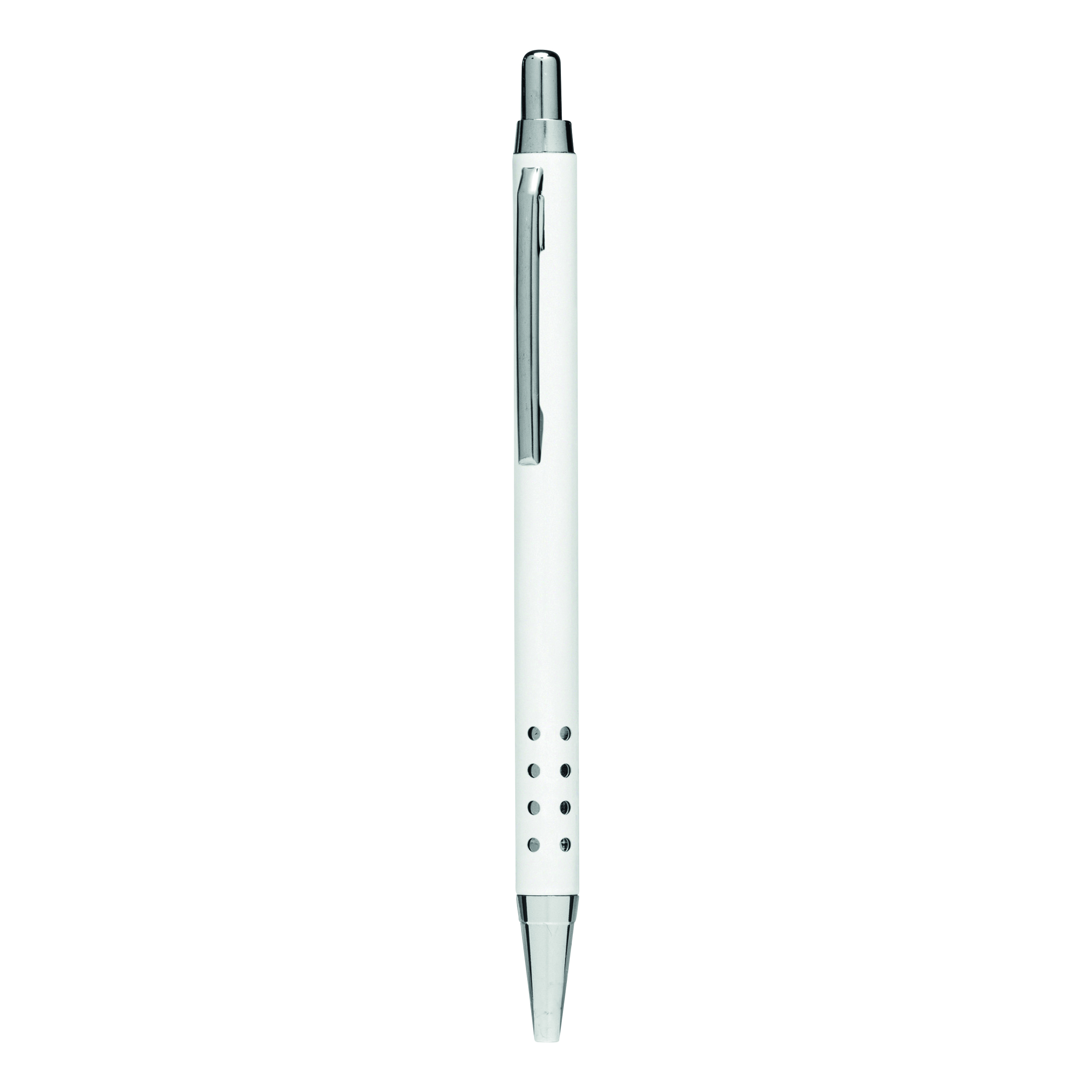 Aluminiowy długopis BUKAREST: korpus z ozdobnymi otworami, mechanizm przyciskowy, duży wkład, niebieski tusz.