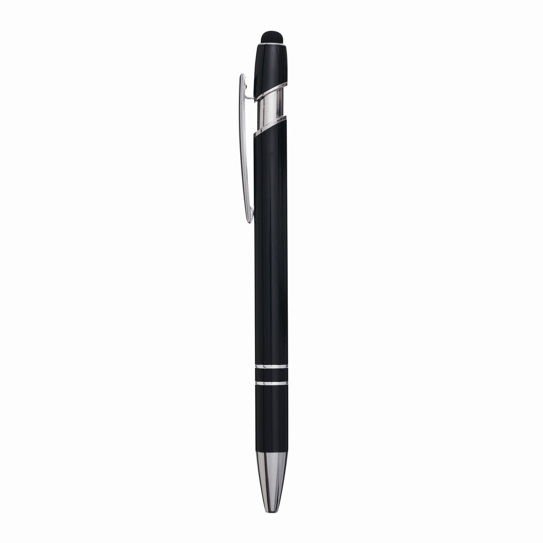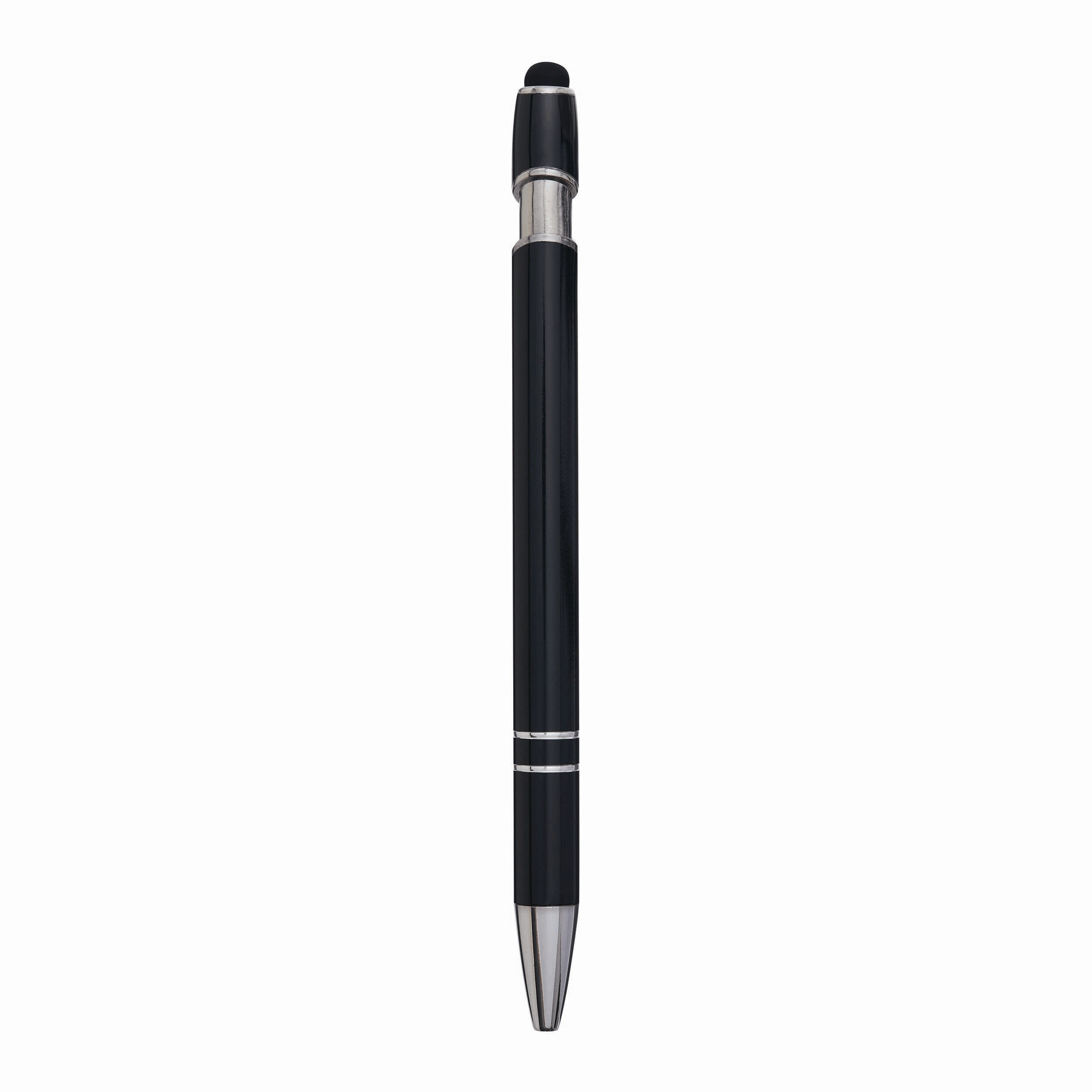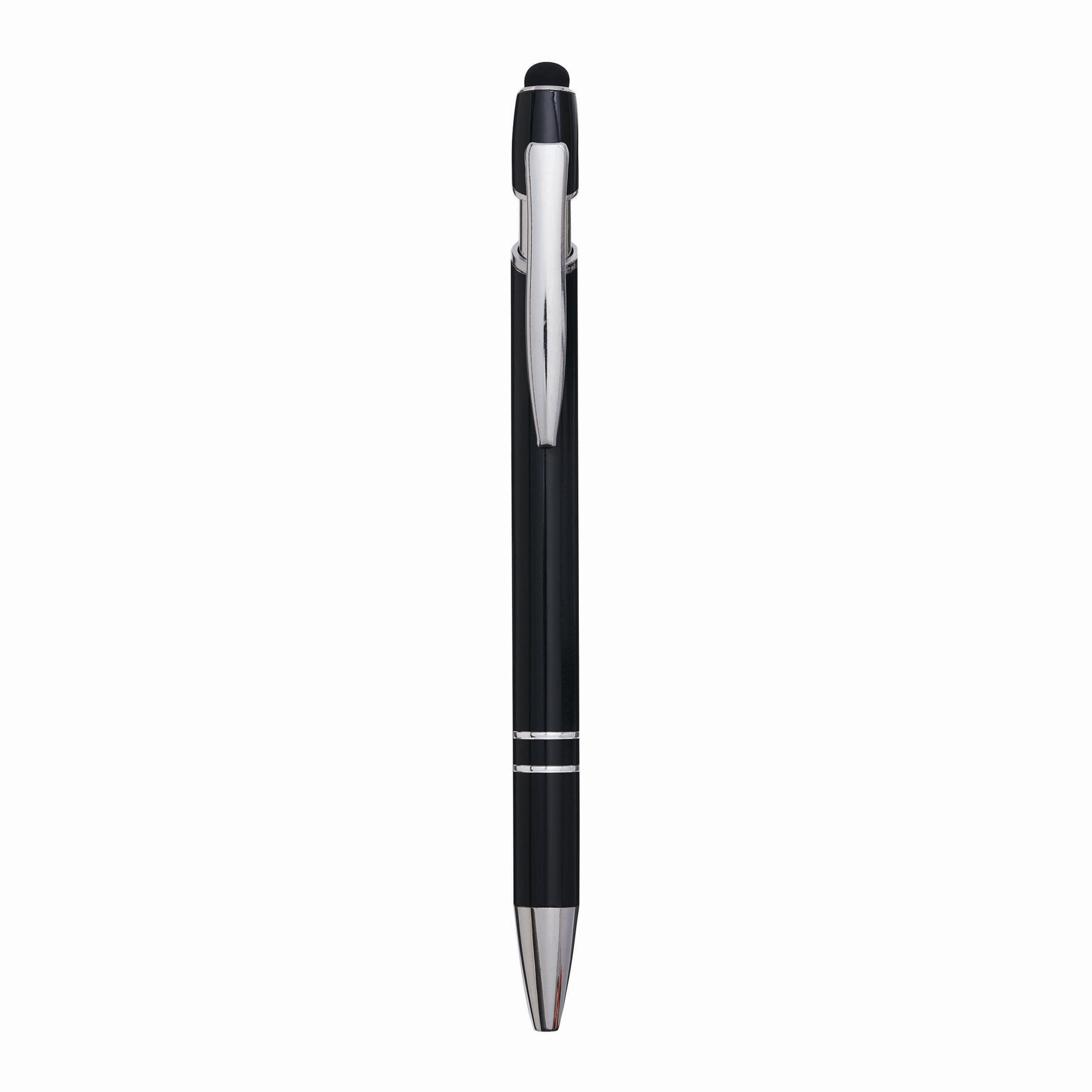 Aluminiowy długopis MERCHANT: z błyszczącą metalową obudową, mechanizmem na przycisk, gumowaną końcówką do ekranów dotykowych, niebieskim wkładem.
