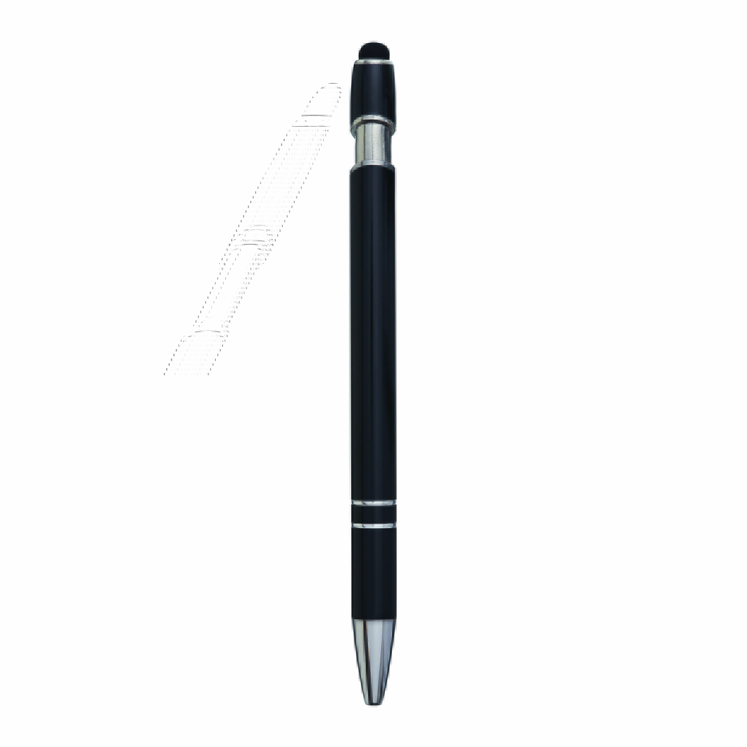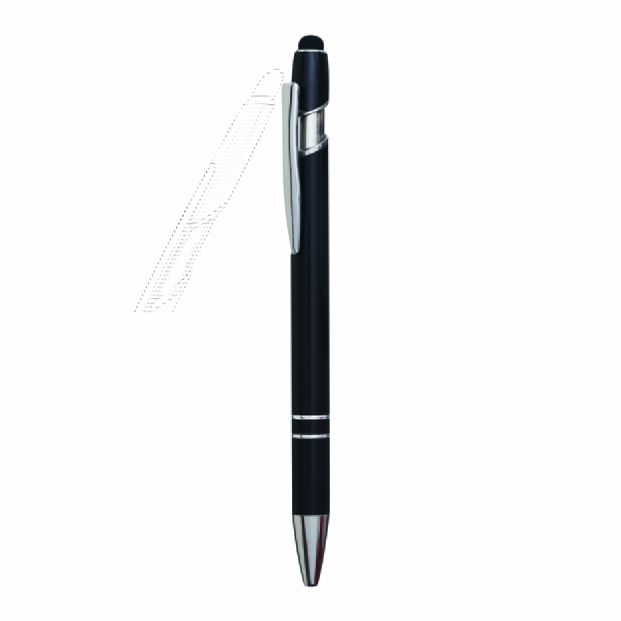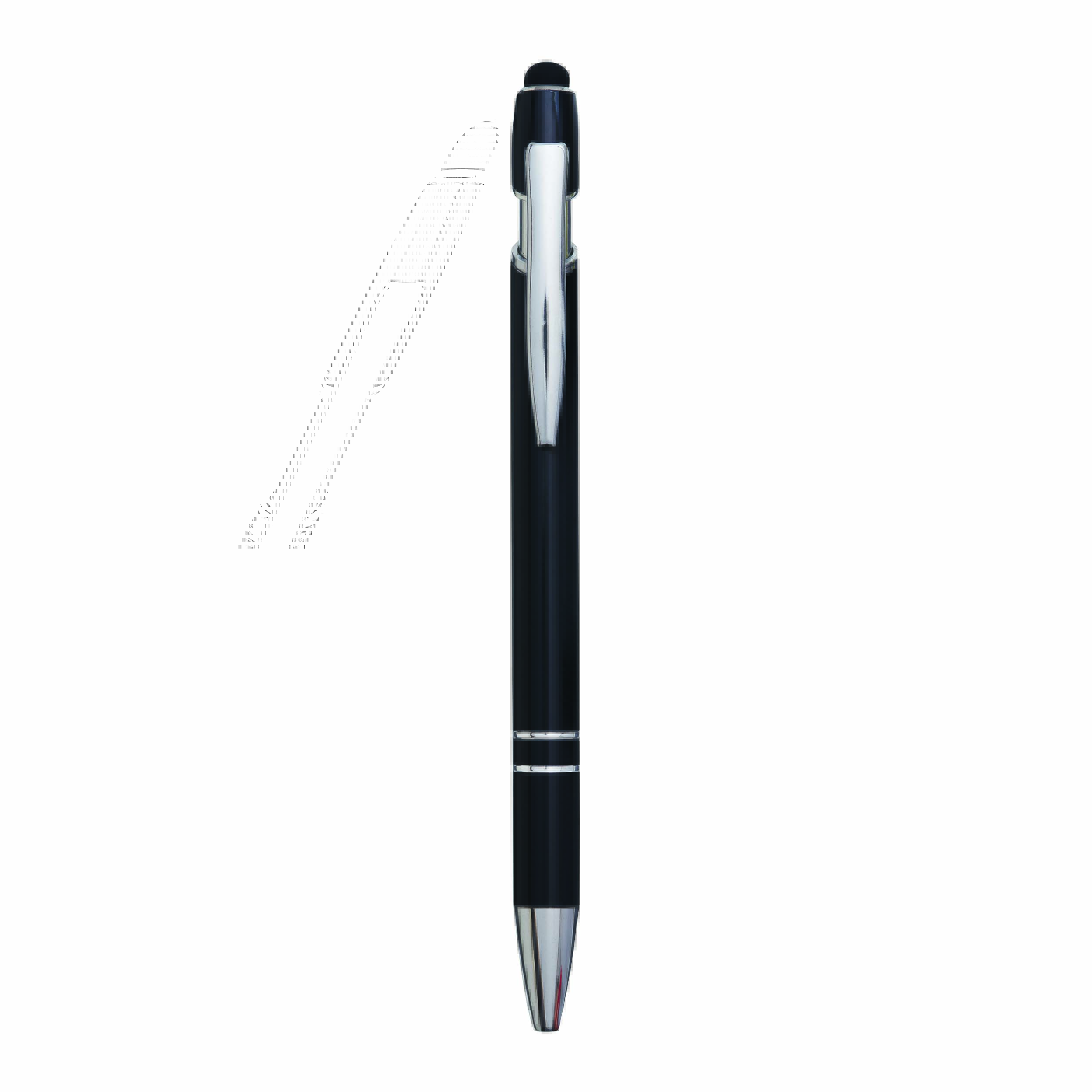 Aluminiowy długopis MERCHANT: z błyszczącą metalową obudową, mechanizmem na przycisk, gumowaną końcówką do ekranów dotykowych, niebieskim wkładem.