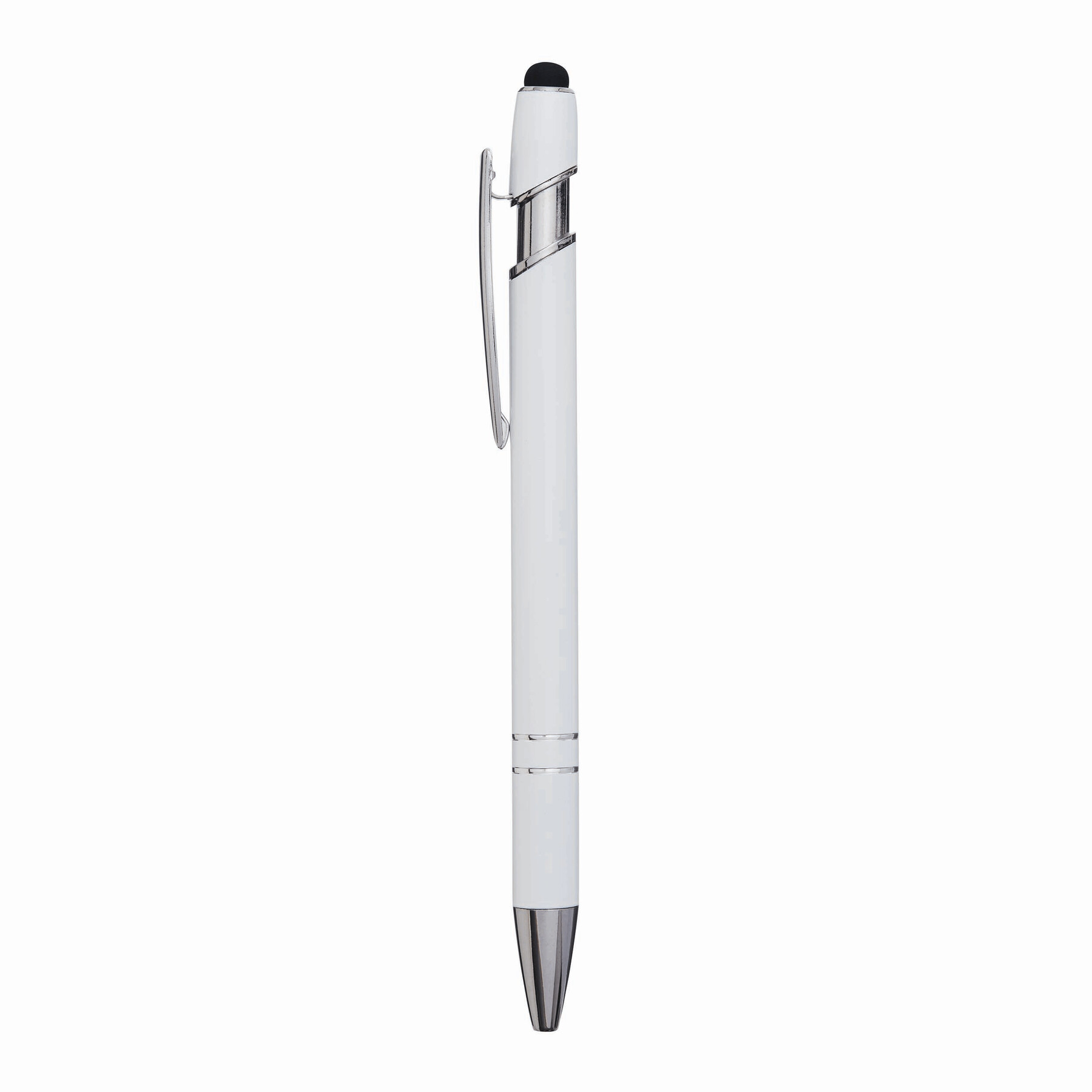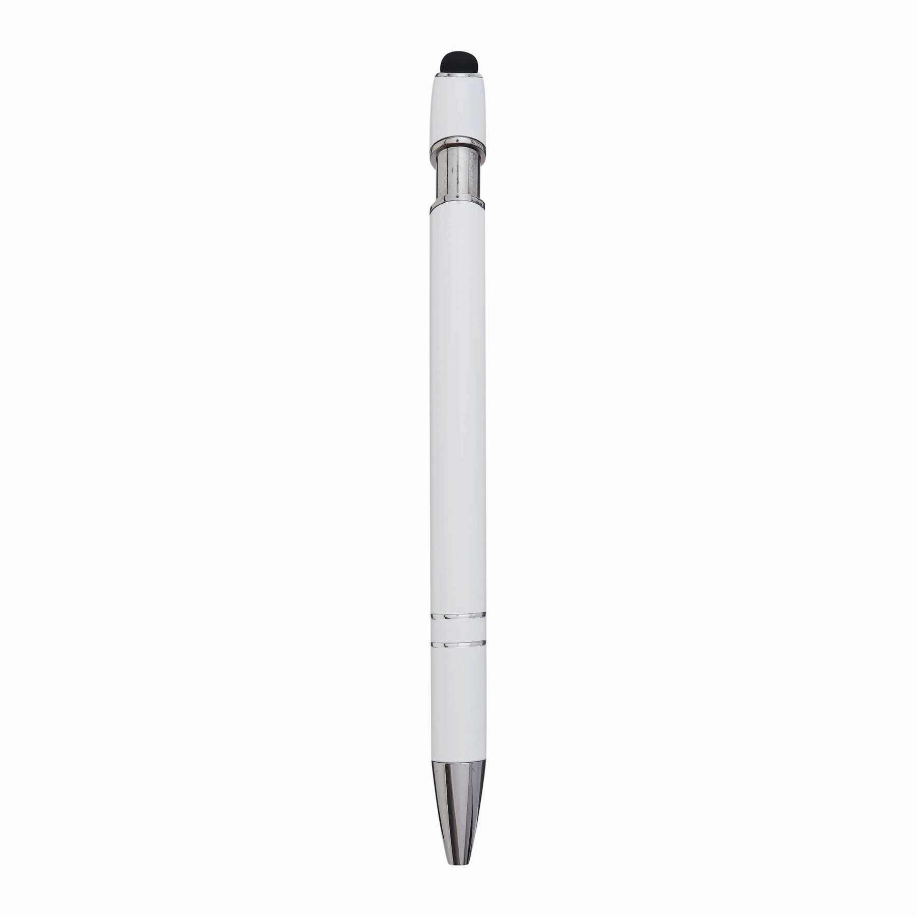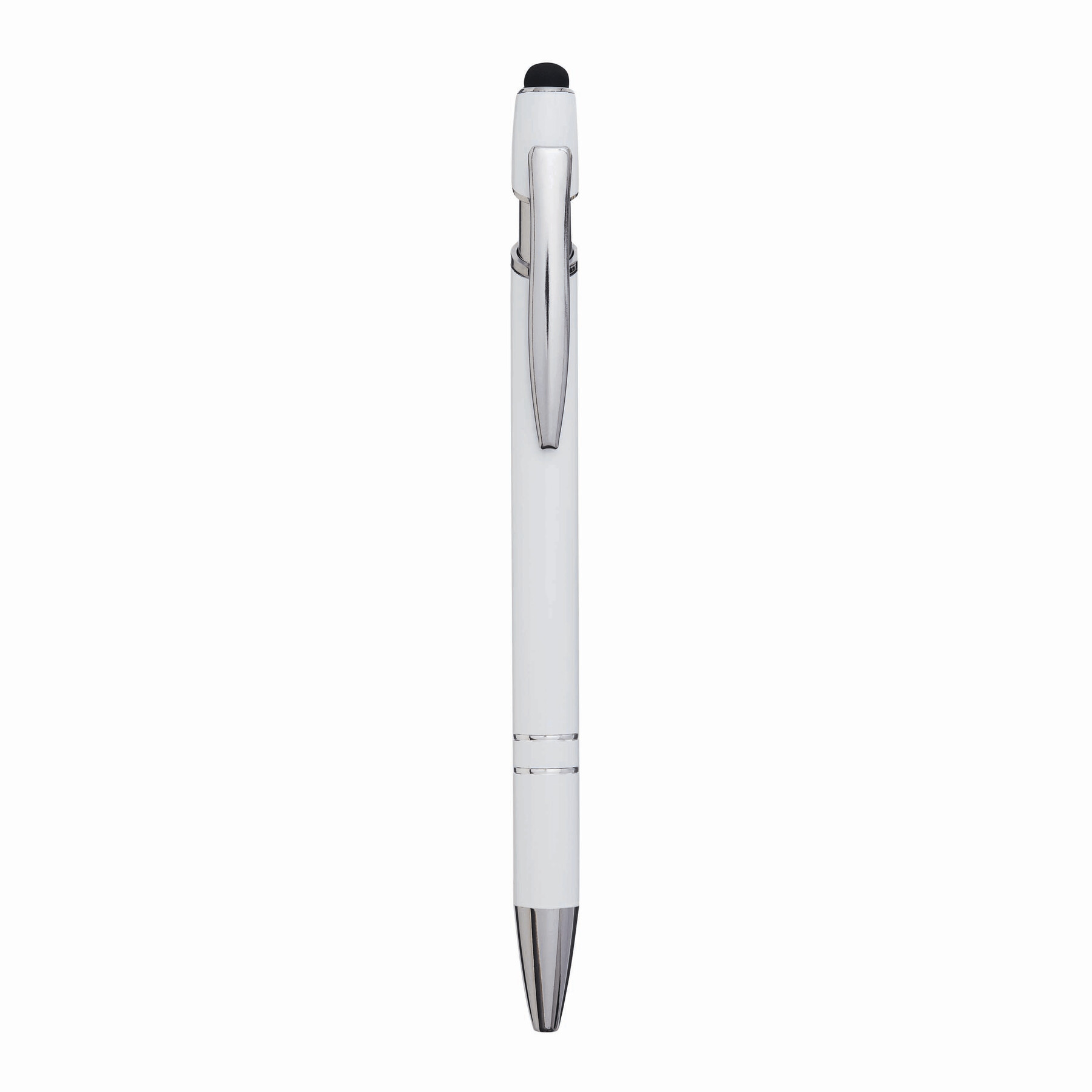 Aluminiowy długopis MERCHANT: z błyszczącą metalową obudową, mechanizmem na przycisk, gumowaną końcówką do ekranów dotykowych, niebieskim wkładem.