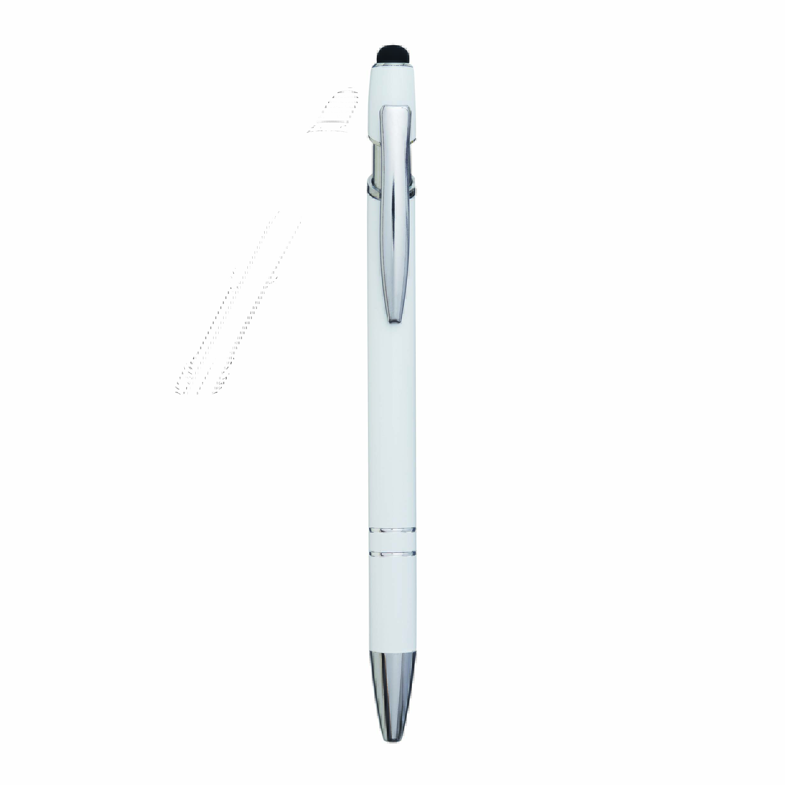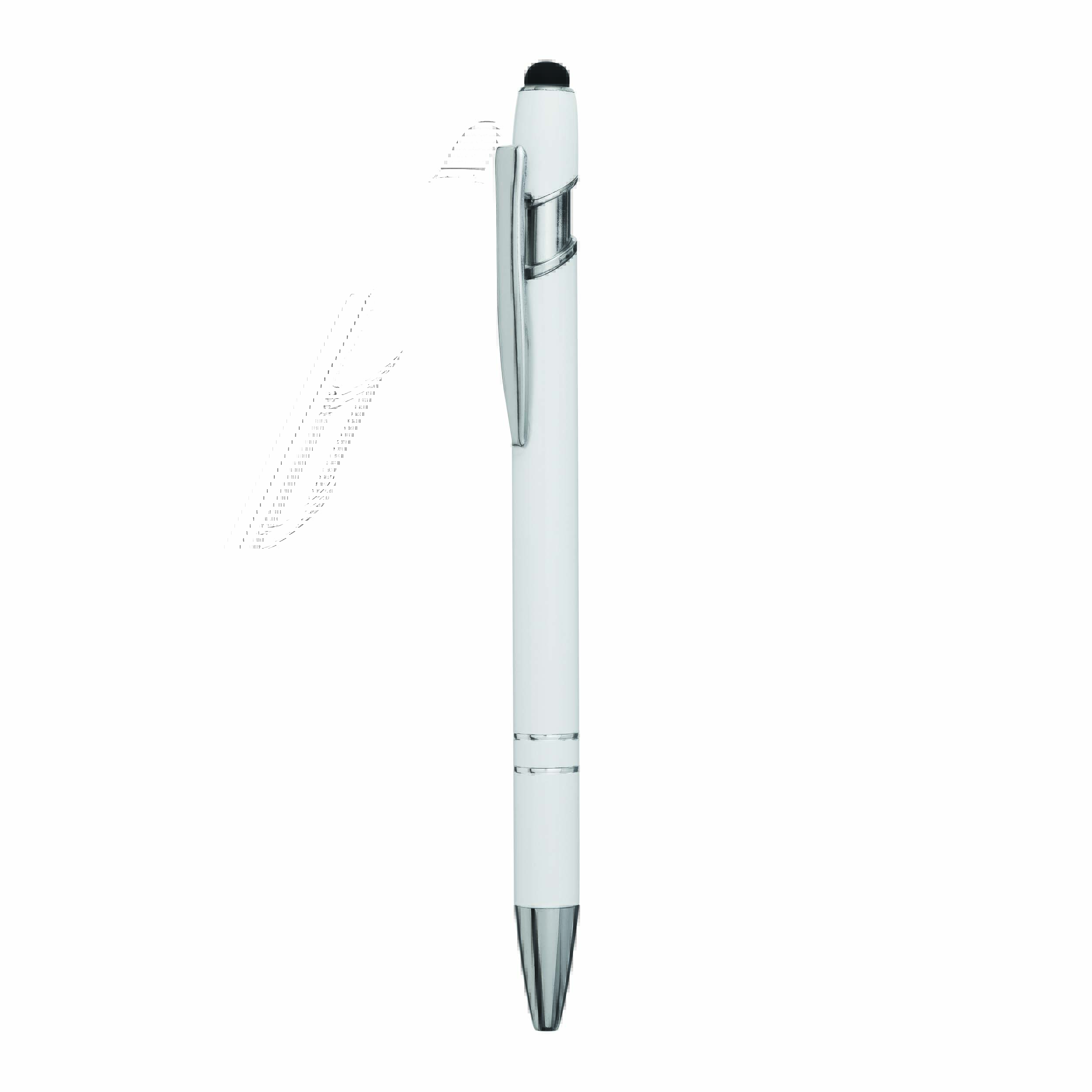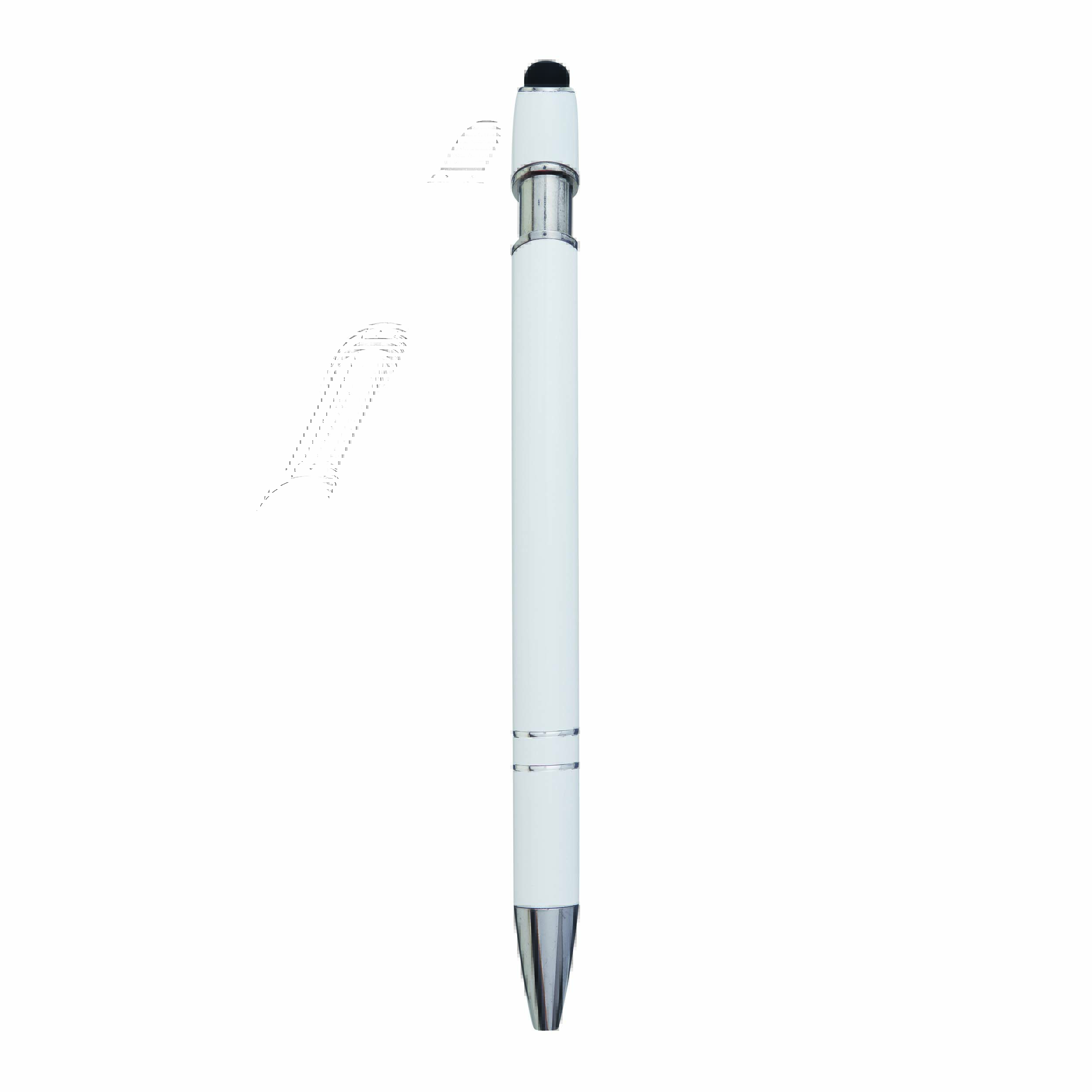 Aluminiowy długopis MERCHANT: z błyszczącą metalową obudową, mechanizmem na przycisk, gumowaną końcówką do ekranów dotykowych, niebieskim wkładem.