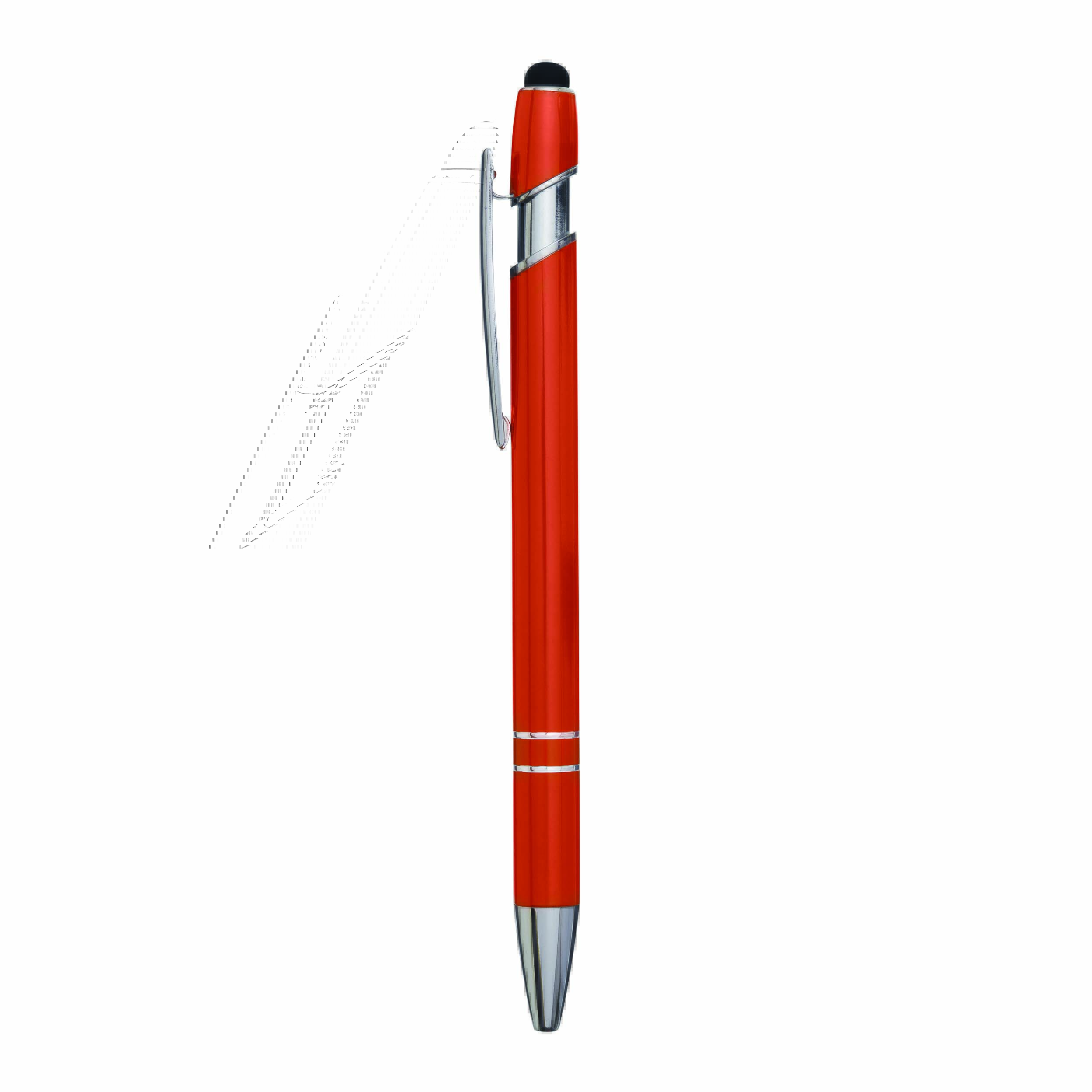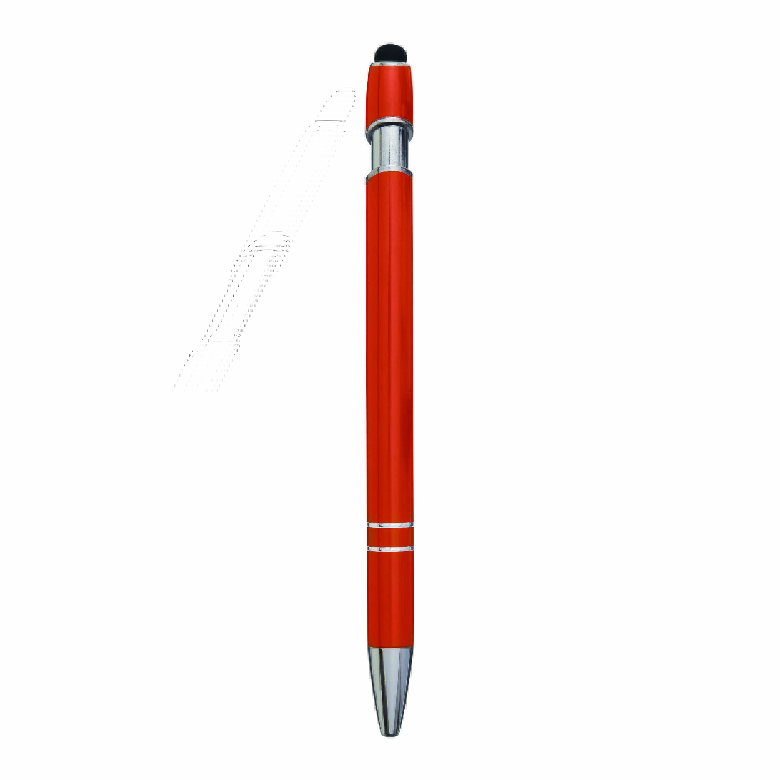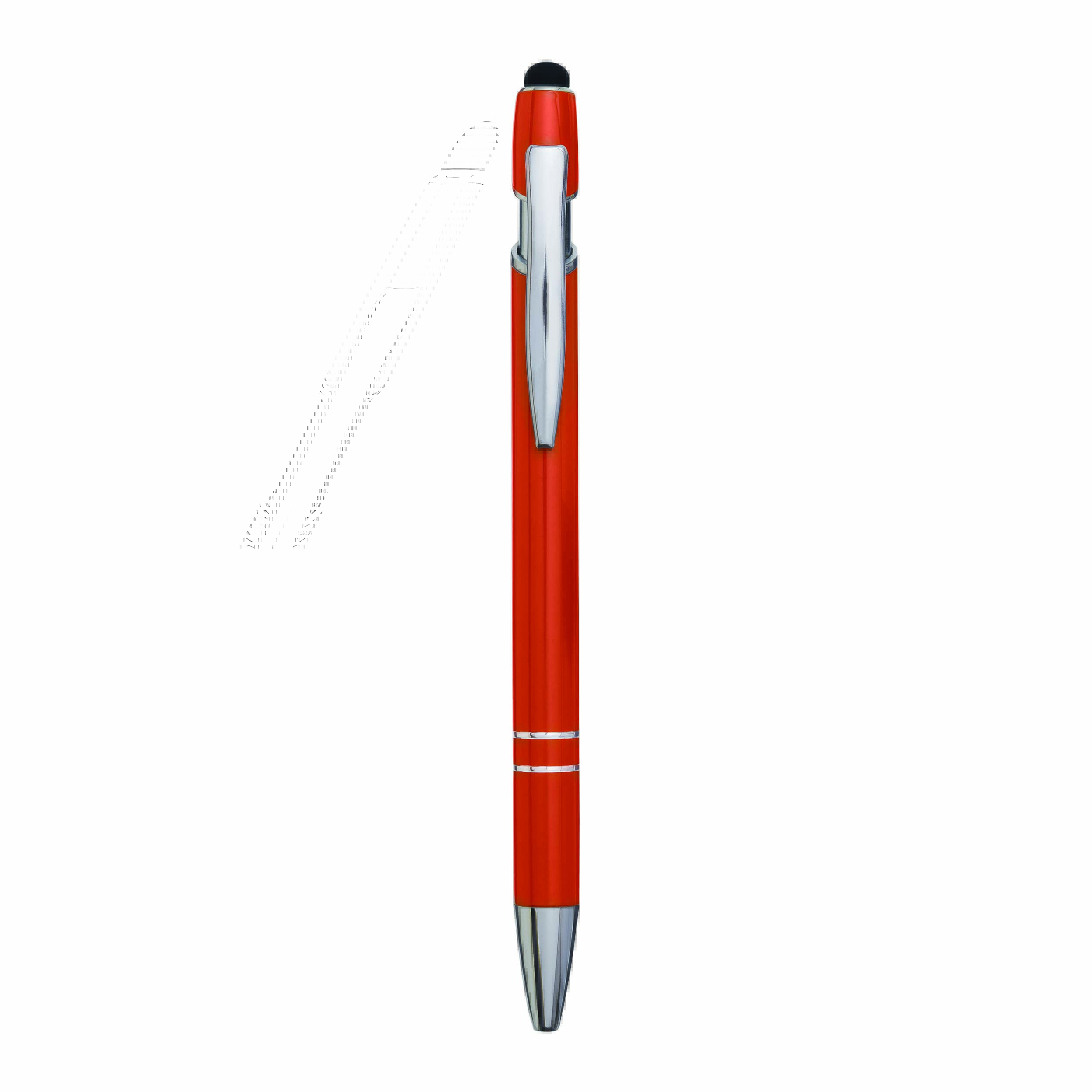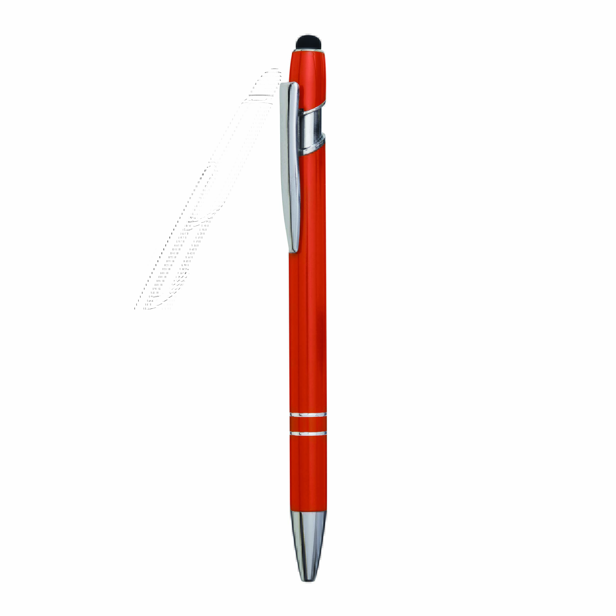Aluminiowy długopis MERCHANT: z błyszczącą metalową obudową, mechanizmem na przycisk, gumowaną końcówką do ekranów dotykowych, niebieskim wkładem.