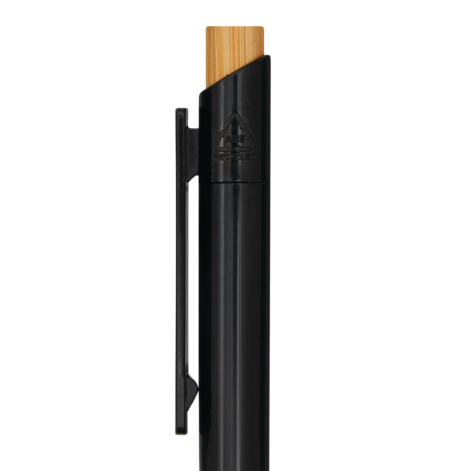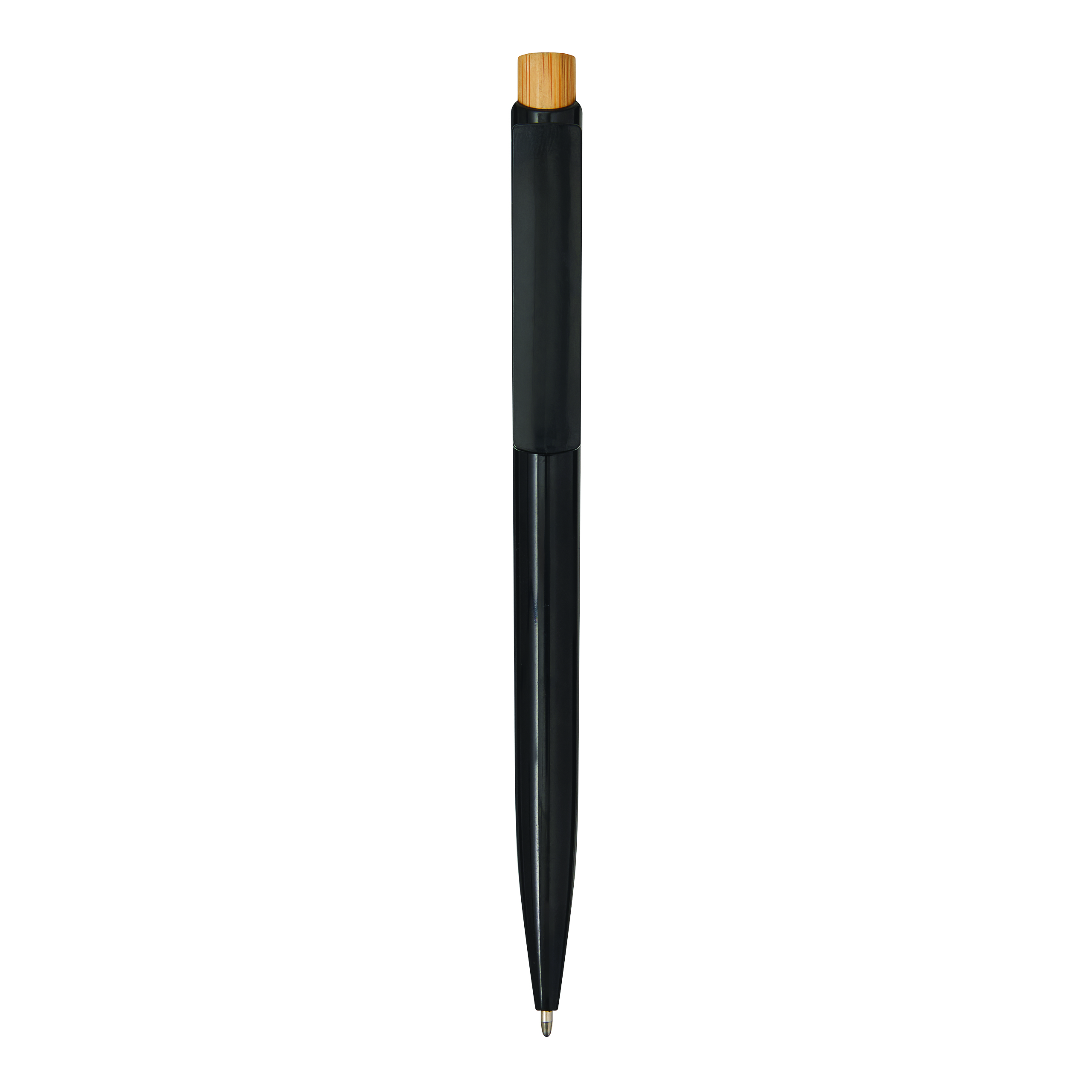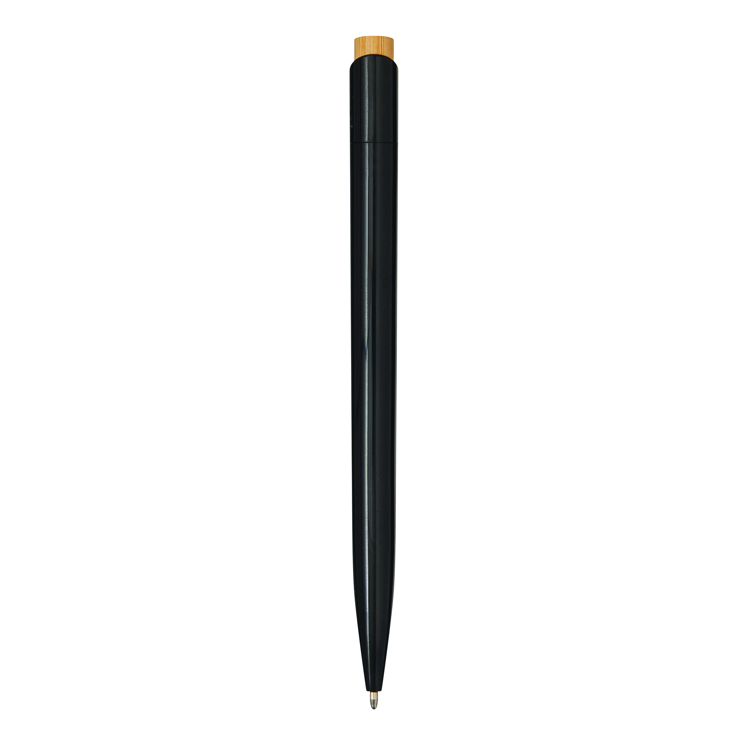 Długopis BAPU. Posiada korpus wykonany z plastiku pochodzącego z recyklingu, mechanizm typu push, przycisk wykonany z bambusa i niebieski tusz.