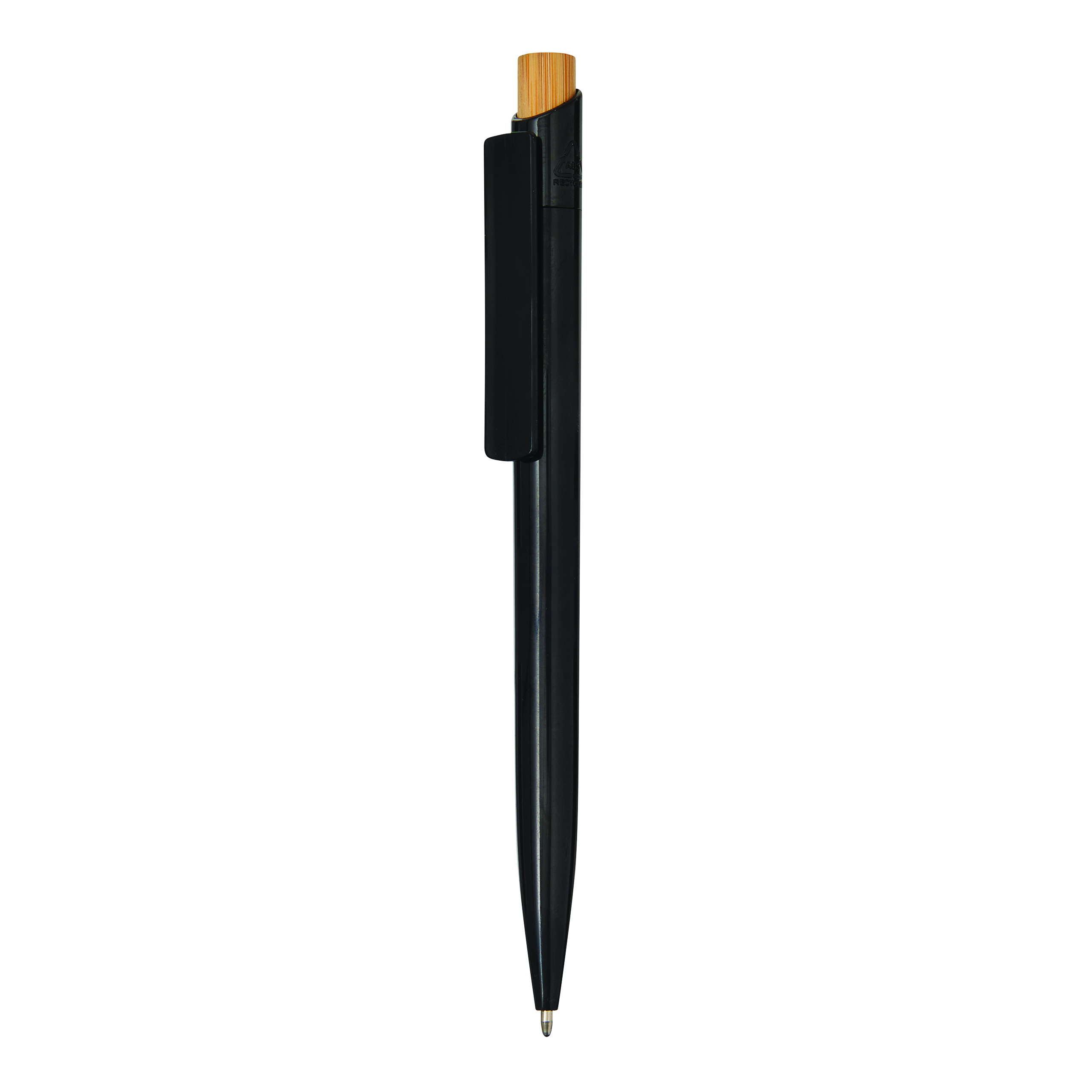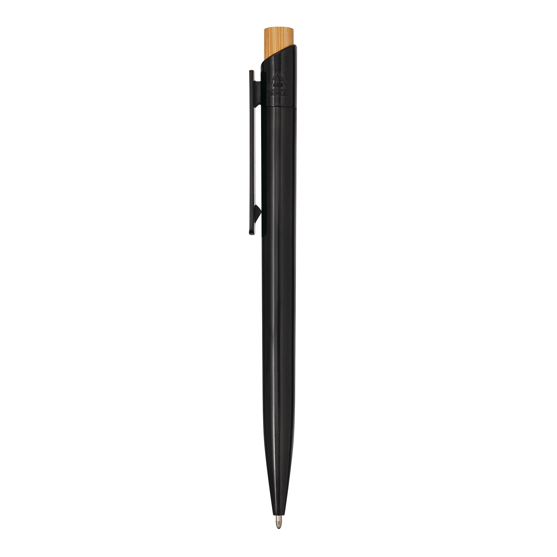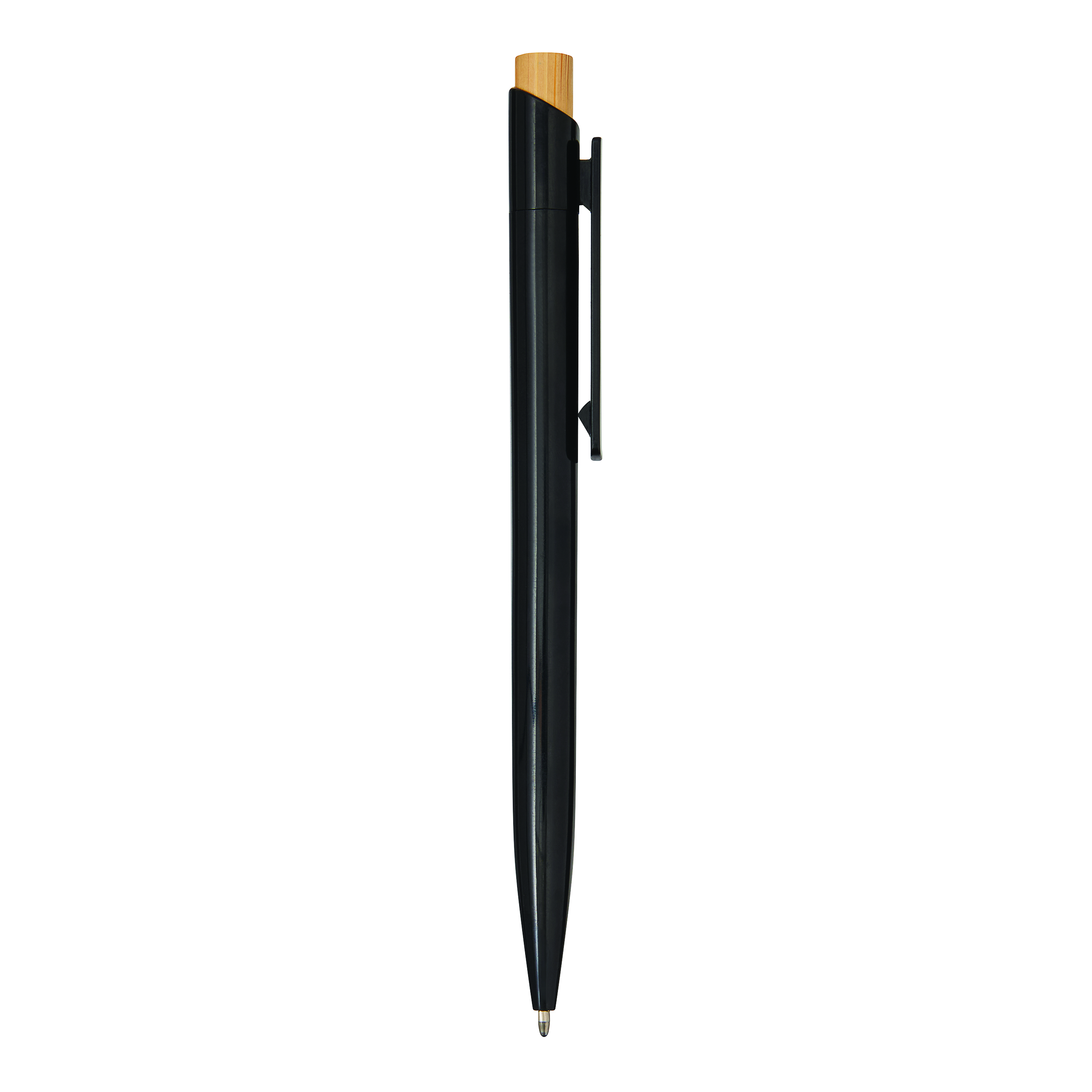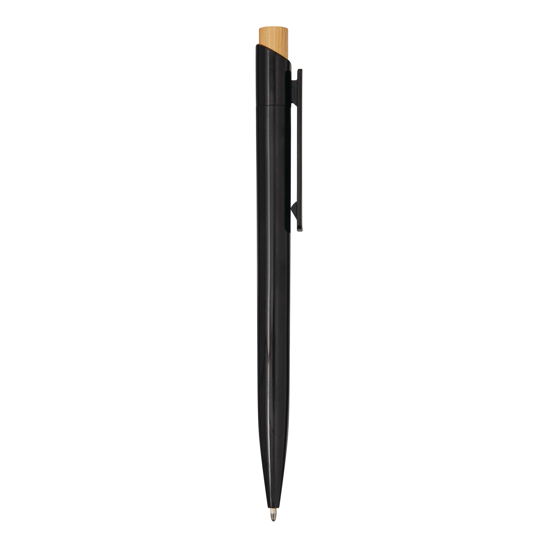 Długopis BAPU. Posiada korpus wykonany z plastiku pochodzącego z recyklingu, mechanizm typu push, przycisk wykonany z bambusa i niebieski tusz.