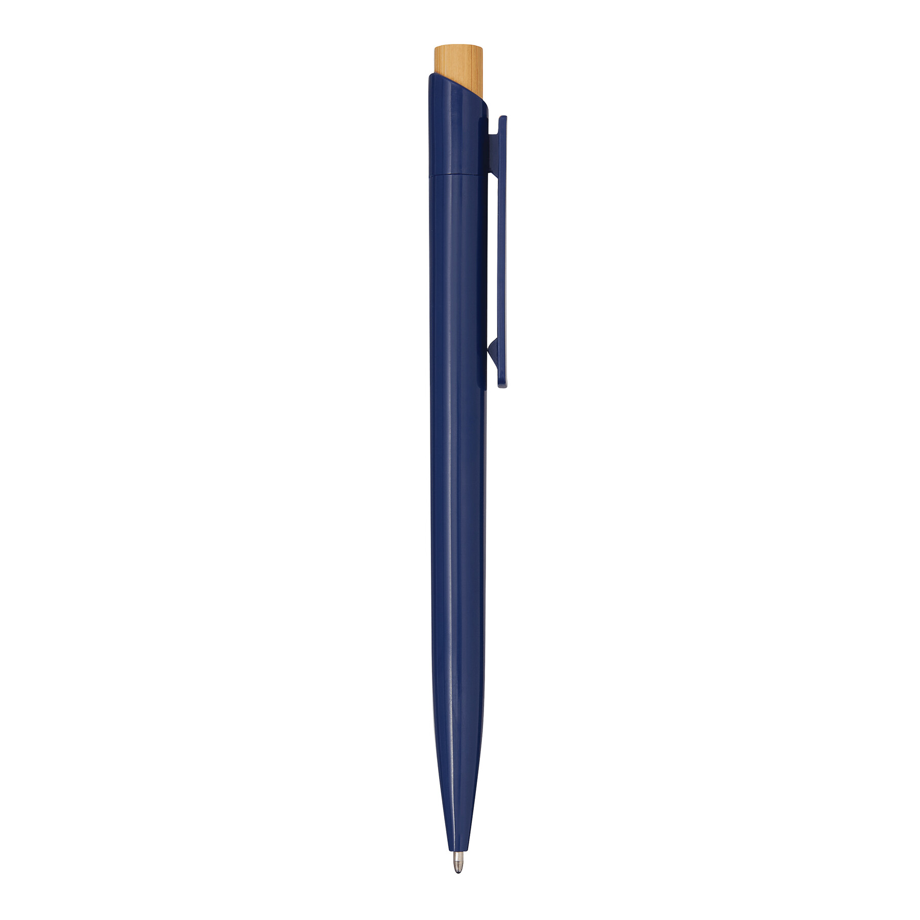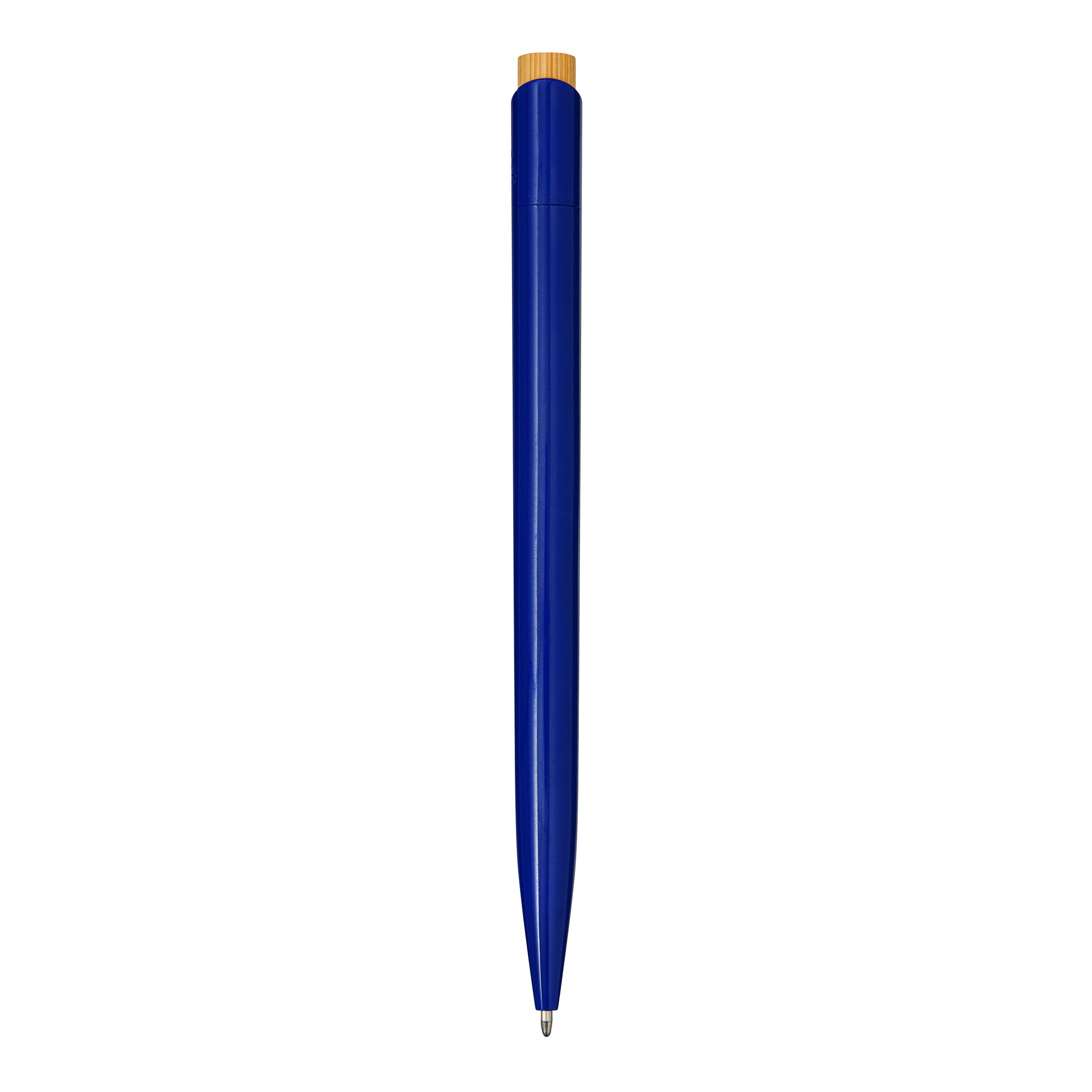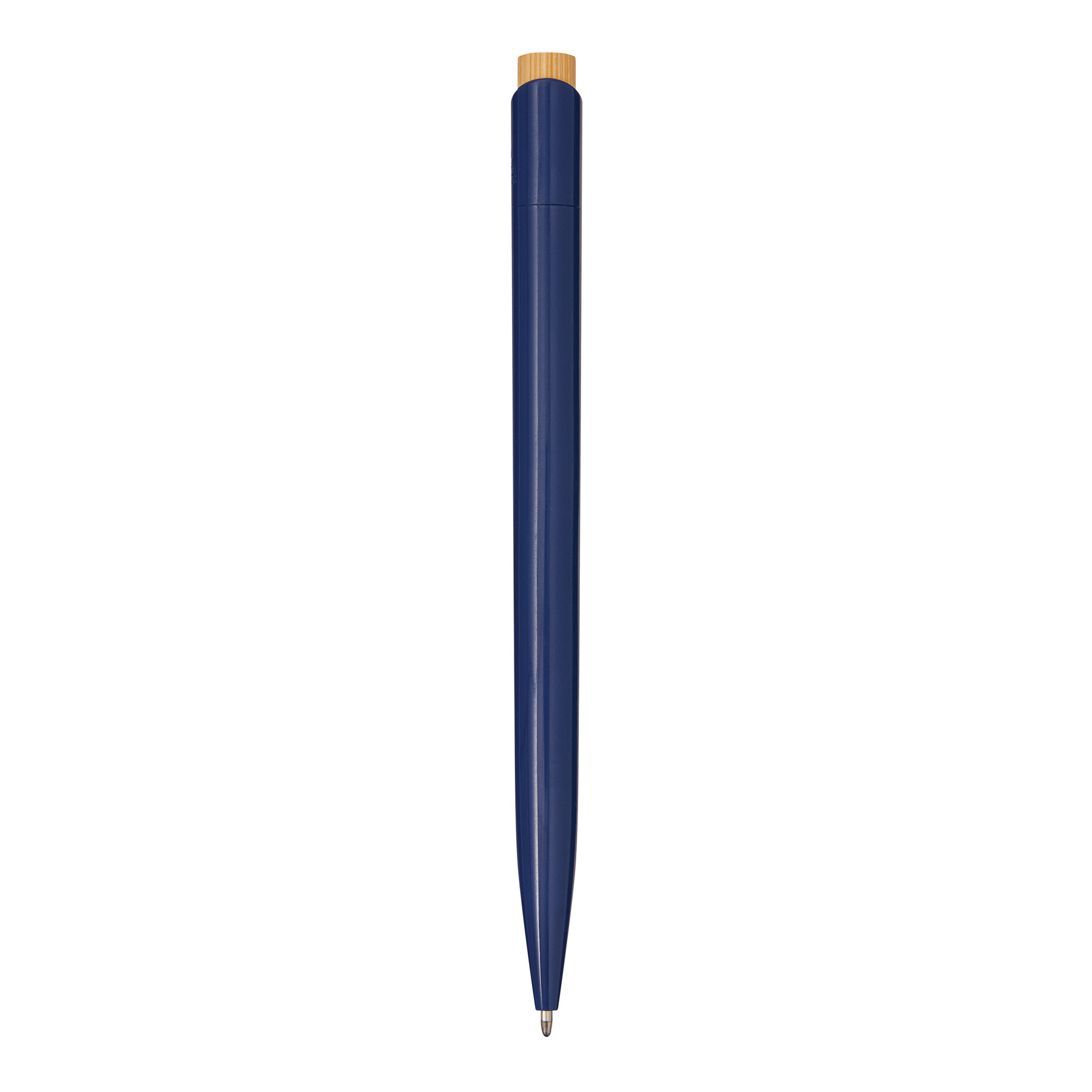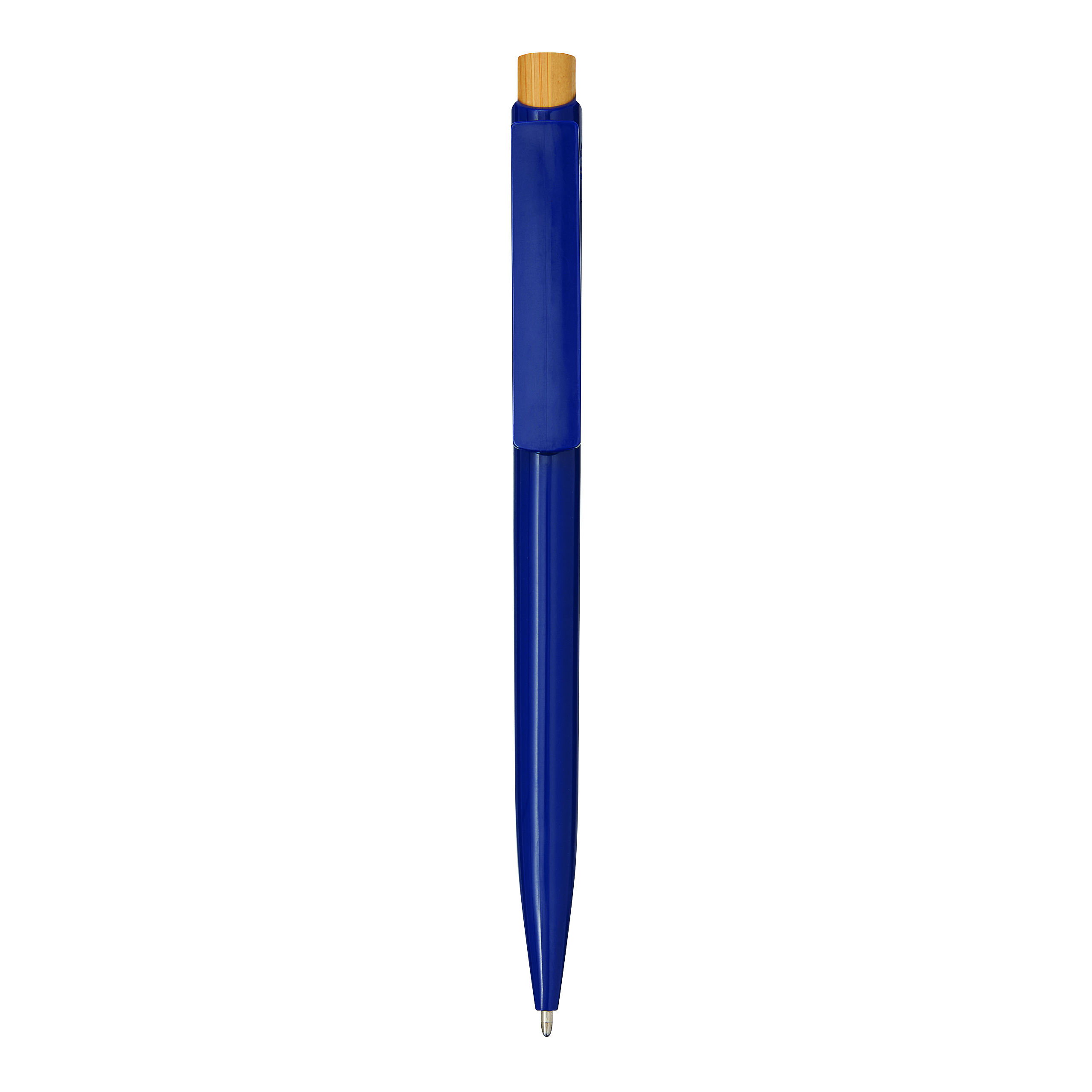 Długopis BAPU. Posiada korpus wykonany z plastiku pochodzącego z recyklingu, mechanizm typu push, przycisk wykonany z bambusa i niebieski tusz.