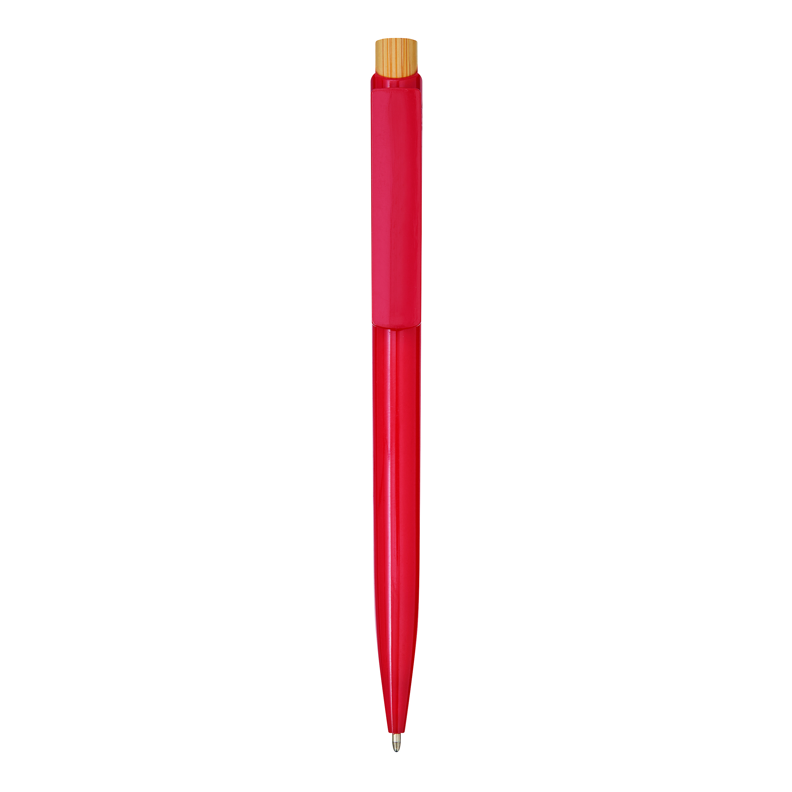 Długopis BAPU. Posiada korpus wykonany z plastiku pochodzącego z recyklingu, mechanizm typu push, przycisk wykonany z bambusa i niebieski tusz.