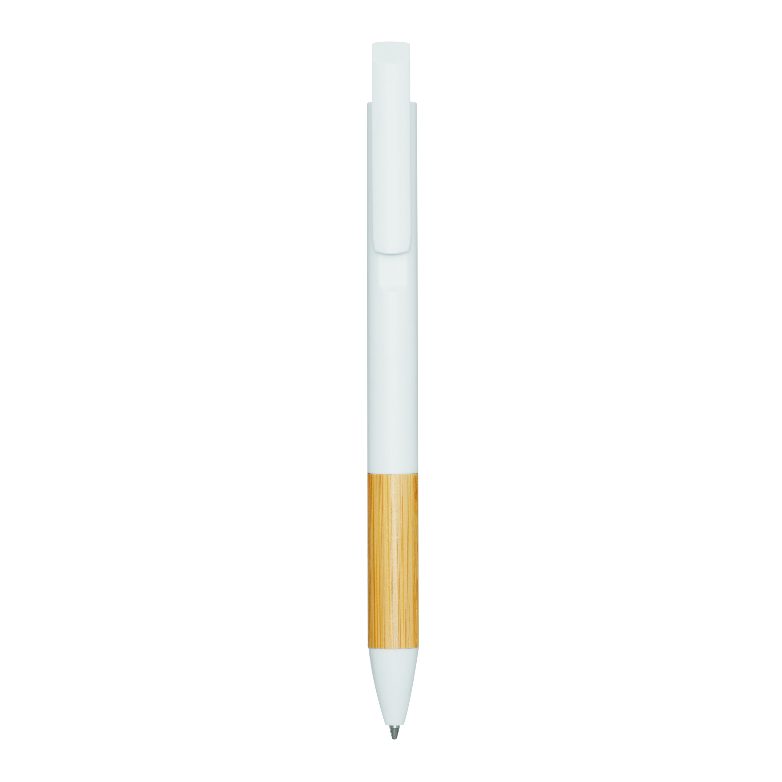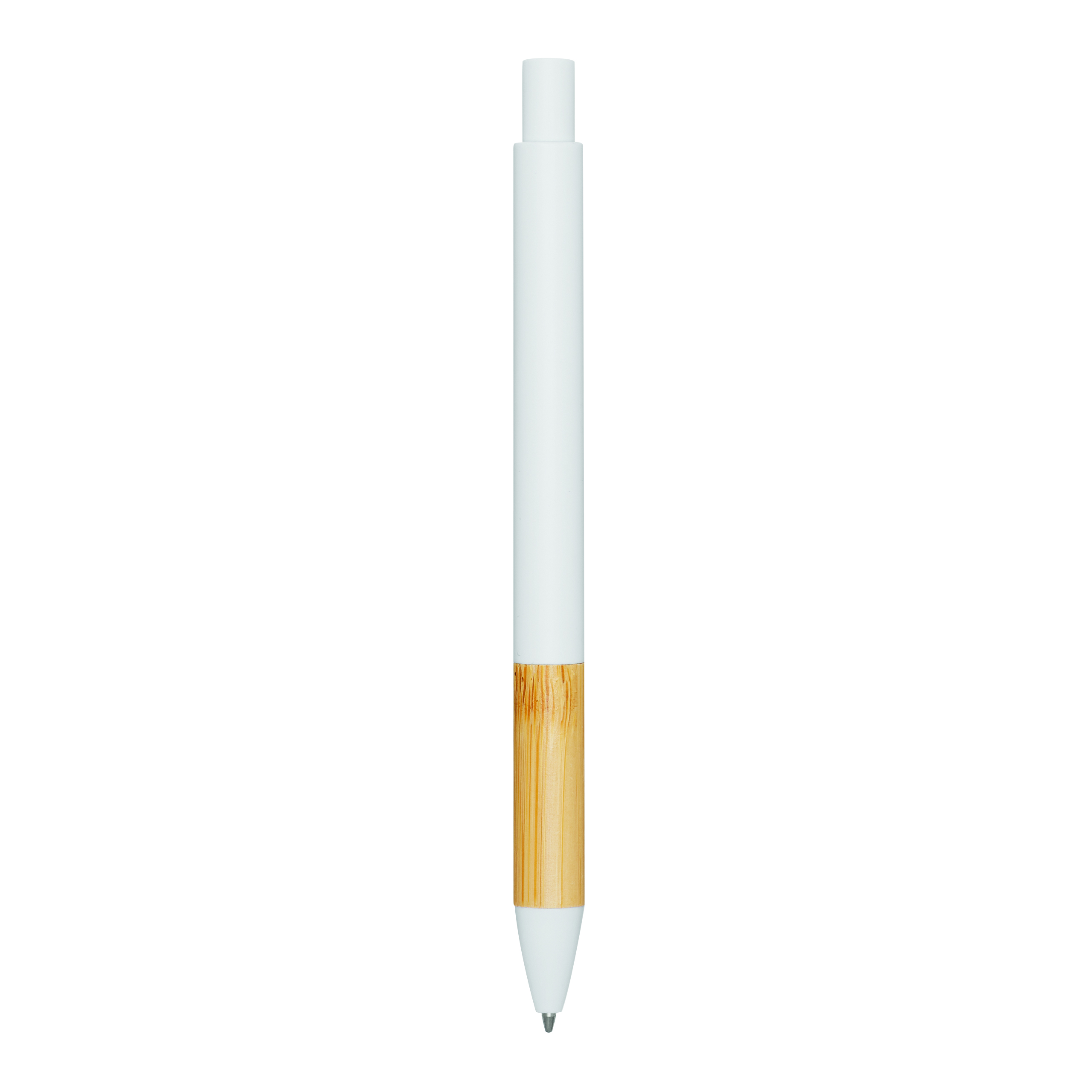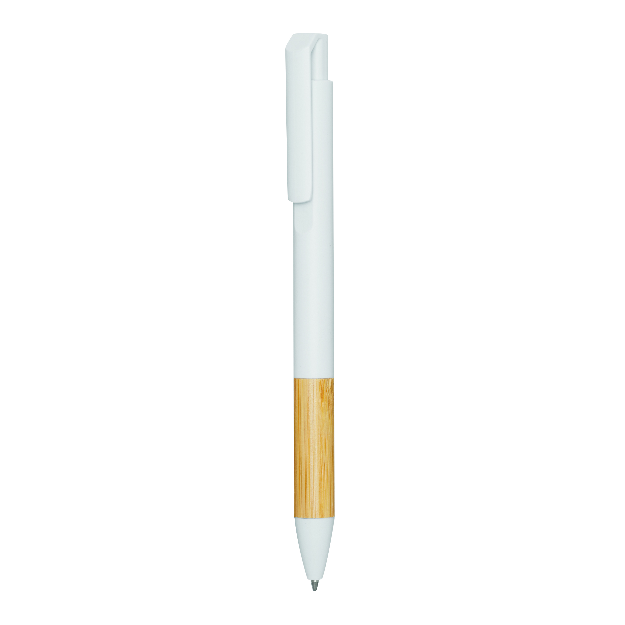 Długopis ANDANTE. Posiada korpus wykonany z plastiku pochodzącego z recyklingu, mechanizm typu push, lakierowany bambusowy uchwyt i niebieski tusz.