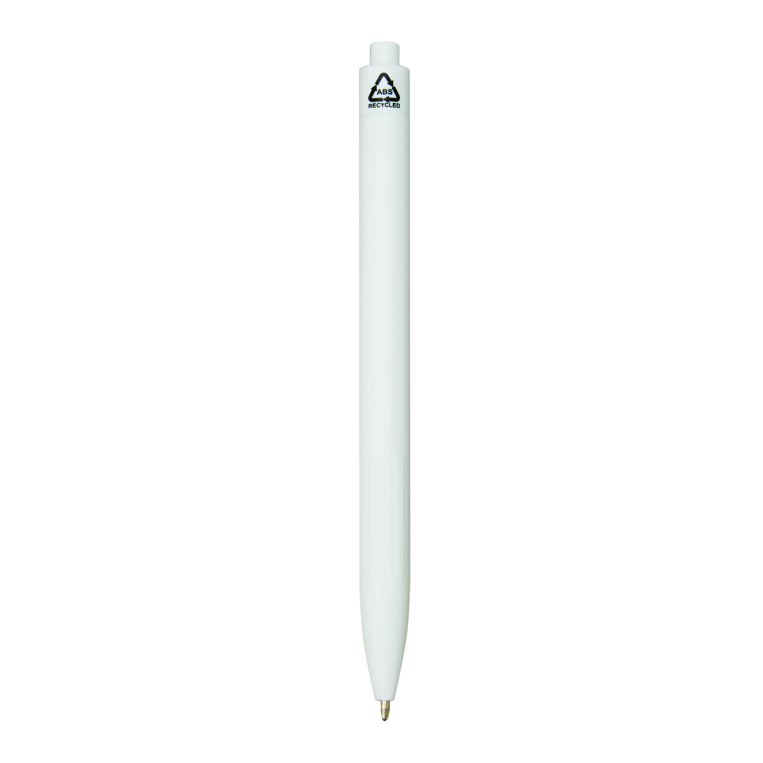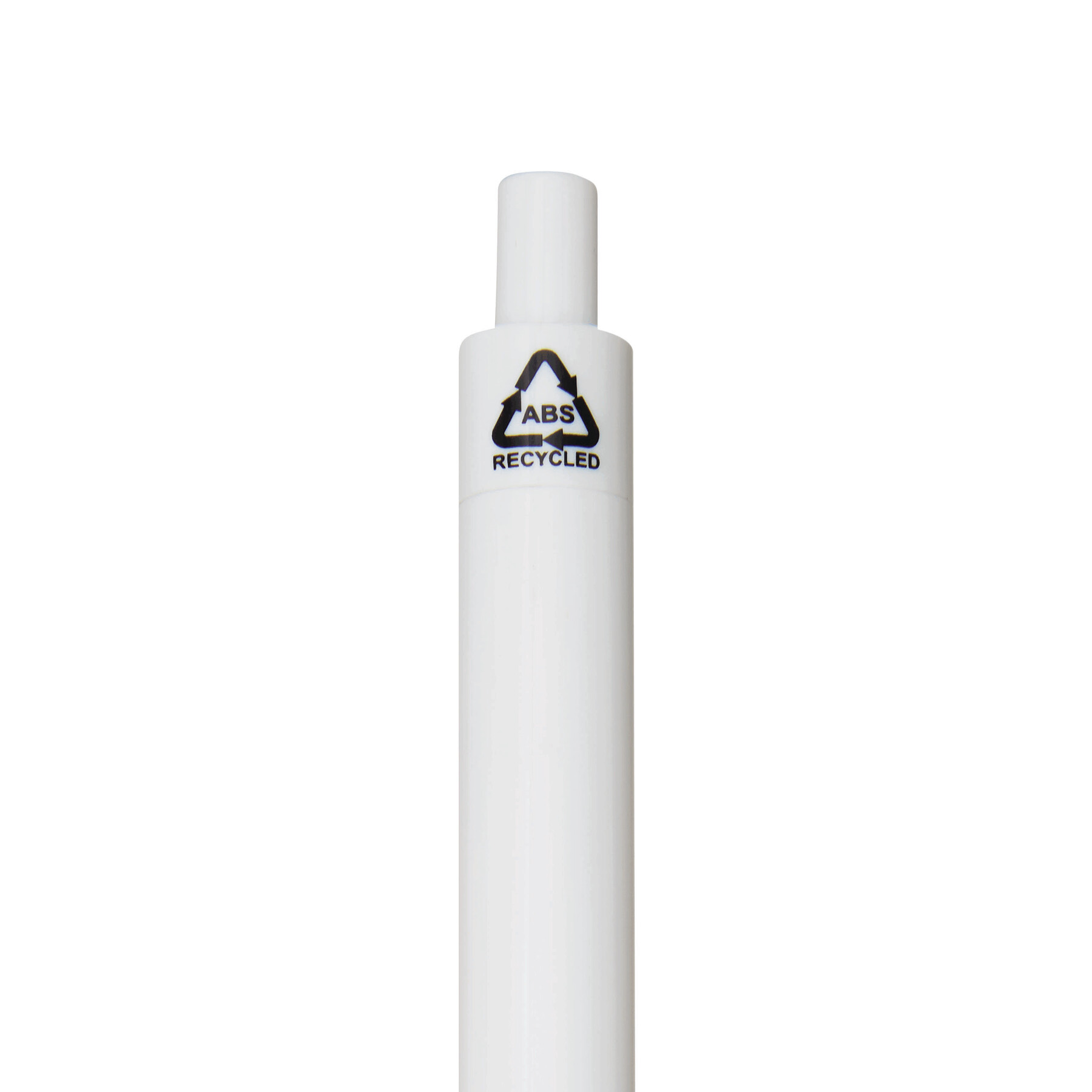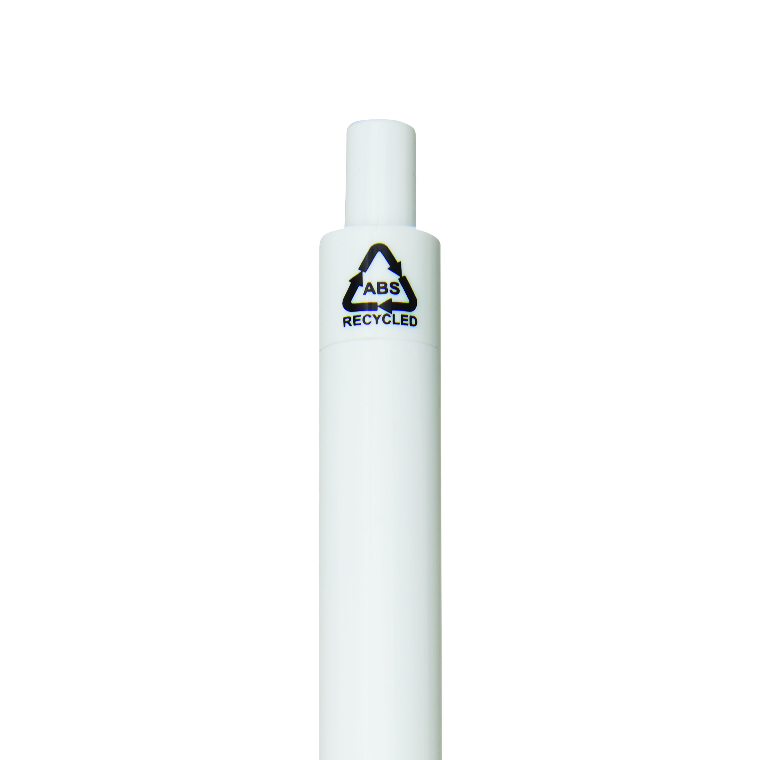 Długopis STACCATO. Korpus wykonany jest z plastiku z recyklingu. Posiada żłobioną strefę uchwytu, mechanizm naciskowy oraz niebieski tusz.