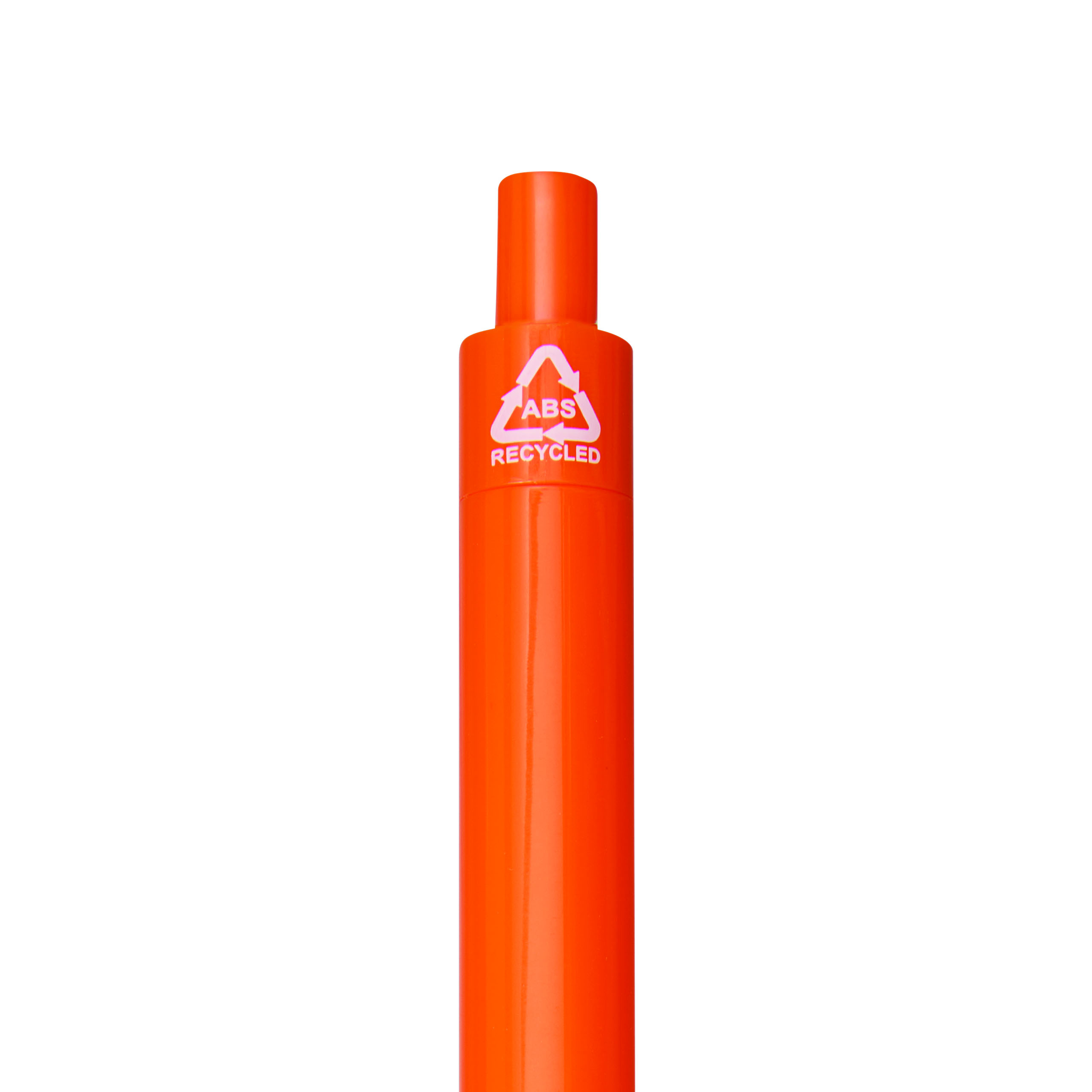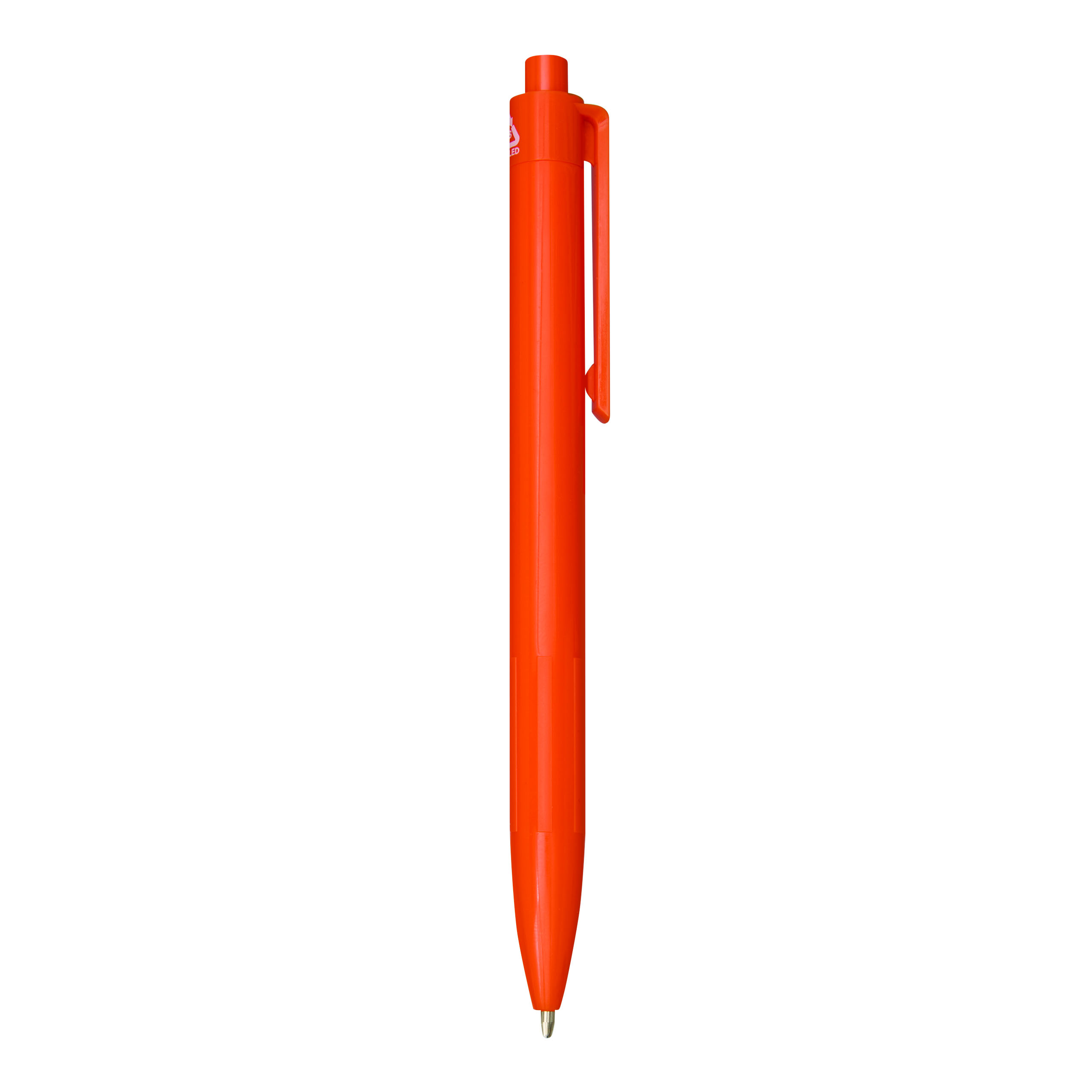 Długopis STACCATO. Korpus wykonany jest z plastiku z recyklingu. Posiada żłobioną strefę uchwytu, mechanizm naciskowy oraz niebieski tusz.