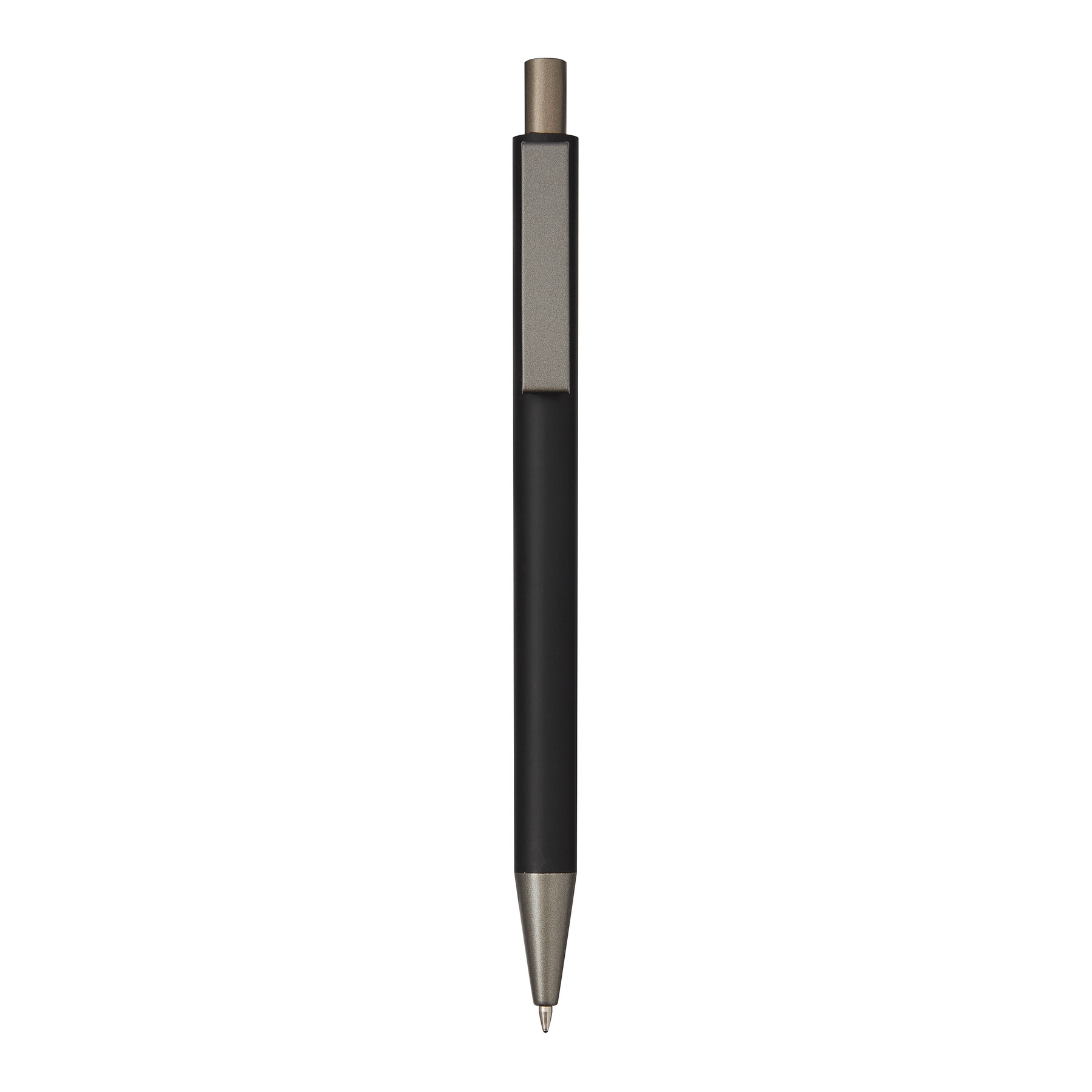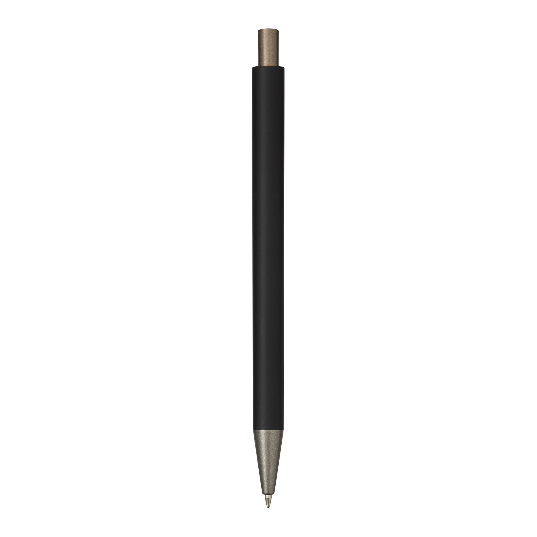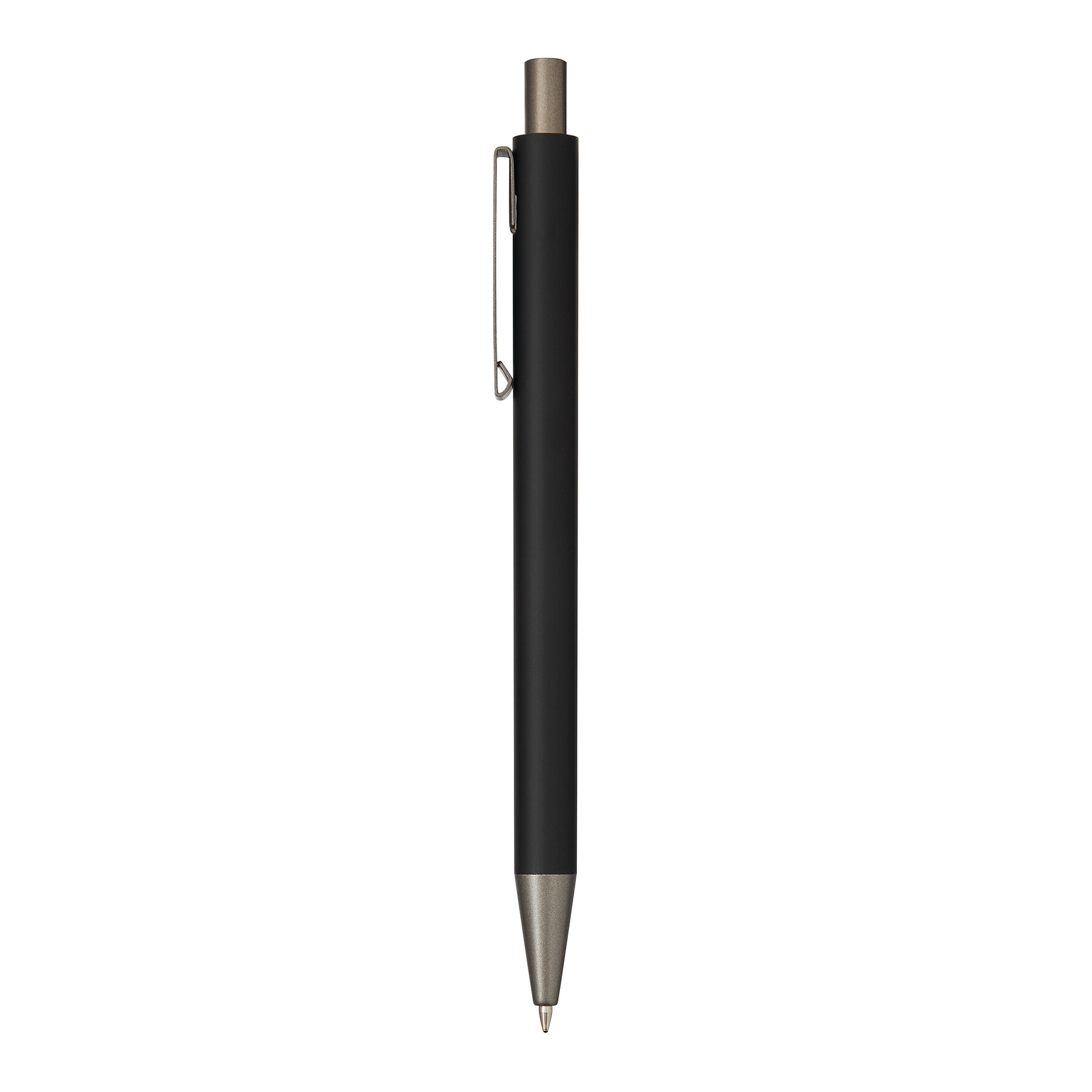 Aluminiowy długopis ALLEGRO. Ma matowy, metalowy korpus, mechanizm typu push, duży wkład z niebieskim tuszem.