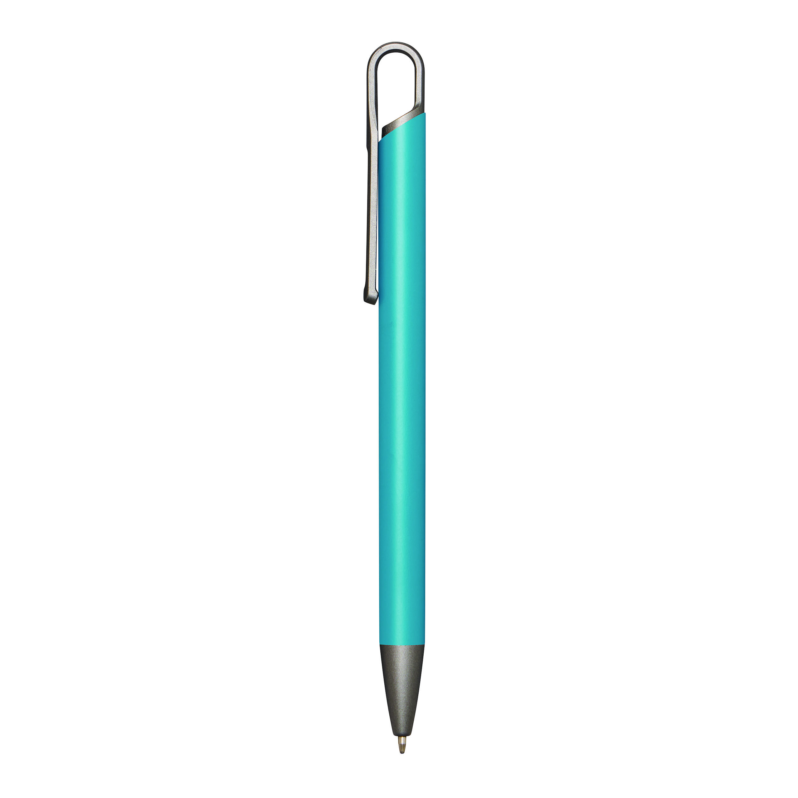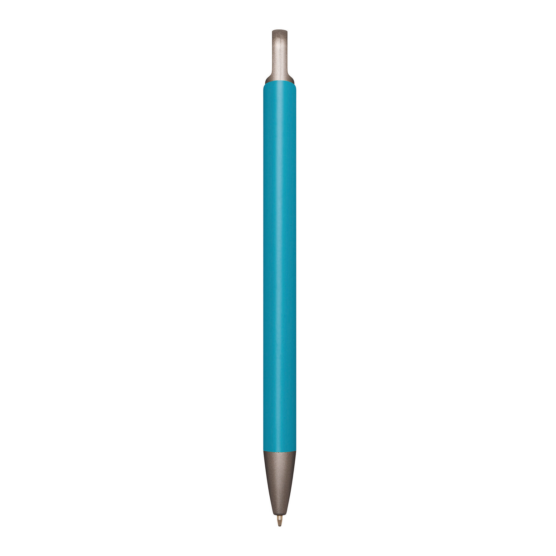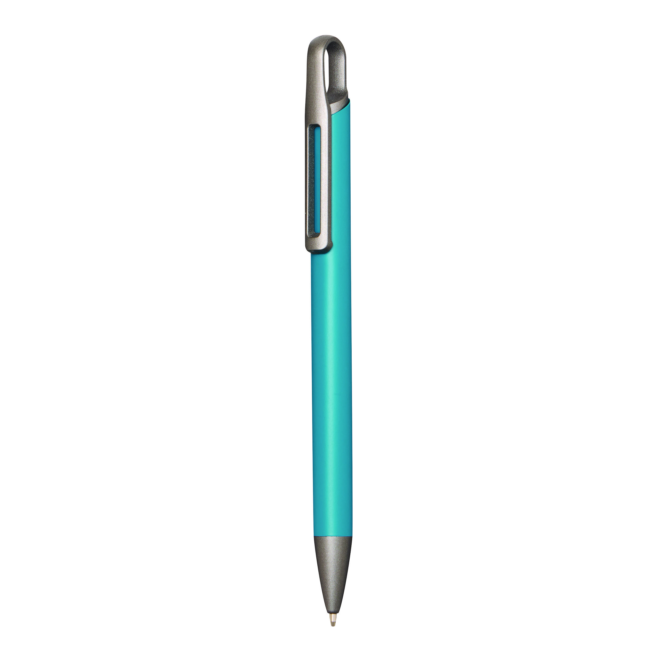 Aluminiowy długopis VIRAGIO. Ma matowy aluminiowy korpus, mechanizm typu push i niebieski tusz.
