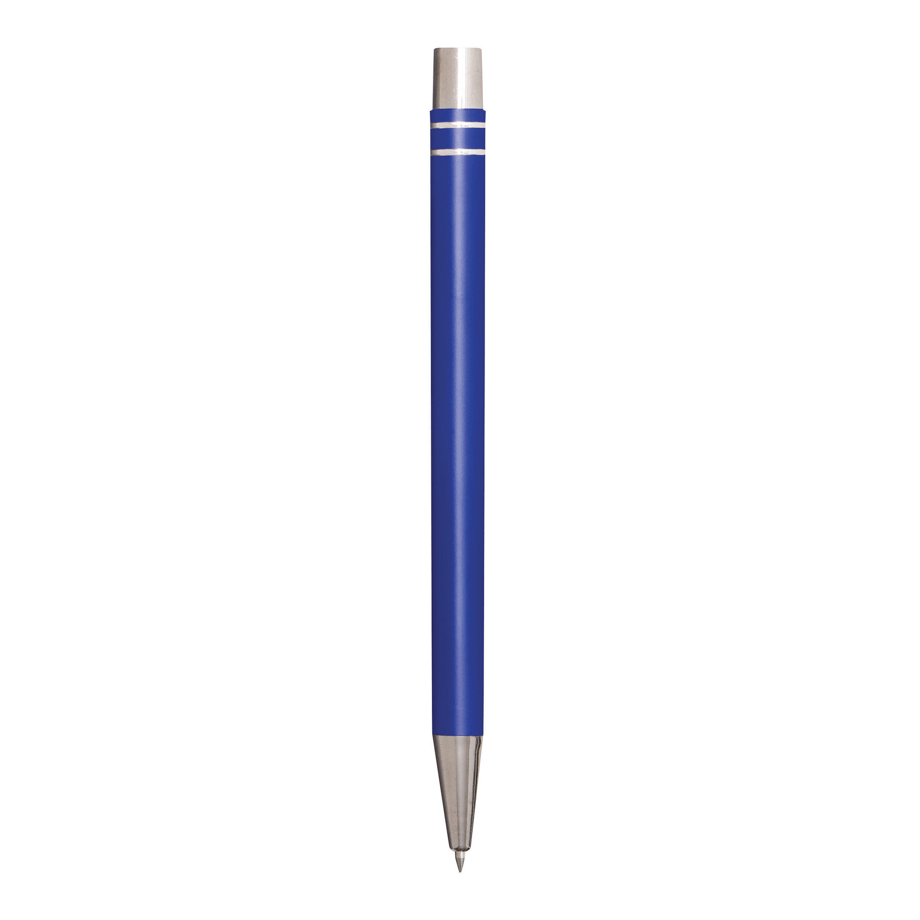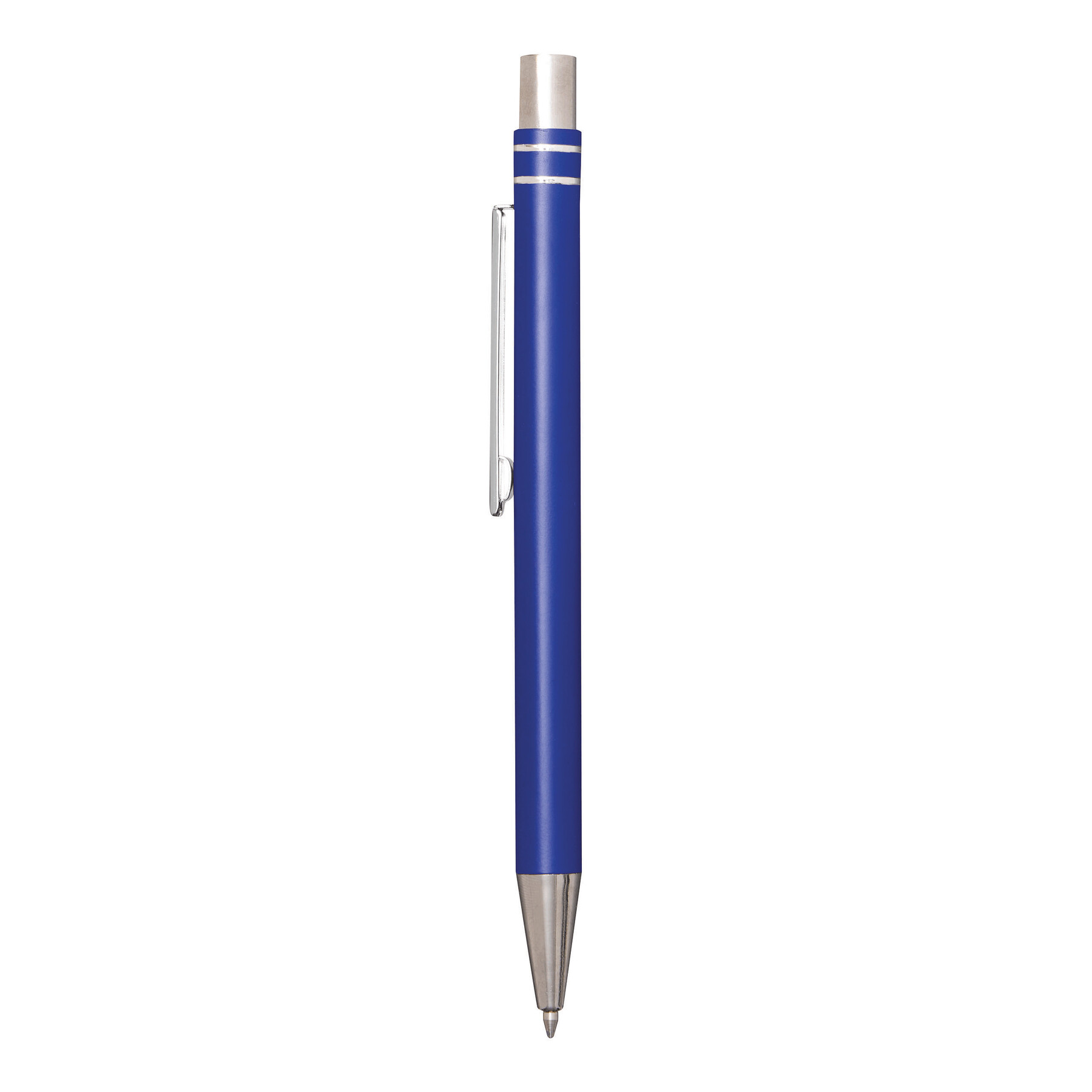 Długopis żelowy aluminiowy ANNY. Ma matowy aluminiowy korpus, mechanizm typu push, wkład żelowy jumbo i niebieski tusz.