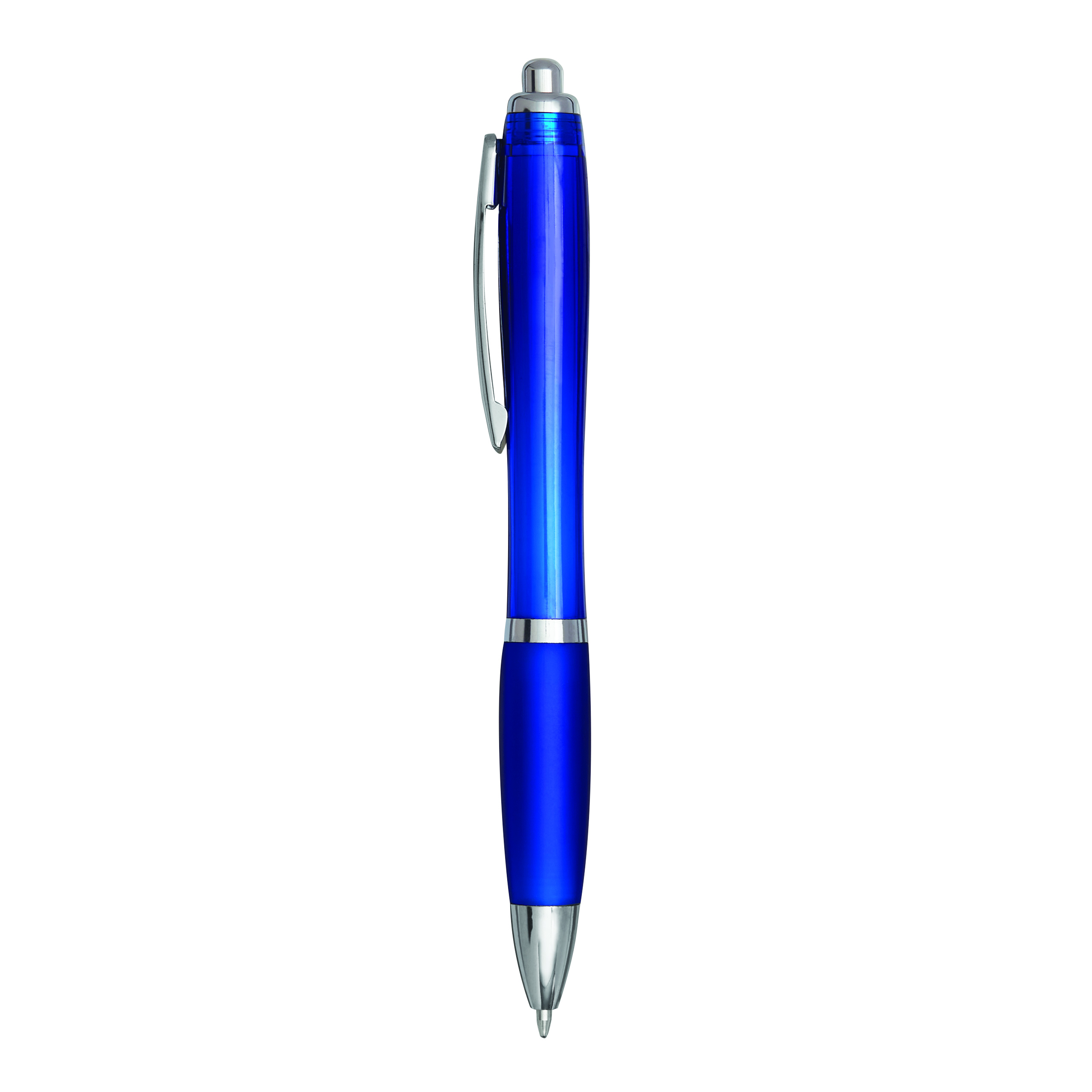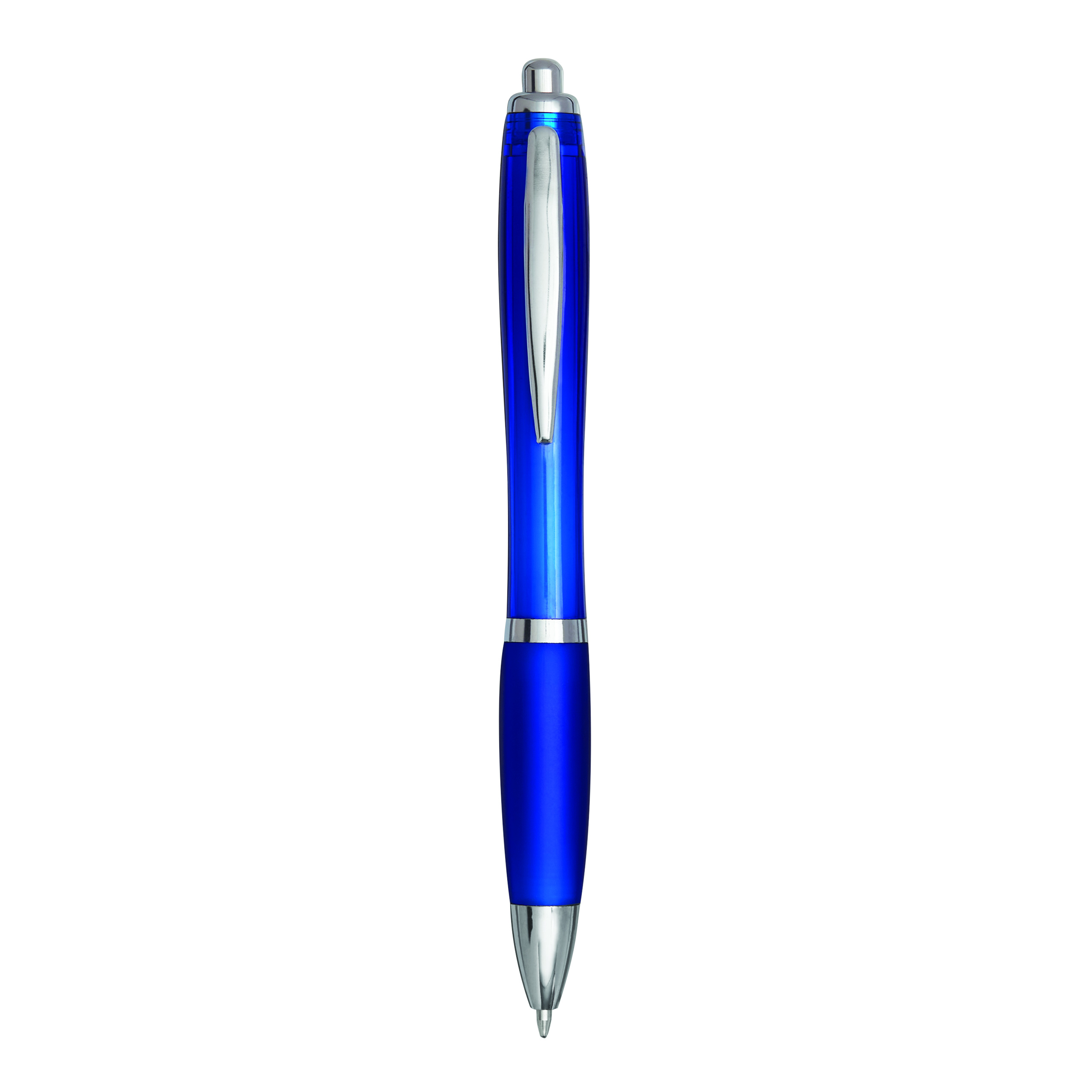 Długopis SWAYRABS. Ma zakrzywiony korpus wykonany z tworzywa sztucznego pochodzącego z recyklingu, gumowany uchwyt, mechanizm typu push, wkład jumbo i niebieski tusz.
