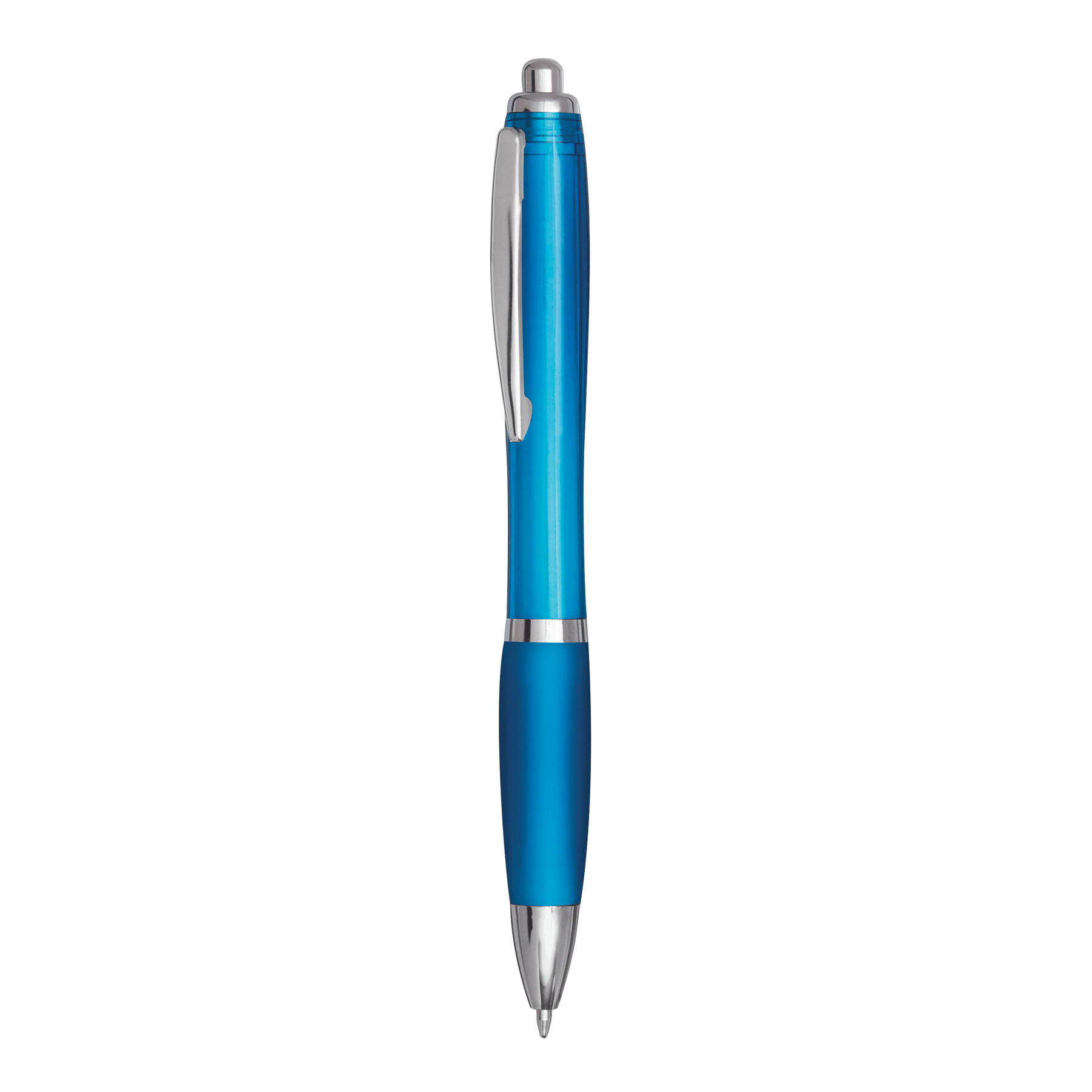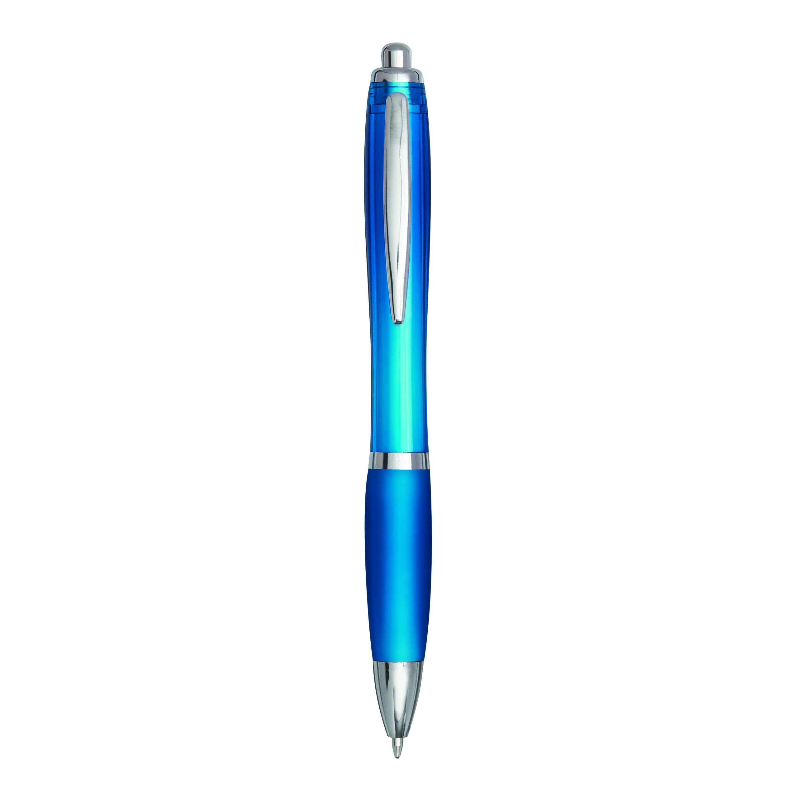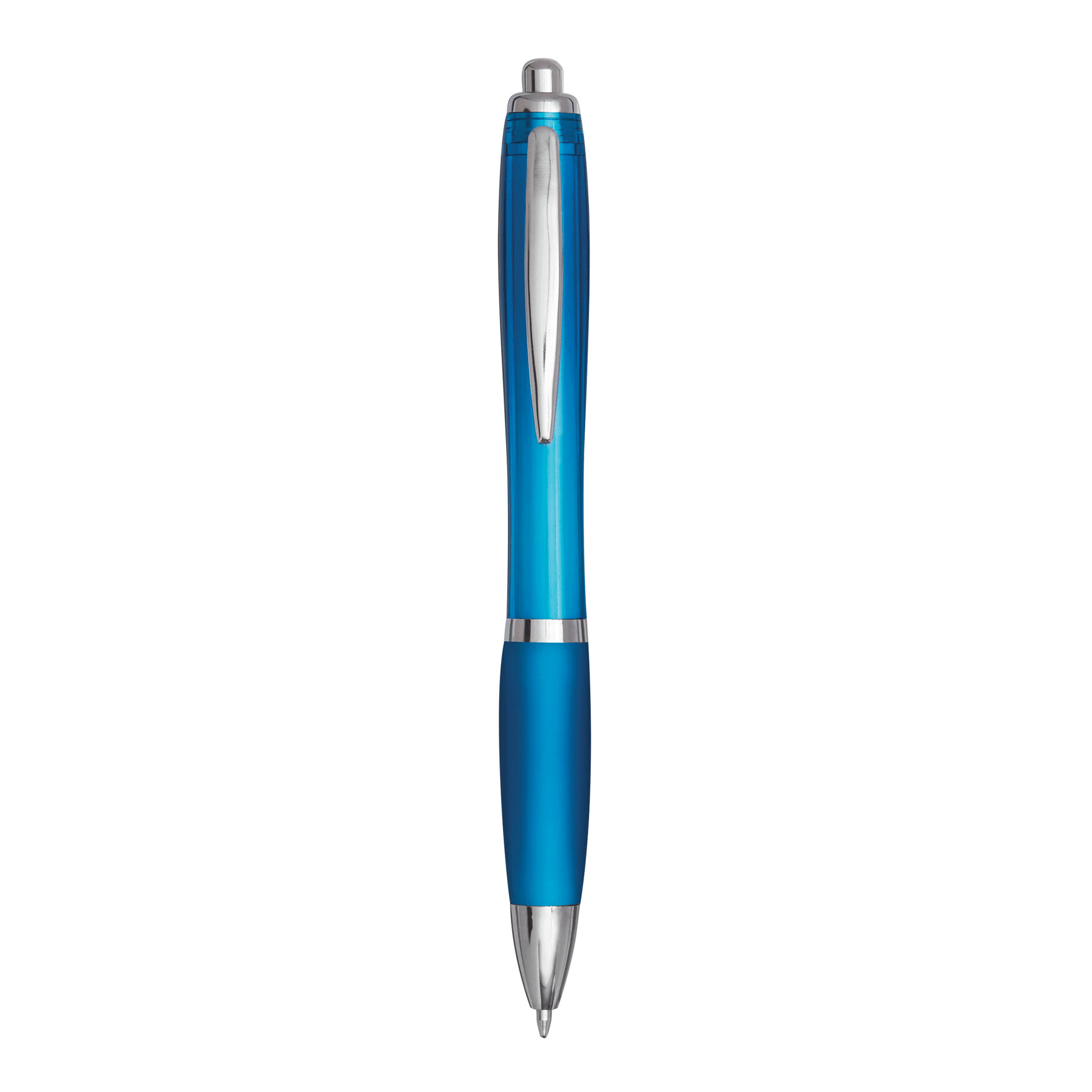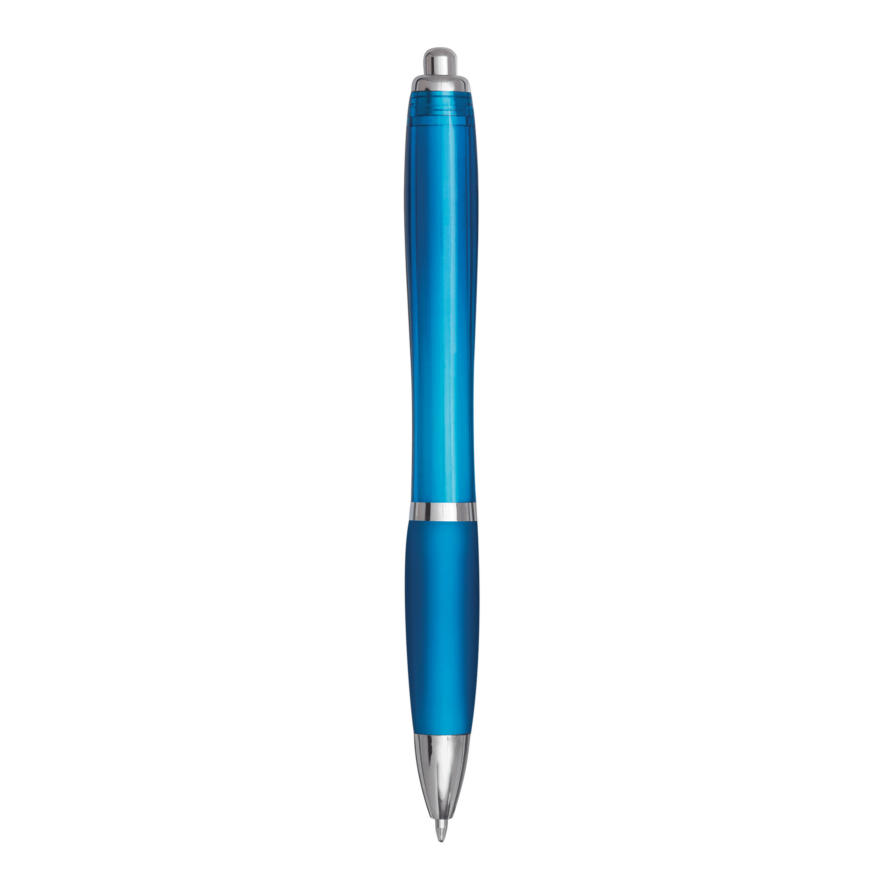 Długopis SWAYRABS. Ma zakrzywiony korpus wykonany z tworzywa sztucznego pochodzącego z recyklingu, gumowany uchwyt, mechanizm typu push, wkład jumbo i niebieski tusz.