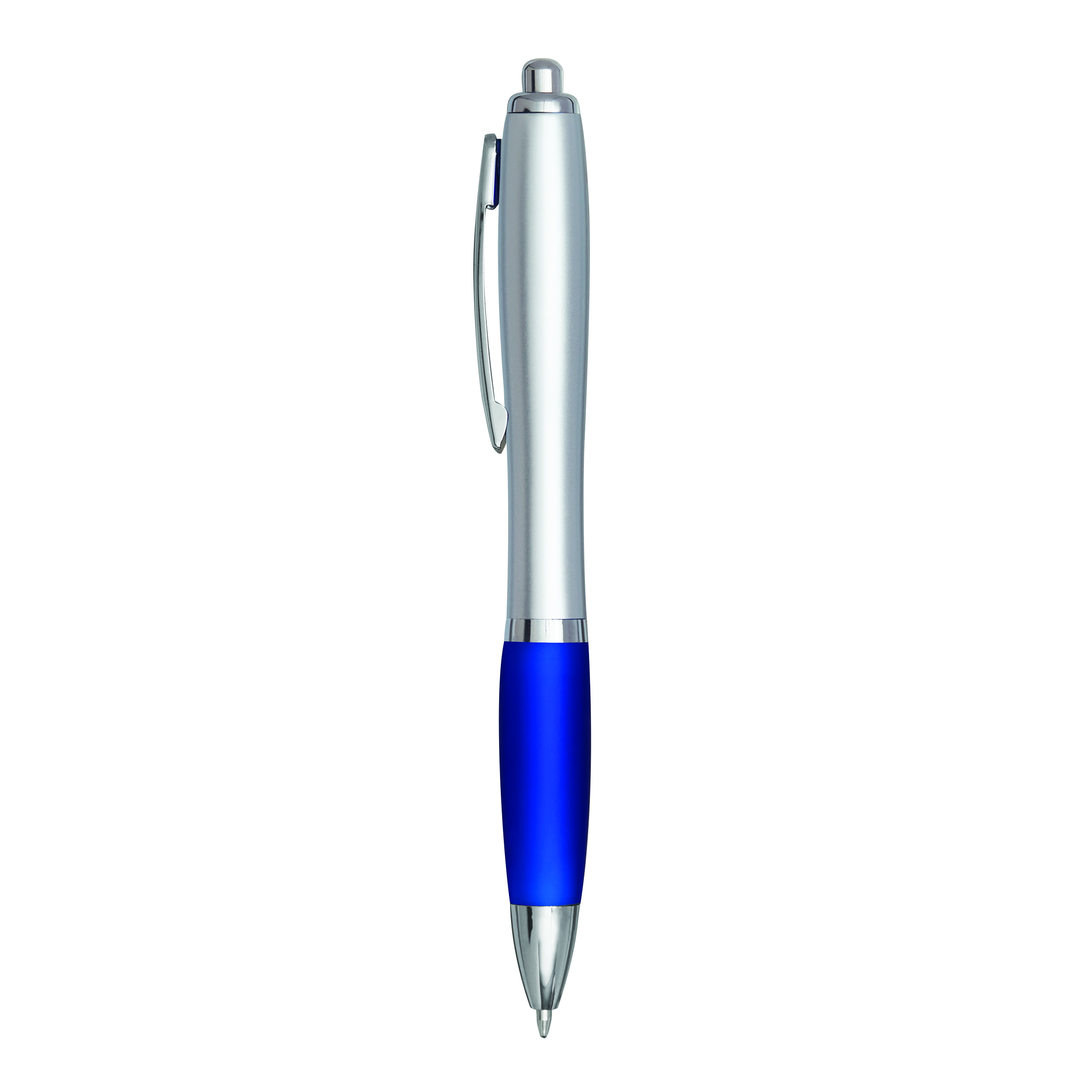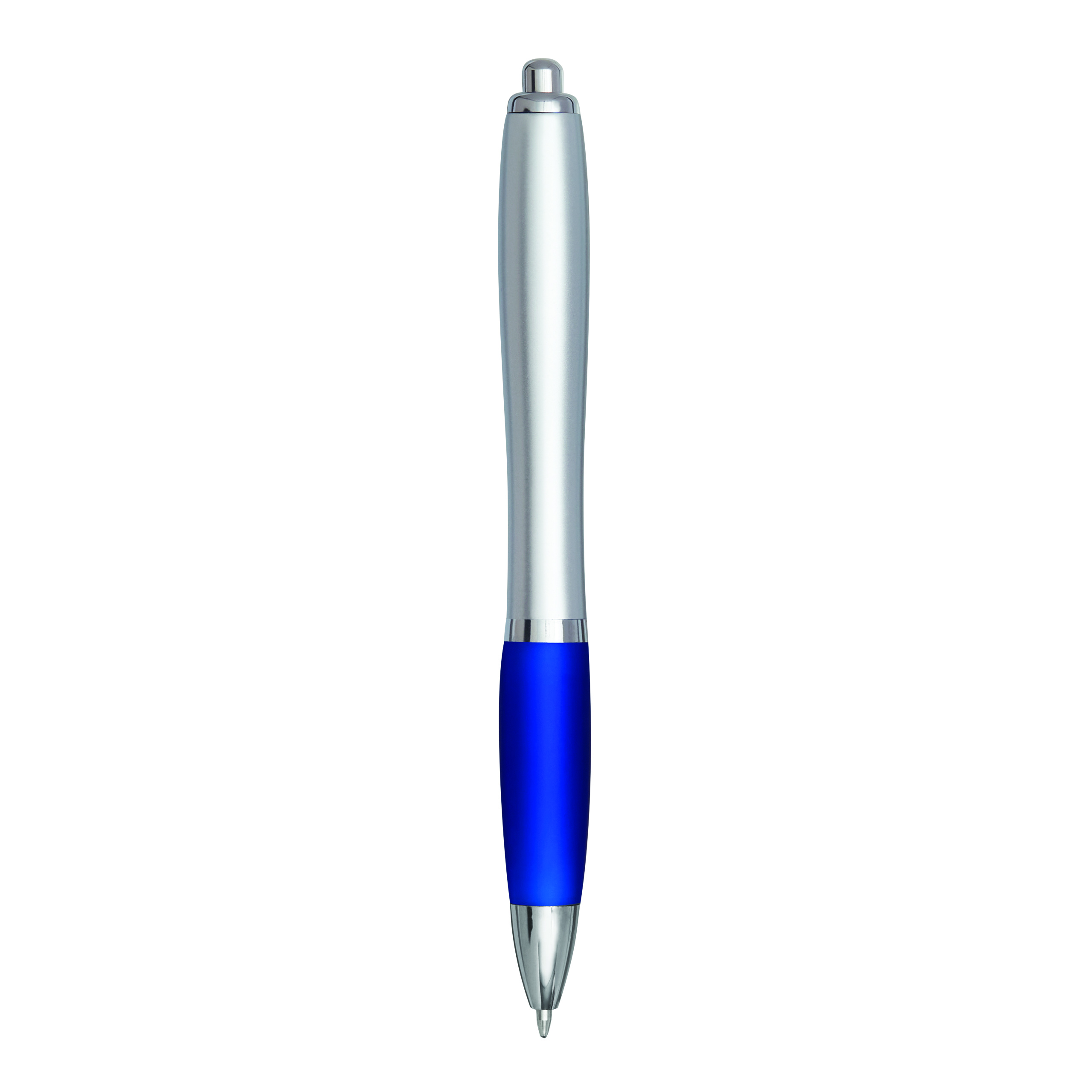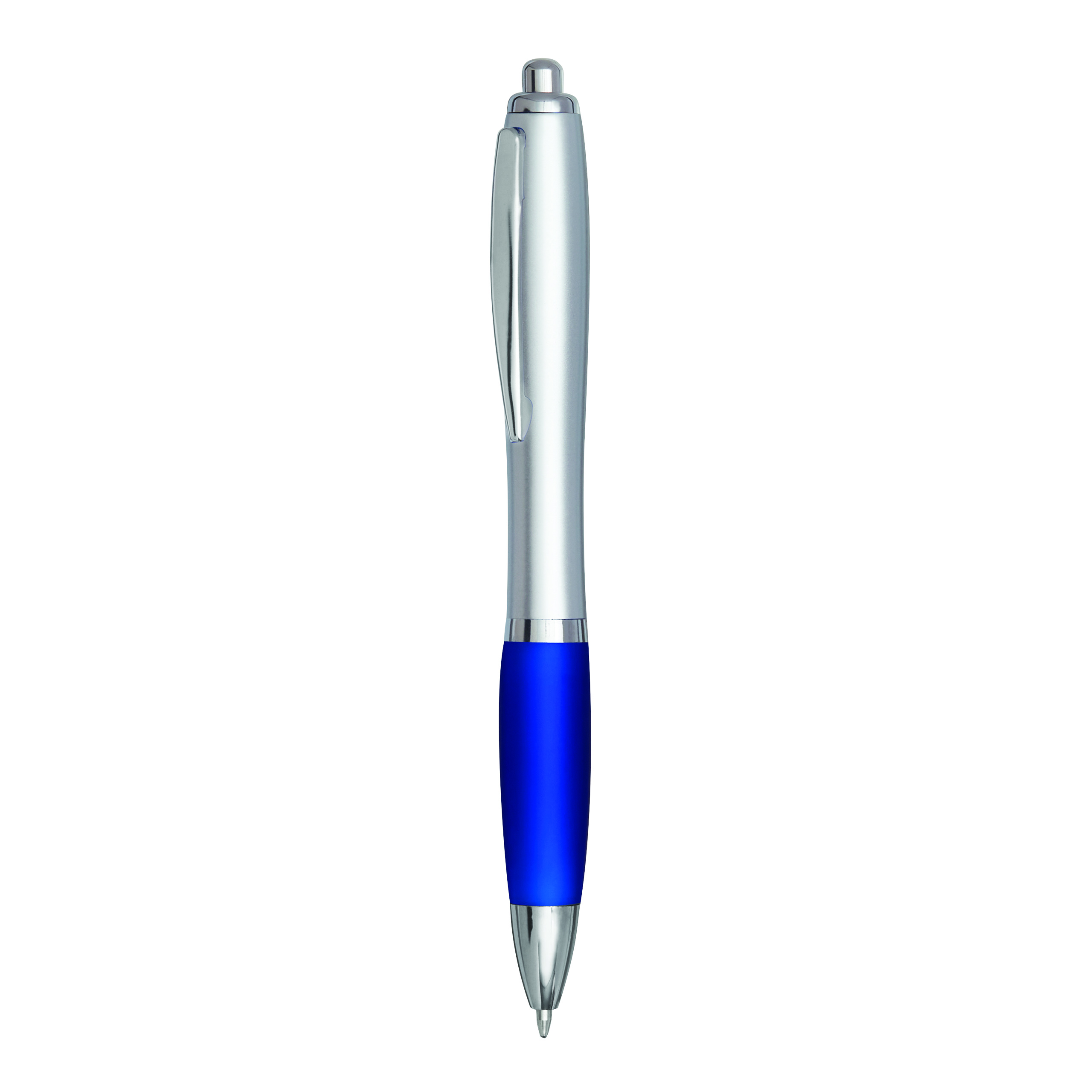 Długopis SWAYRABS. Ma zakrzywiony korpus wykonany z tworzywa sztucznego pochodzącego z recyklingu, gumowany uchwyt, mechanizm typu push, wkład jumbo i niebieski tusz.