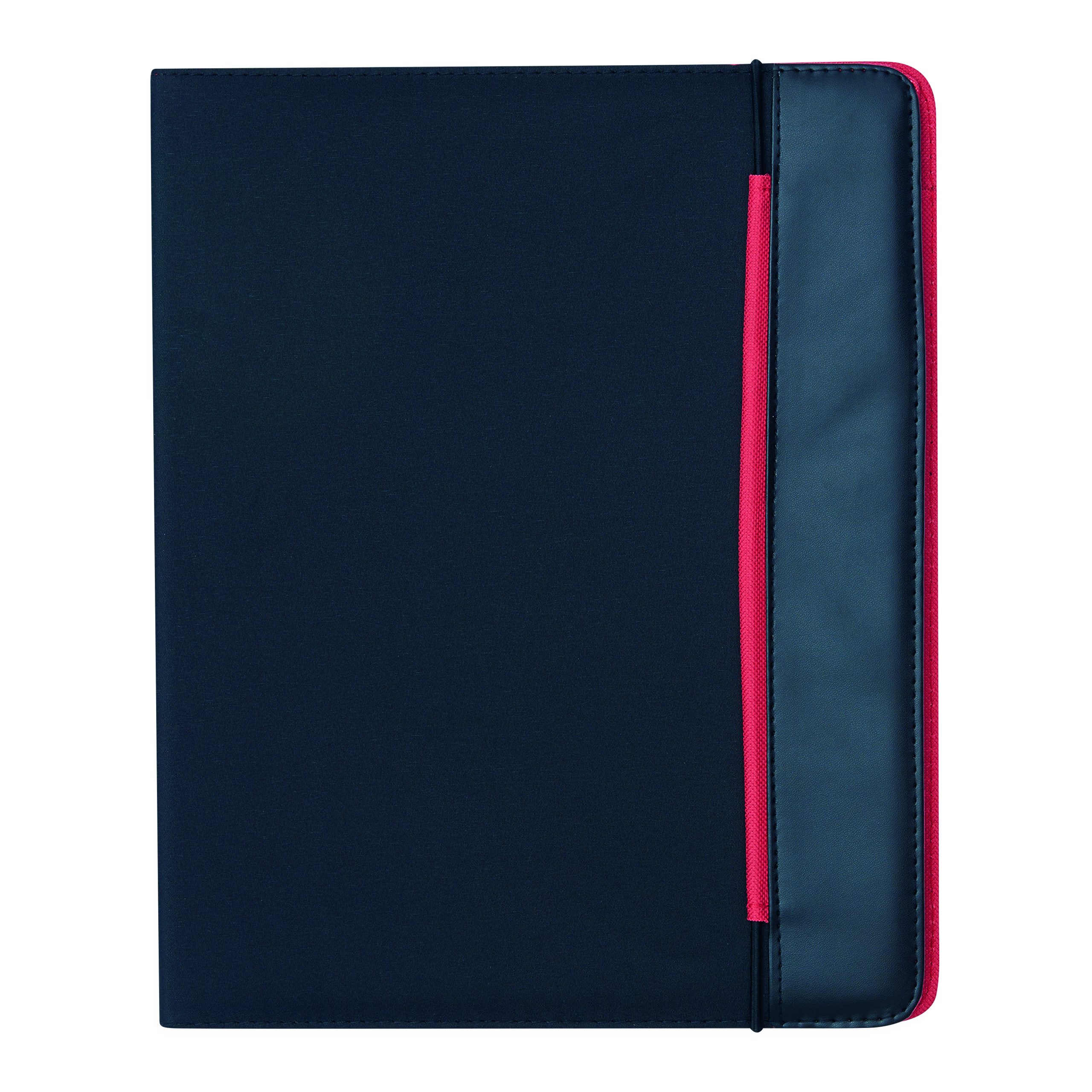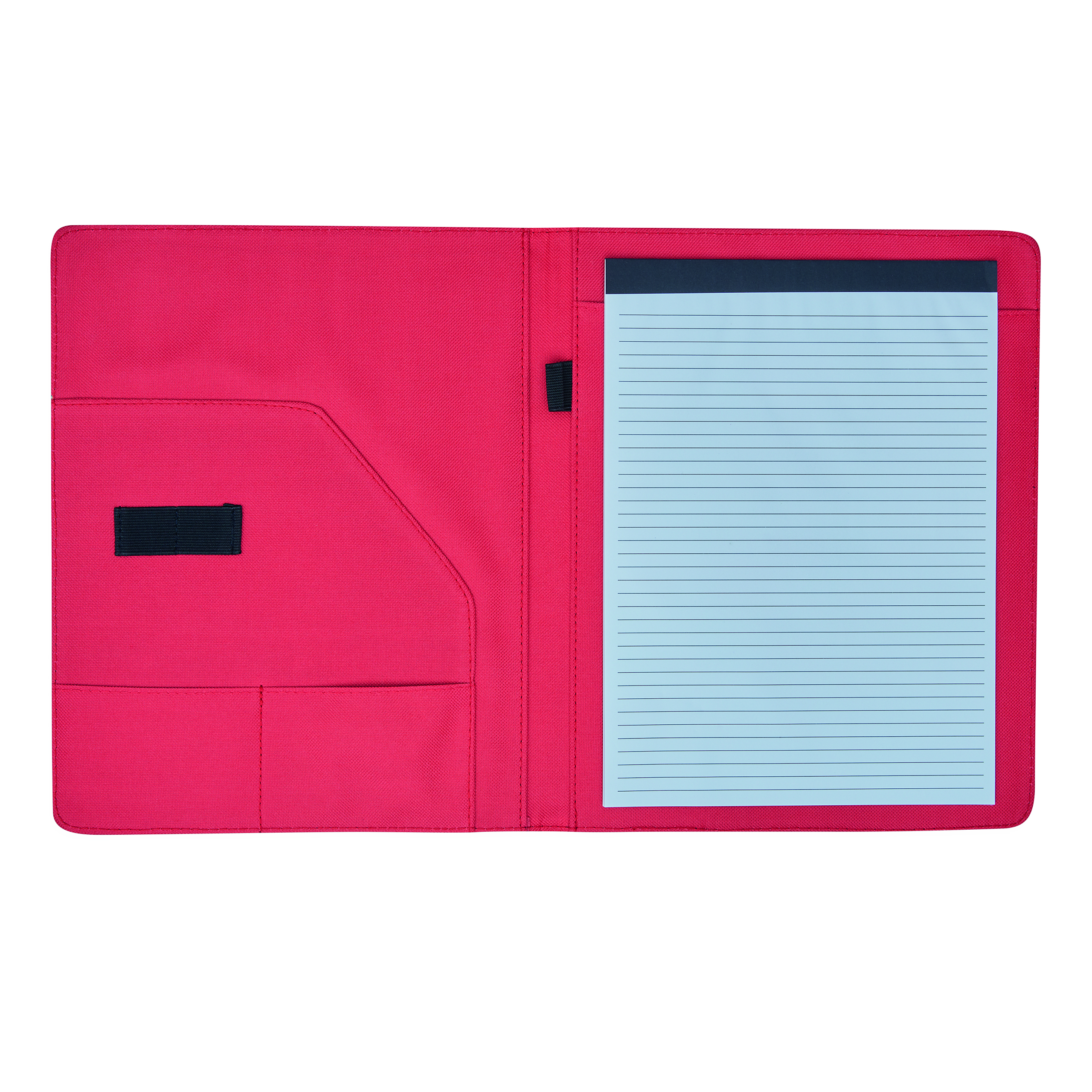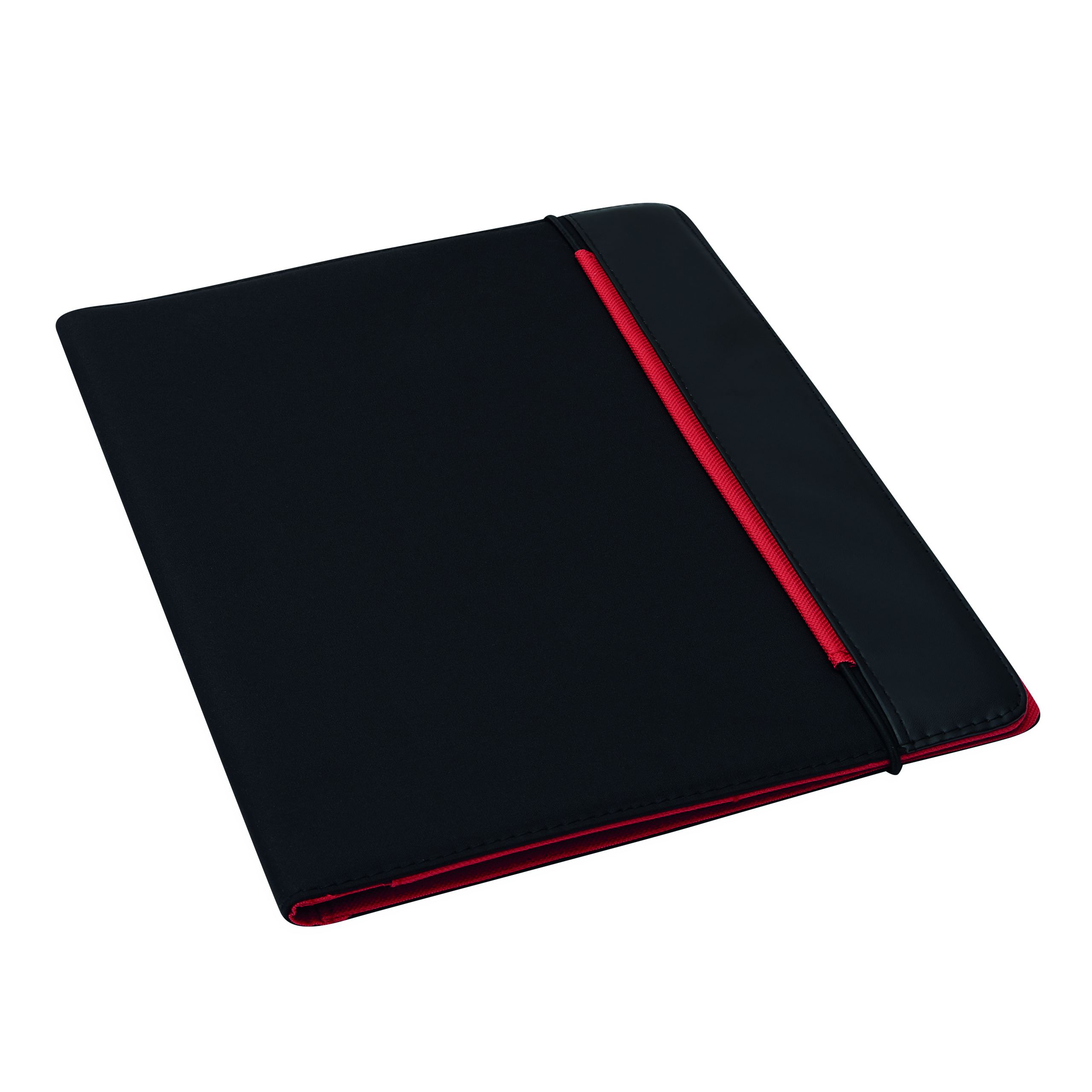 Portfolio YOUNG STAR w formacie A4, z notesem, wsuwanymi kieszonkami, pętelkami na długopis i inne akcesoria, zamykane gumką, na zewnątrz czarne, w środku kolorowe.