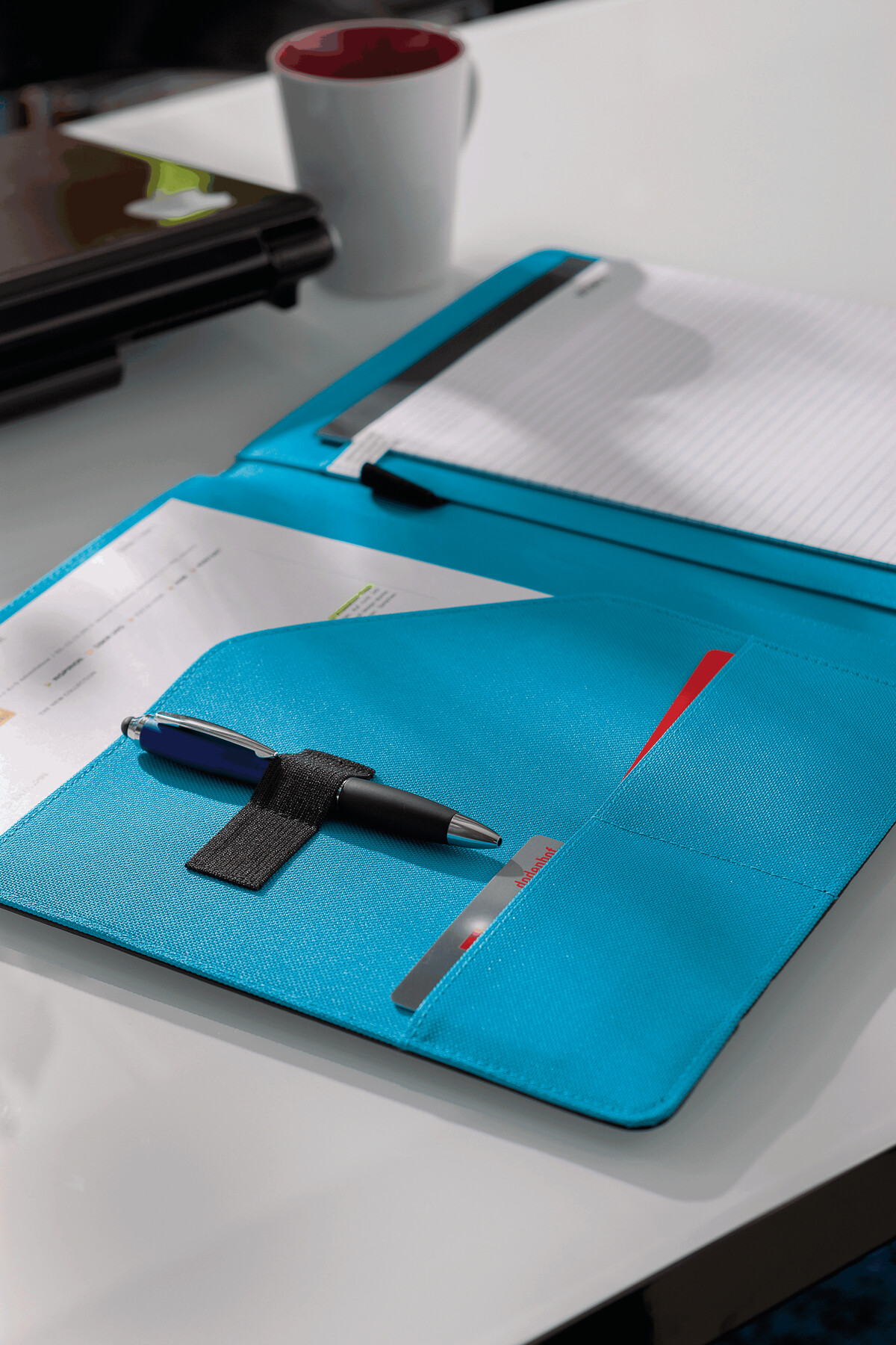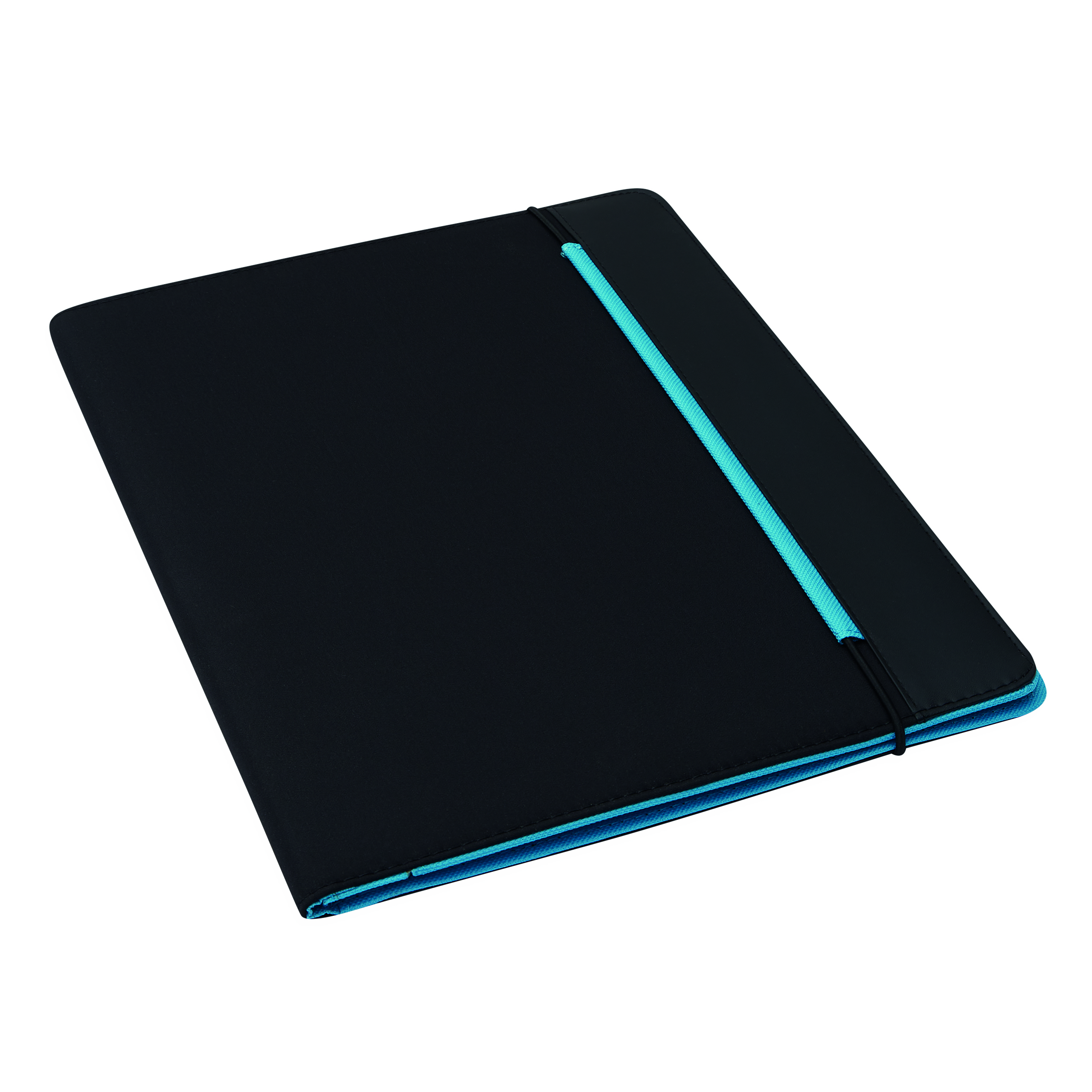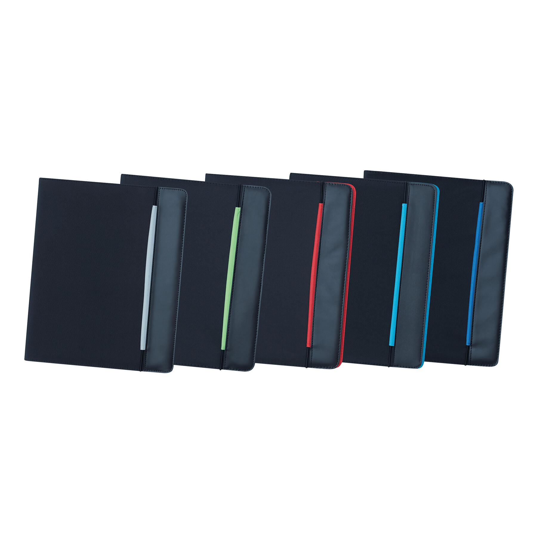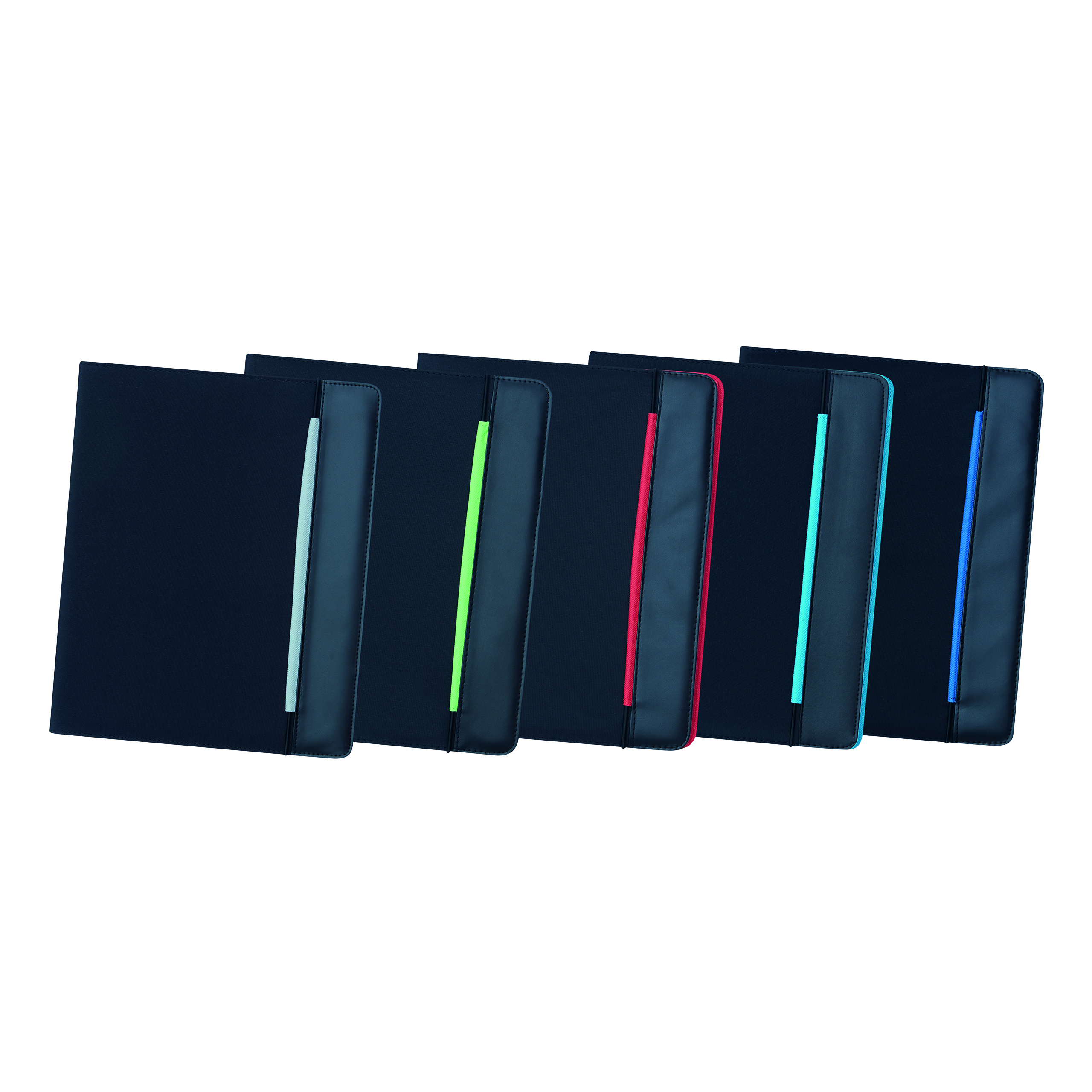 Portfolio YOUNG STAR w formacie A4, z notesem, wsuwanymi kieszonkami, pętelkami na długopis i inne akcesoria, zamykane gumką, na zewnątrz czarne, w środku kolorowe.