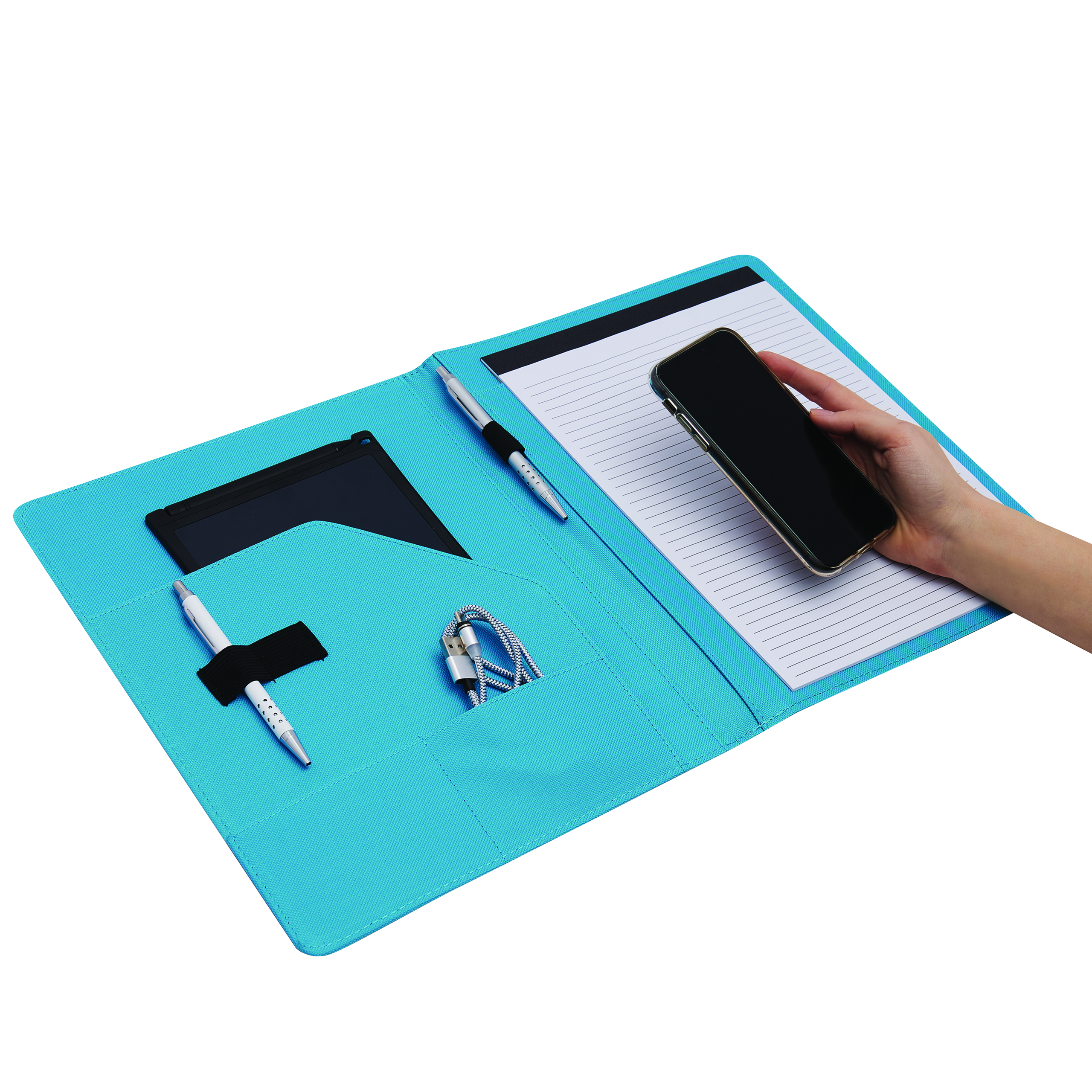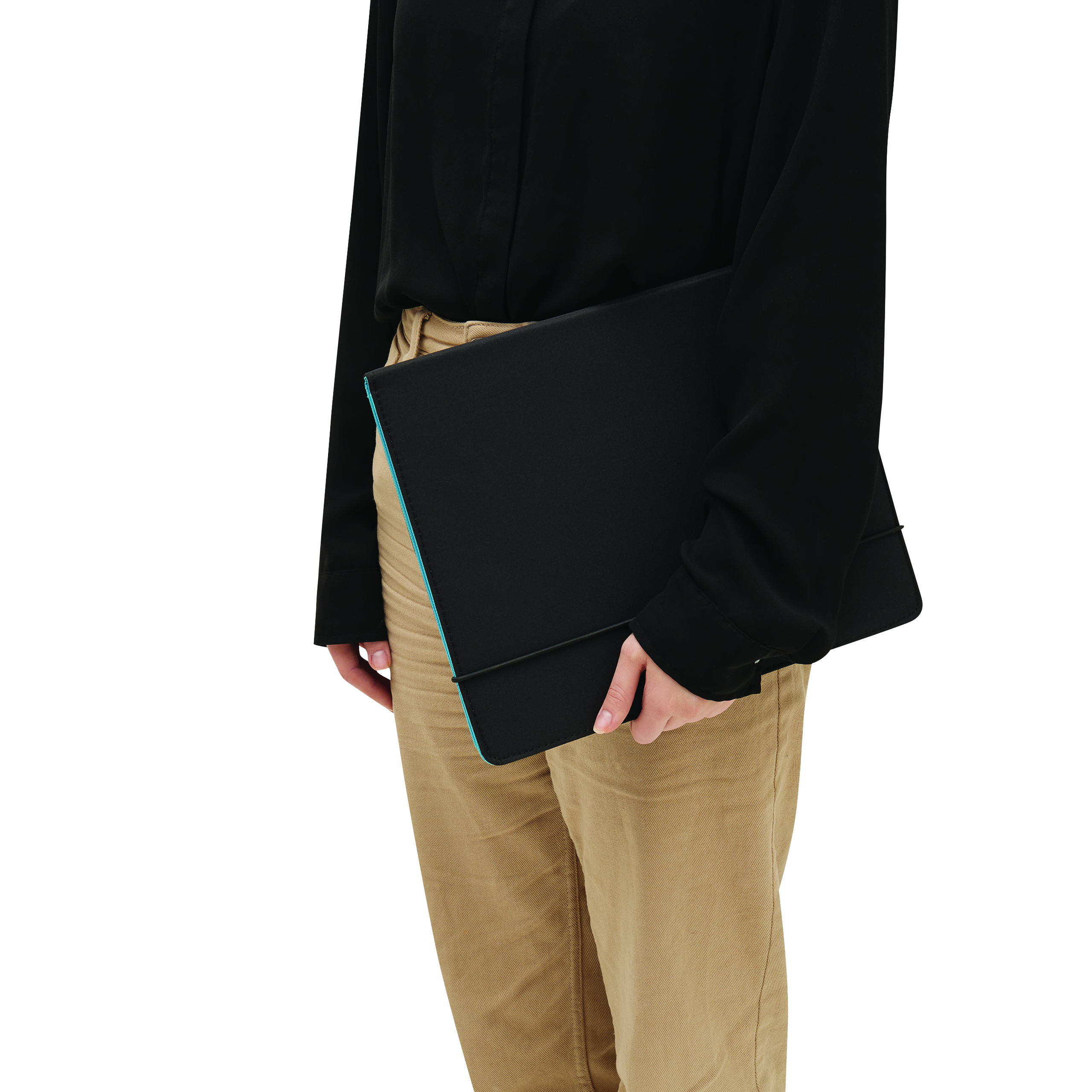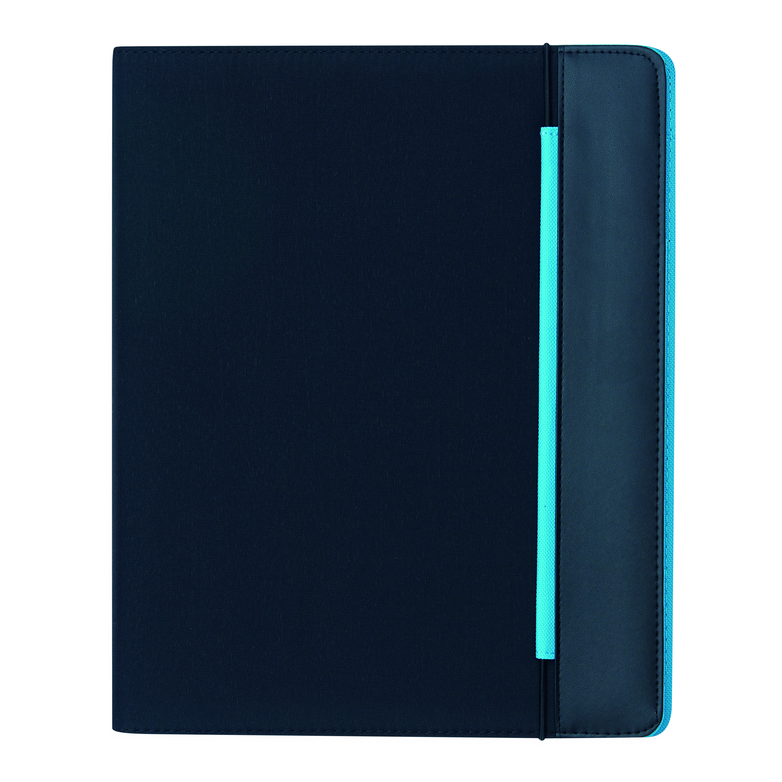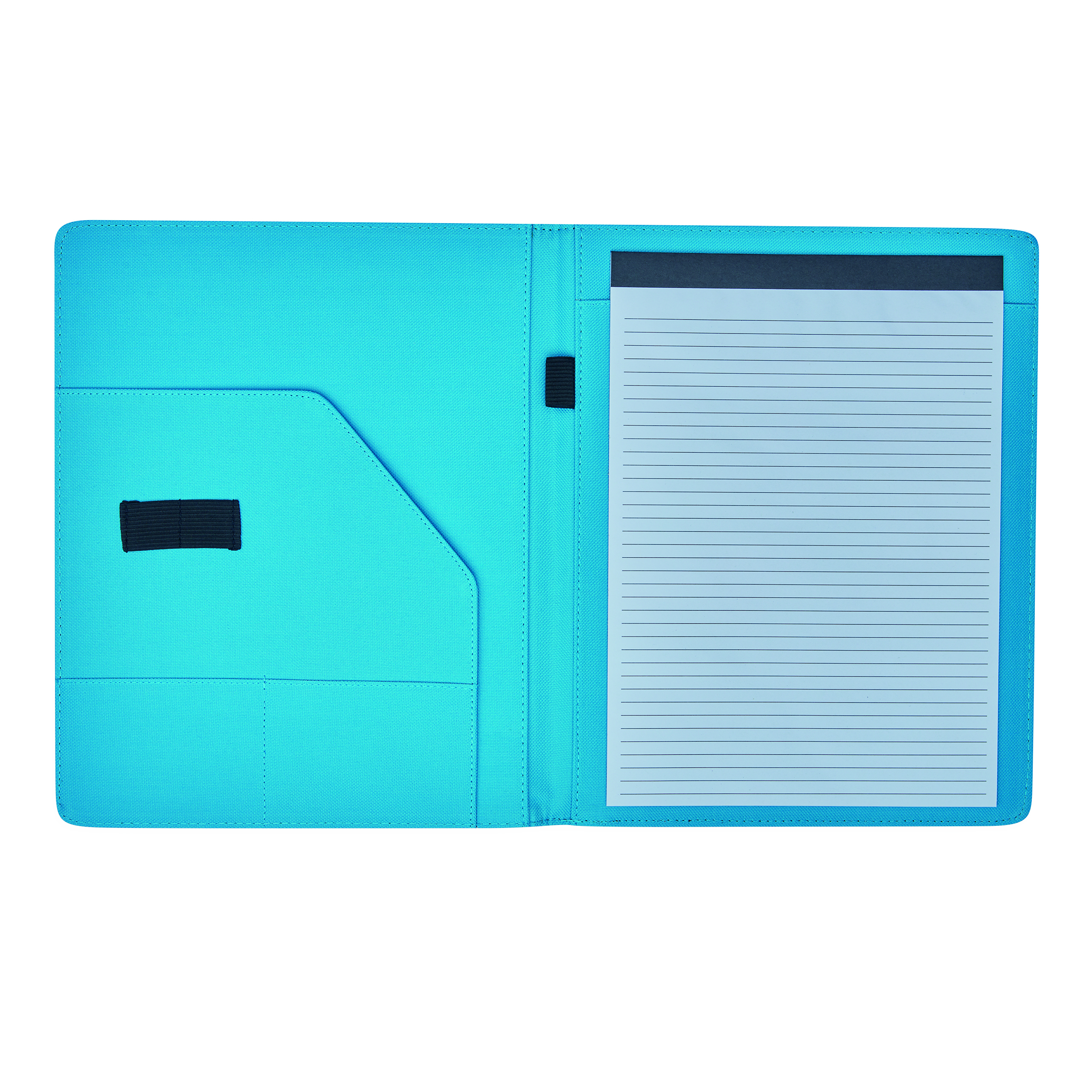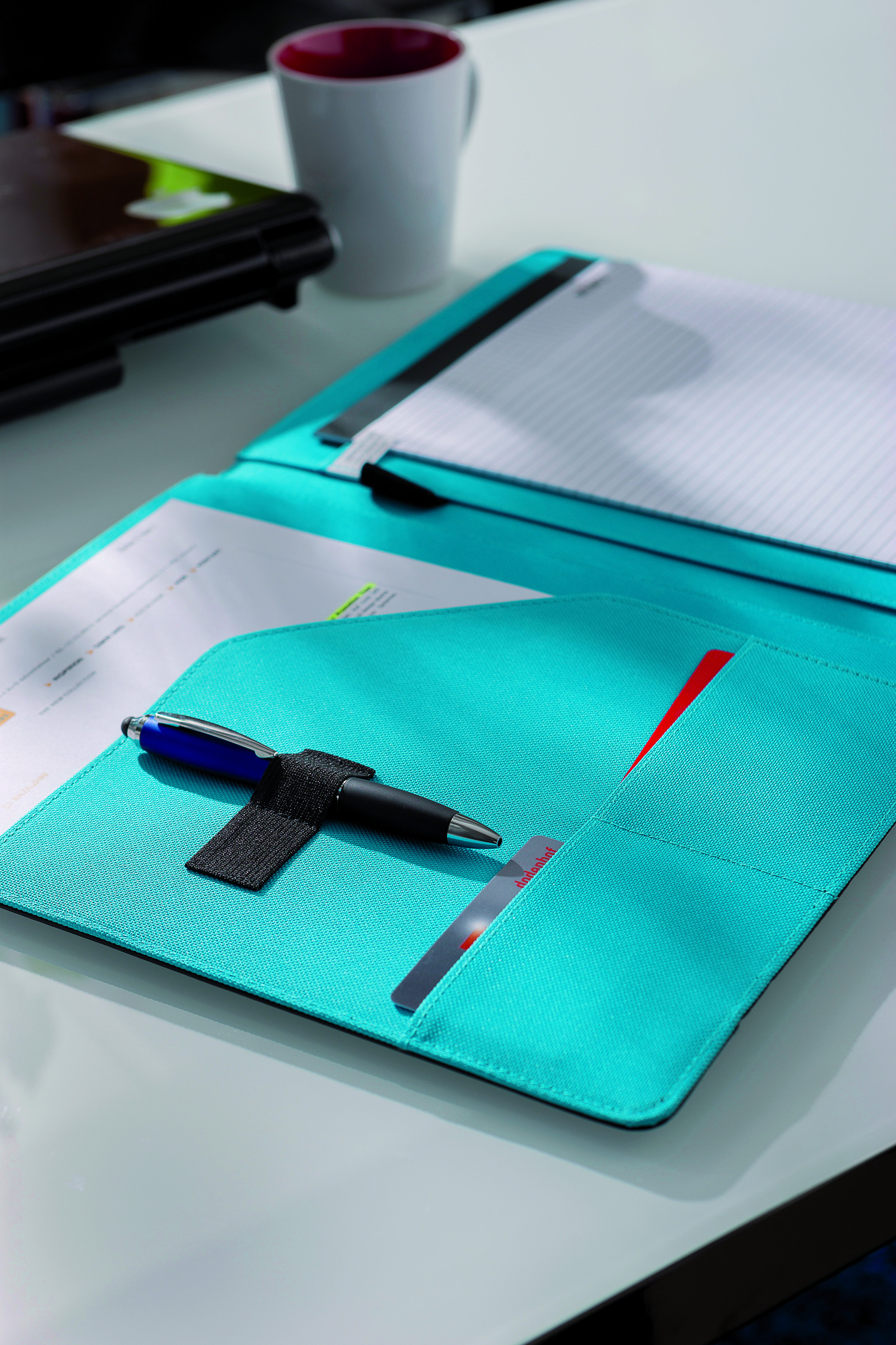 Portfolio YOUNG STAR w formacie A4, z notesem, wsuwanymi kieszonkami, pętelkami na długopis i inne akcesoria, zamykane gumką, na zewnątrz czarne, w środku kolorowe.