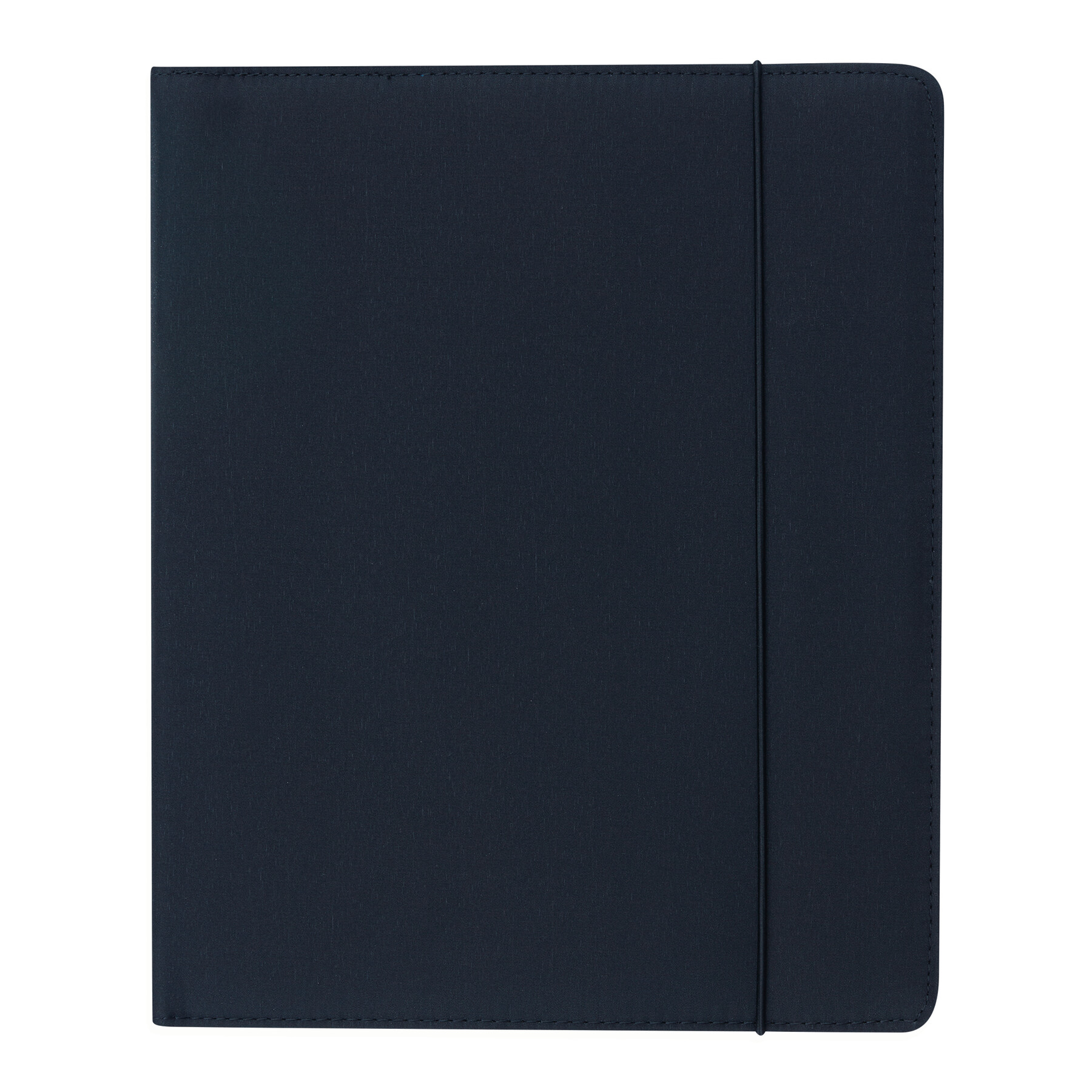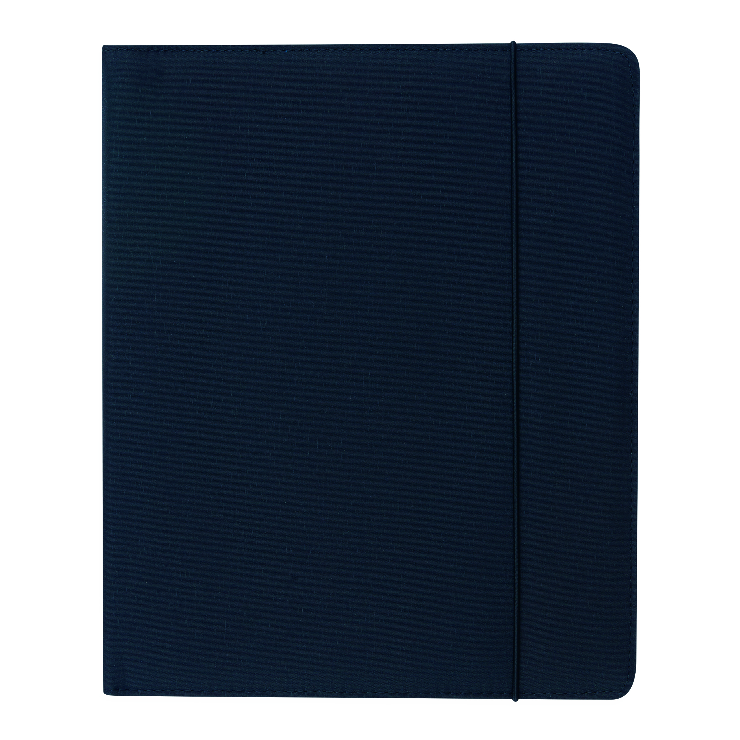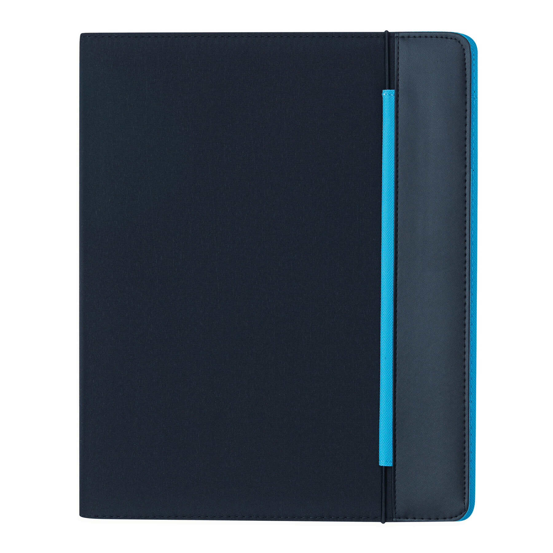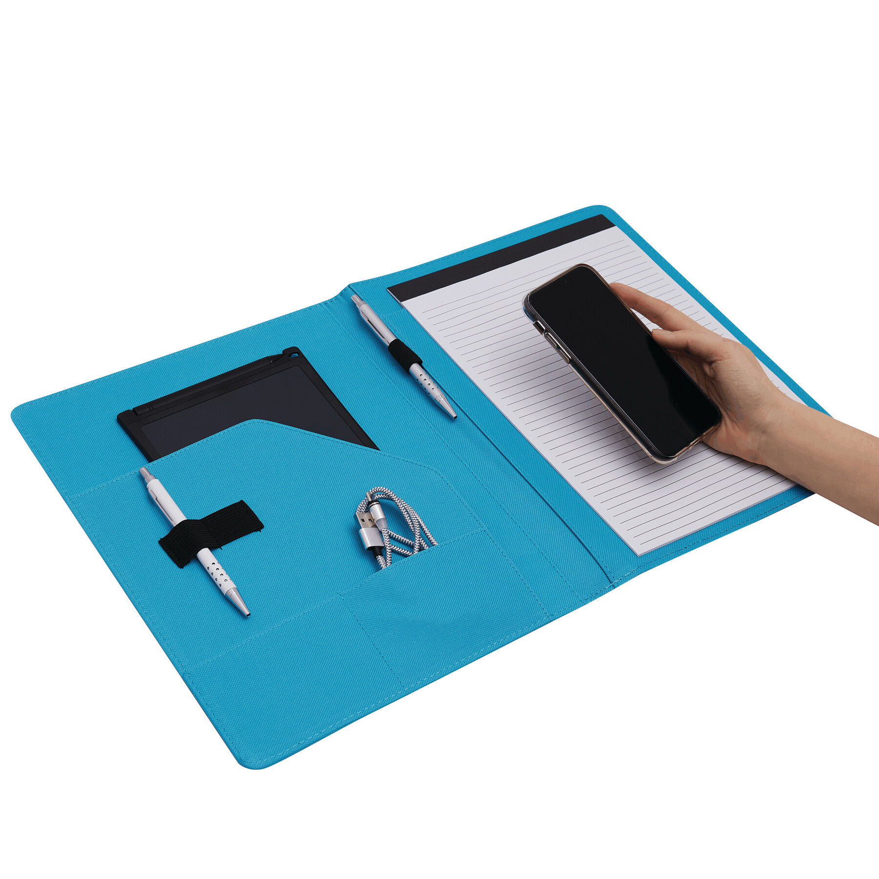 Portfolio YOUNG STAR w formacie A4, z notesem, wsuwanymi kieszonkami, pętelkami na długopis i inne akcesoria, zamykane gumką, na zewnątrz czarne, w środku kolorowe.