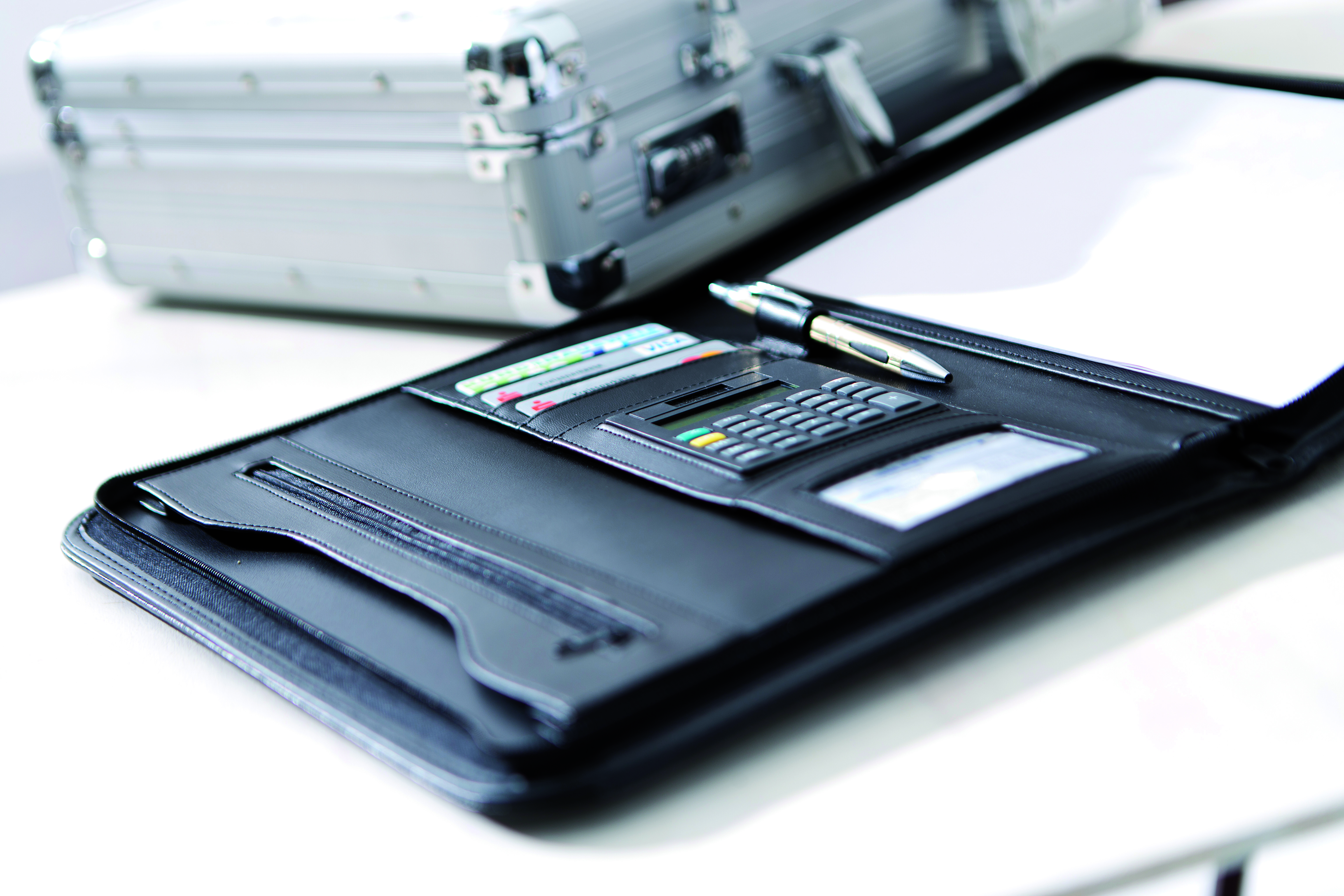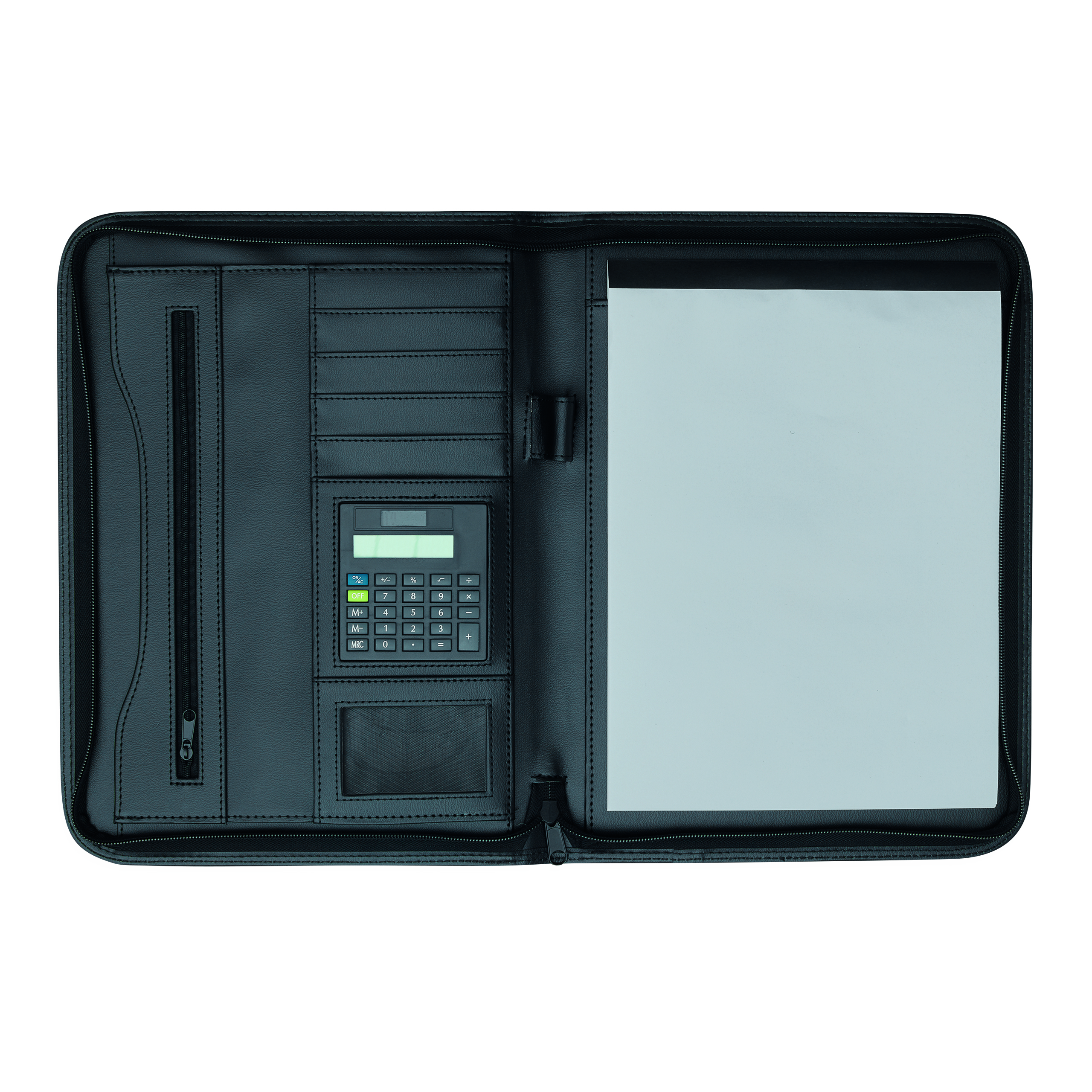 Portfolio GENTLE, format A4, zamykane na zamek błyskawiczny, wewnętrzne przegródki w tym jedna przezroczysta, wewnętrzna kieszonka zapinana na zamek, kalkulator, notes, pętelka na długopis oraz jedna kieszonka zewnętrzna.